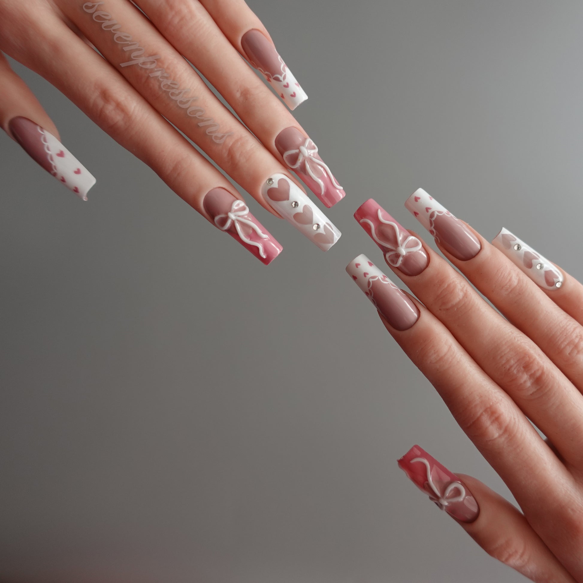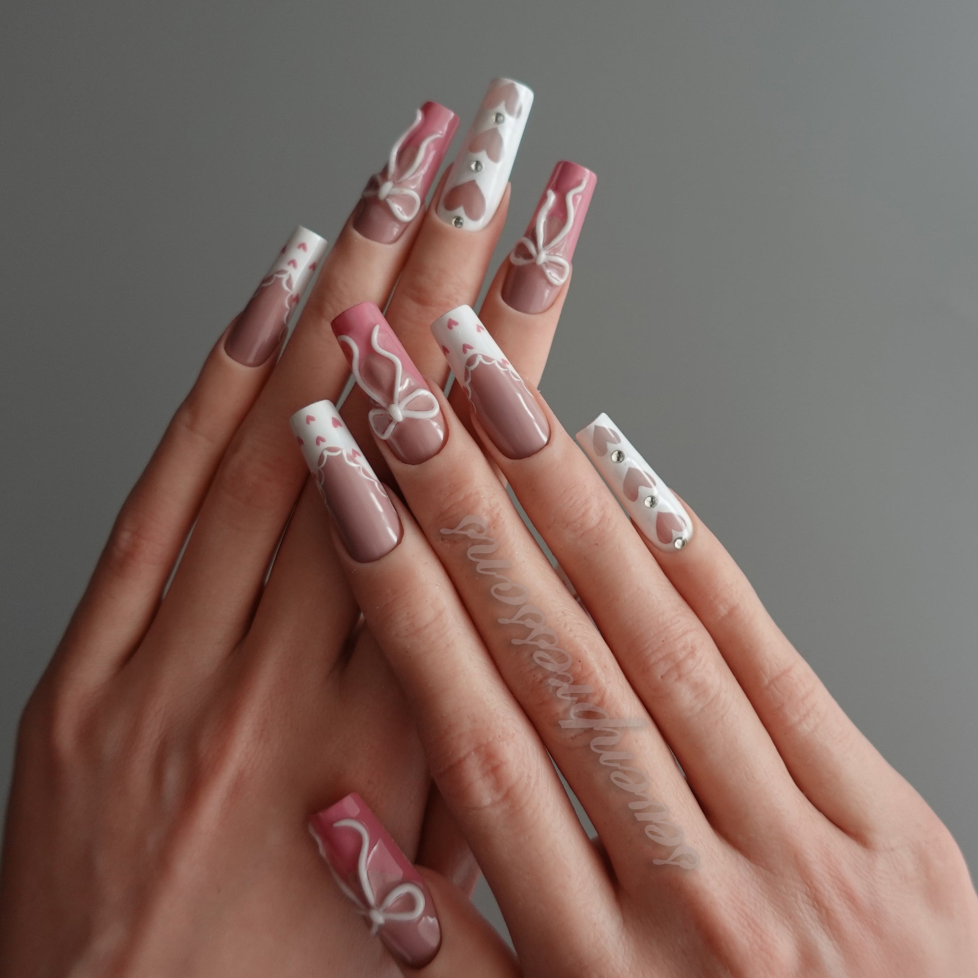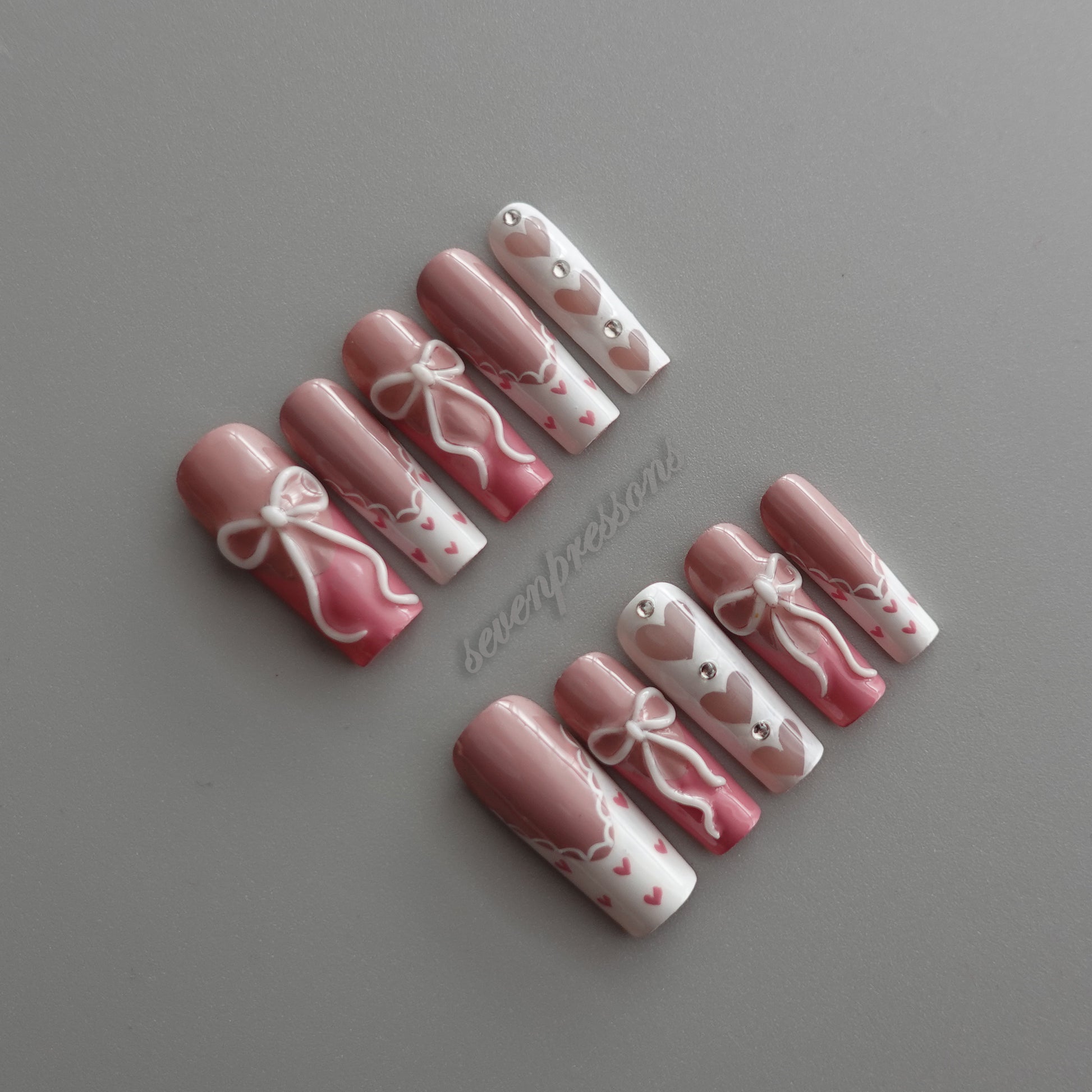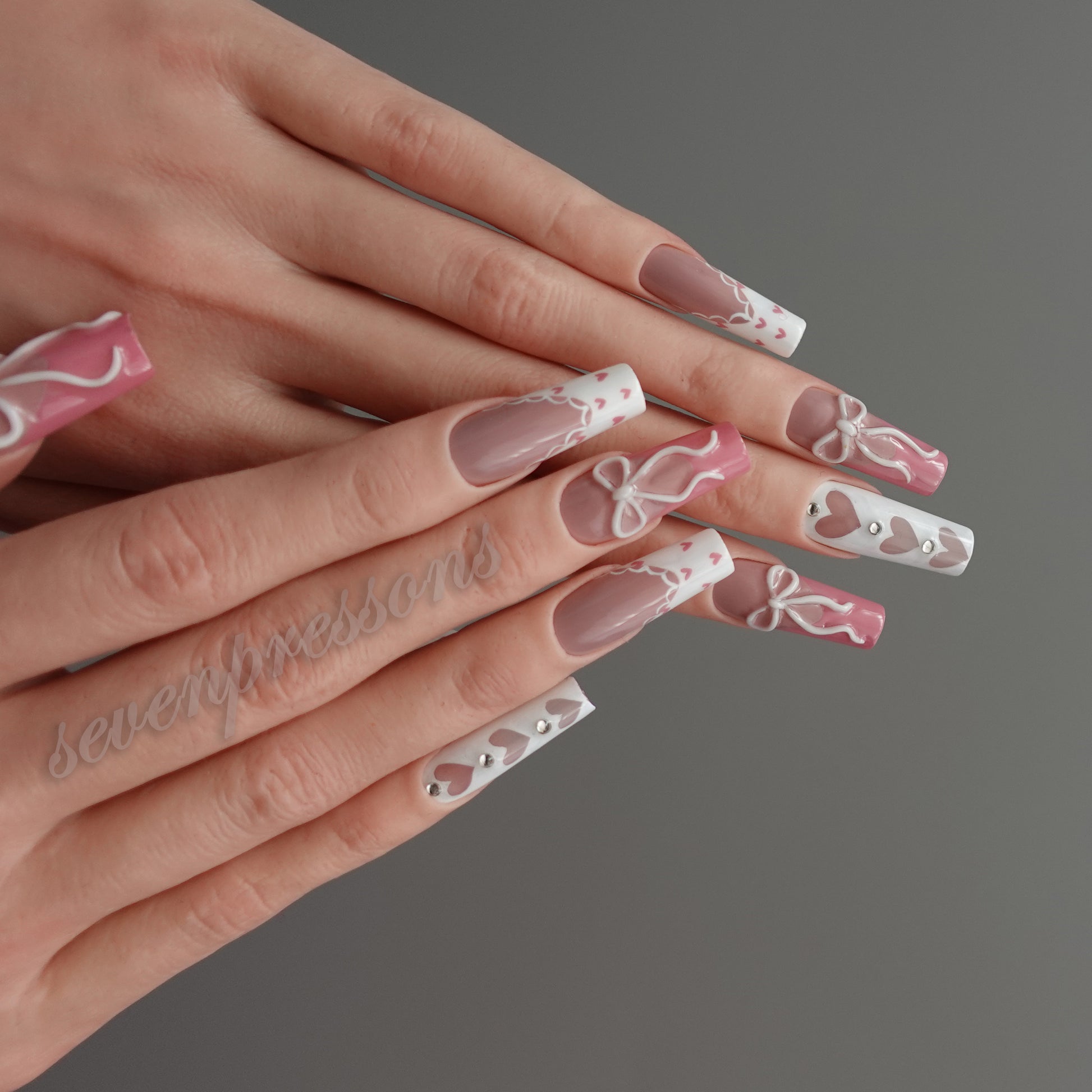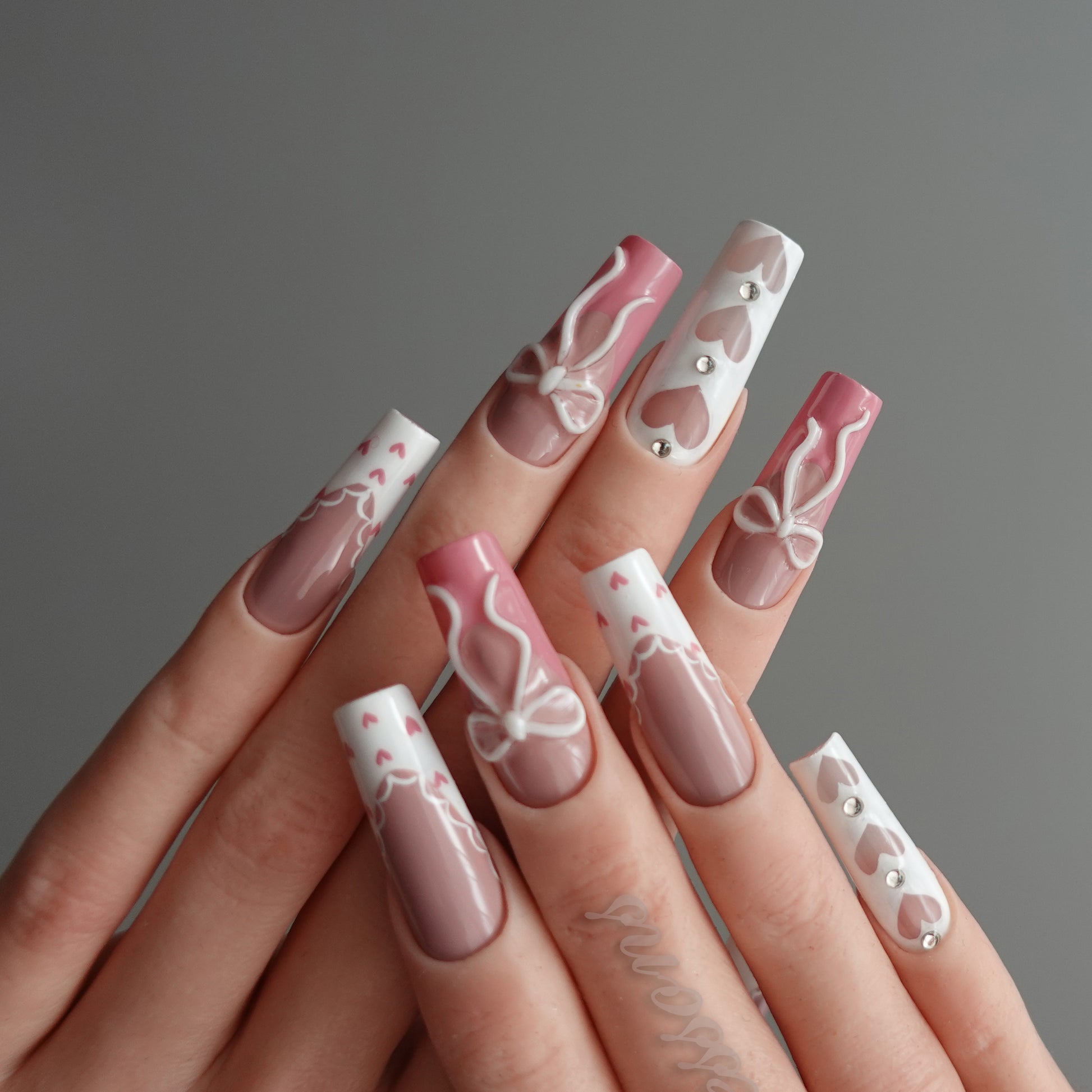 Soft blush gradients pair with crisp white panels, tiny heart details, and hand-painted bows to create a look that is dreamy, balanced, and irresistibly sweet.