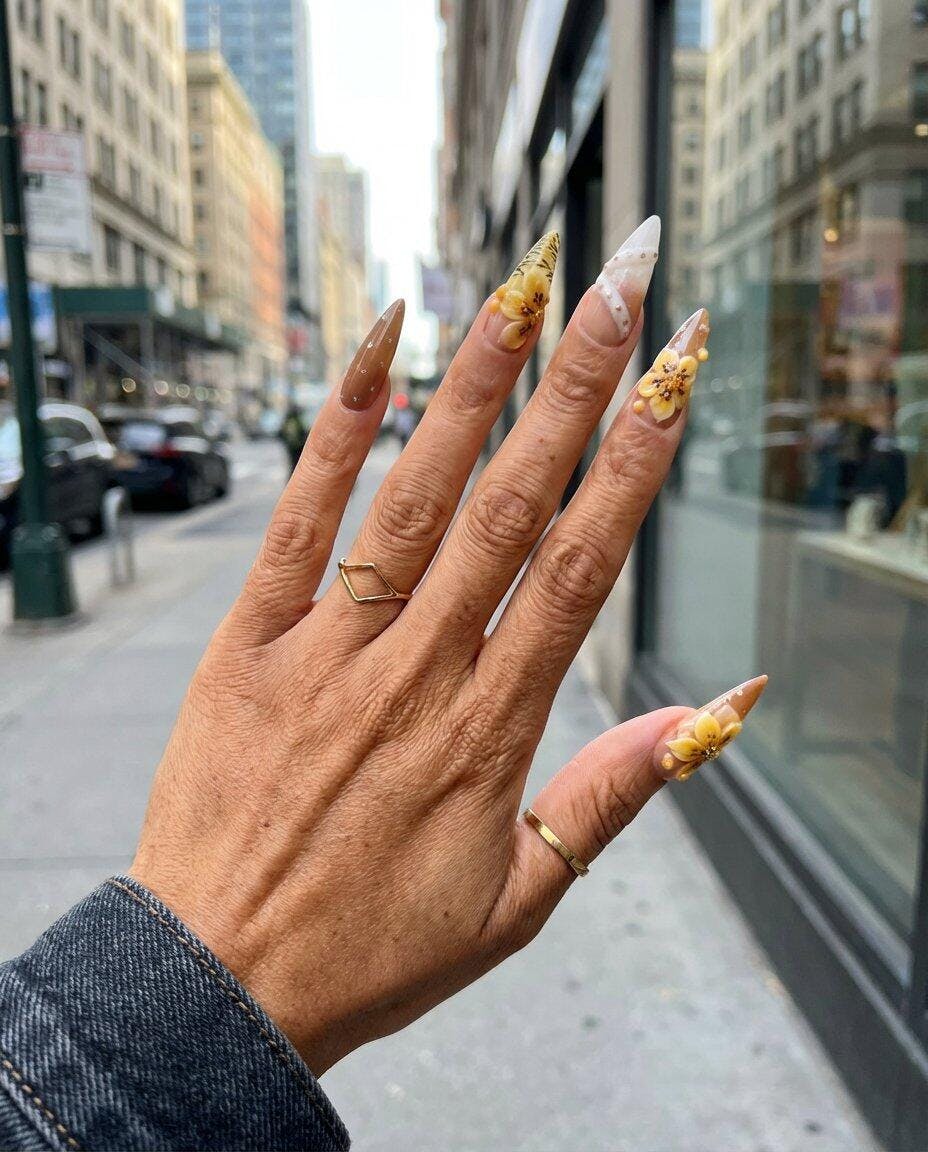 Honey Bloom is a warm celebration of nature’s elegance — glowing honey tones, soft beige, and creamy white come together with sculpted floral accents that feel like sunshine on your fingertips.