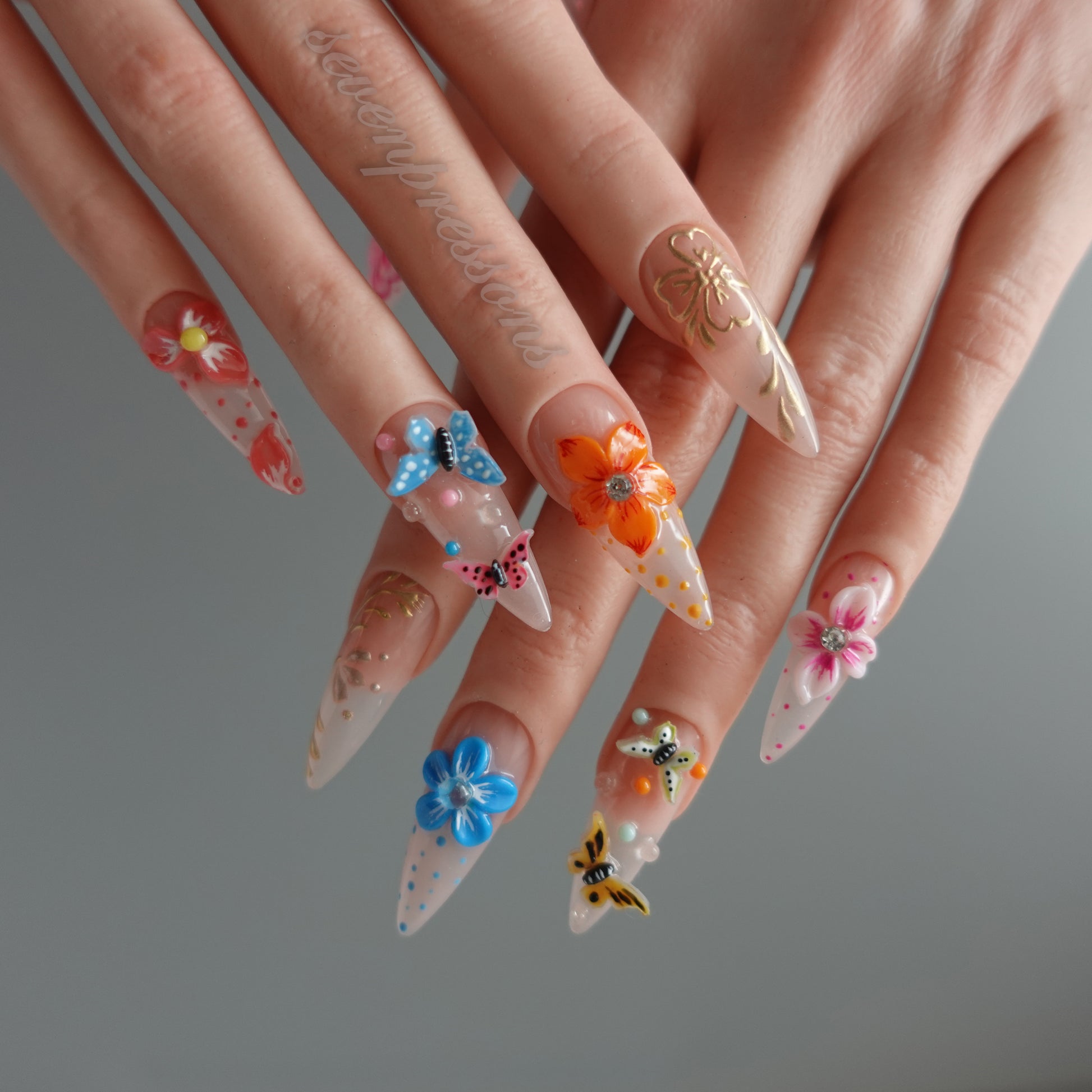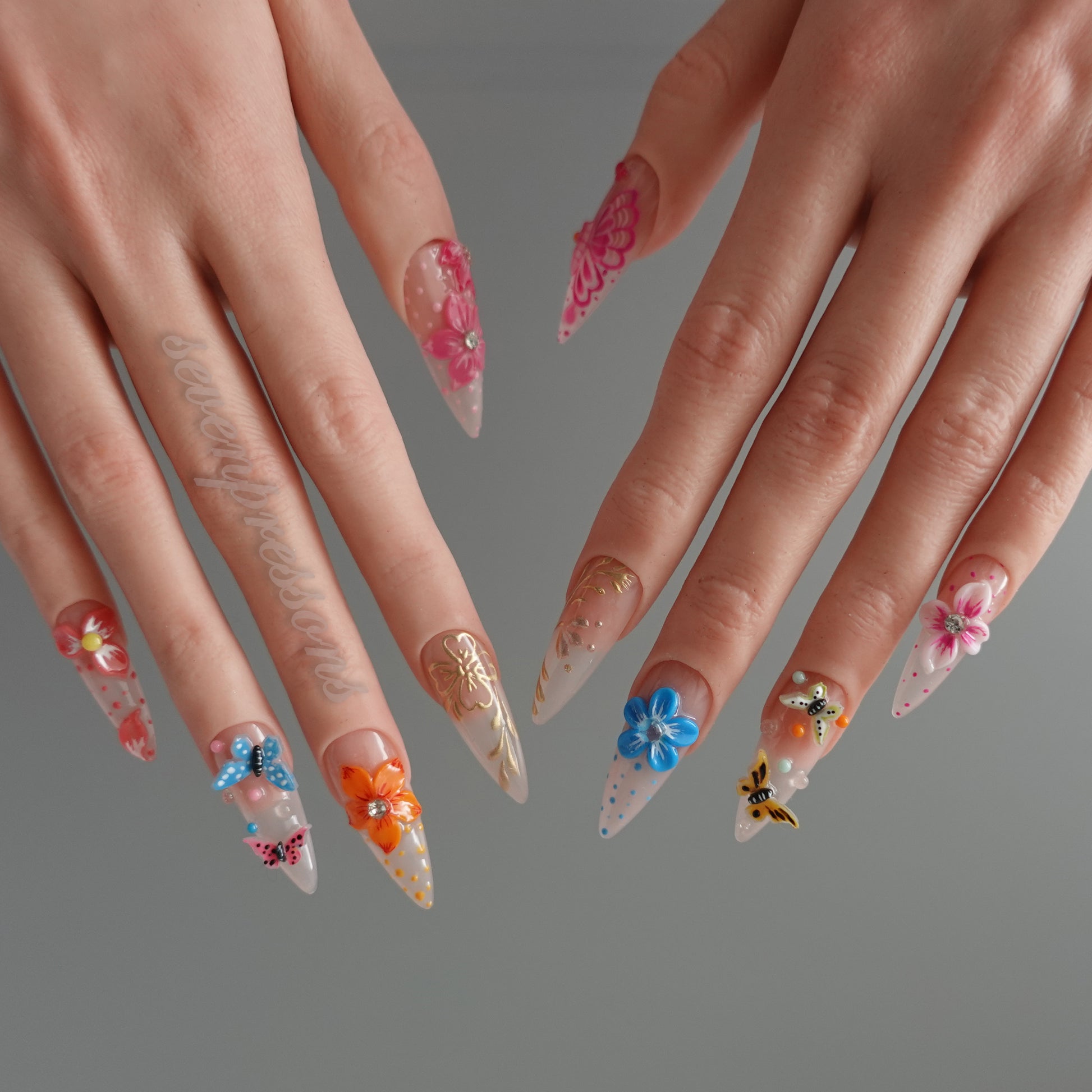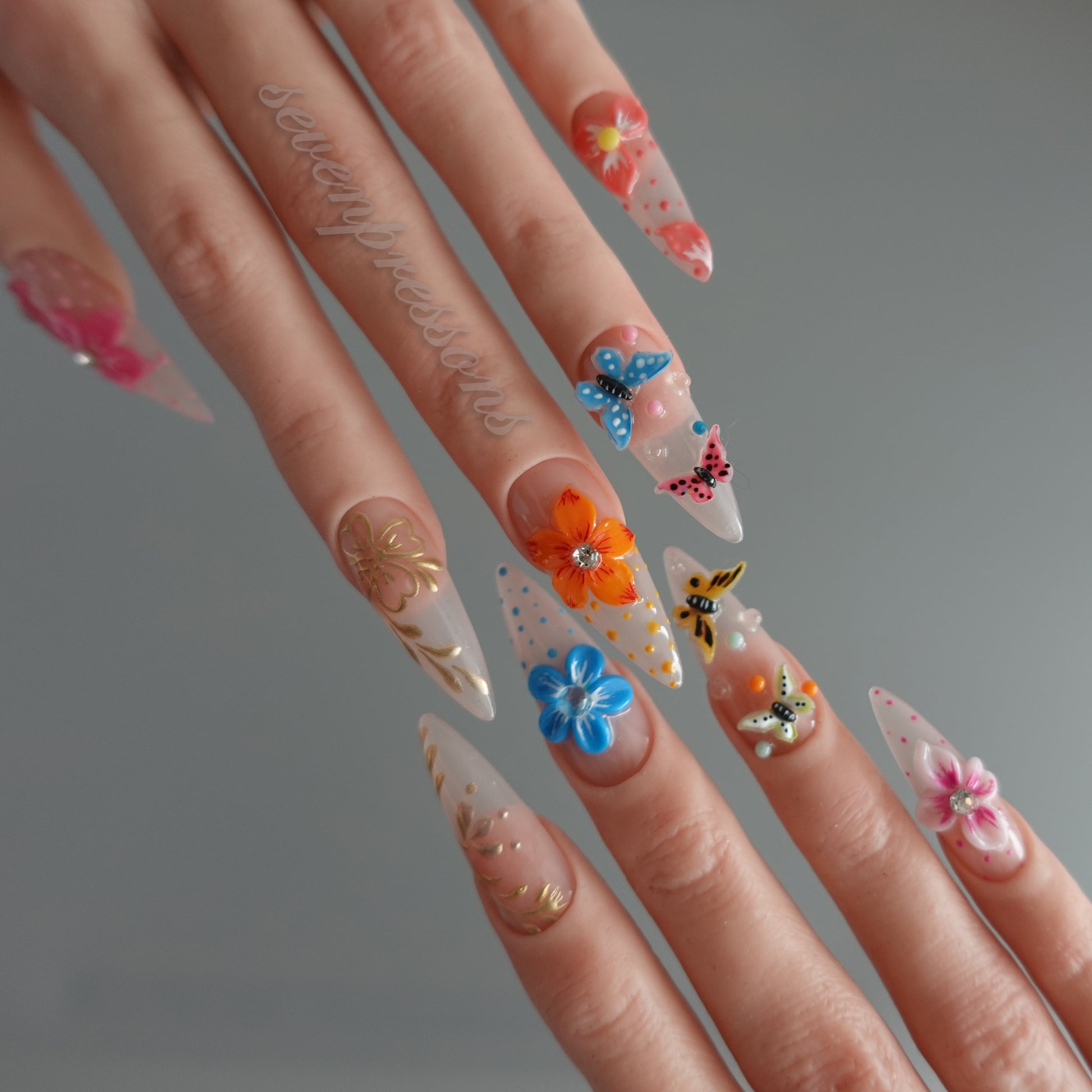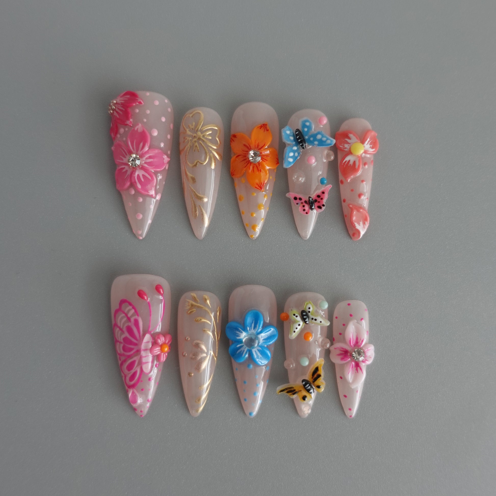 Vivid 3D florals in candy pinks, ocean blue, and sunset orange are paired with playful butterflies and dotted pastels on a milky-nude base.