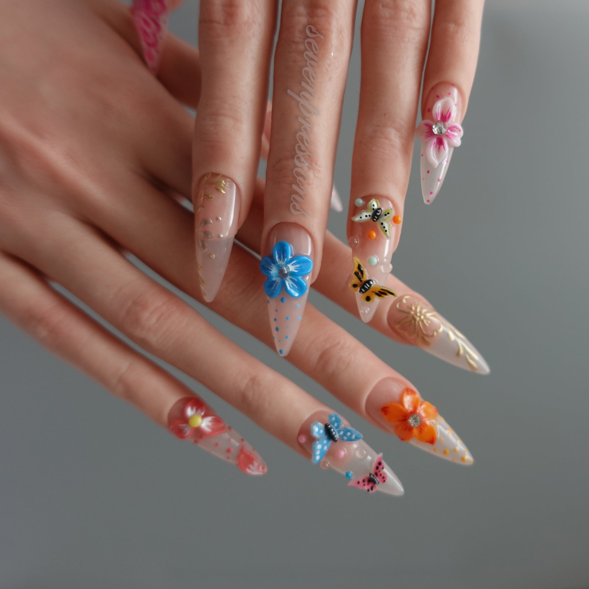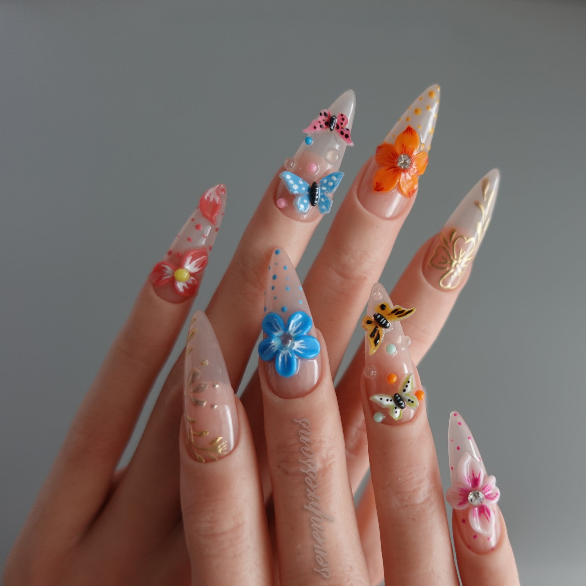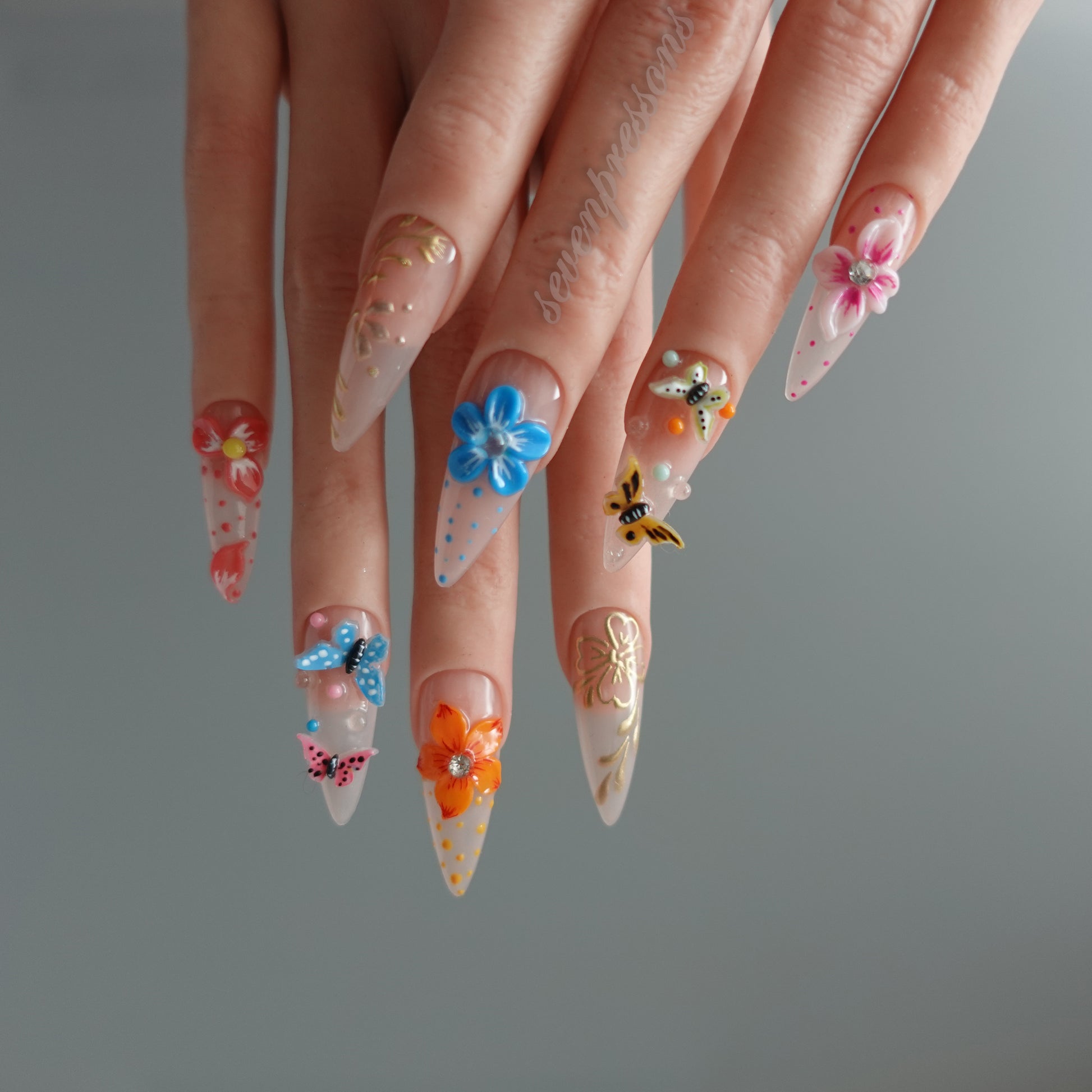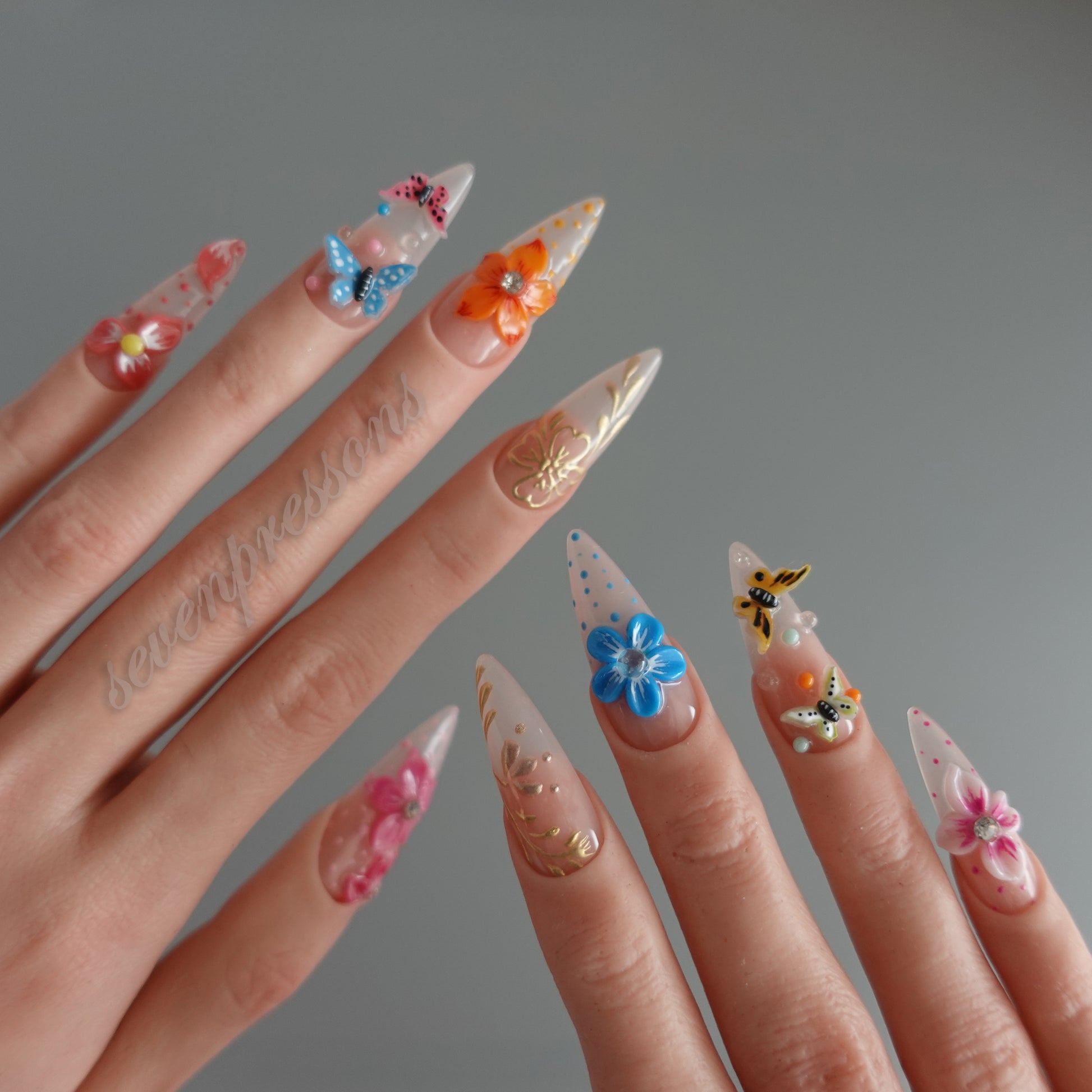 Vivid 3D florals in candy pinks, ocean blue, and sunset orange are paired with playful butterflies and dotted pastels on a milky-nude base.