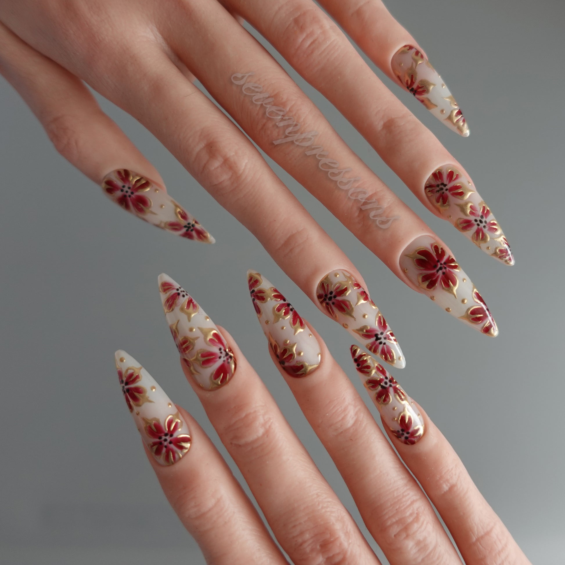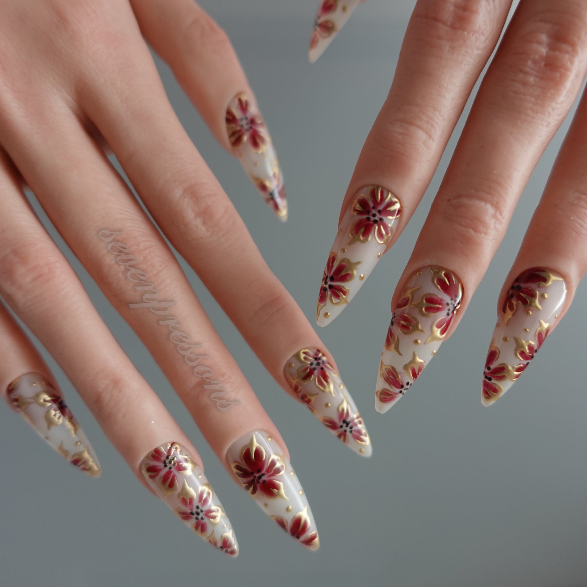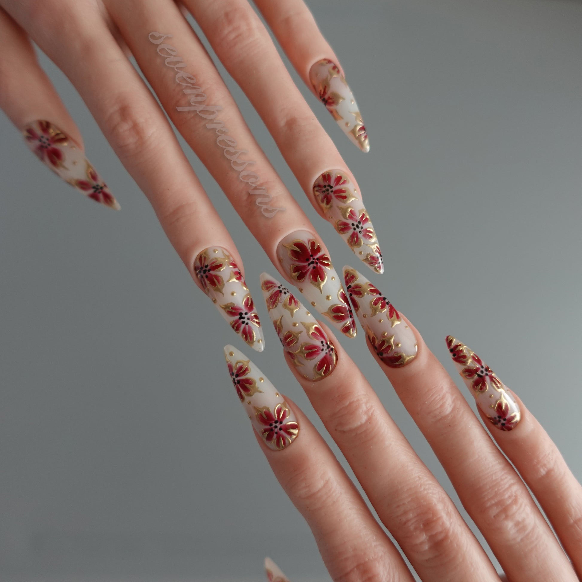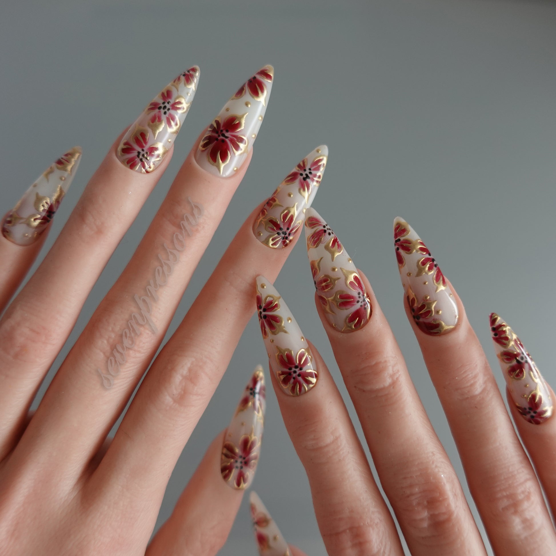 Crimson Petals is bold elegance in bloom โ a luxurious floral fantasy brushed in rich wine-red and edged in molten gold. Set atop a soft ivory nude base, every flower is sculpted to radiate warmth and sophistication, reminiscent of hand-painted porcelain blossoming under candlelight.