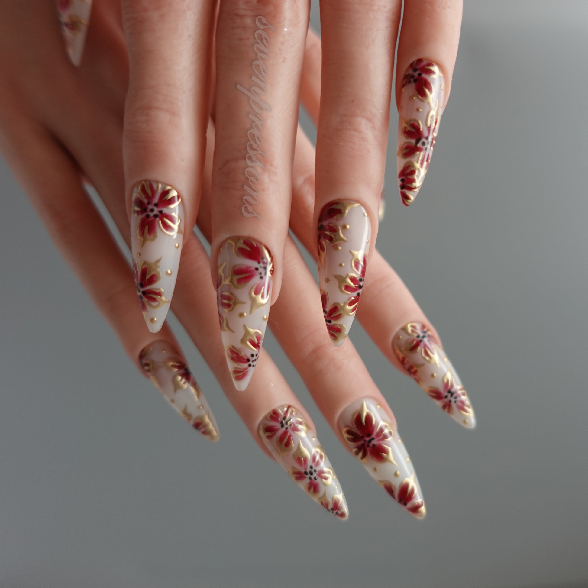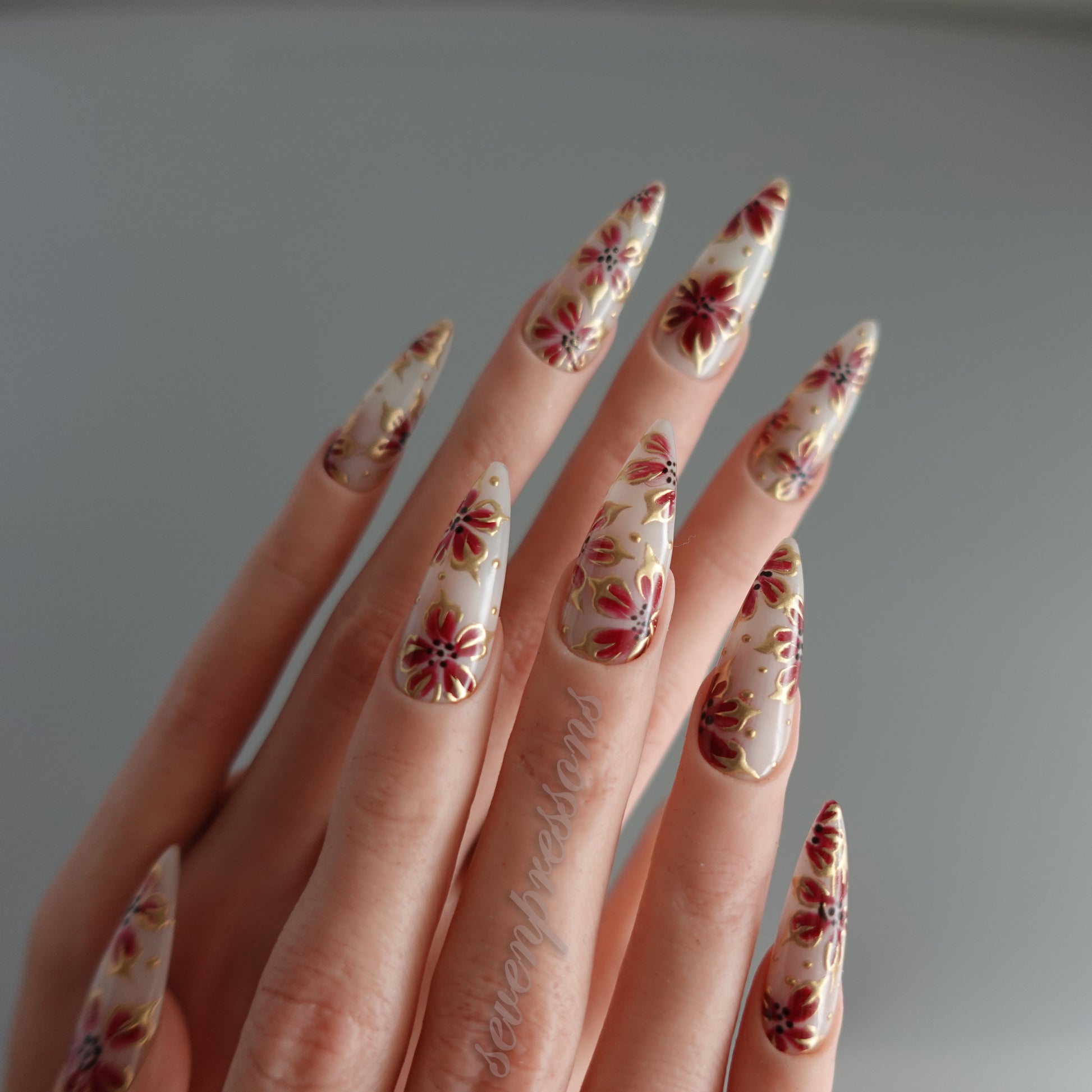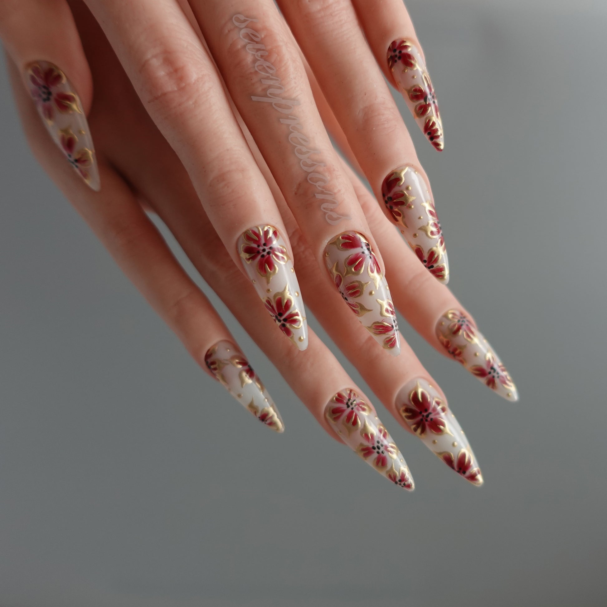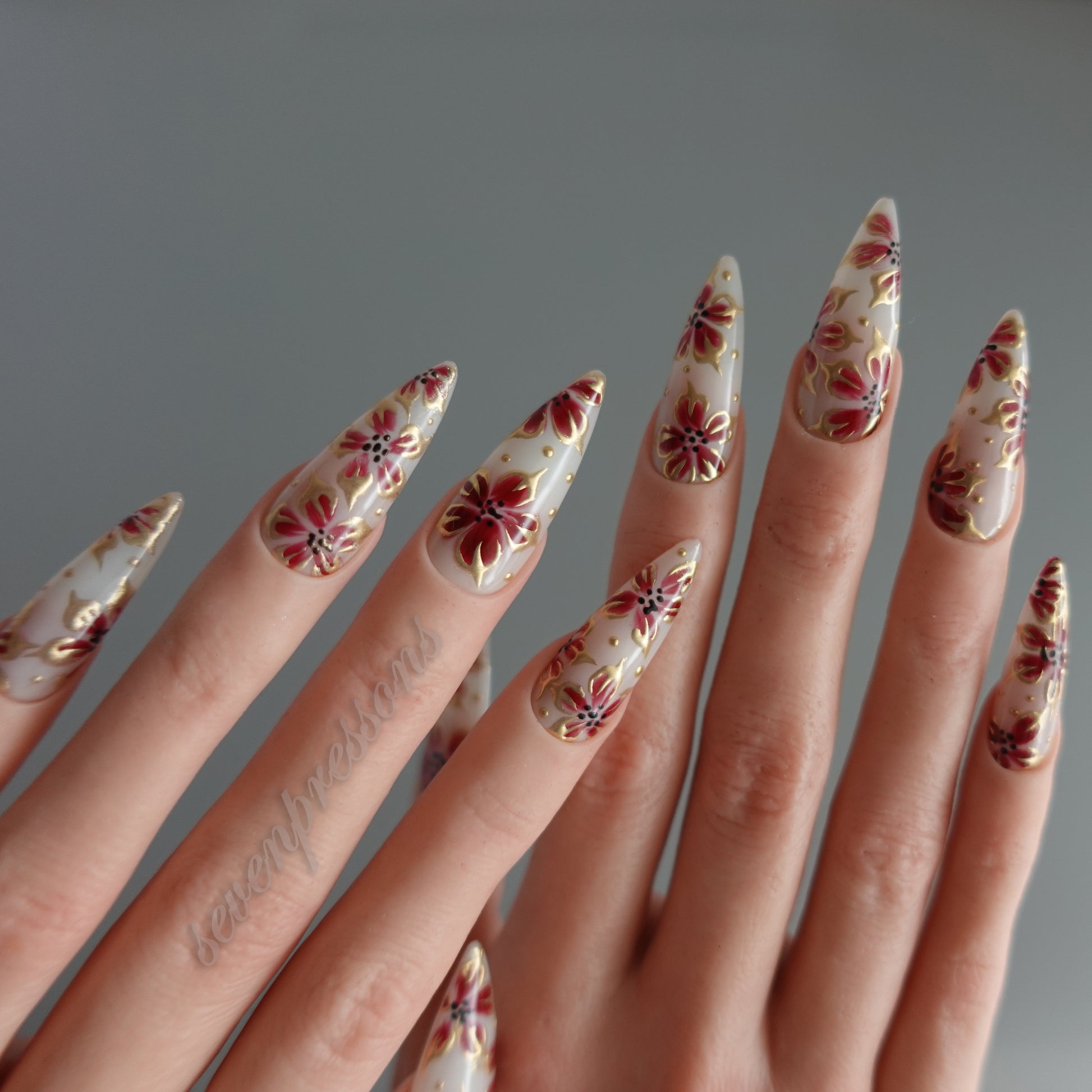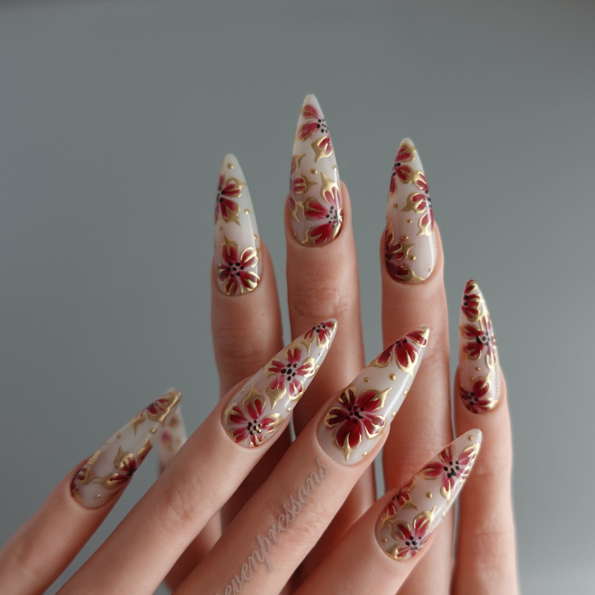 Crimson Petals is bold elegance in bloom โ a luxurious floral fantasy brushed in rich wine-red and edged in molten gold. Set atop a soft ivory nude base, every flower is sculpted to radiate warmth and sophistication, reminiscent of hand-painted porcelain blossoming under candlelight.