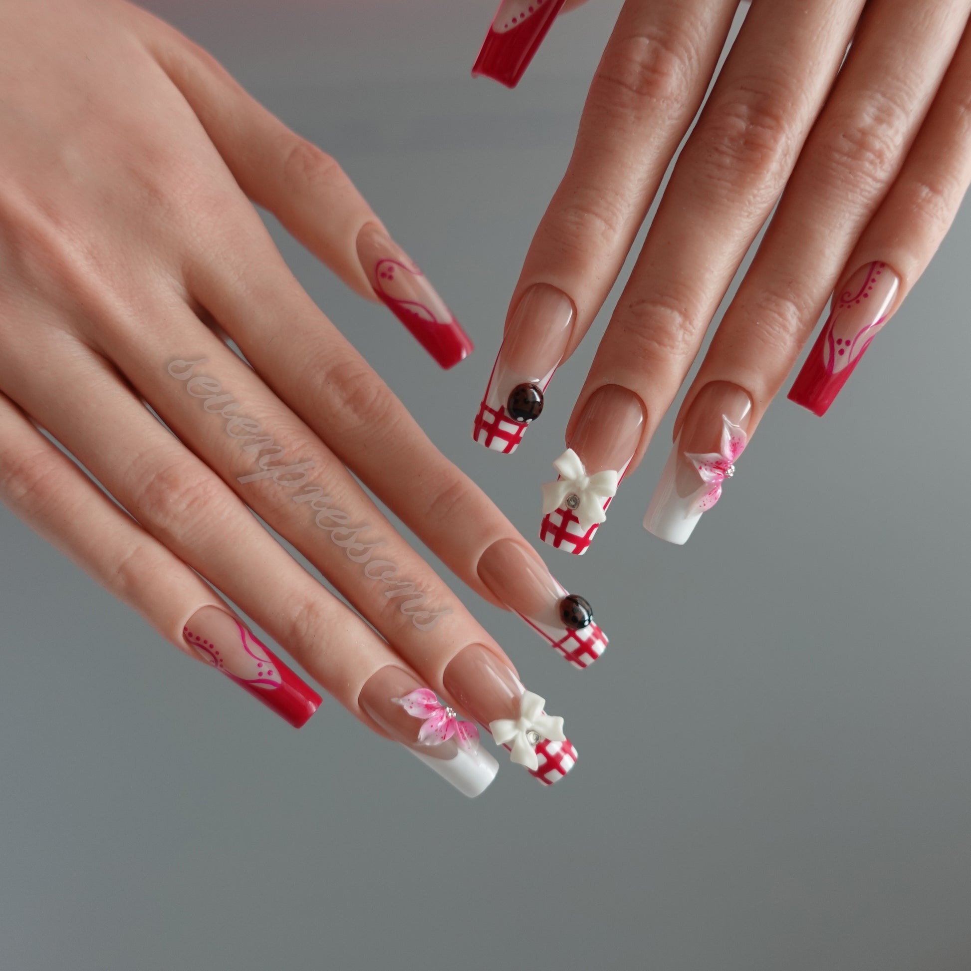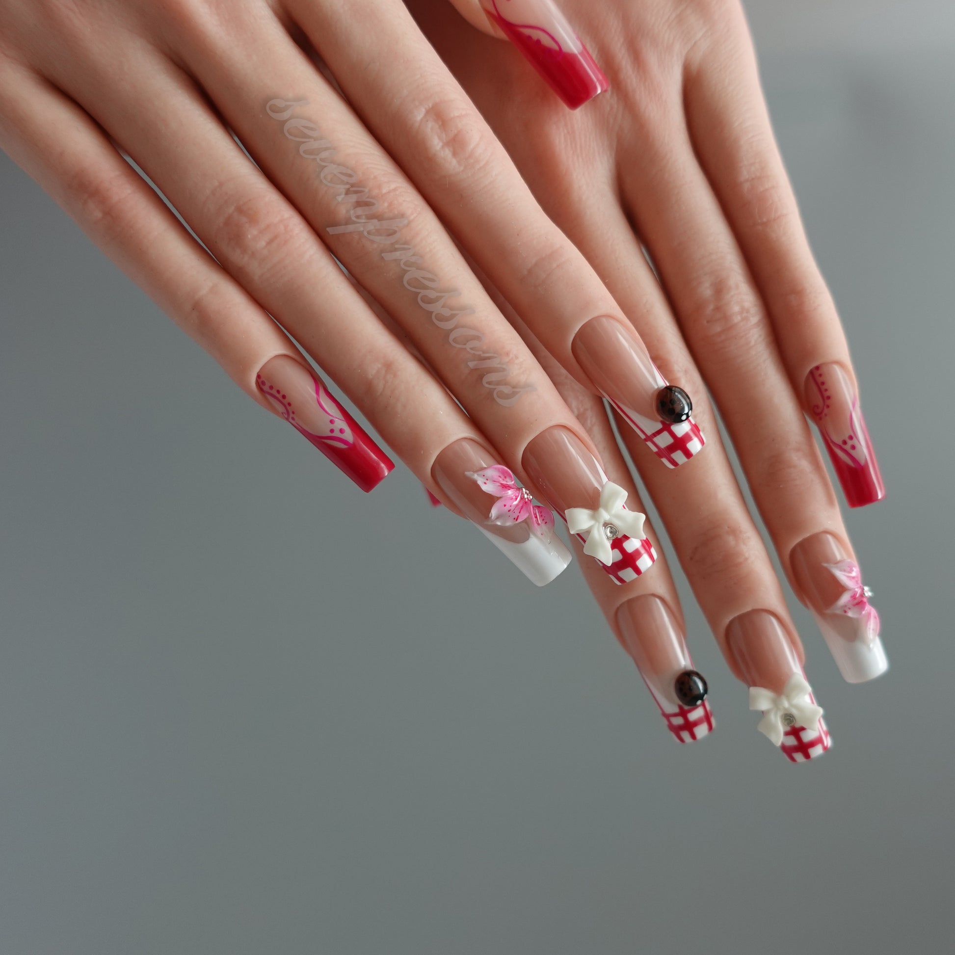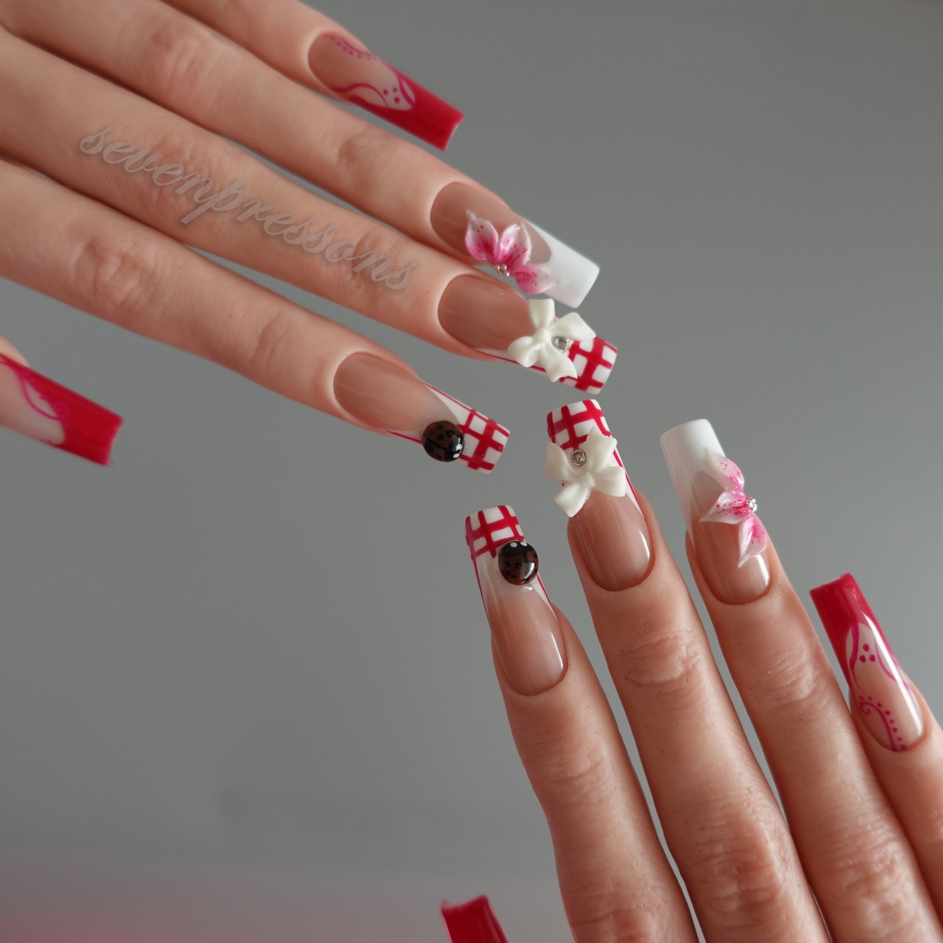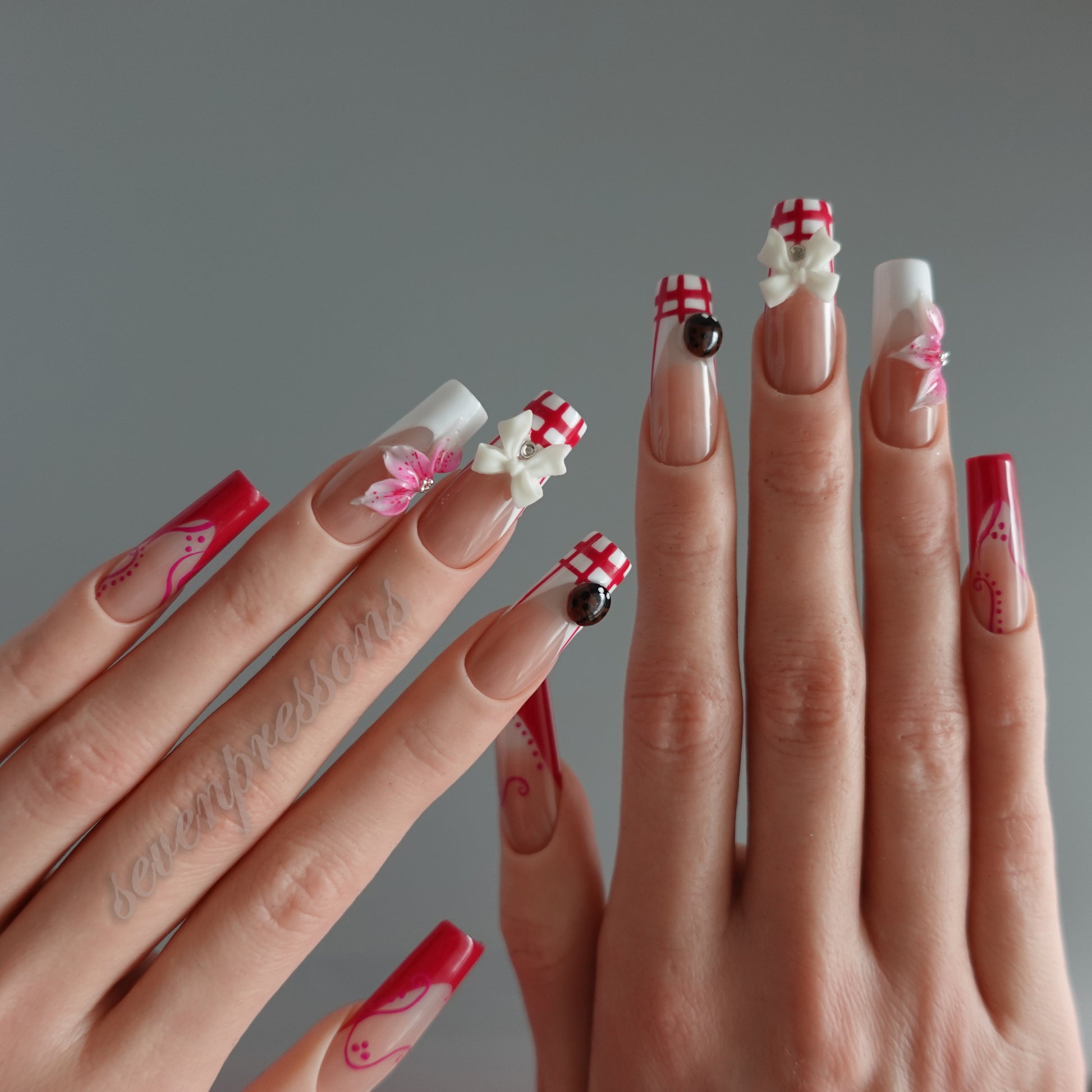 With playful red checks, creamy latte-pink bases, silky bows and sugar-petal blooms, this handcrafted set brings the charm of a summer picnic right to your fingertips. Cute, flirty, and delightfully whimsical โ perfect for coquette lovers, cafe dates, and every outfit that deserves a touch of strawberry sweetness. ๐โจ