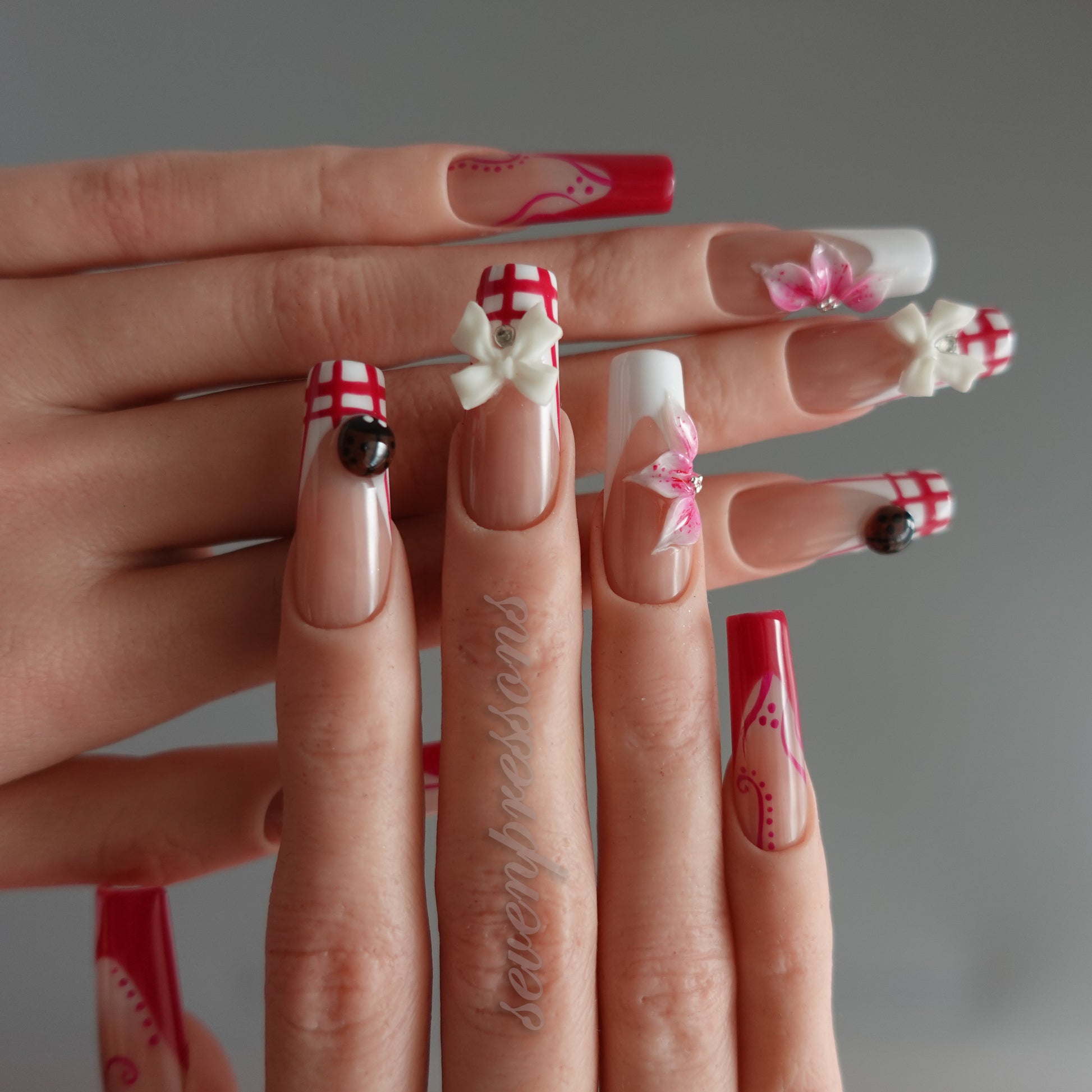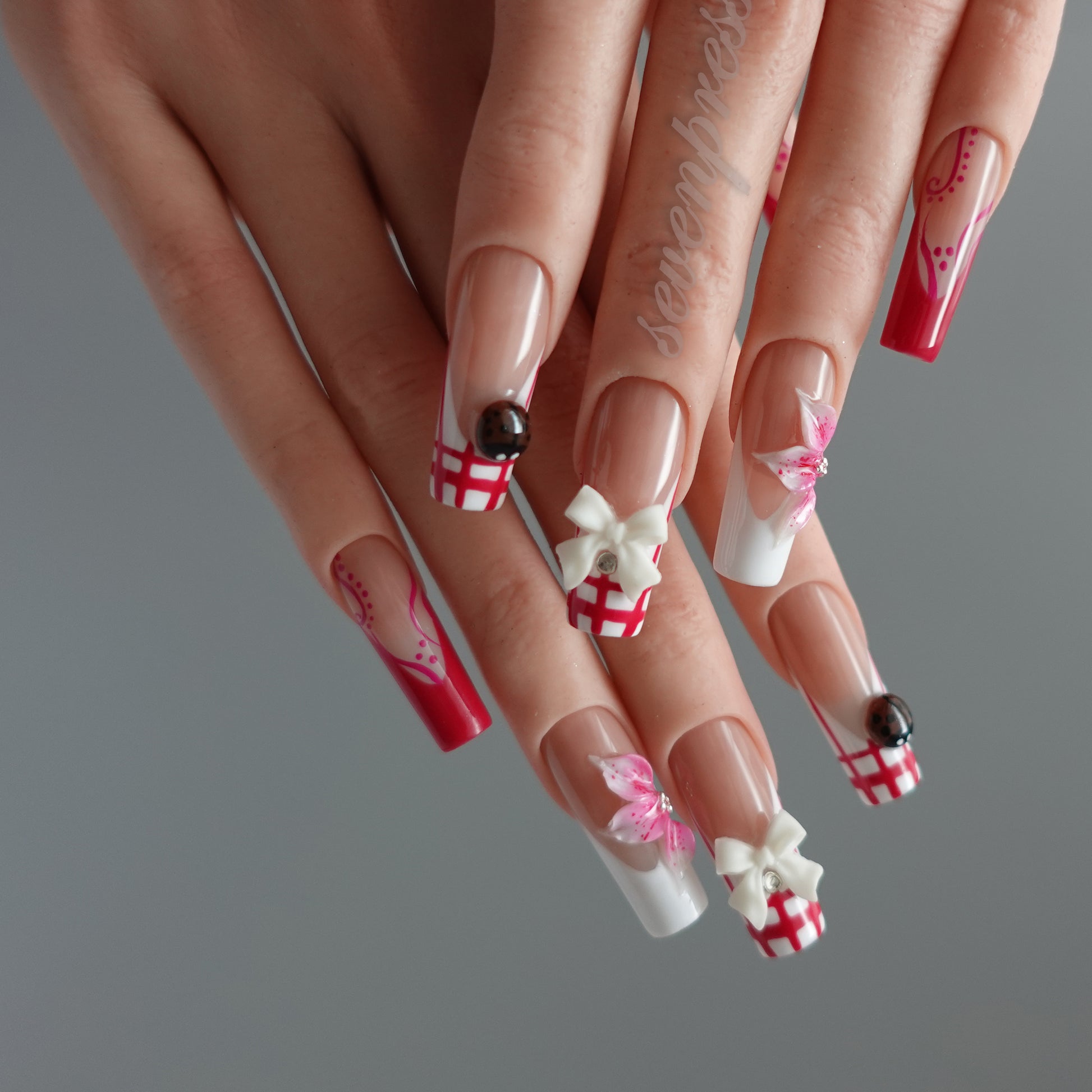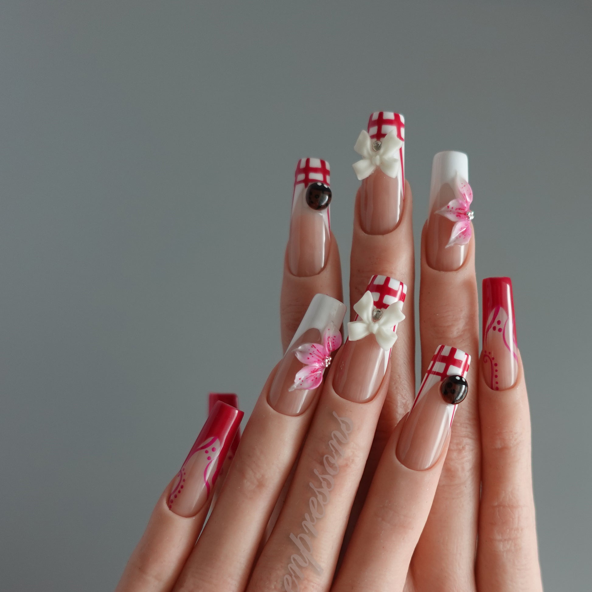 โข 3D sculpted white bow & pink floral accents (select nails)