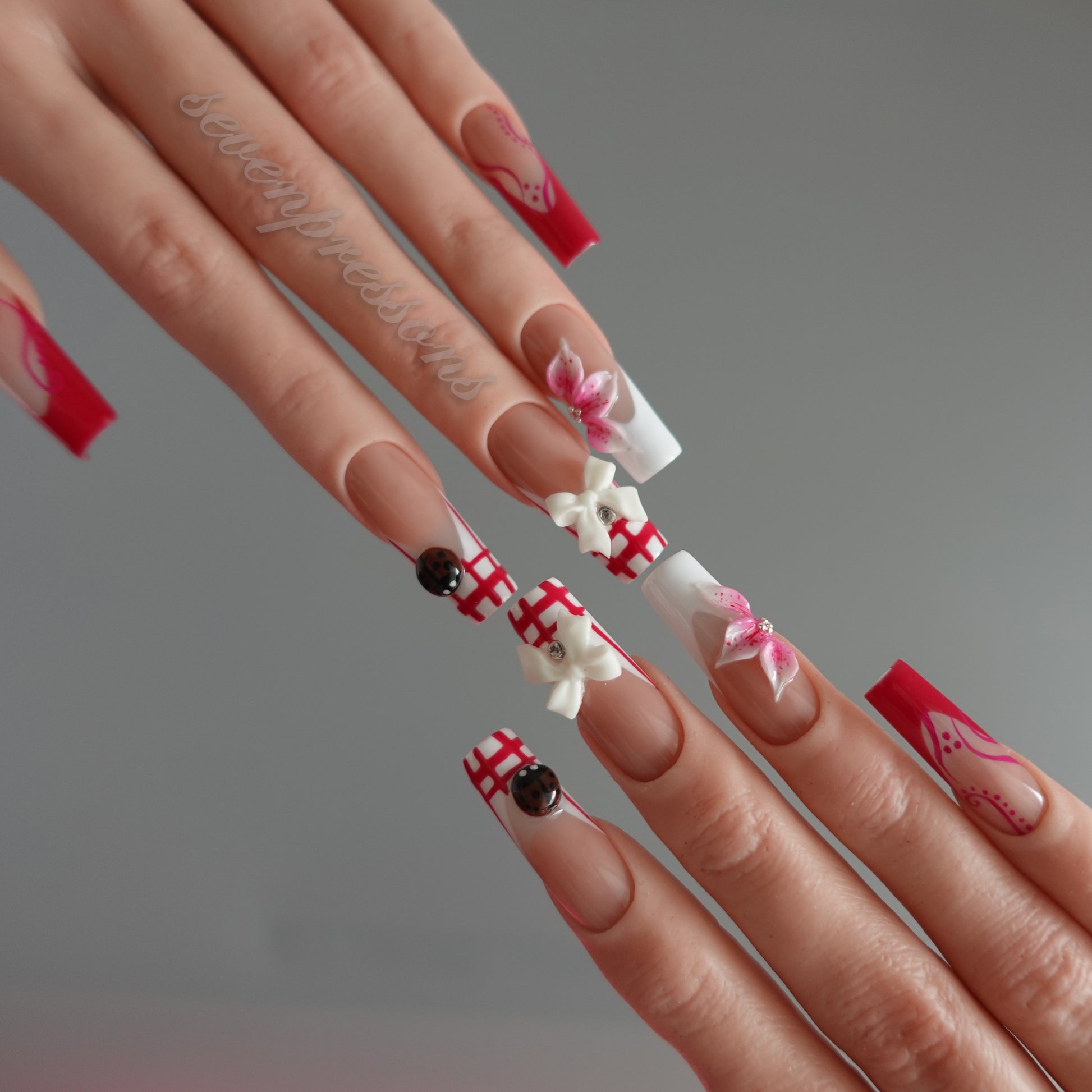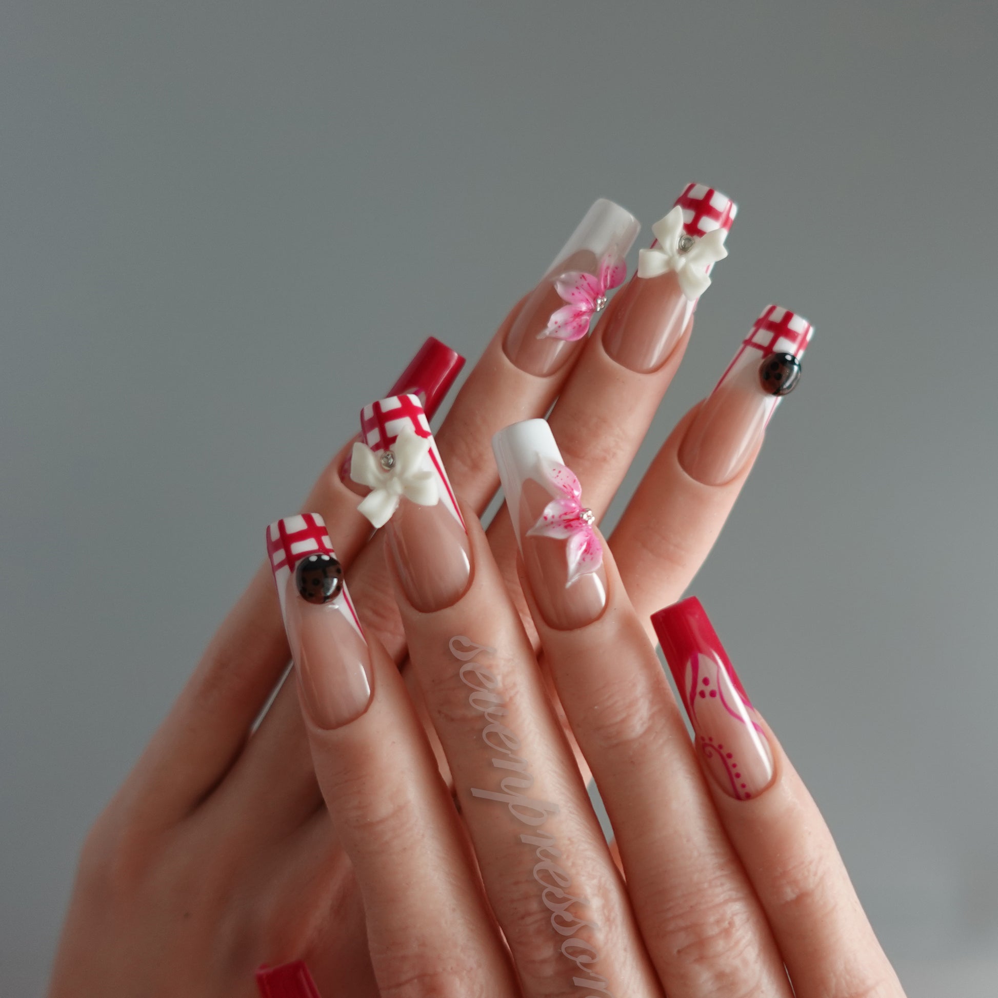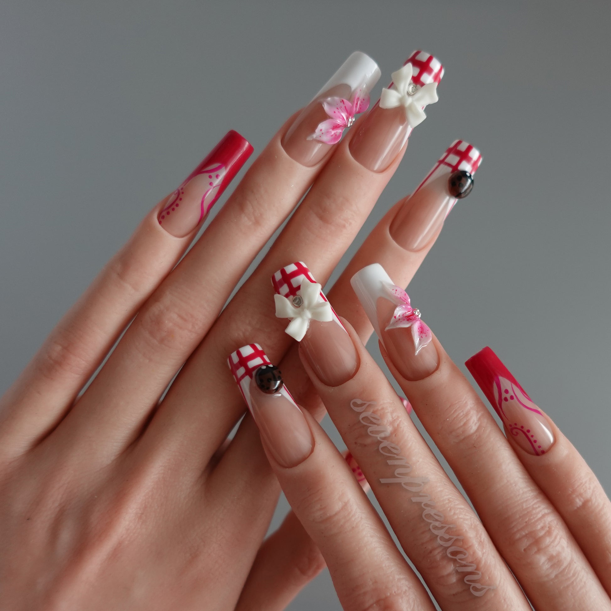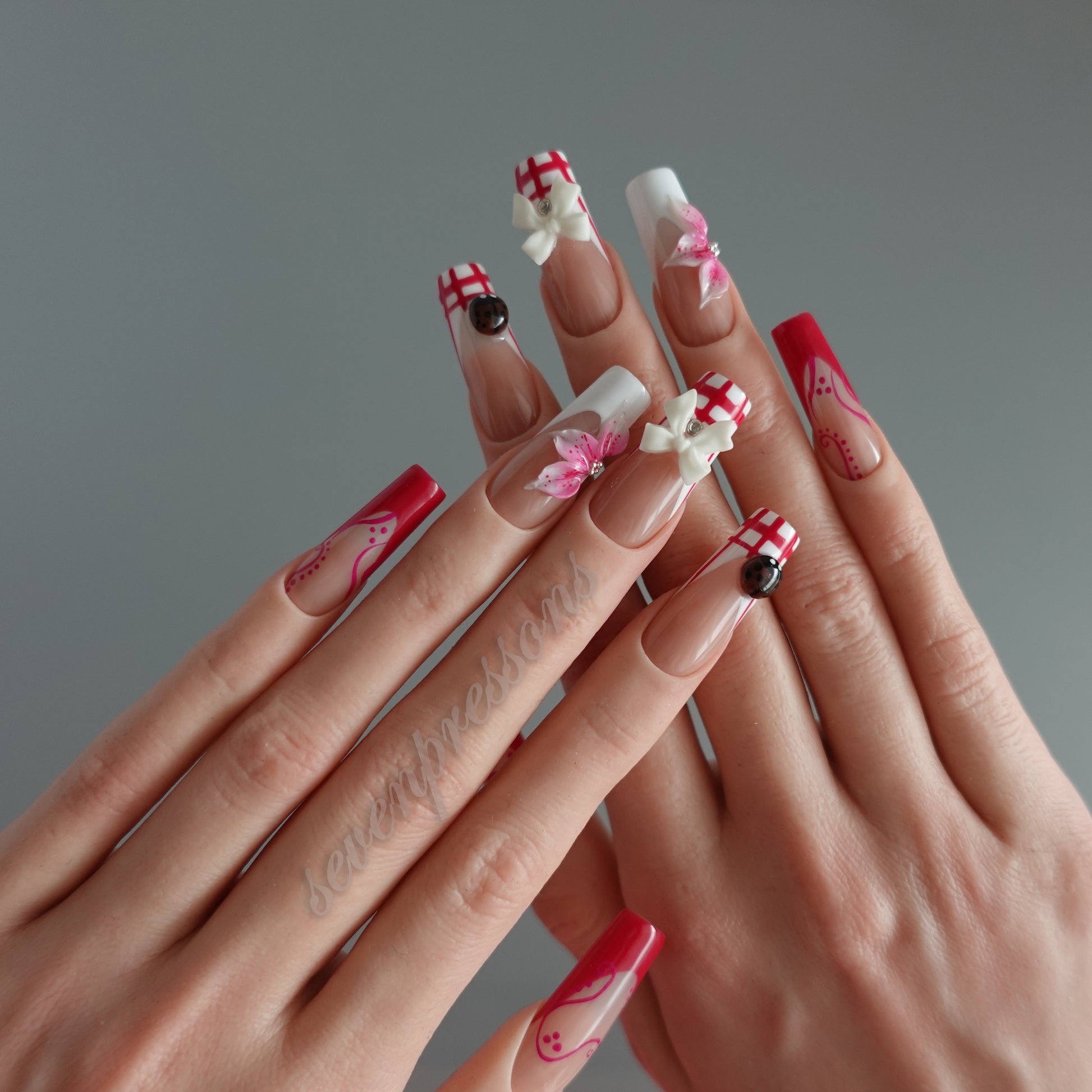 โข 3D sculpted white bow & pink floral accents (select nails)