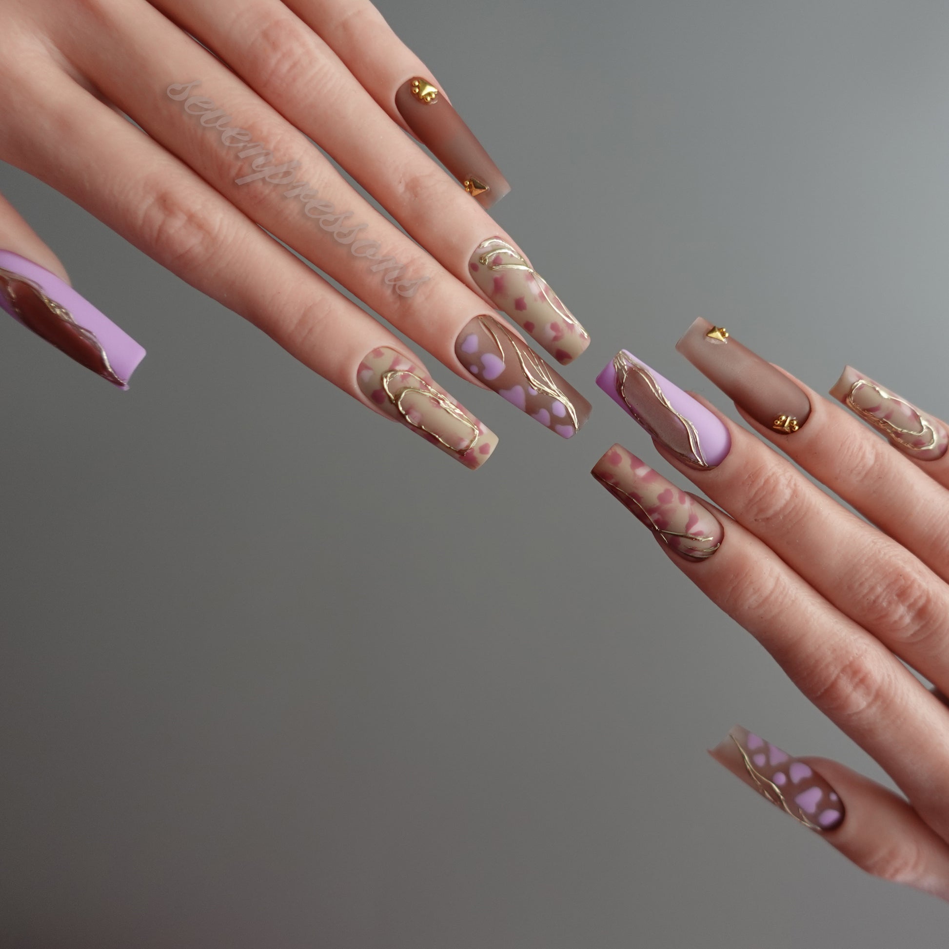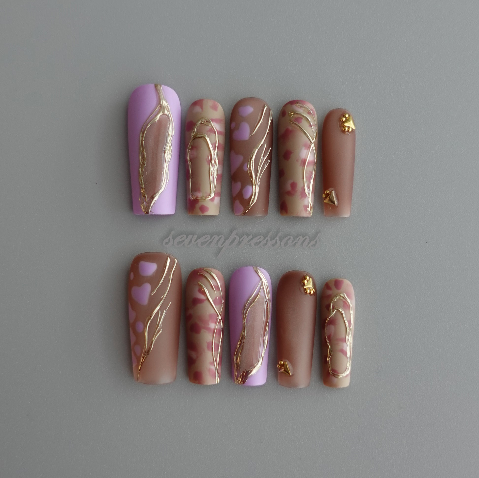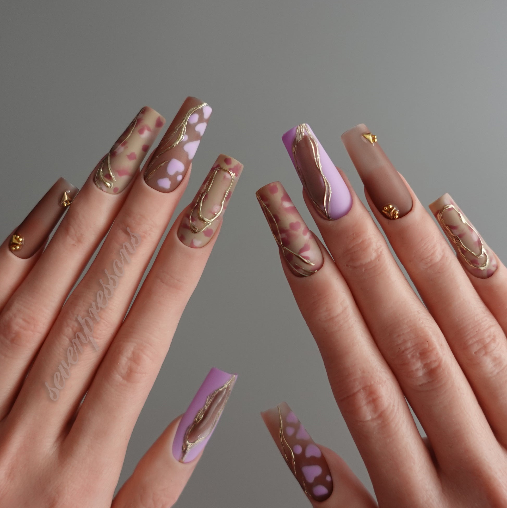 Soft matte hearts, translucent blush gradients, and flowing gold contour lines come together to form a look that feels warm, feminine, and quietly luxurious.