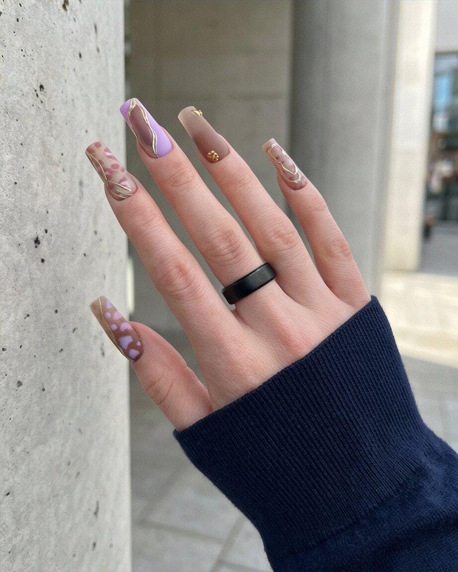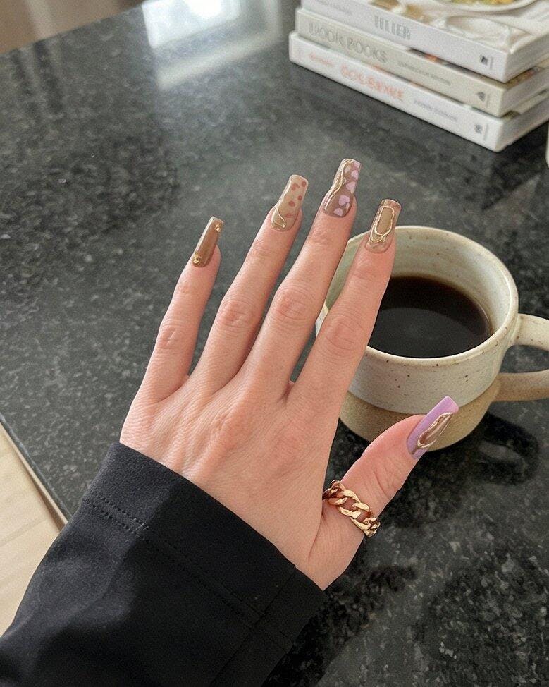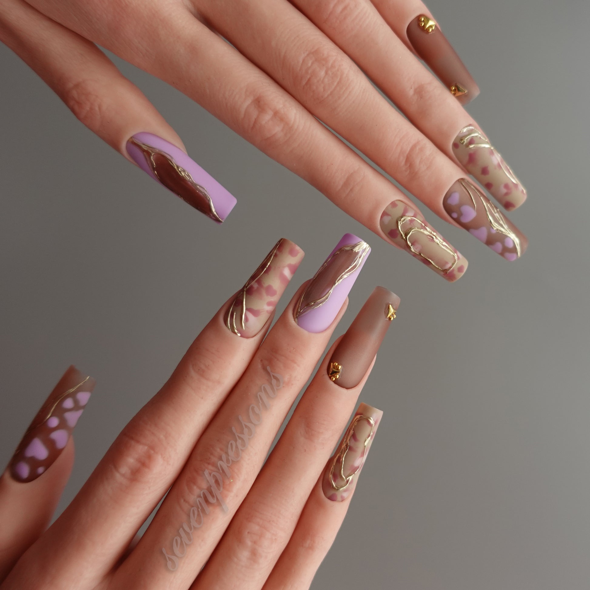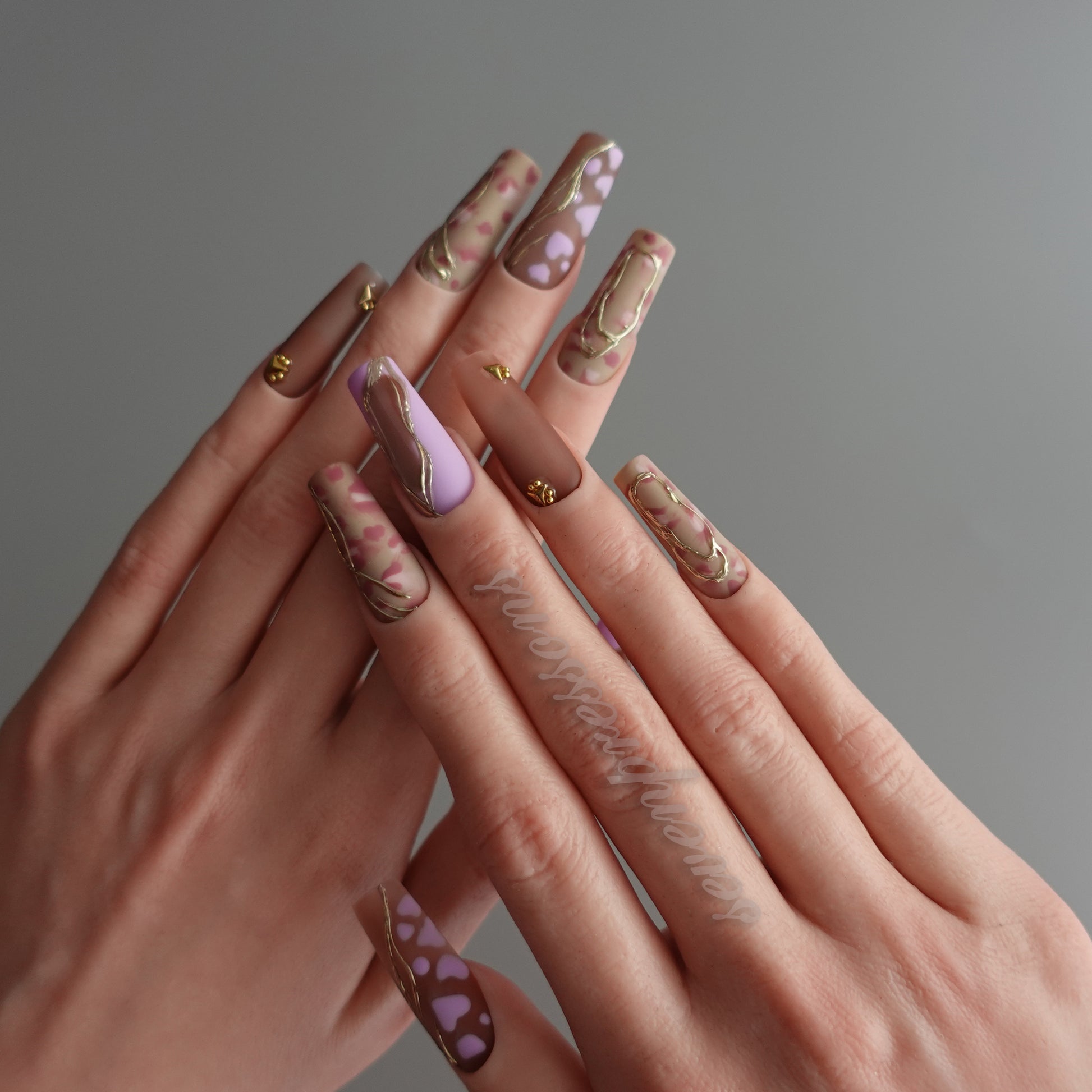 Soft matte hearts, translucent blush gradients, and flowing gold contour lines come together to form a look that feels warm, feminine, and quietly luxurious.