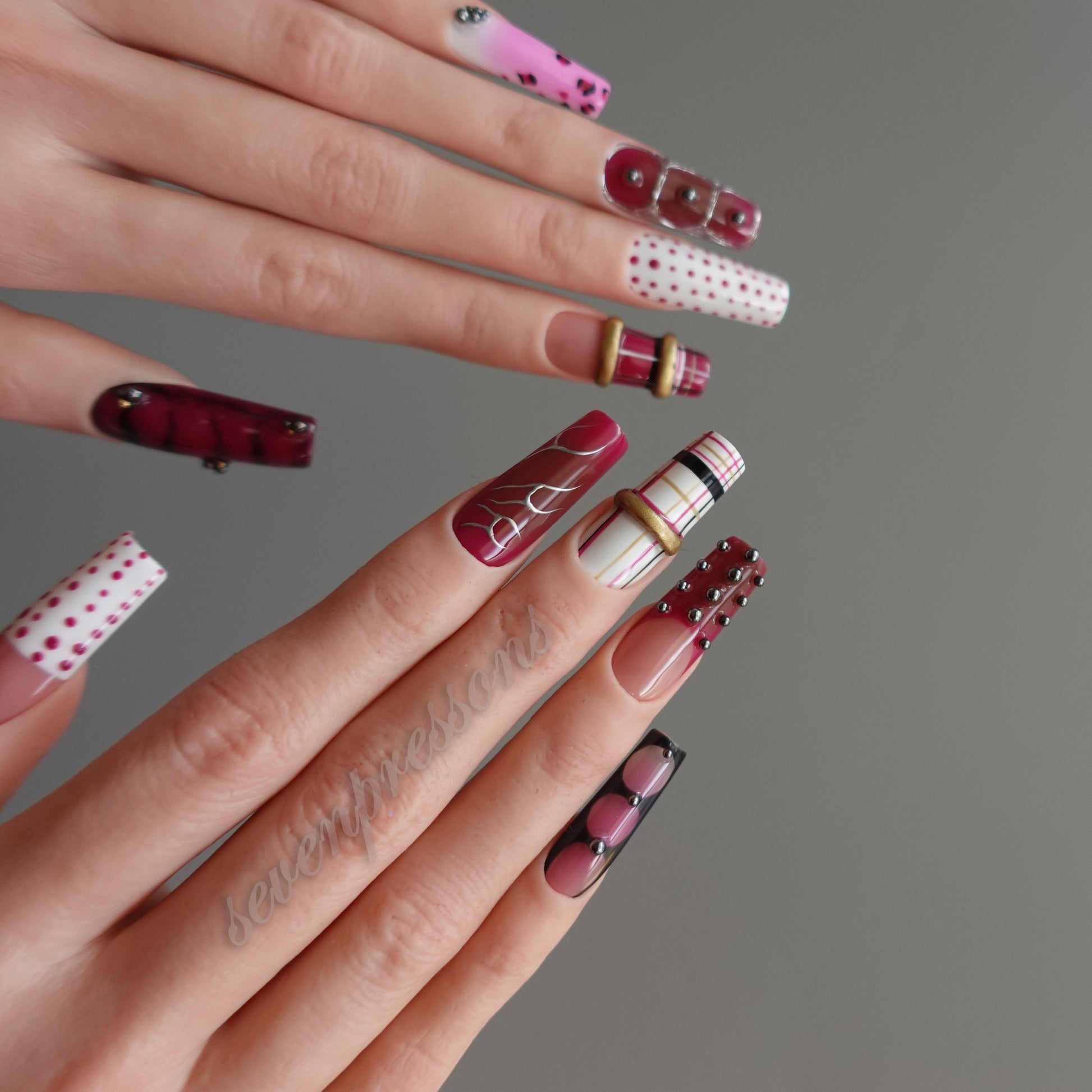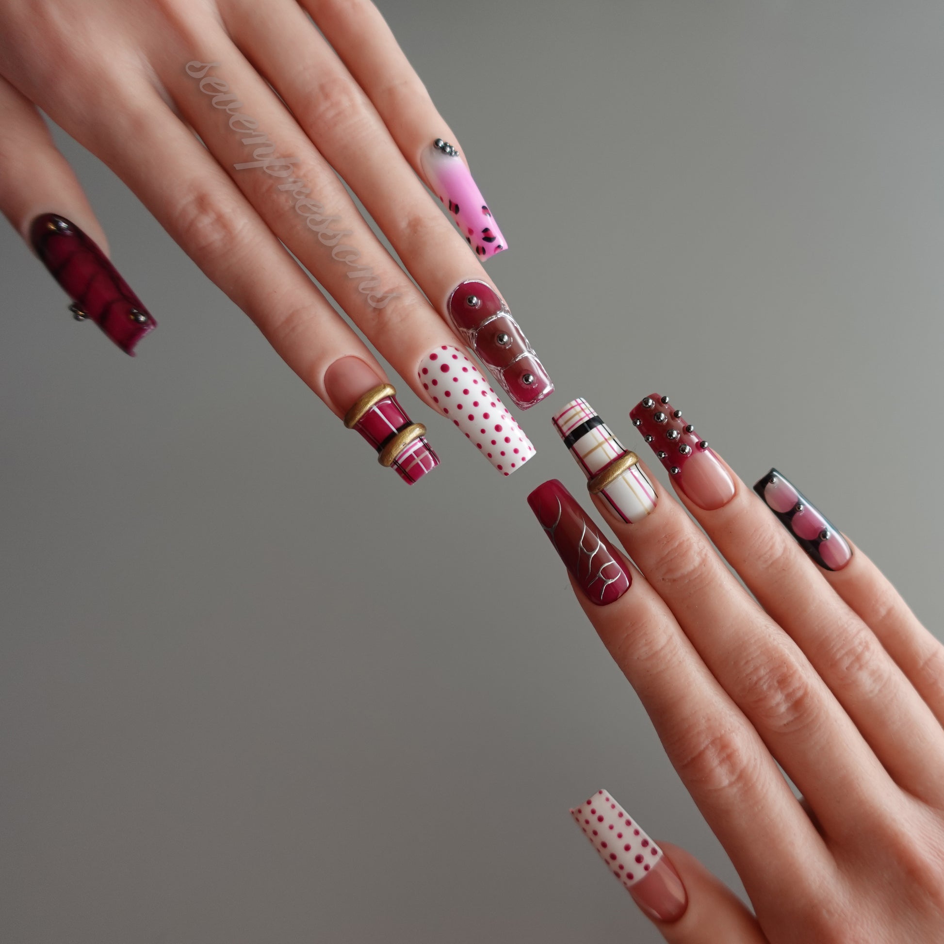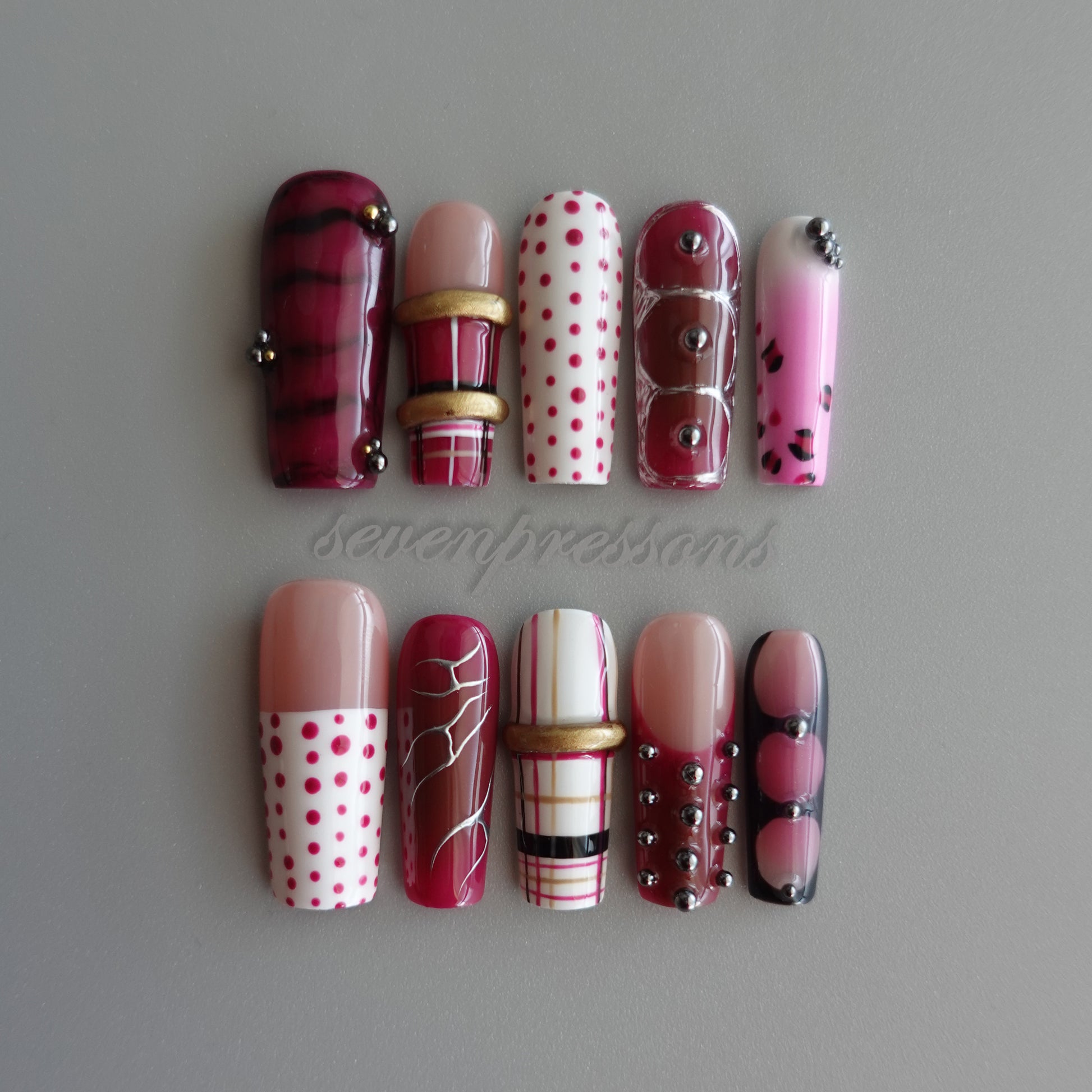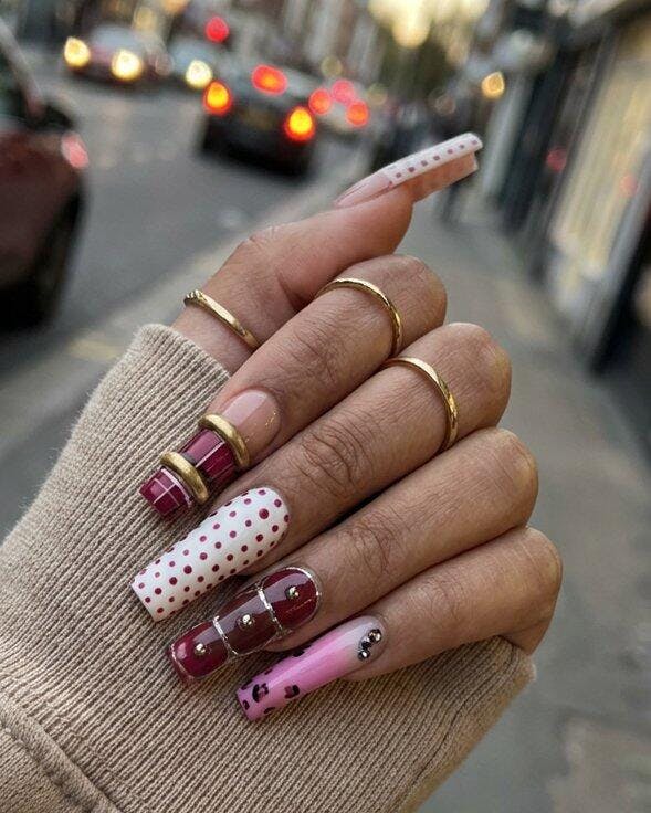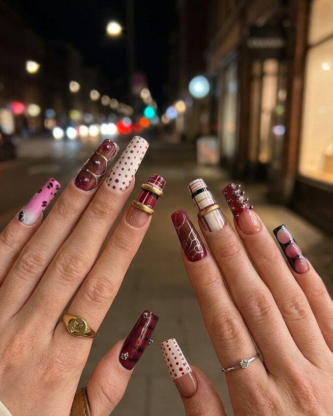 Each nail features a unique pattern, forming a curated mosaic of textures: grid lines, soft pink gradients, abstract geometric shapes, and dimensional metal accents.