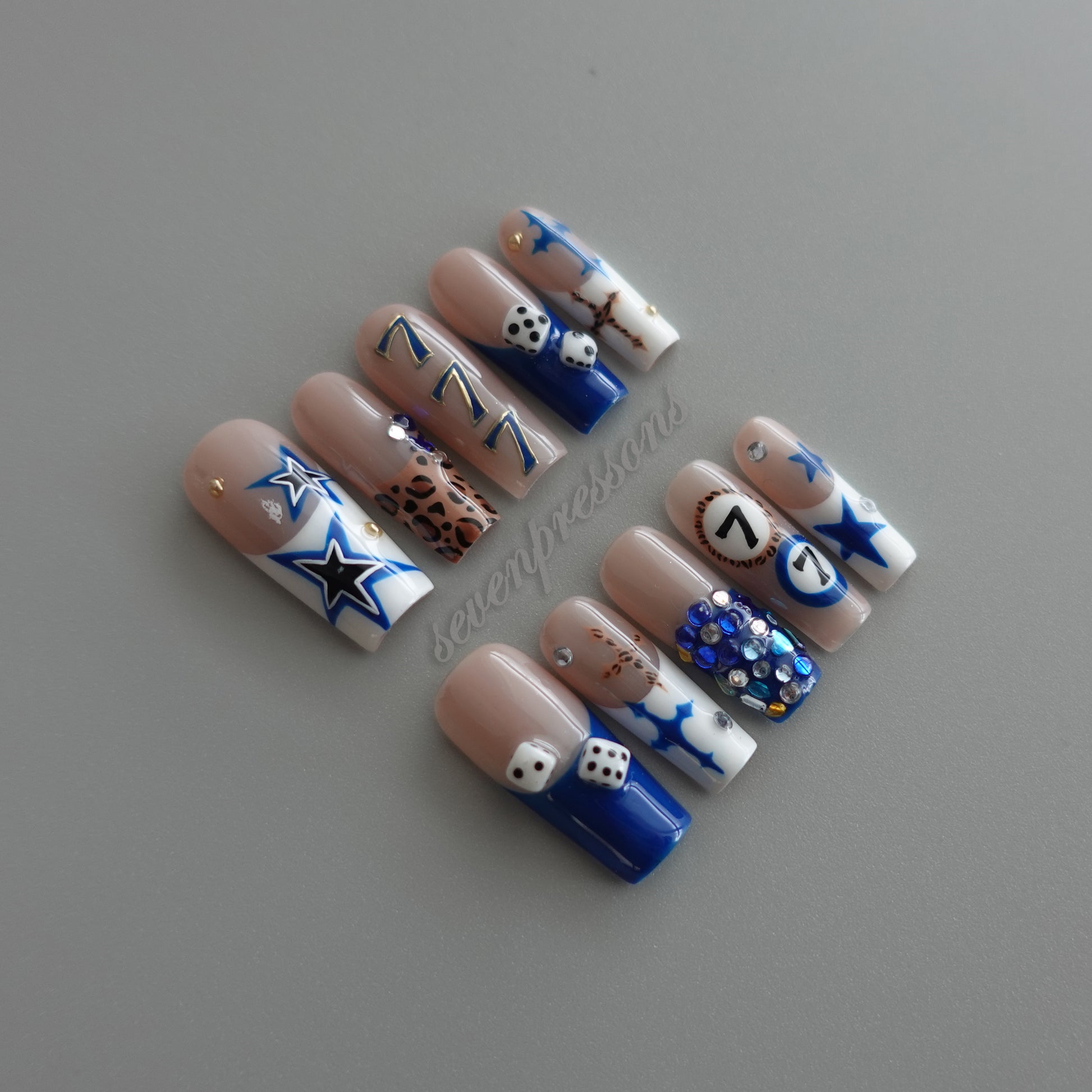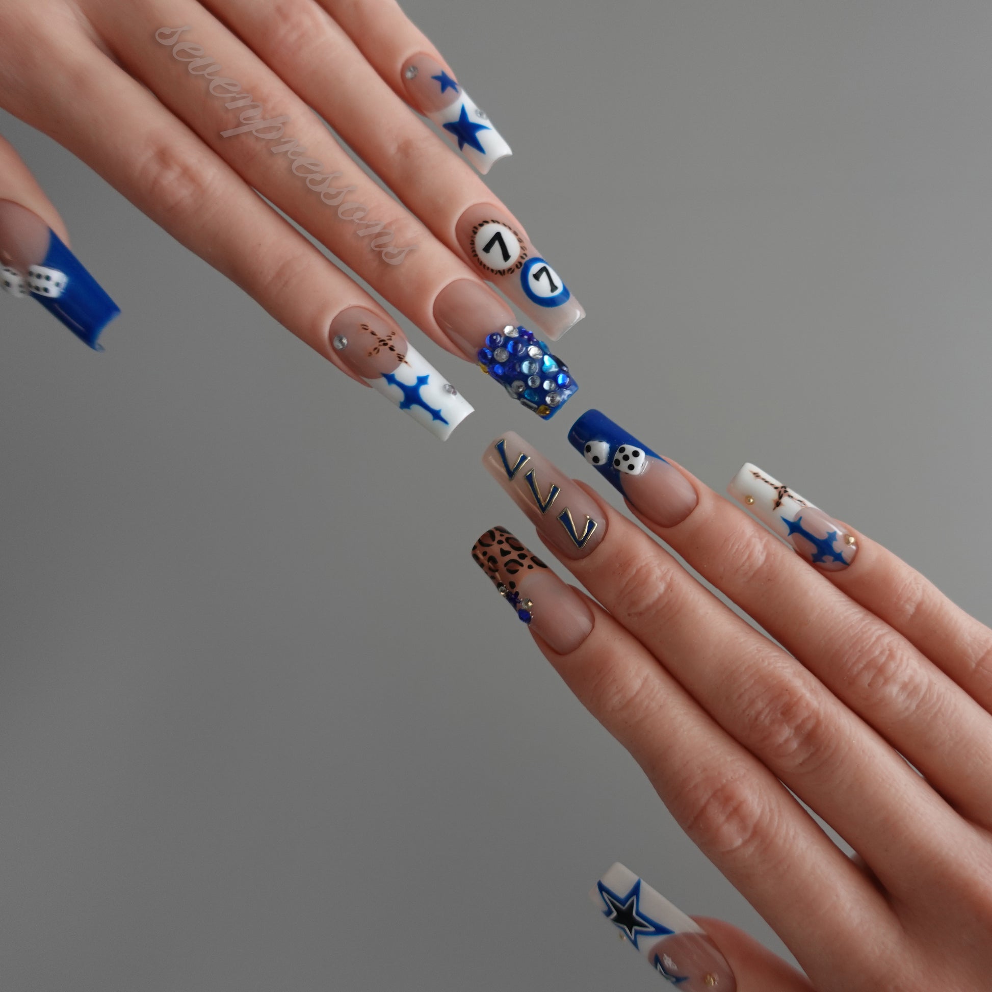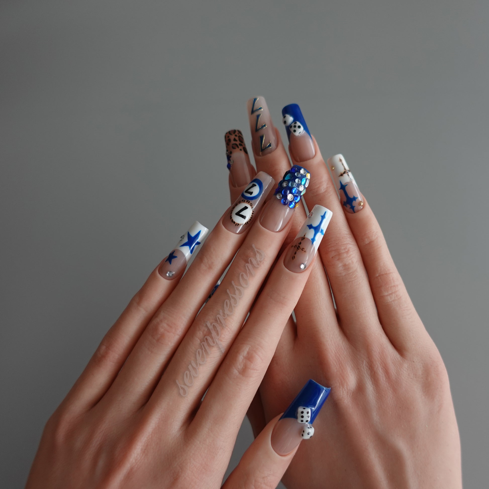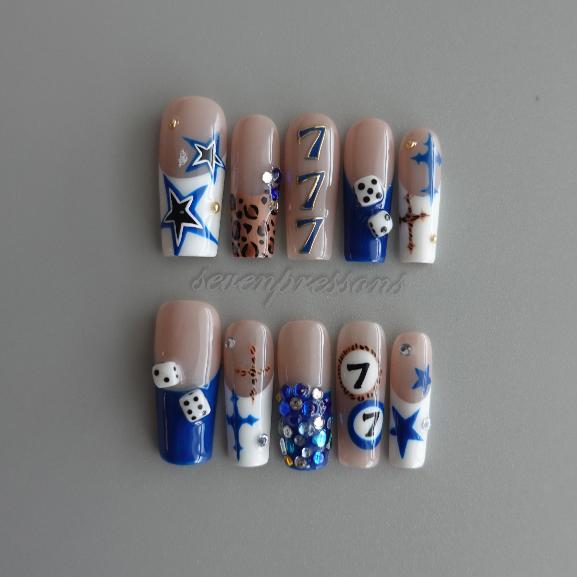 Each nail blends soft nude bases with electric blue edges, metallic linework, and hand-placed rhinestones, forming a look that feels both adventurous and irresistibly stylish — a tribute to luck, glamour, and a little bit of Vegas magic.