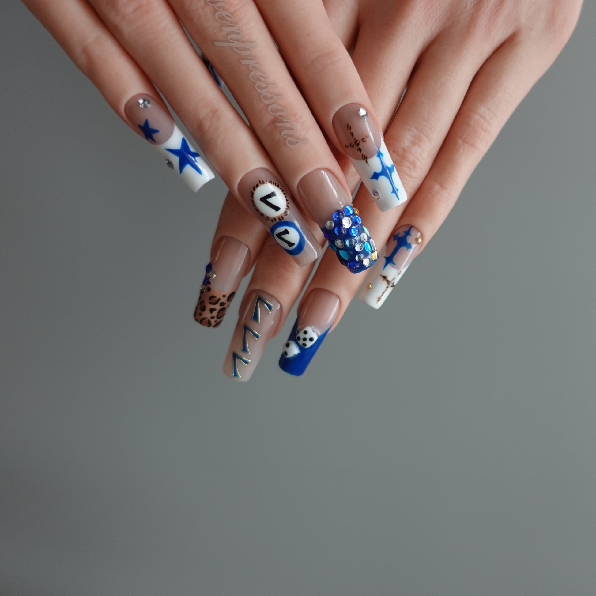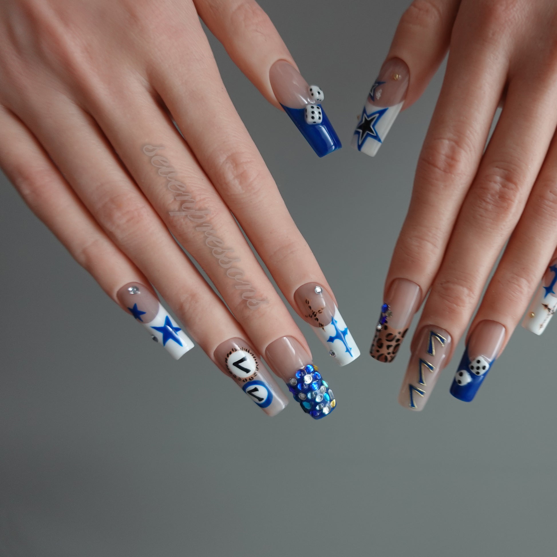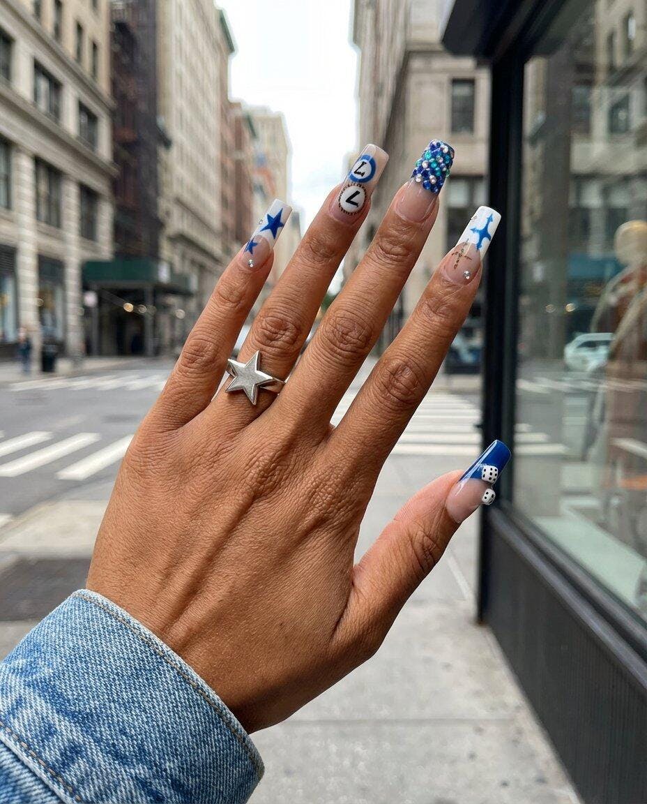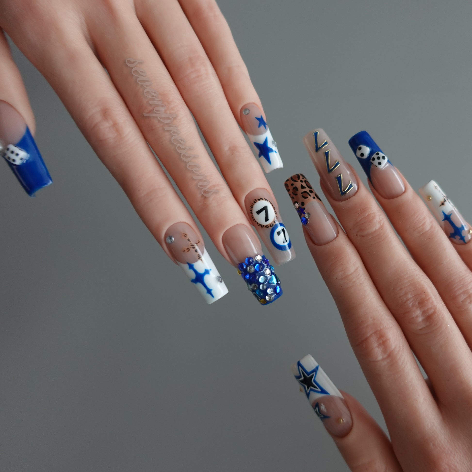 Each nail blends soft nude bases with electric blue edges, metallic linework, and hand-placed rhinestones, forming a look that feels both adventurous and irresistibly stylish — a tribute to luck, glamour, and a little bit of Vegas magic.