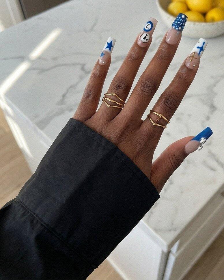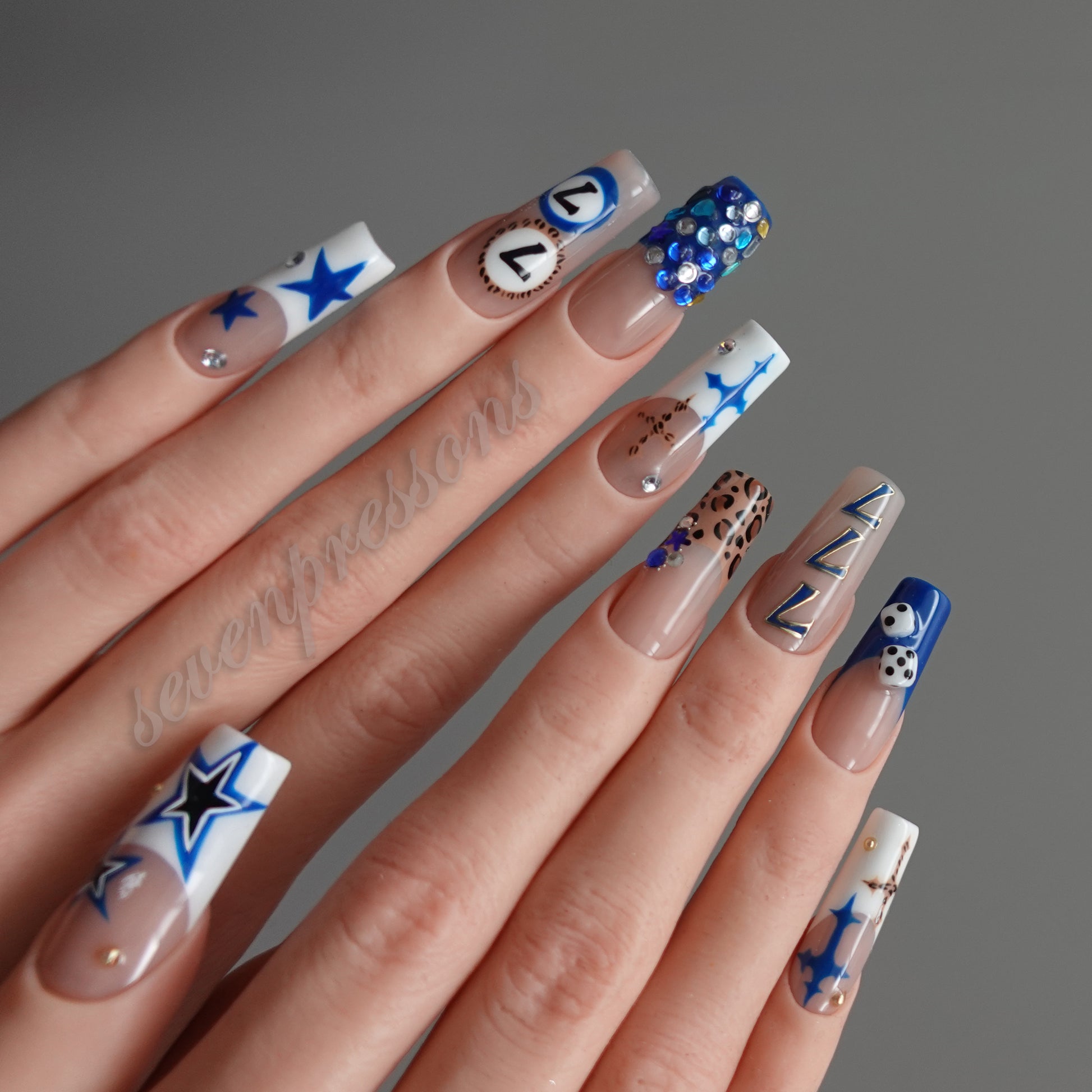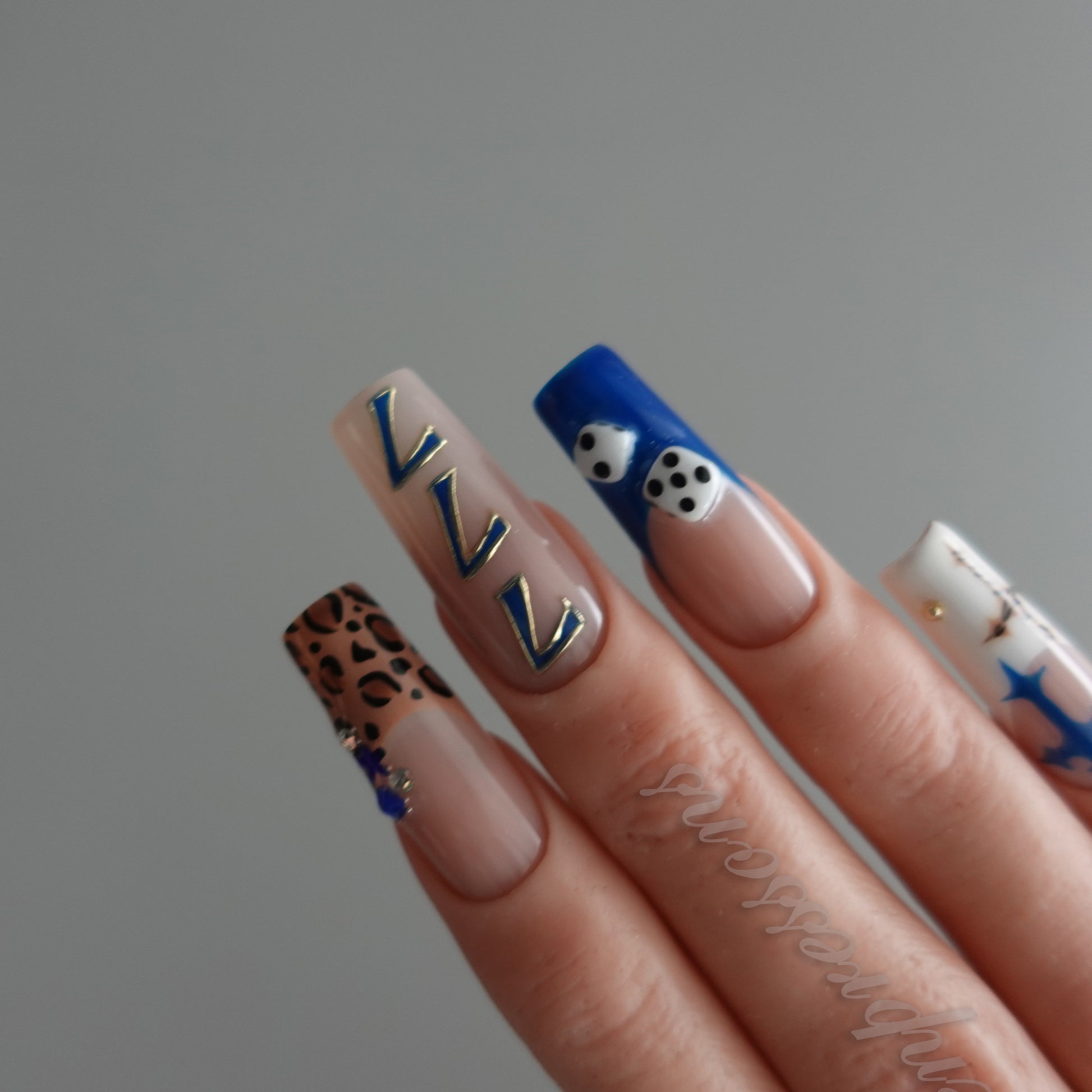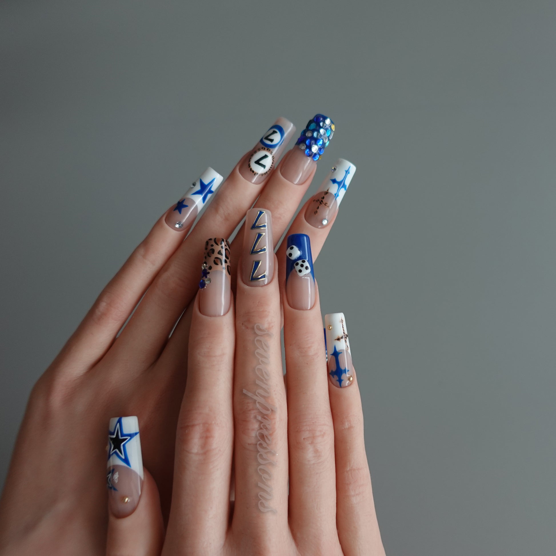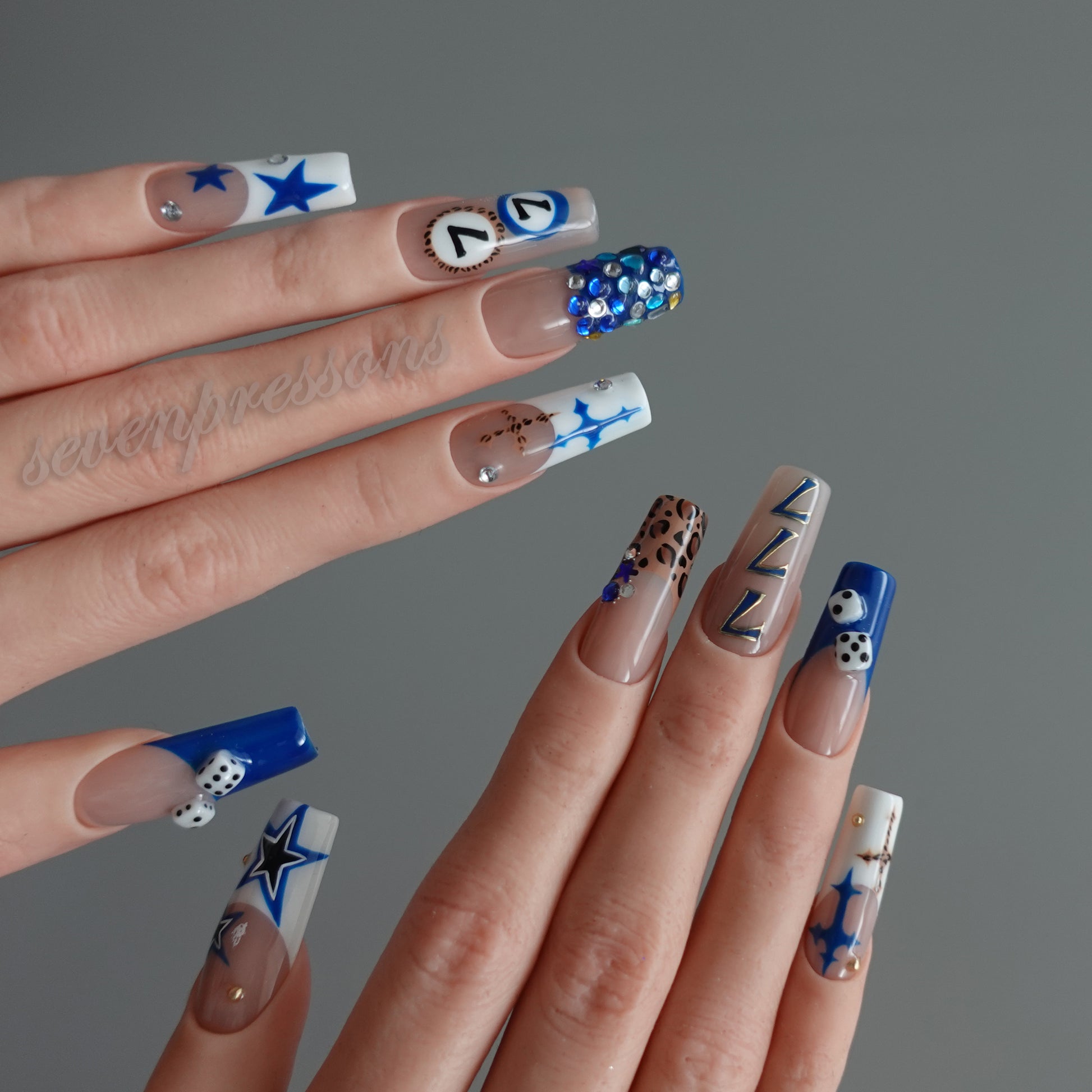 Each nail blends soft nude bases with electric blue edges, metallic linework, and hand-placed rhinestones, forming a look that feels both adventurous and irresistibly stylish — a tribute to luck, glamour, and a little bit of Vegas magic.
