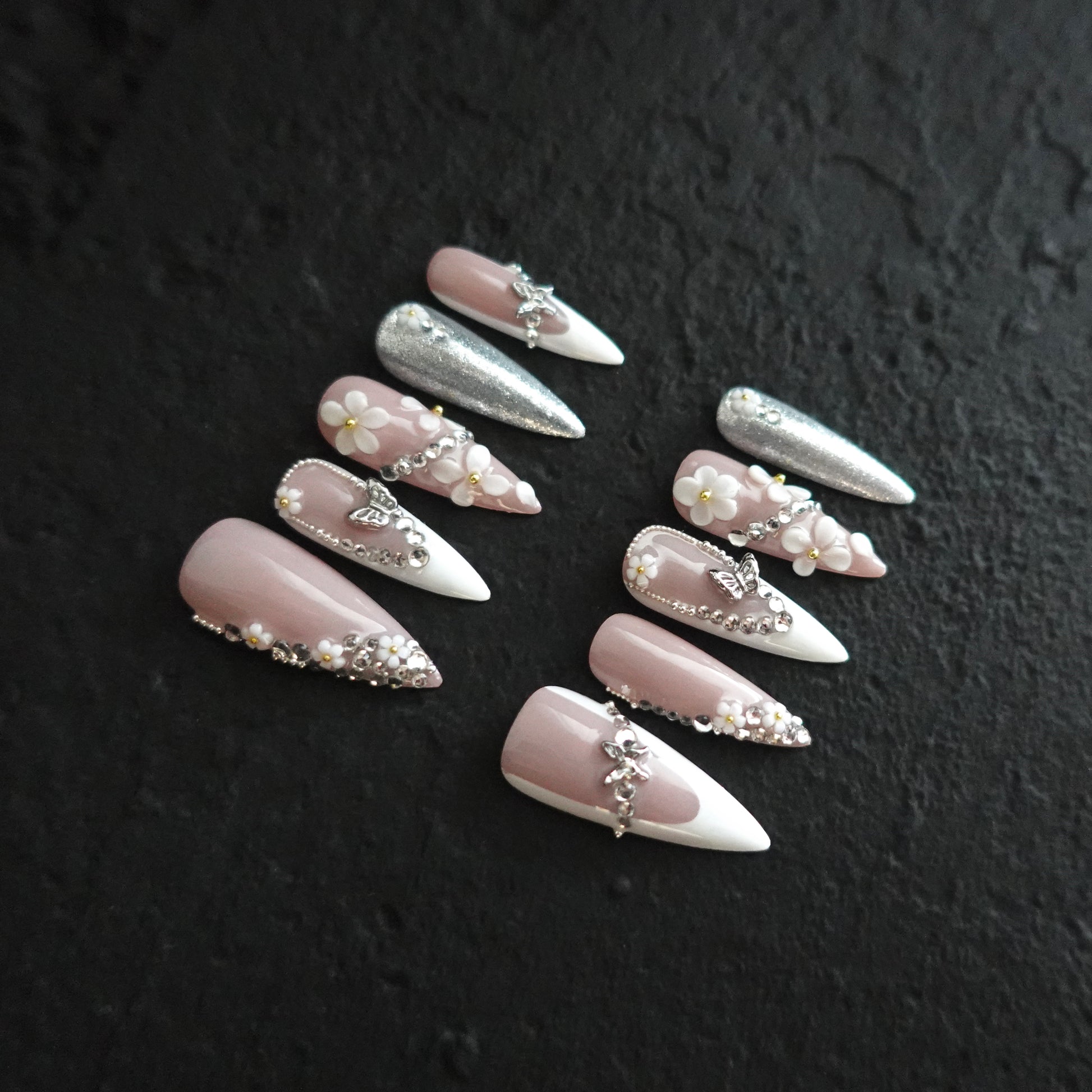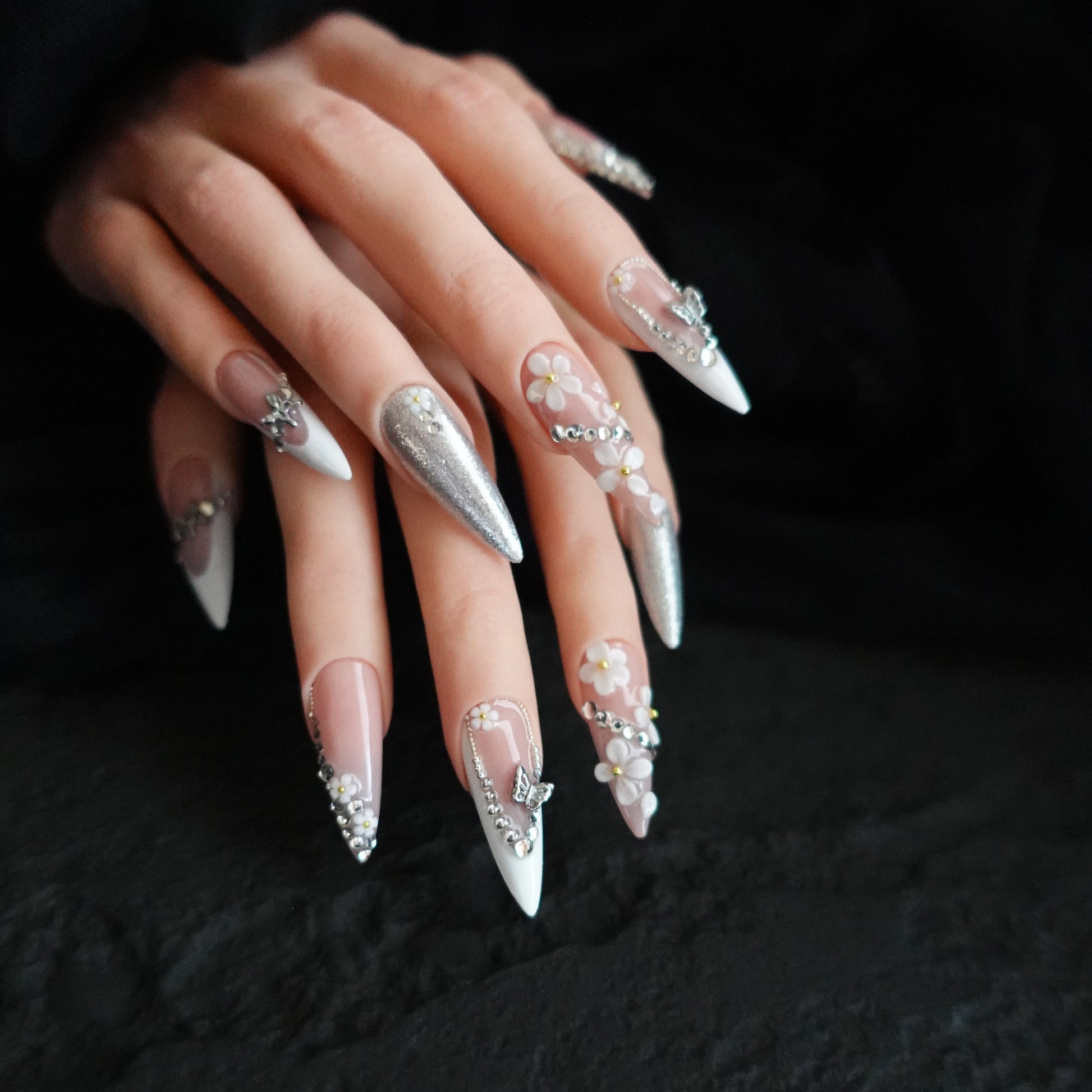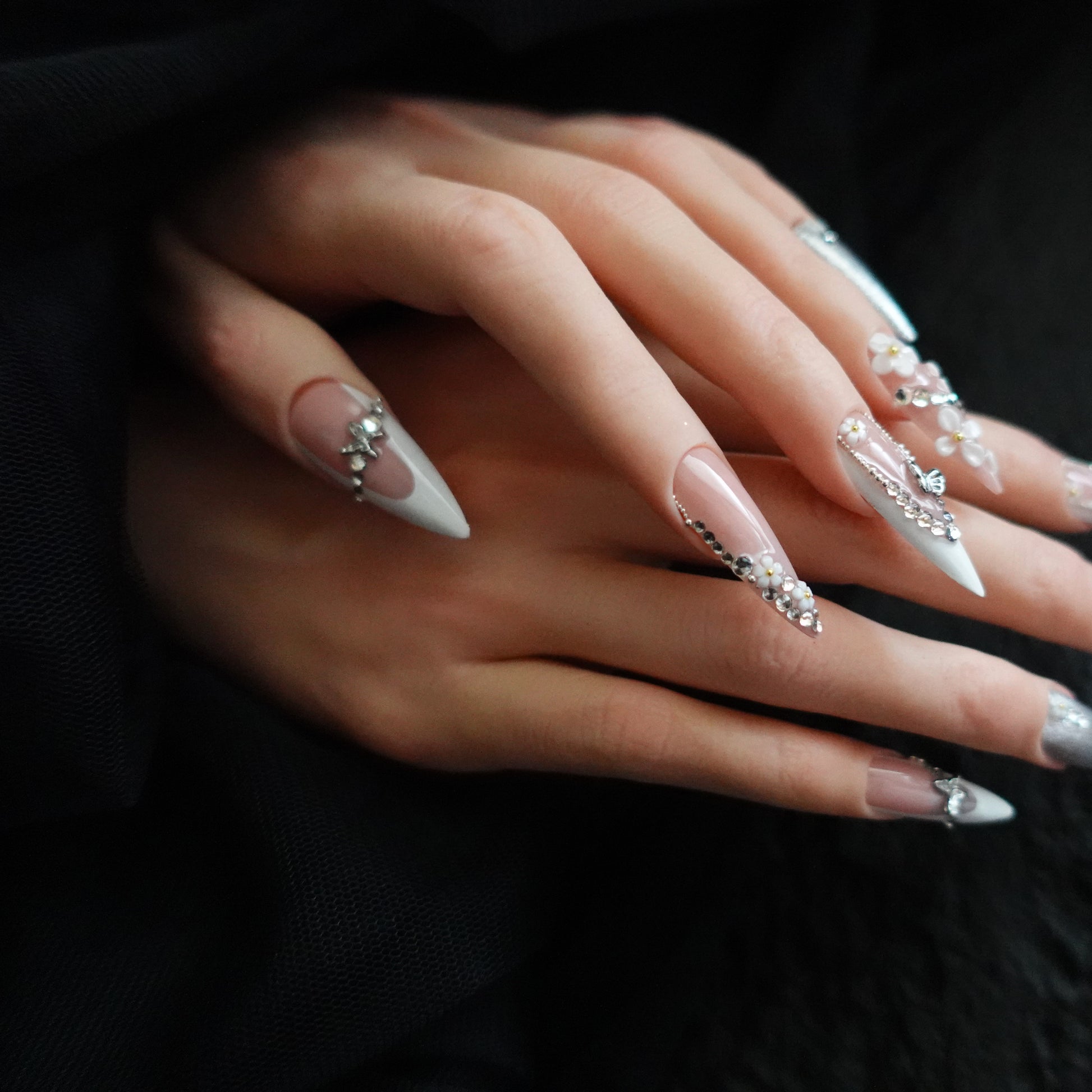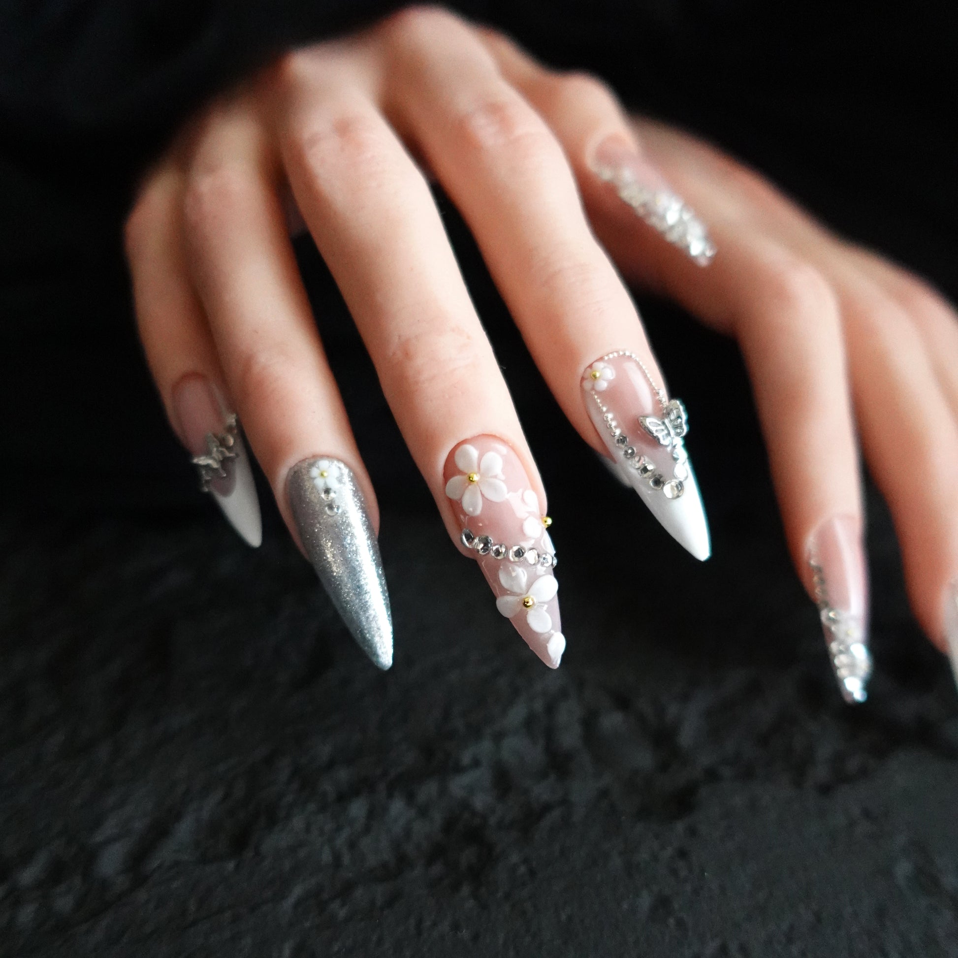 A modern bridal dream in soft nude, ivory, and silver. Starlit Veil pairs sculpted blossoms and pearl accents with crisp French tips and a single moonlit glitter accent—elegant, romantic, and camera-ready for weddings and all your luminous moments.