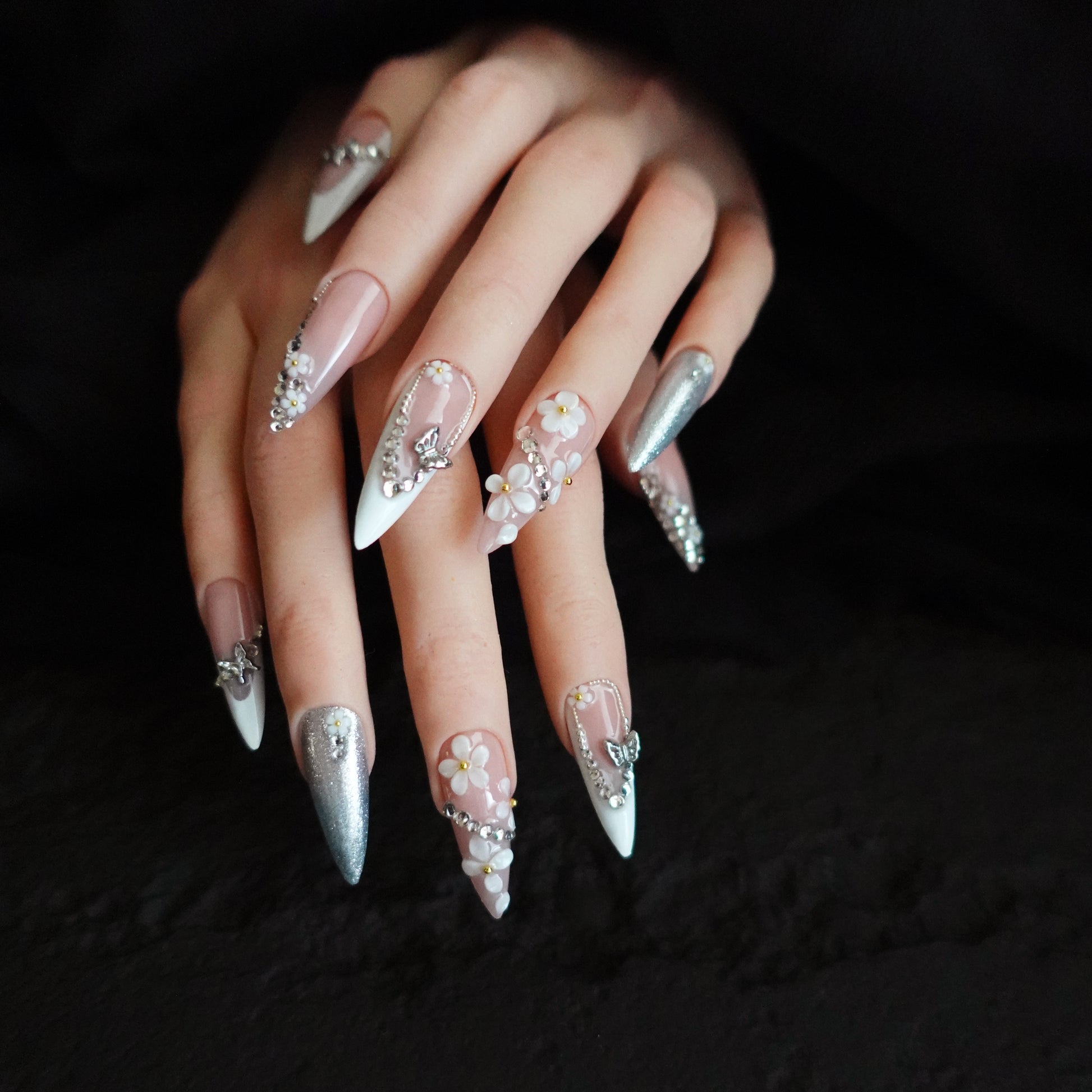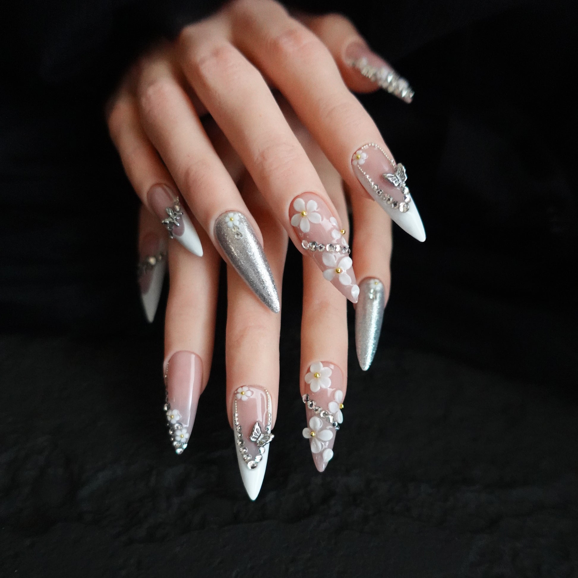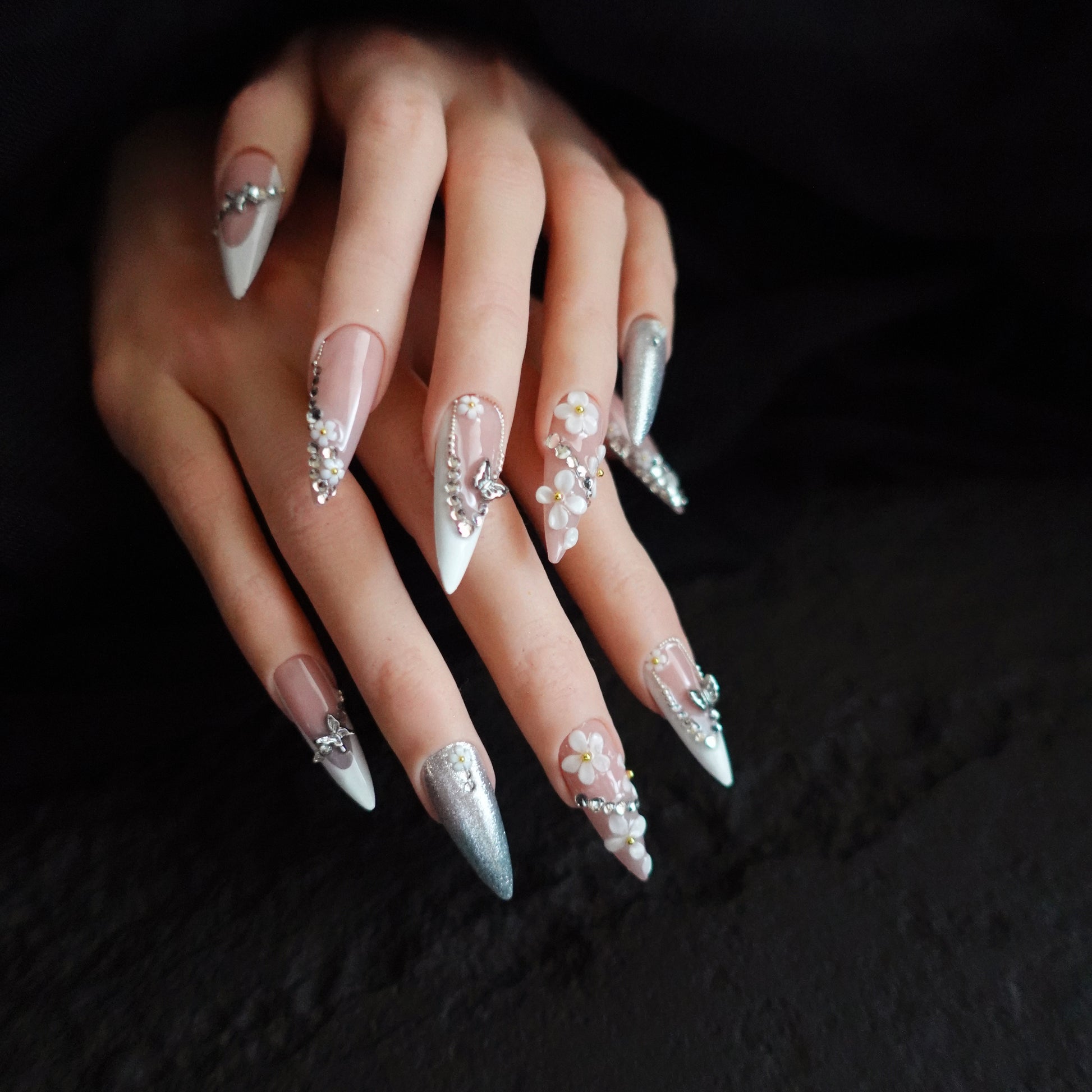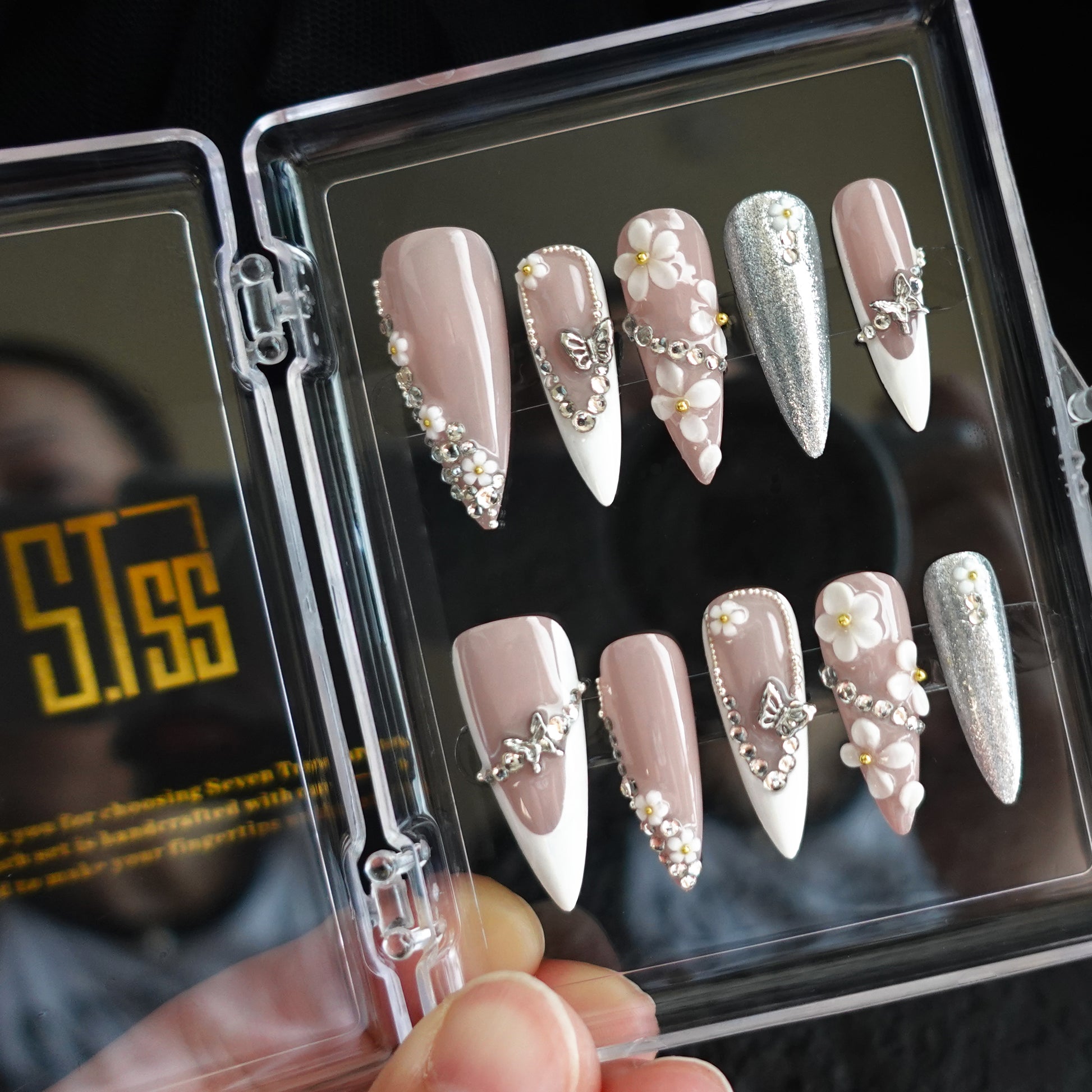 A modern bridal dream in soft nude, ivory, and silver. Starlit Veil pairs sculpted blossoms and pearl accents with crisp French tips and a single moonlit glitter accent—elegant, romantic, and camera-ready for weddings and all your luminous moments.