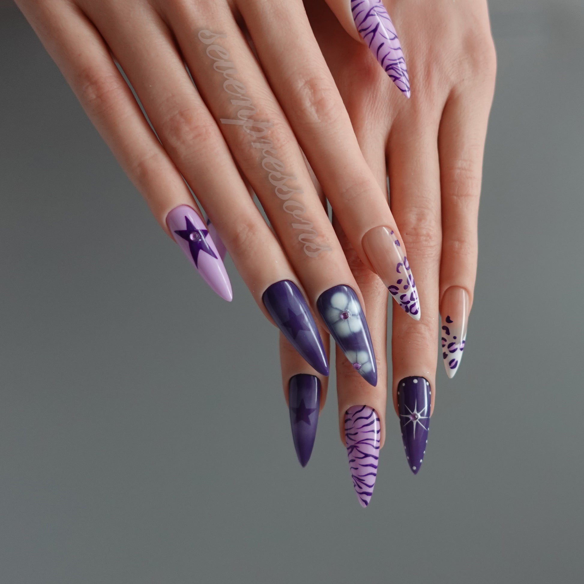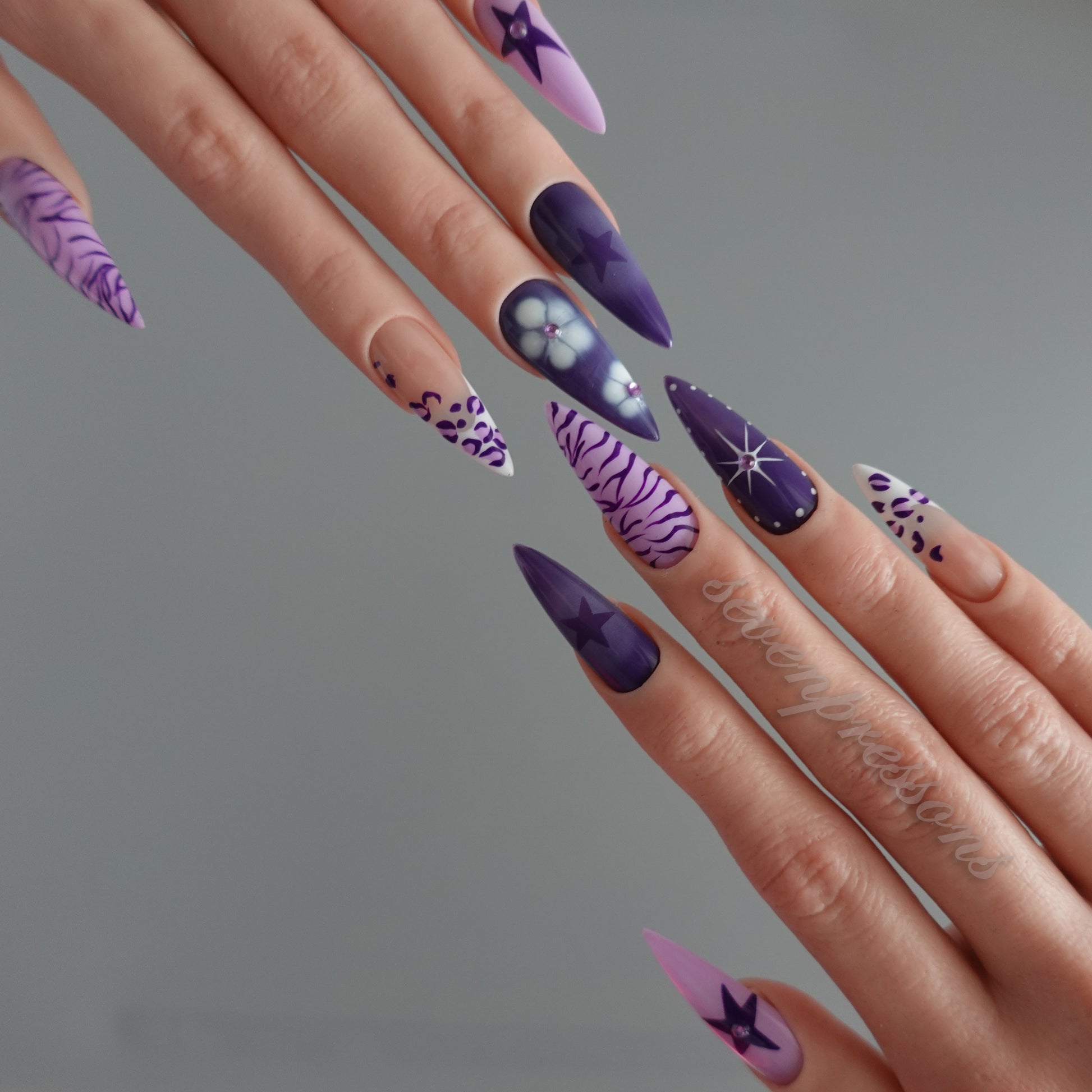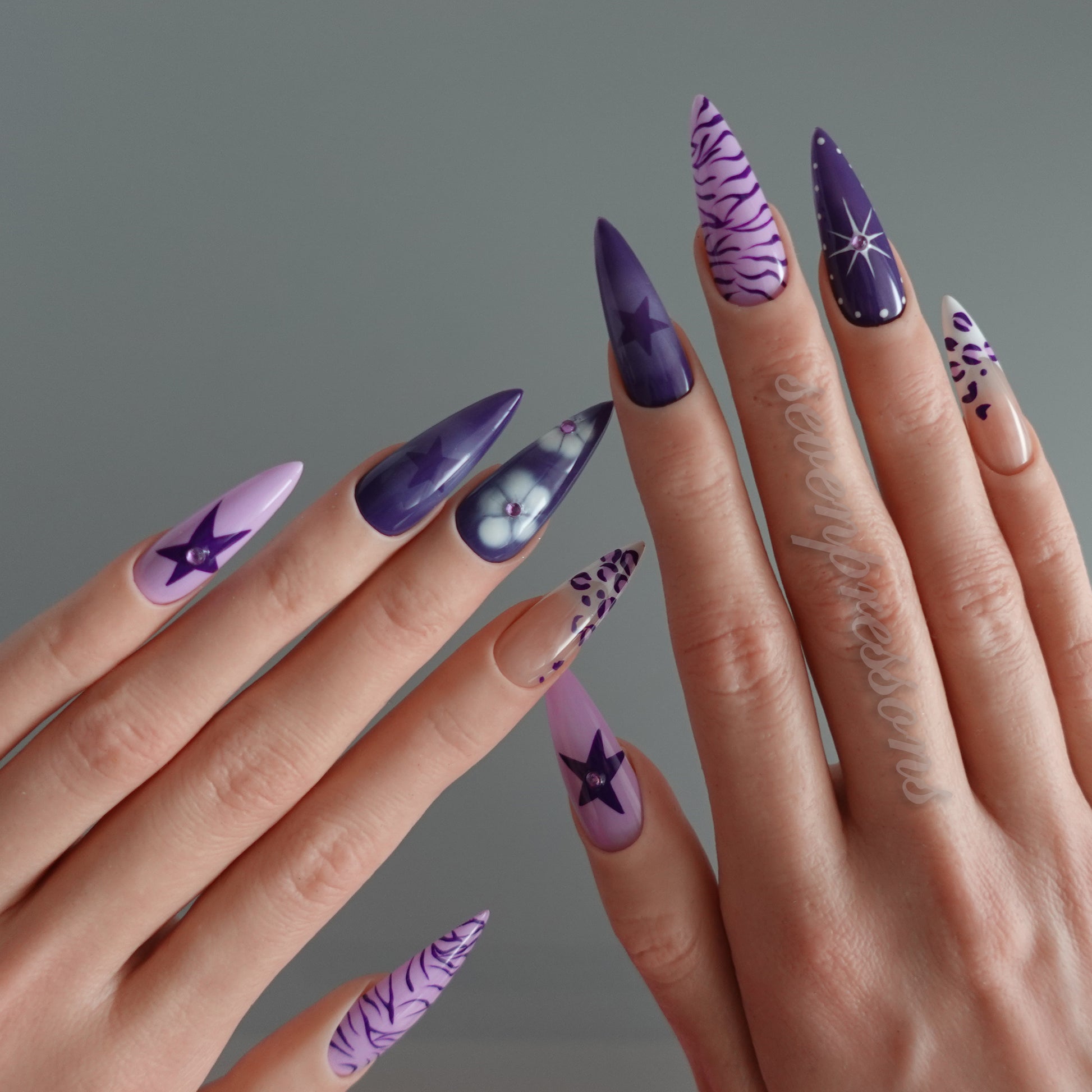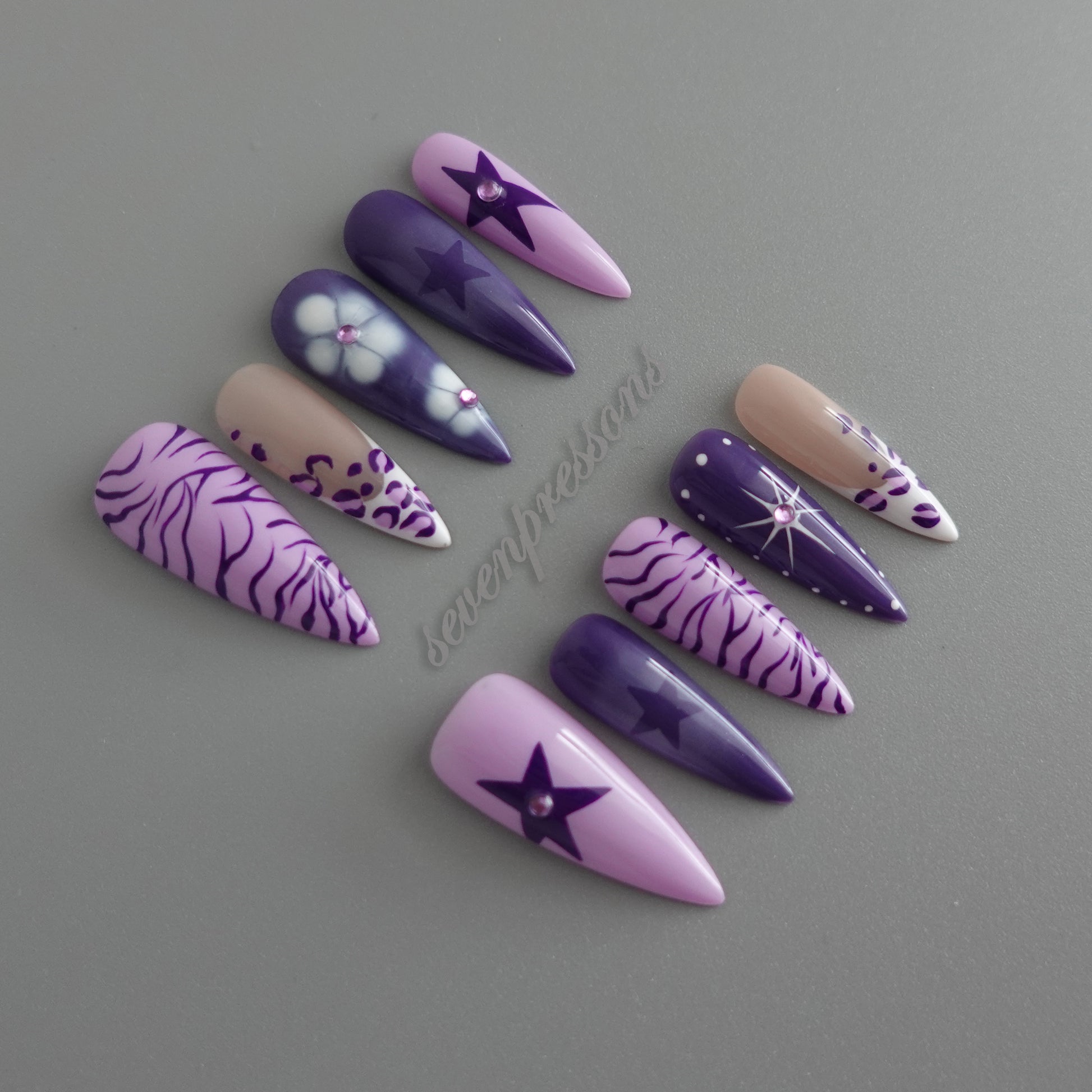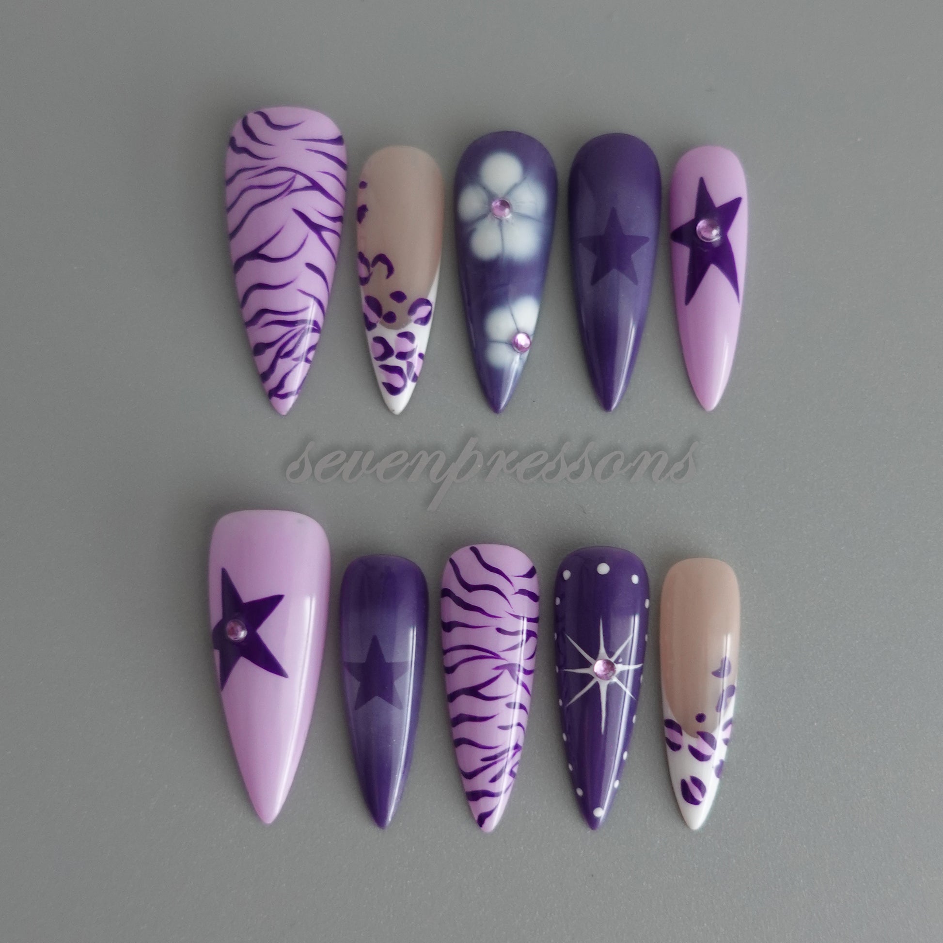 Soft lilac meets deep night-sky purple, while zebra stripes, leopard spots, and glowing star motifs form a playful yet enchanting contrast.