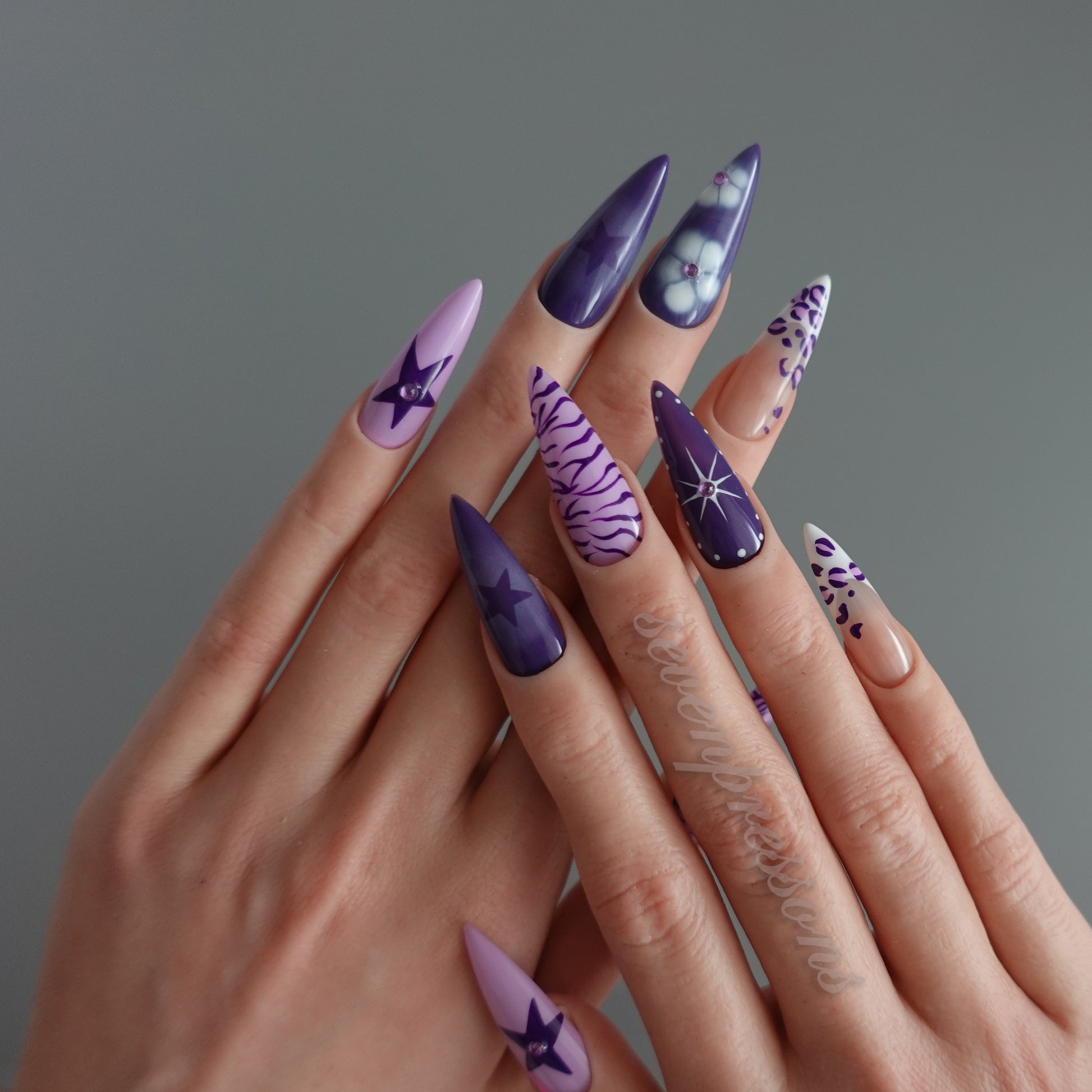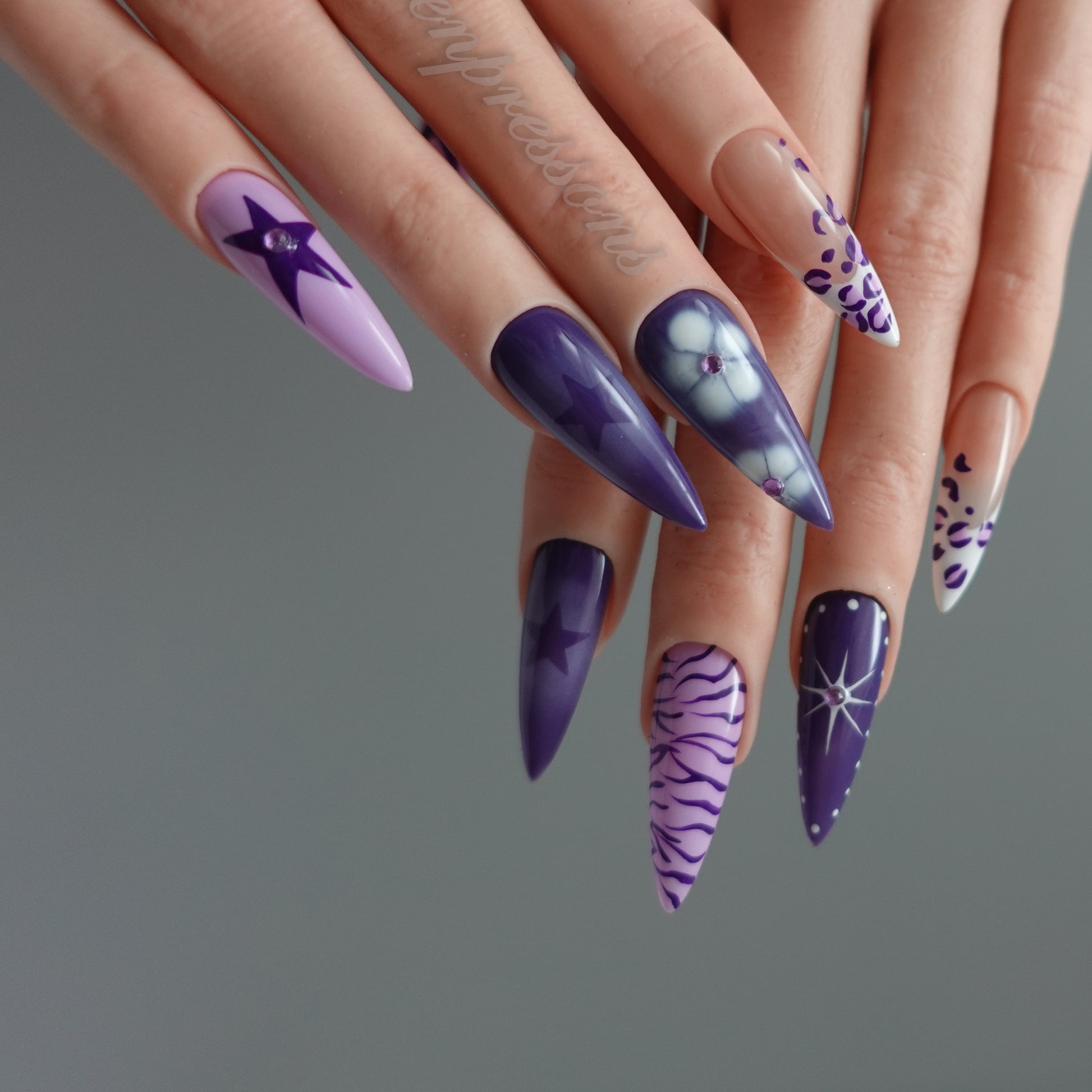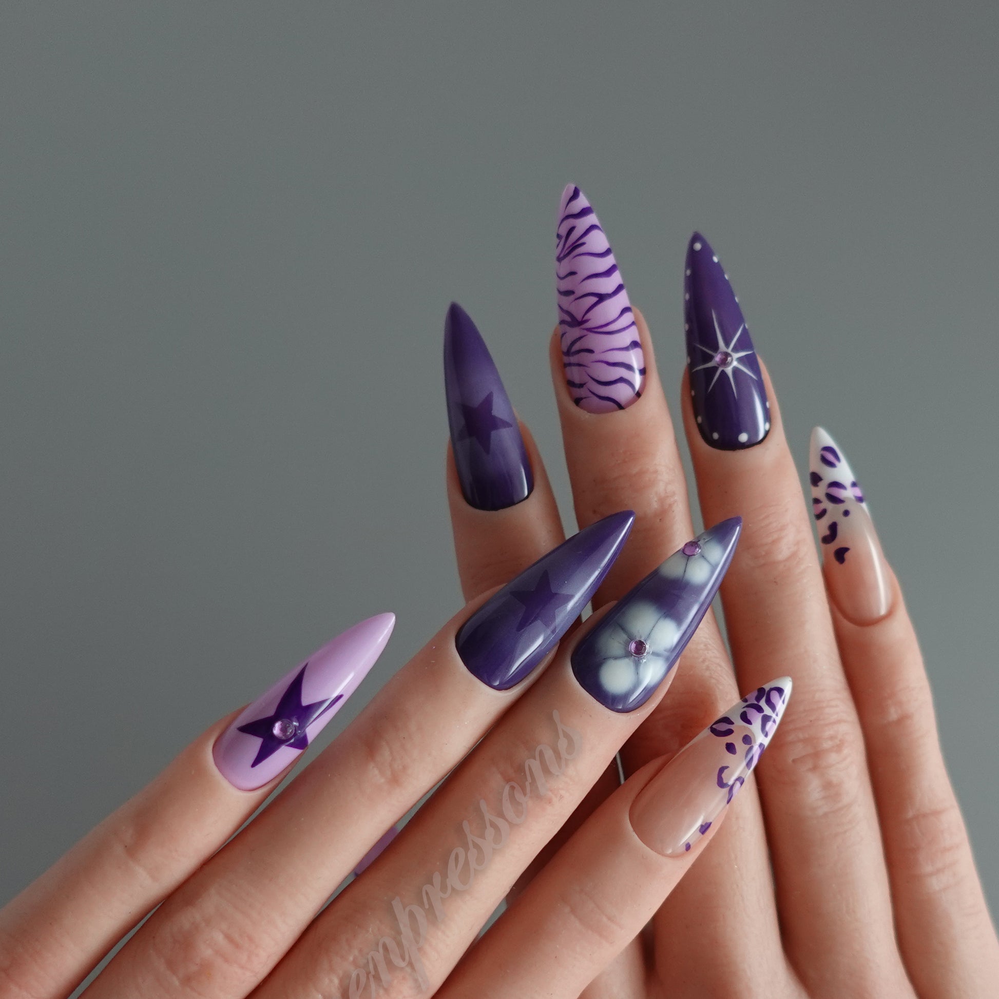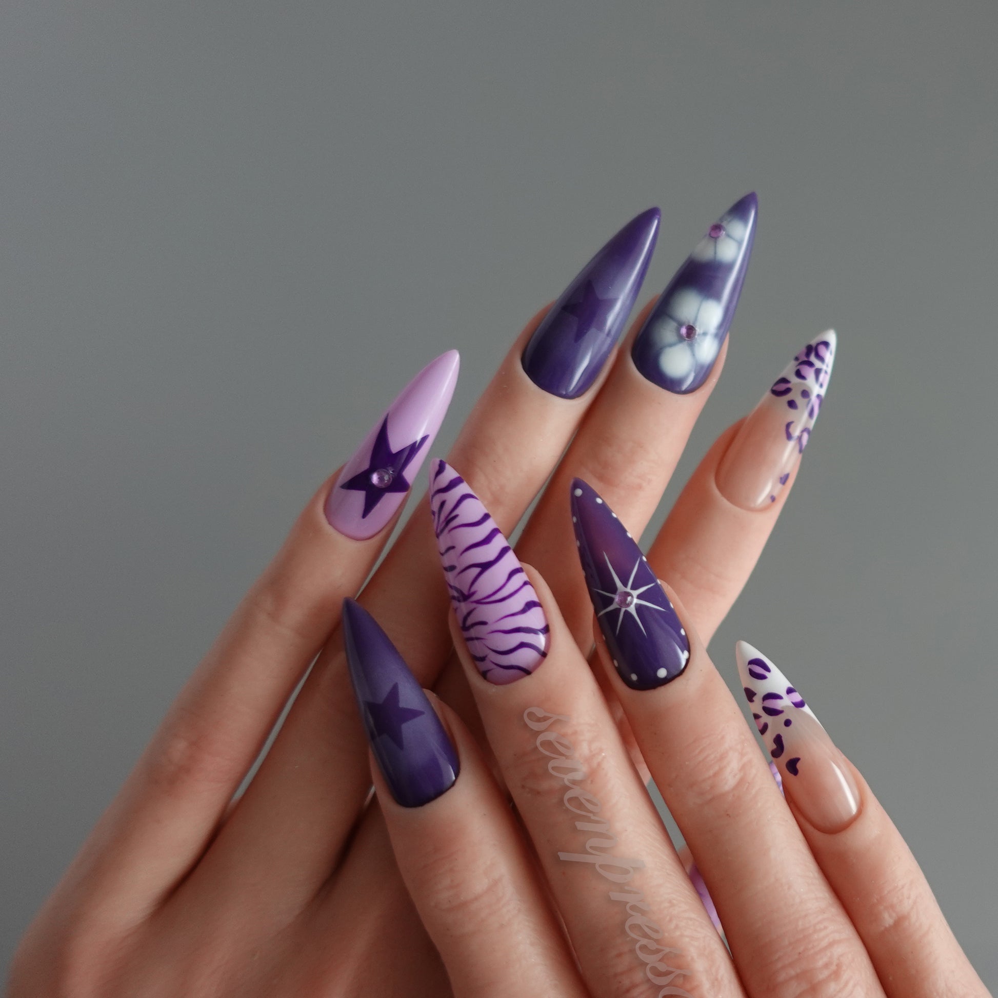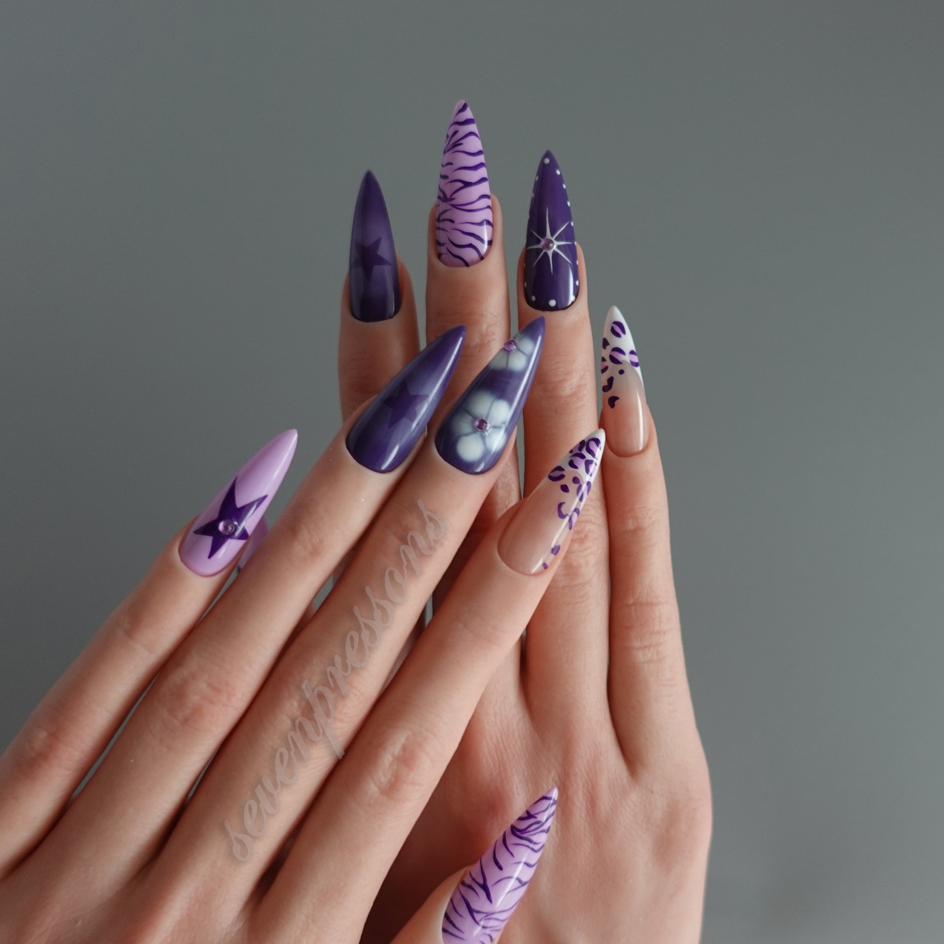 Soft lilac meets deep night-sky purple, while zebra stripes, leopard spots, and glowing star motifs form a playful yet enchanting contrast.