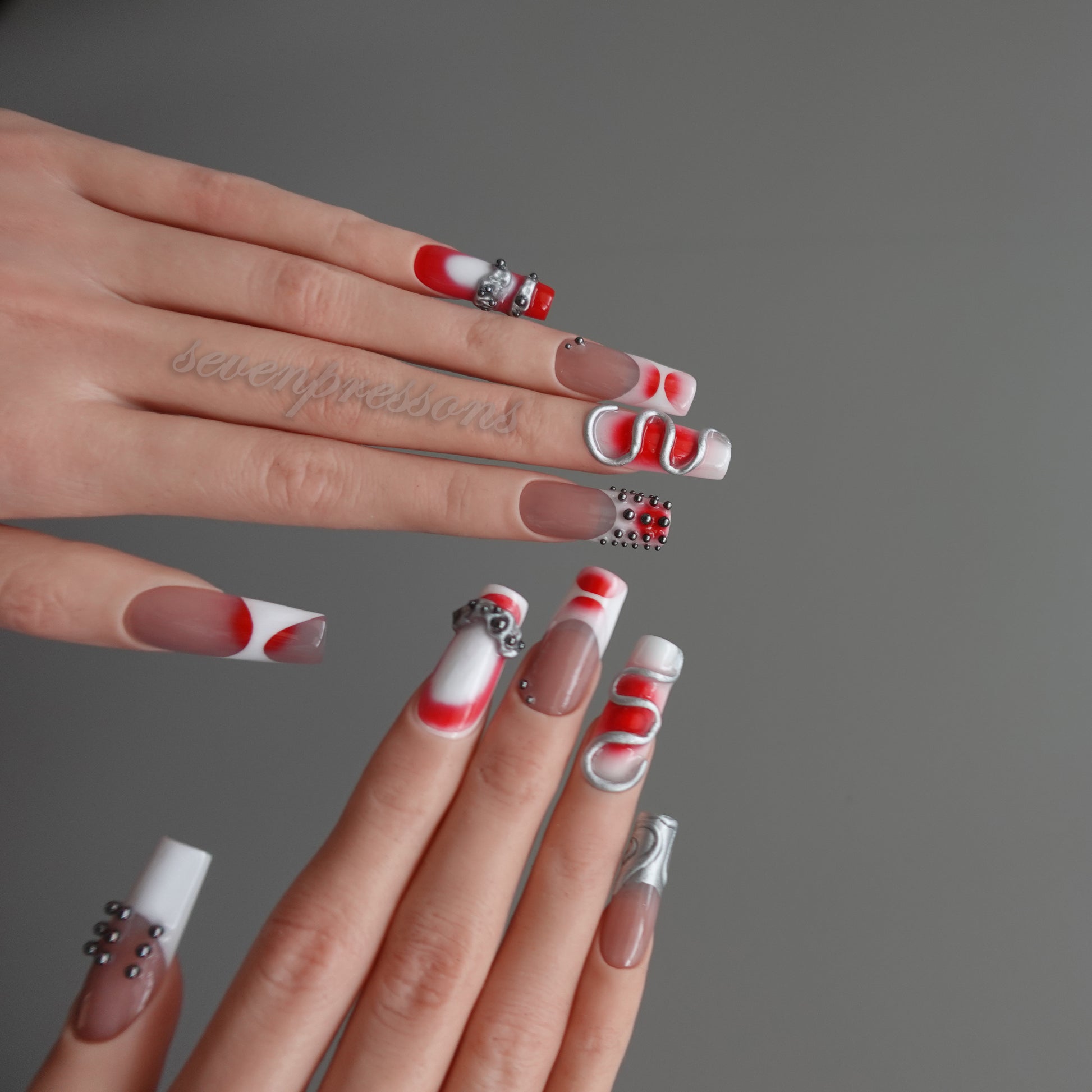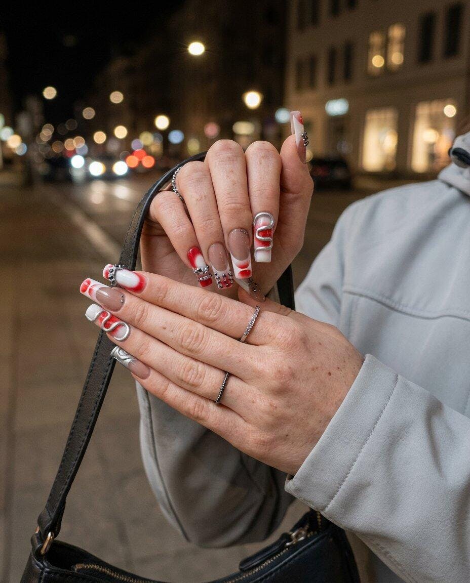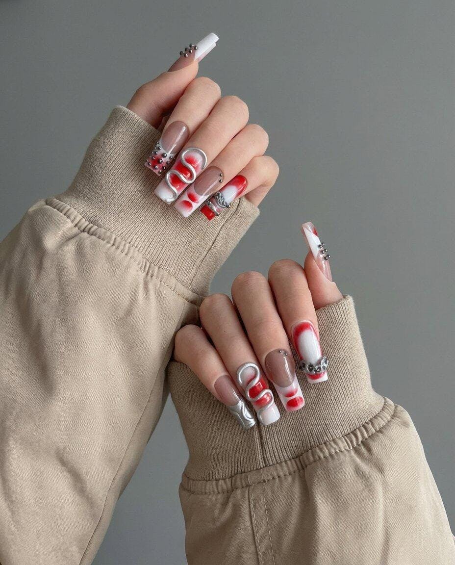 Deep crimson strokes wrap around soft nude tones, while fluid silver 3D structures and gunmetal studs create a powerful mechanical dimension — as if each nail carries its own pulse of engineered energy.