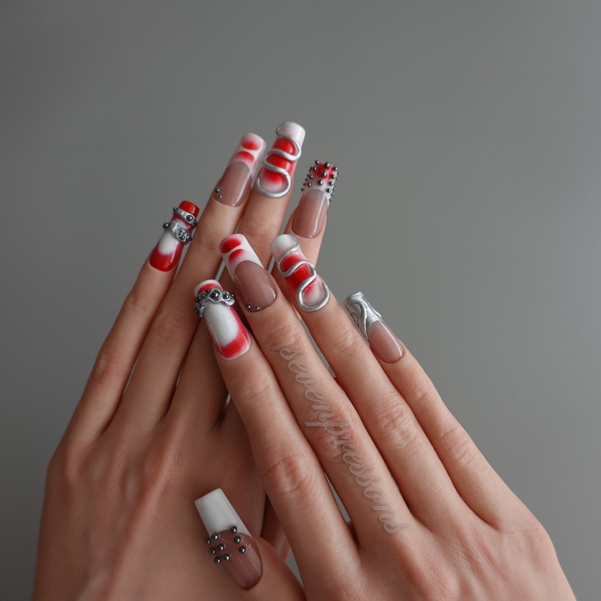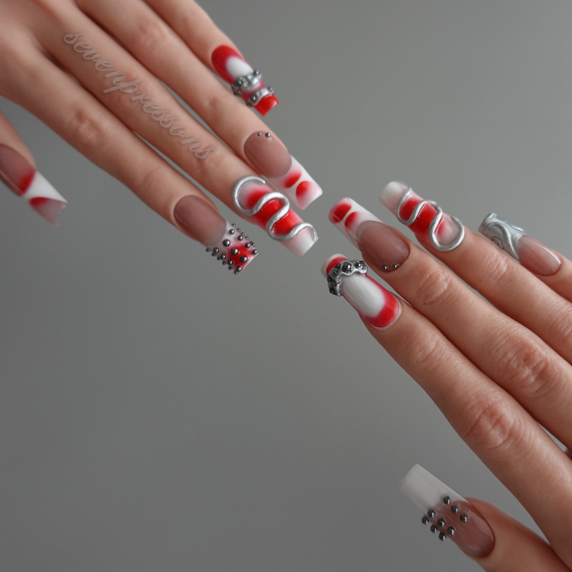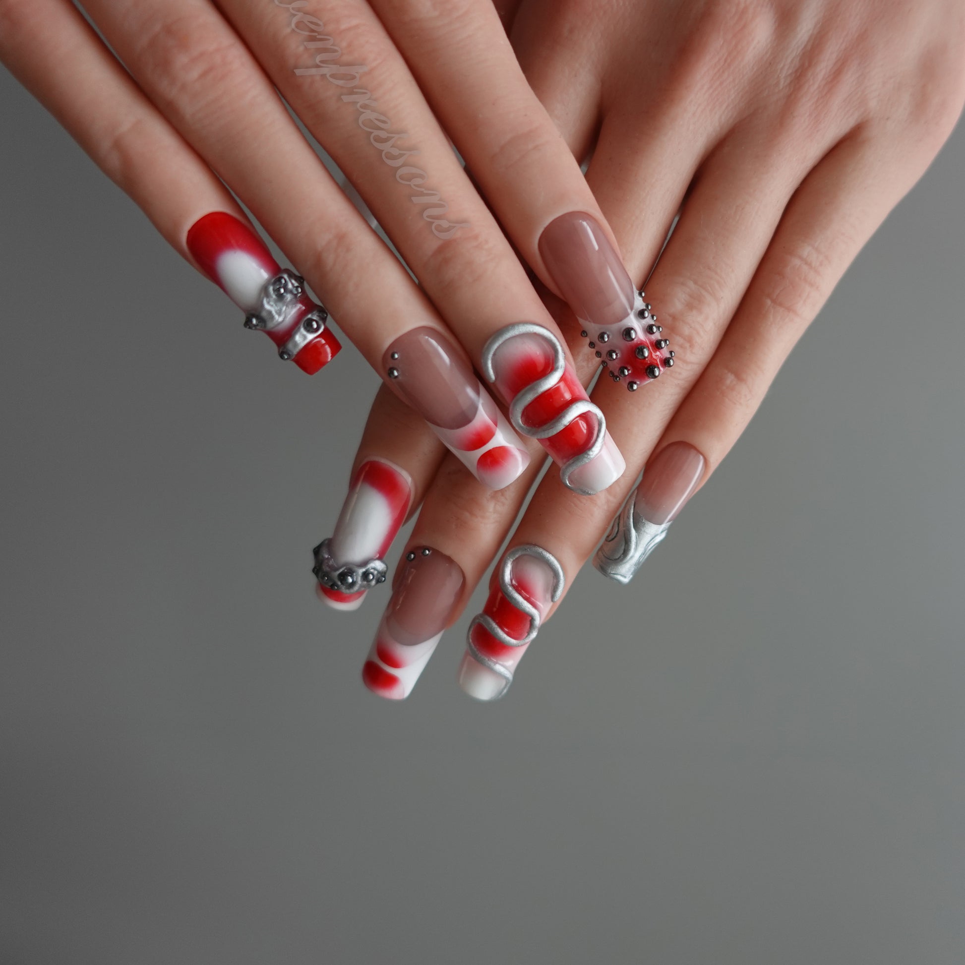 Deep crimson strokes wrap around soft nude tones, while fluid silver 3D structures and gunmetal studs create a powerful mechanical dimension — as if each nail carries its own pulse of engineered energy.