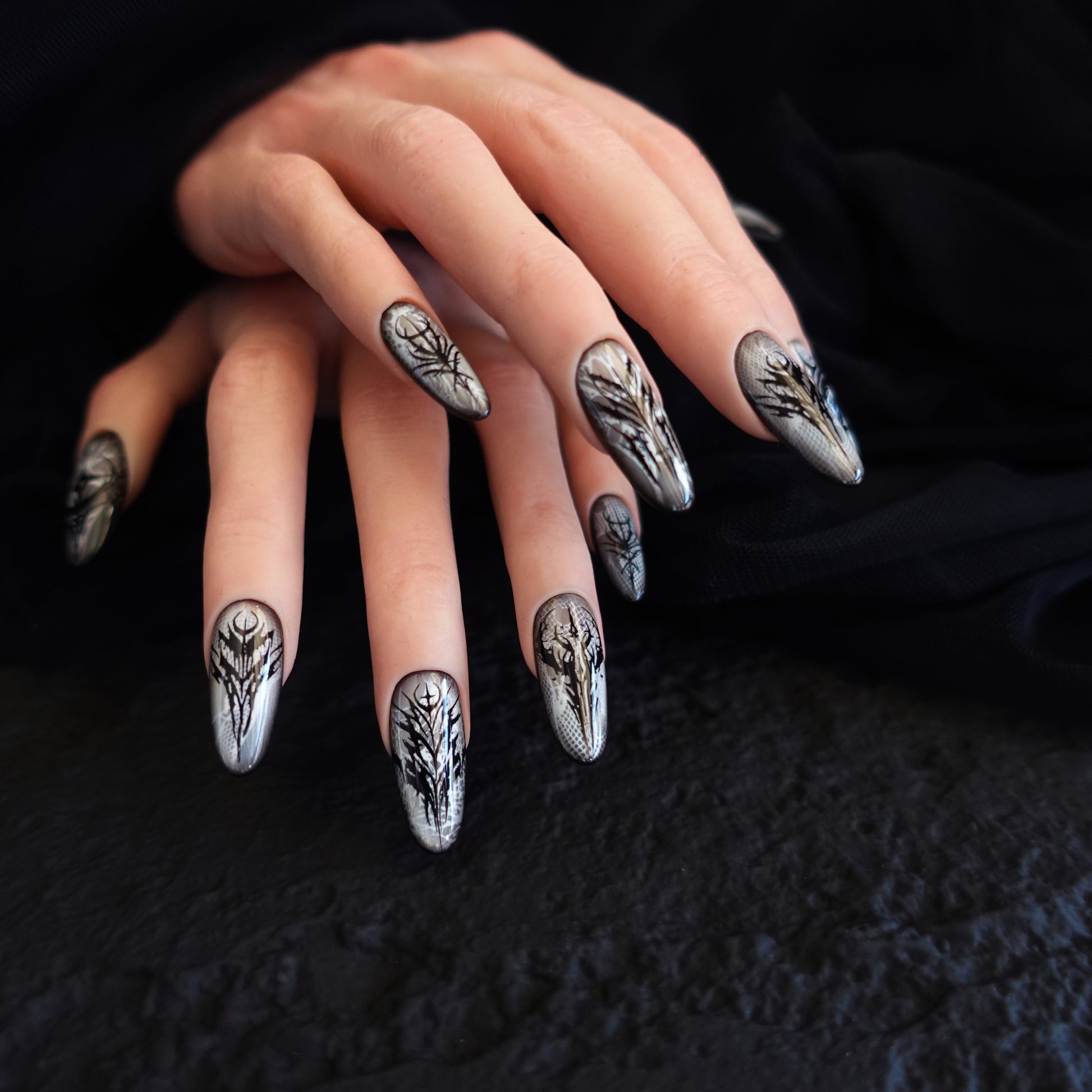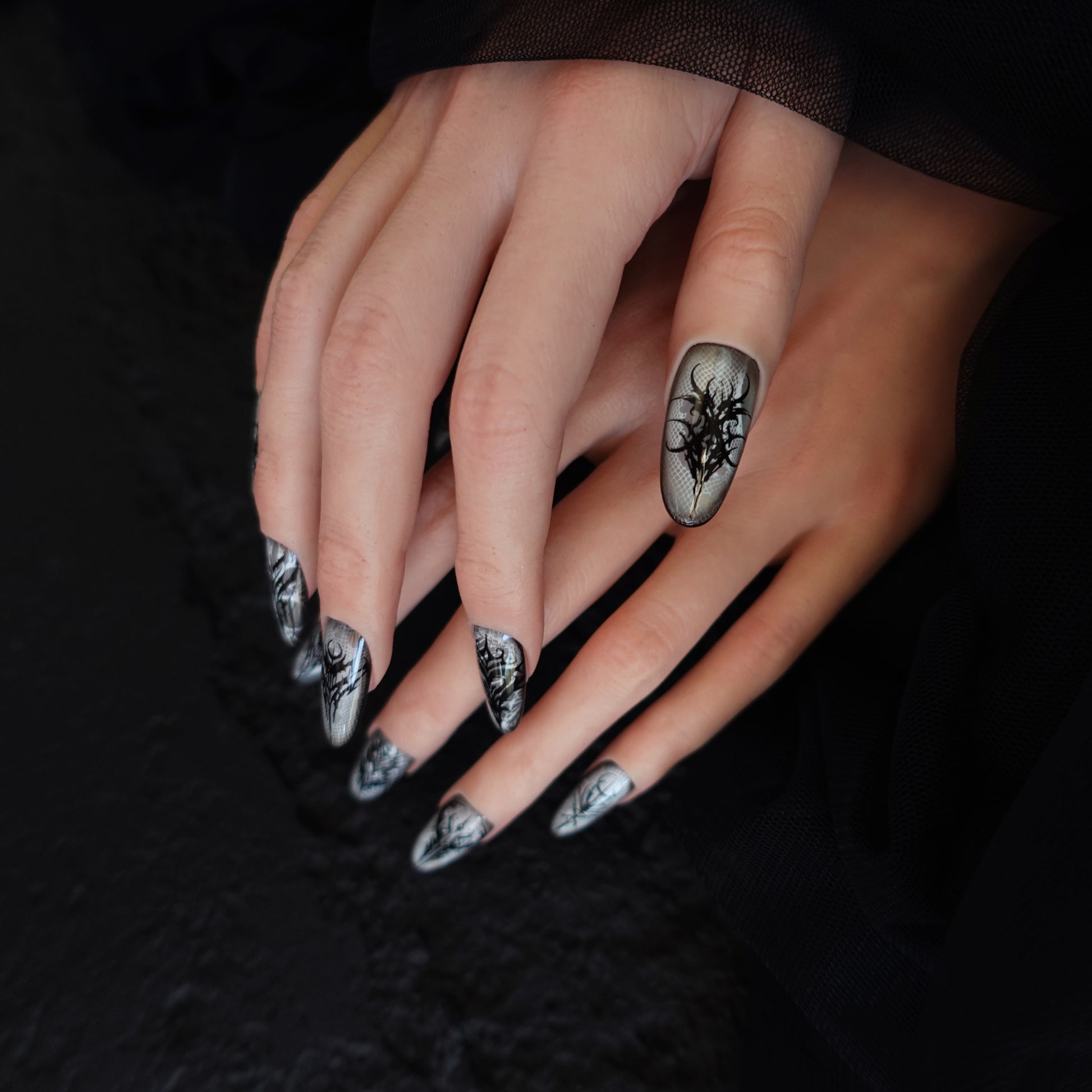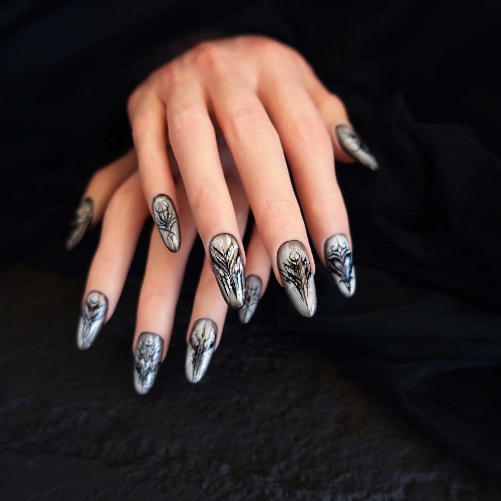 Seven Treasures — Where Every Nail Tells a Story. Step into the shadows and wear the marks of myth and metal. Shadowmark is a monochrome warrior set, etched in gothic tribal motifs over a silvery chrome mesh. Each nail bears a unique emblem — like runes forged in steel and sealed with shadow. It’s the perfect set for those who walk the line between elegance and chaos.✨ Features: • 100% Handcrafted & Made-to-Order • Hand-painted tribal & sigil-inspired detailing • Metallic chrome gradient base with mesh texture effect • Color Palette: Silver Steel, Charcoal, Gunmetal • Shape: Almond (customizable) • Lightweight, durable, and reusable with proper care • Sealed with a glossy protective gel topcoat