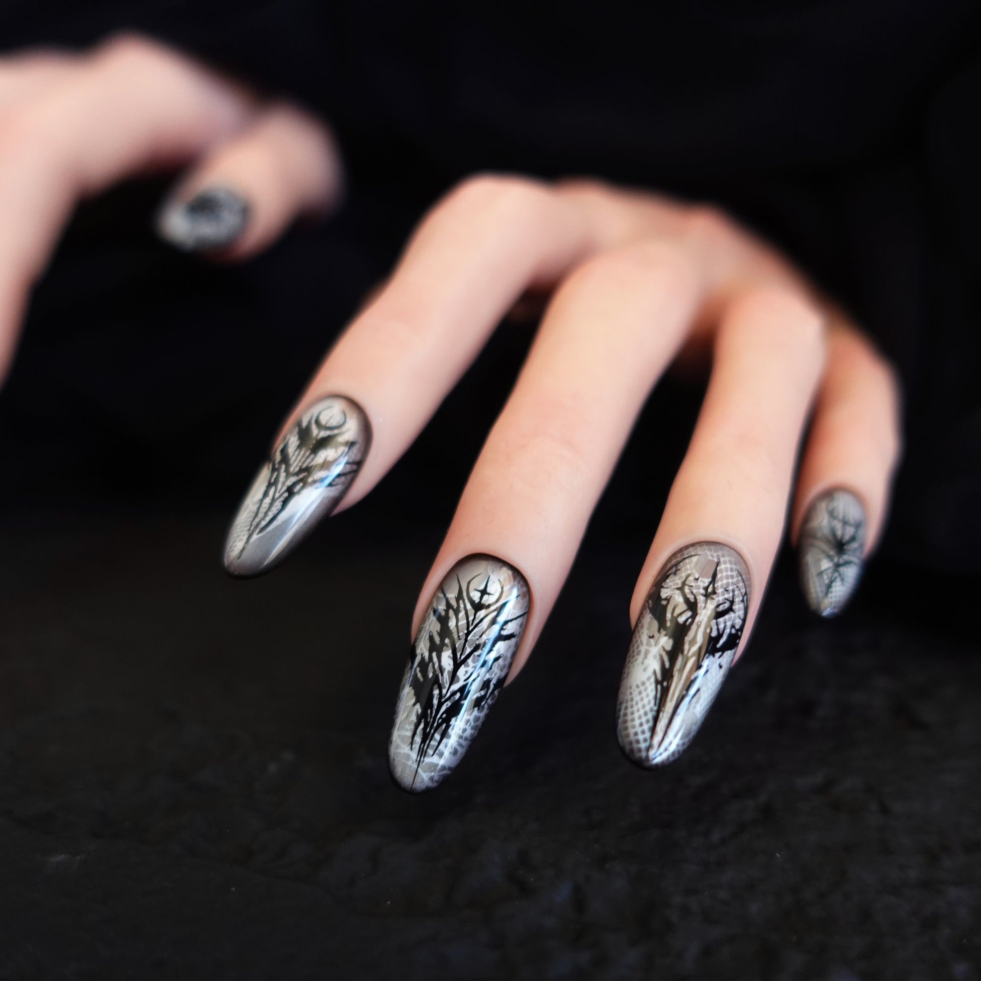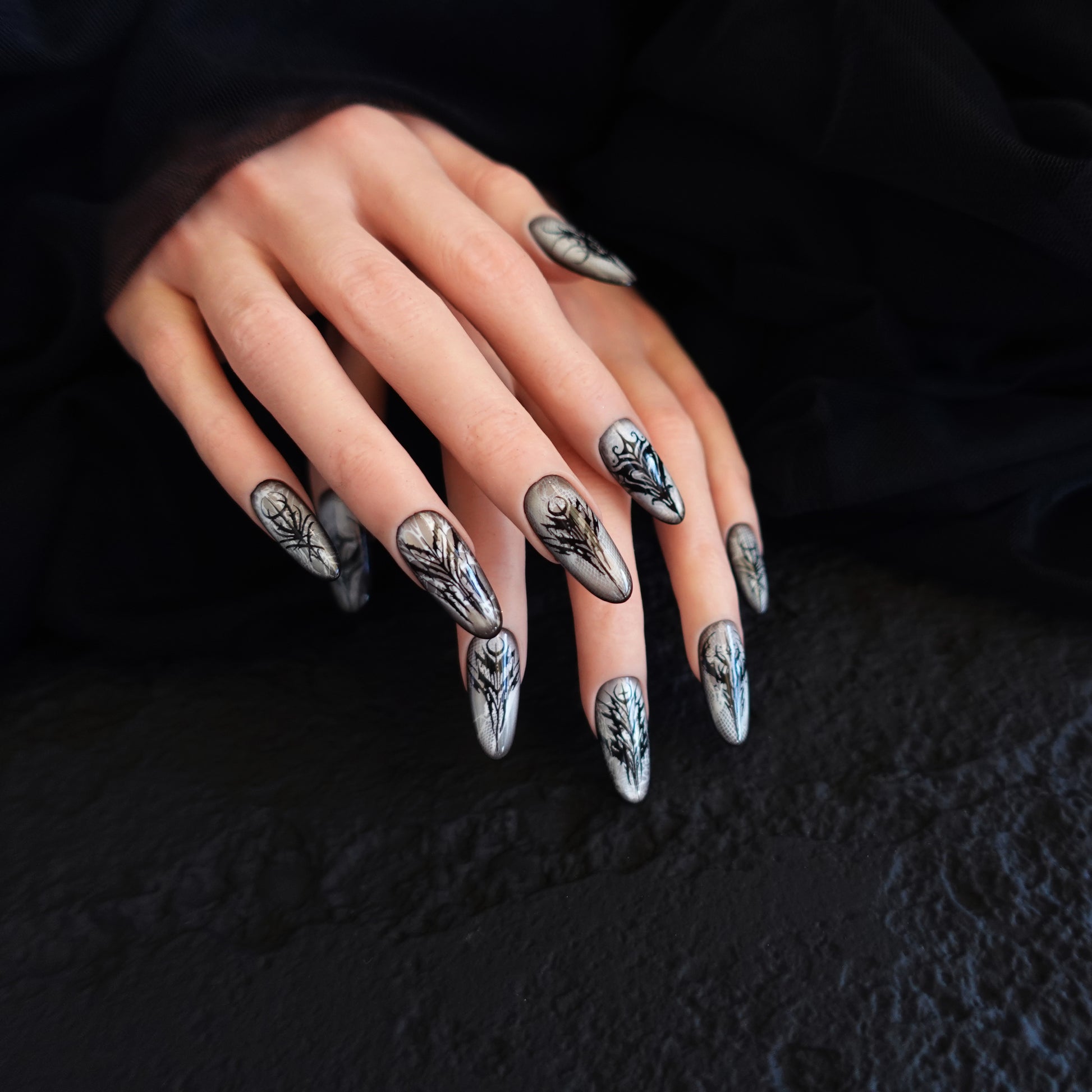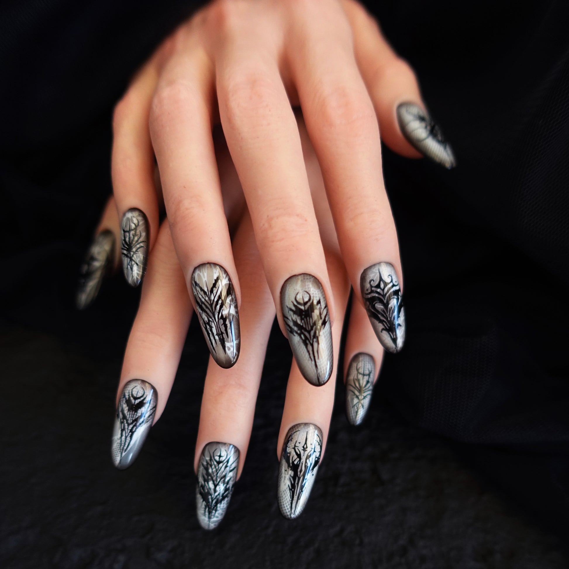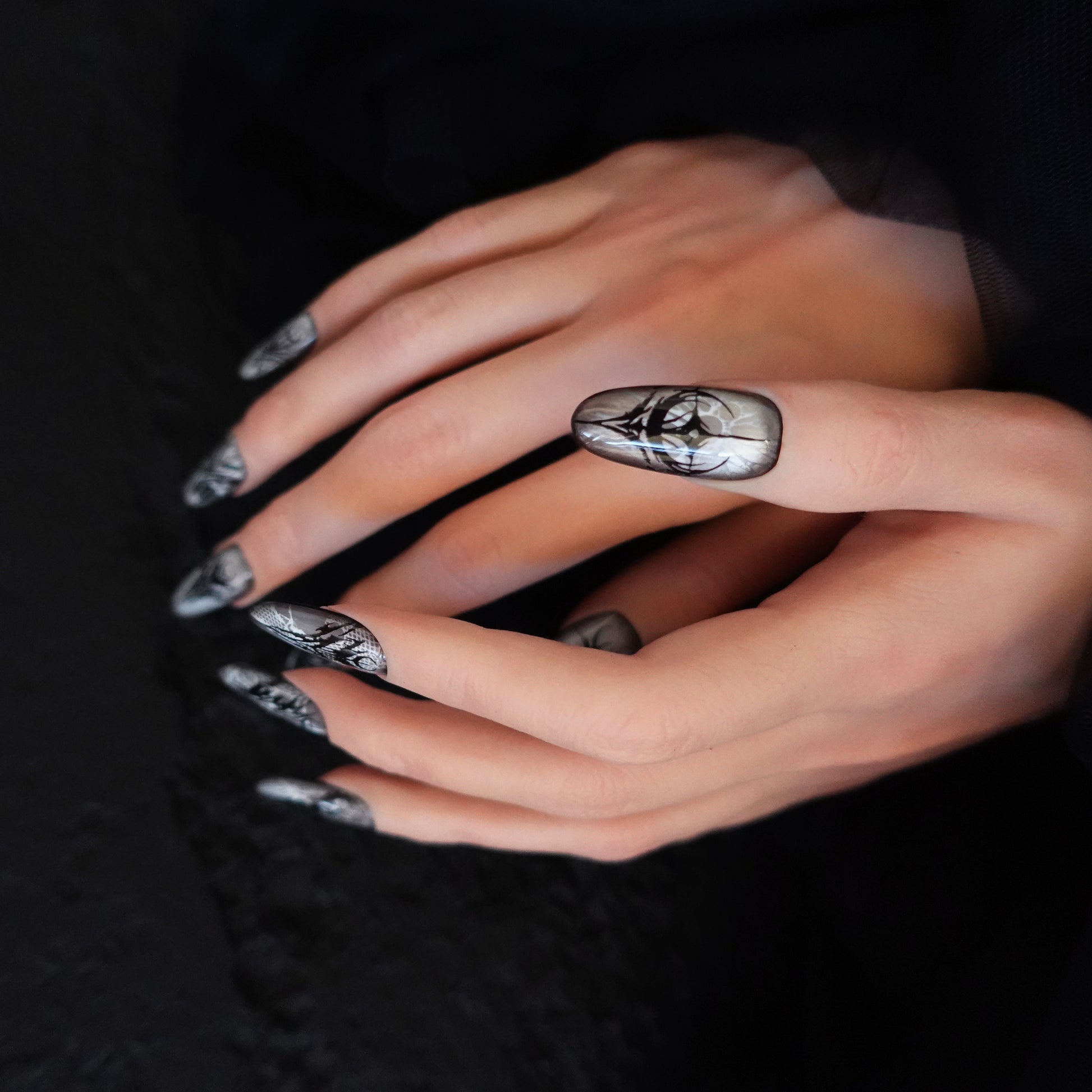 Seven Treasures — Where Every Nail Tells a Story. Step into the shadows and wear the marks of myth and metal. Shadowmark is a monochrome warrior set, etched in gothic tribal motifs over a silvery chrome mesh. Each nail bears a unique emblem — like runes forged in steel and sealed with shadow. It’s the perfect set for those who walk the line between elegance and chaos.✨ Features: • 100% Handcrafted & Made-to-Order • Hand-painted tribal & sigil-inspired detailing • Metallic chrome gradient base with mesh texture effect • Color Palette: Silver Steel, Charcoal, Gunmetal • Shape: Almond (customizable) • Lightweight, durable, and reusable with proper care • Sealed with a glossy protective gel topcoat