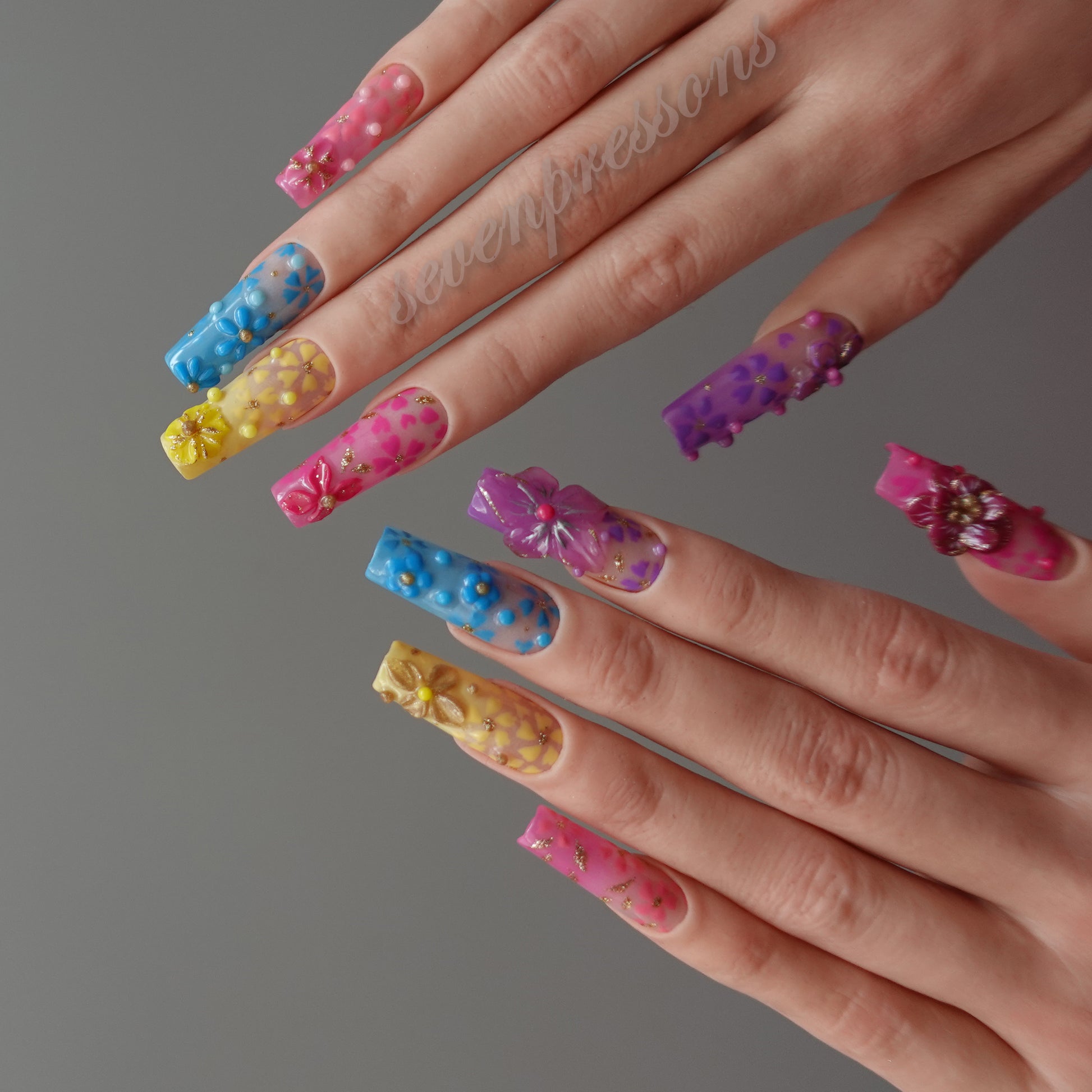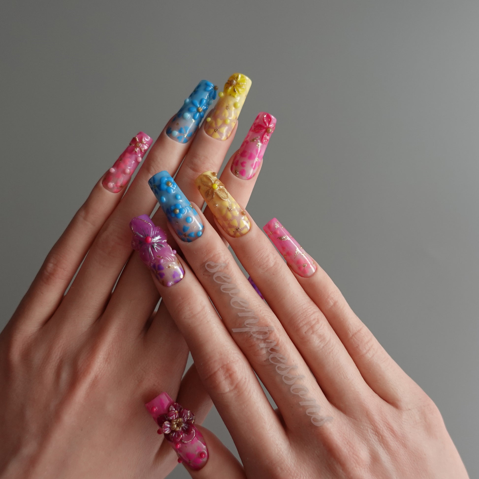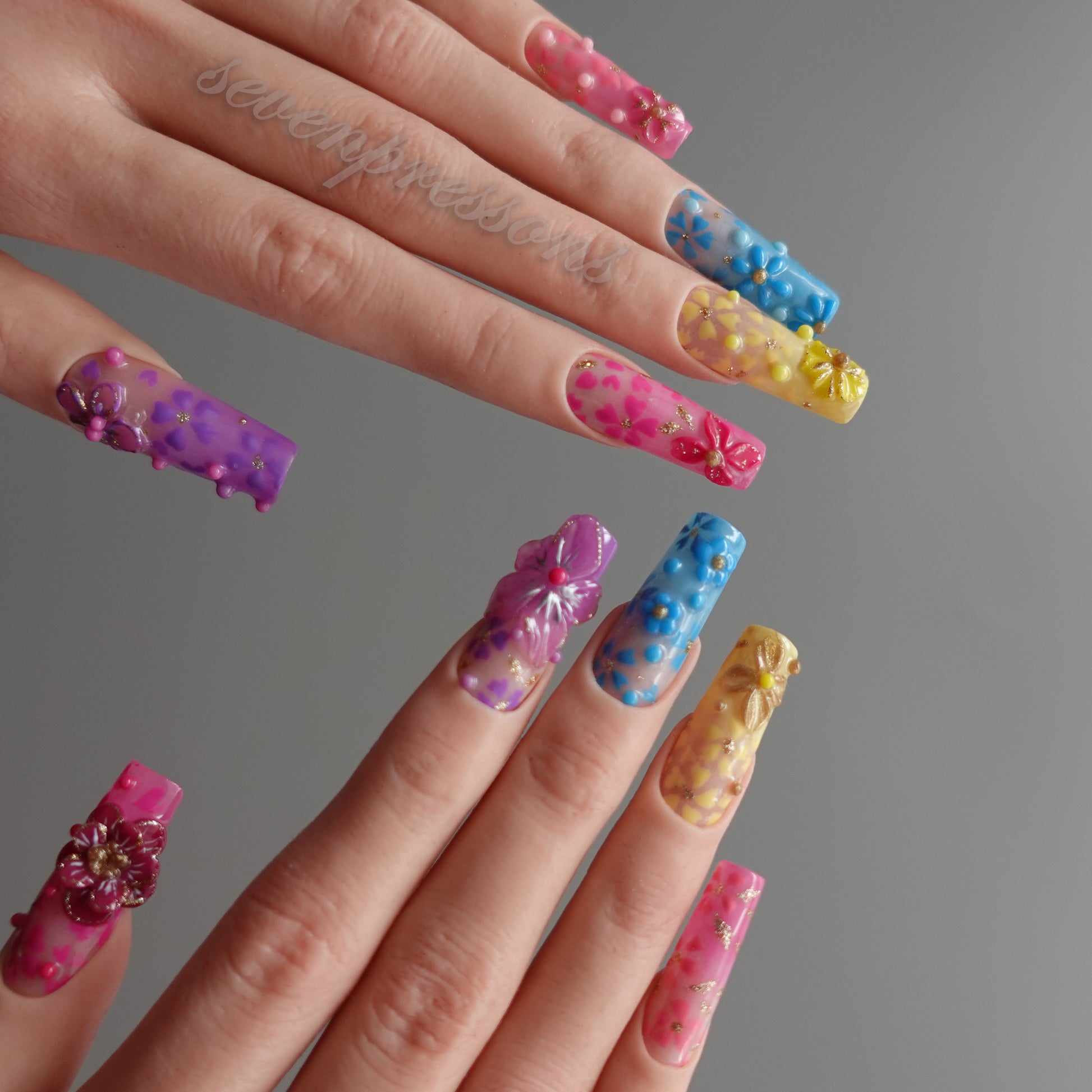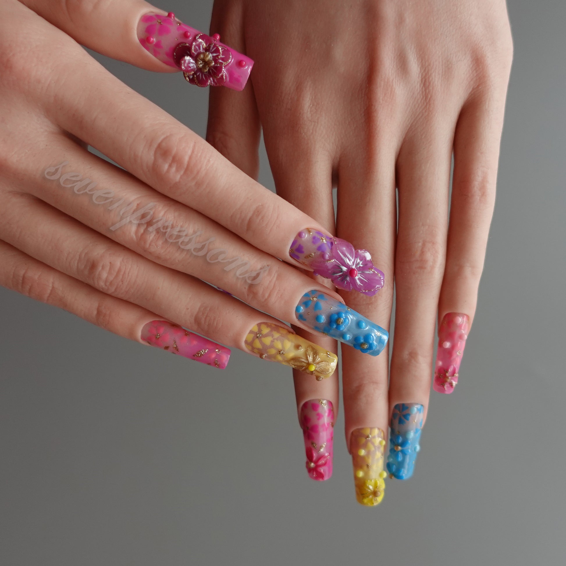 Candy Bloom Carnival is an explosion of color, sweetness, and dreamy floral fantasy — a joyful celebration of pastel gradients and sculpted 3D blossoms. Each nail feels like stepping into a whimsical festival, where soft pinks melt into purples, blues, and sunshine yellow, all tied together with shimmering gold accents.