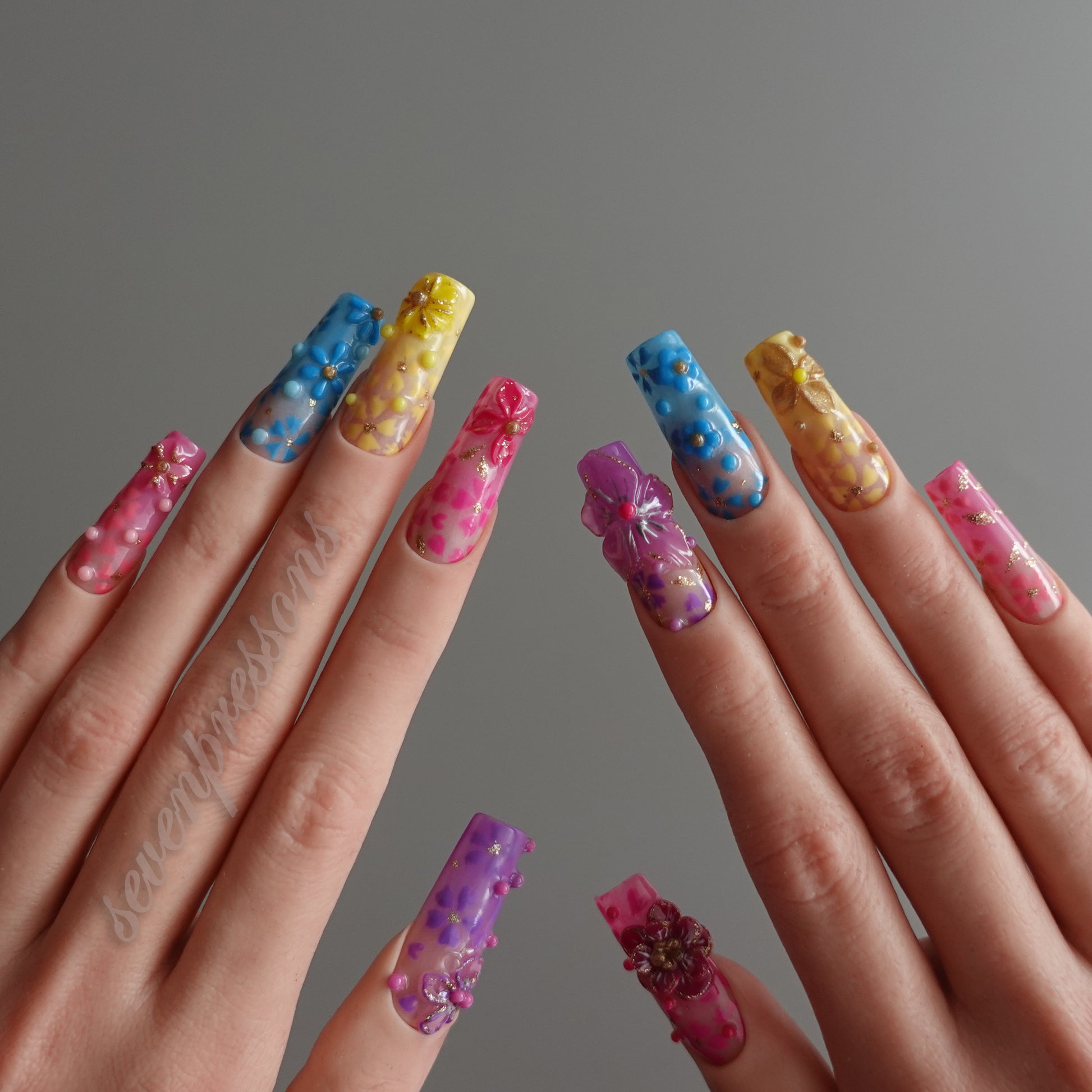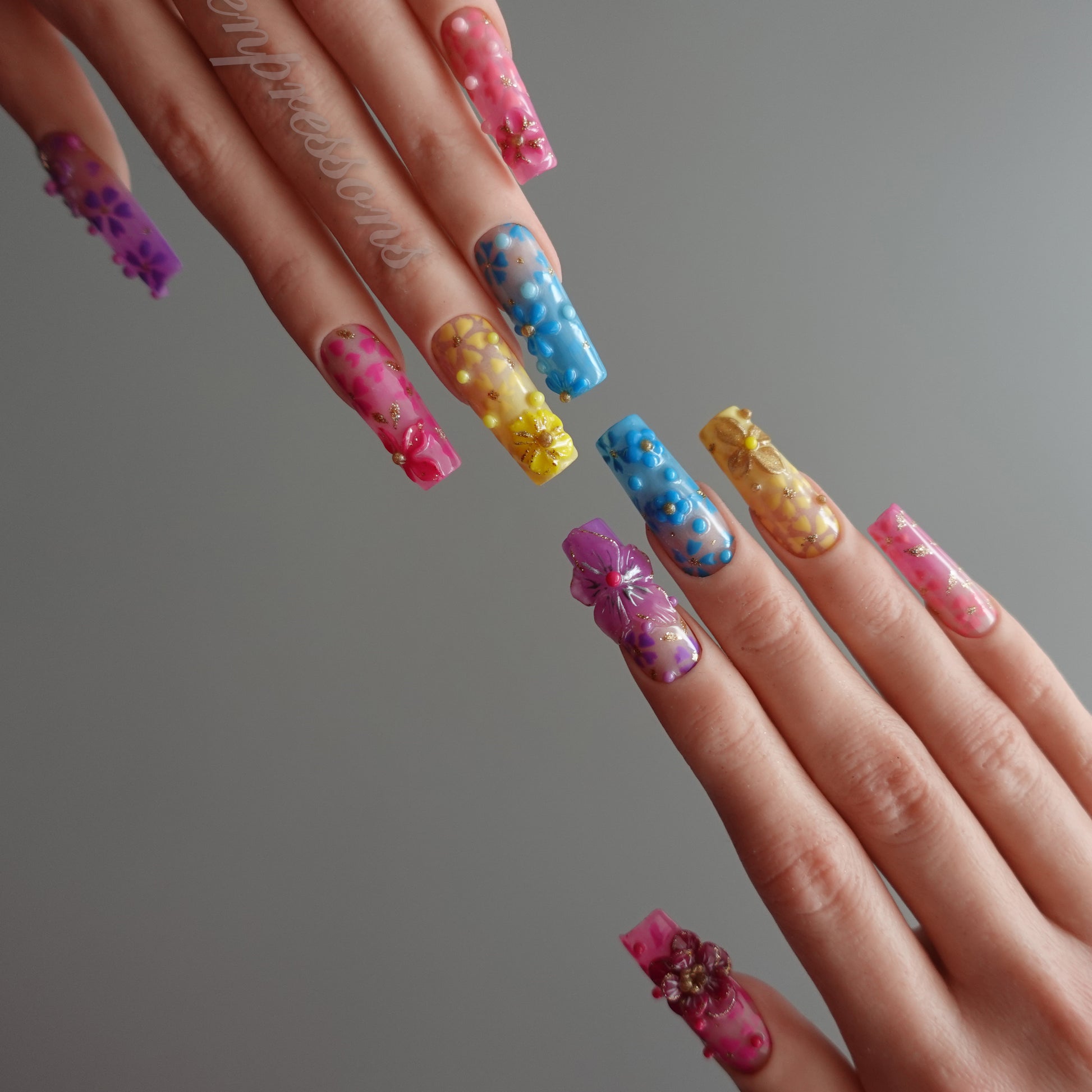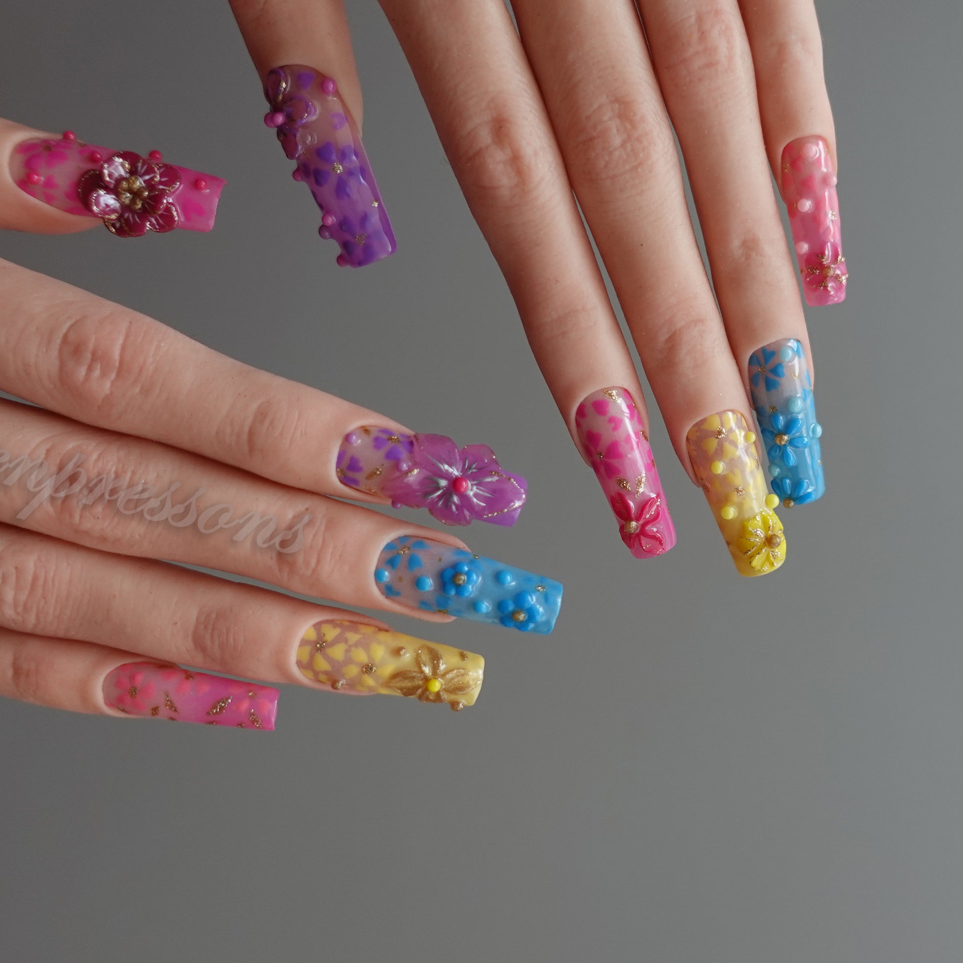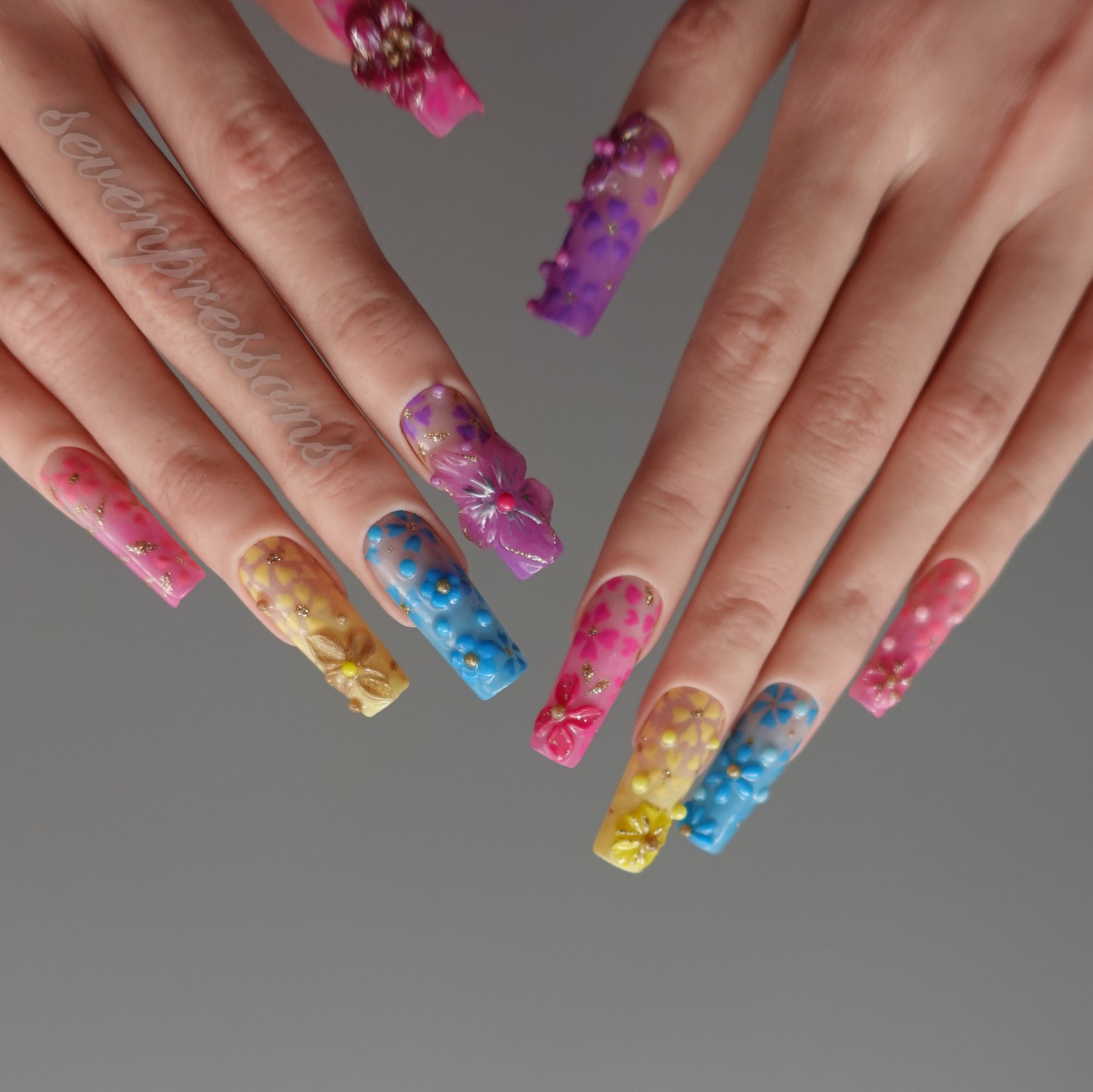 Candy Bloom Carnival is an explosion of color, sweetness, and dreamy floral fantasy — a joyful celebration of pastel gradients and sculpted 3D blossoms. Each nail feels like stepping into a whimsical festival, where soft pinks melt into purples, blues, and sunshine yellow, all tied together with shimmering gold accents.