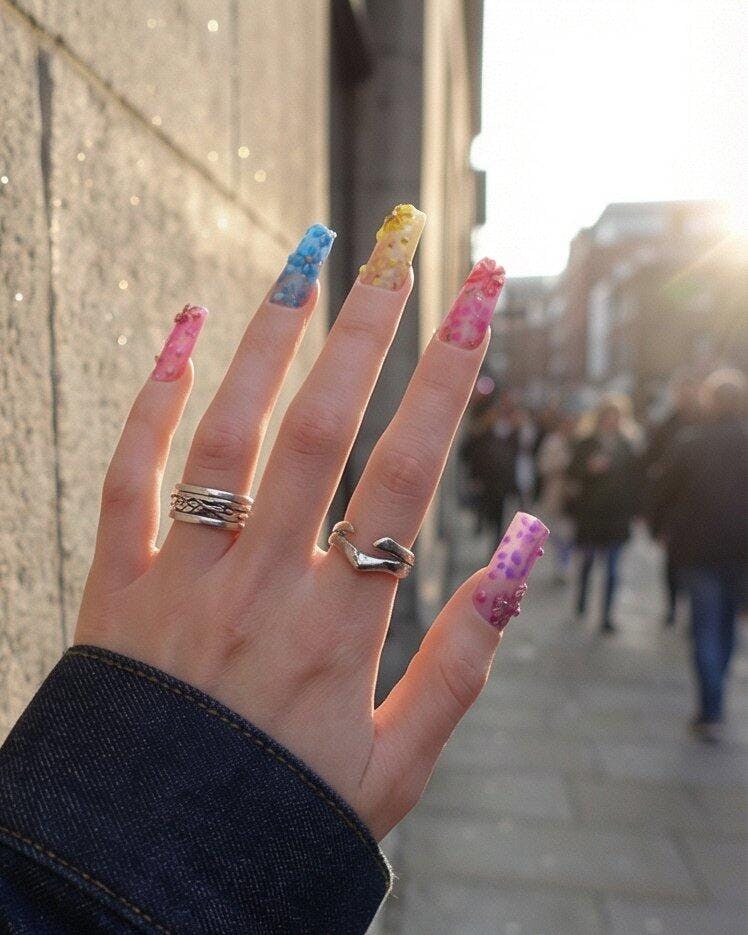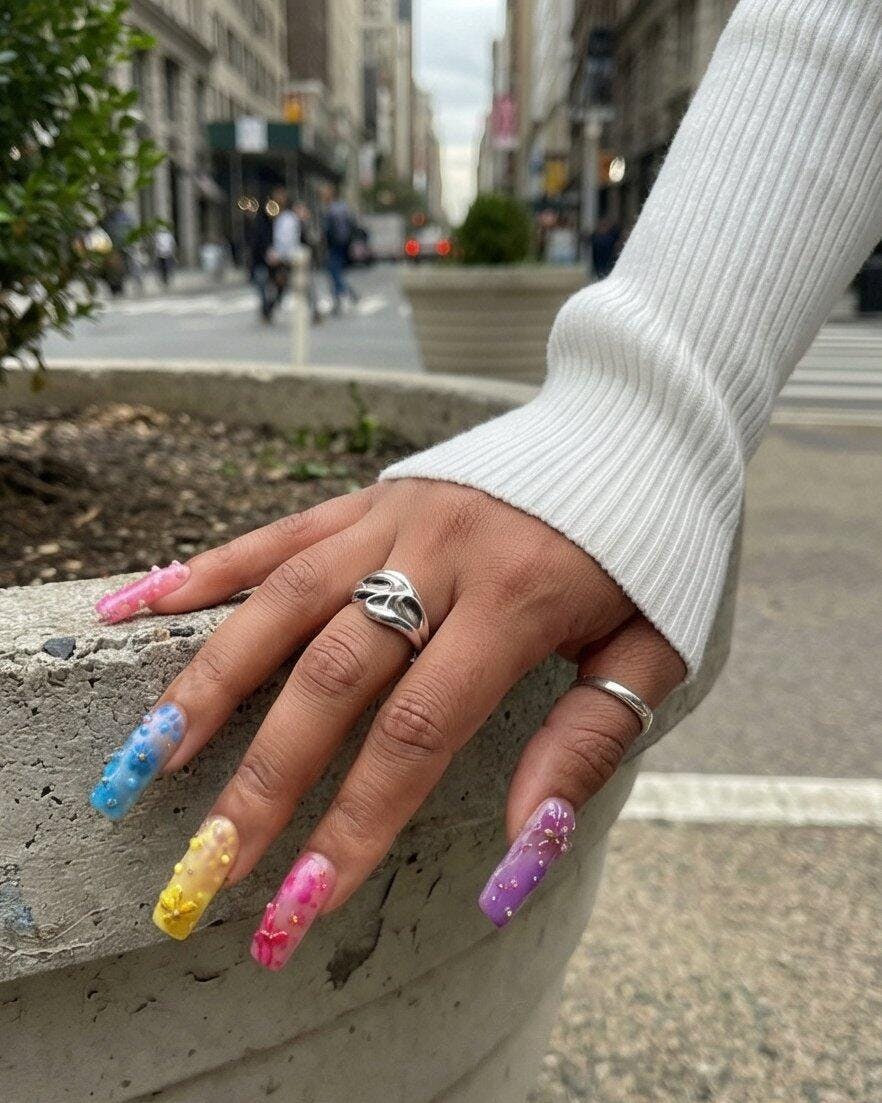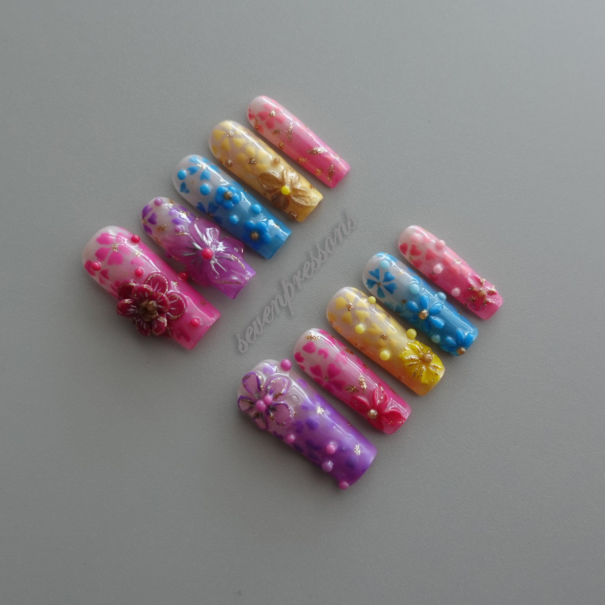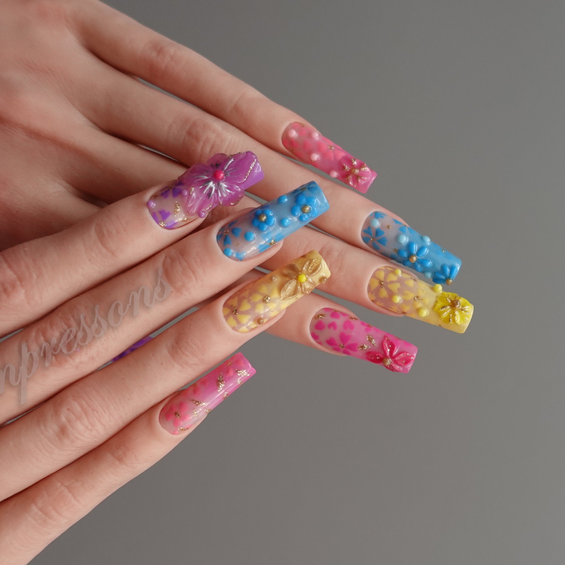 Candy Bloom Carnival is an explosion of color, sweetness, and dreamy floral fantasy — a joyful celebration of pastel gradients and sculpted 3D blossoms. Each nail feels like stepping into a whimsical festival, where soft pinks melt into purples, blues, and sunshine yellow, all tied together with shimmering gold accents.