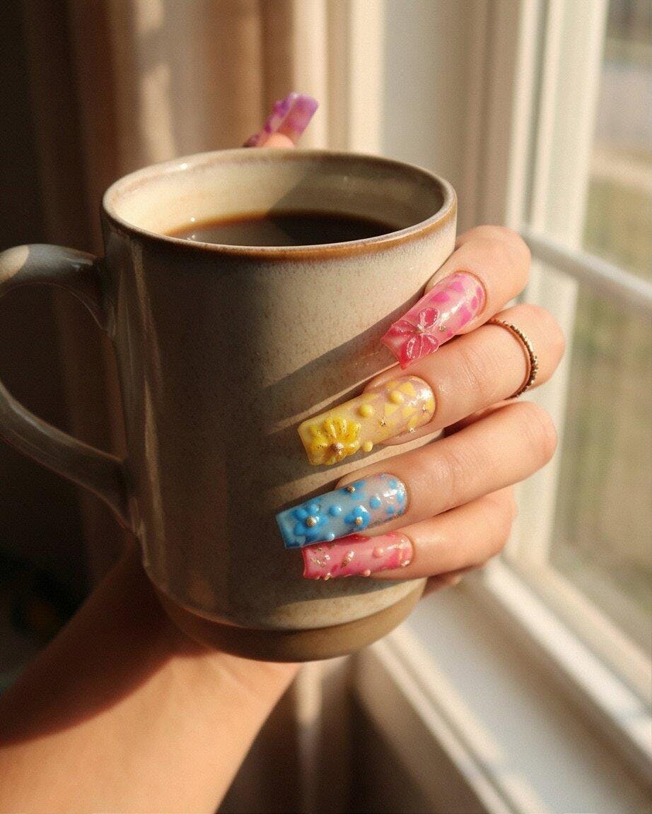The design blends a playful candy-color palette with dimensional florals, pearl details, and delicate gold glitters, creating a look that is feminine, lively, and irresistibly charming. Perfect for those who love color, texture, and a touch of magical whimsy.