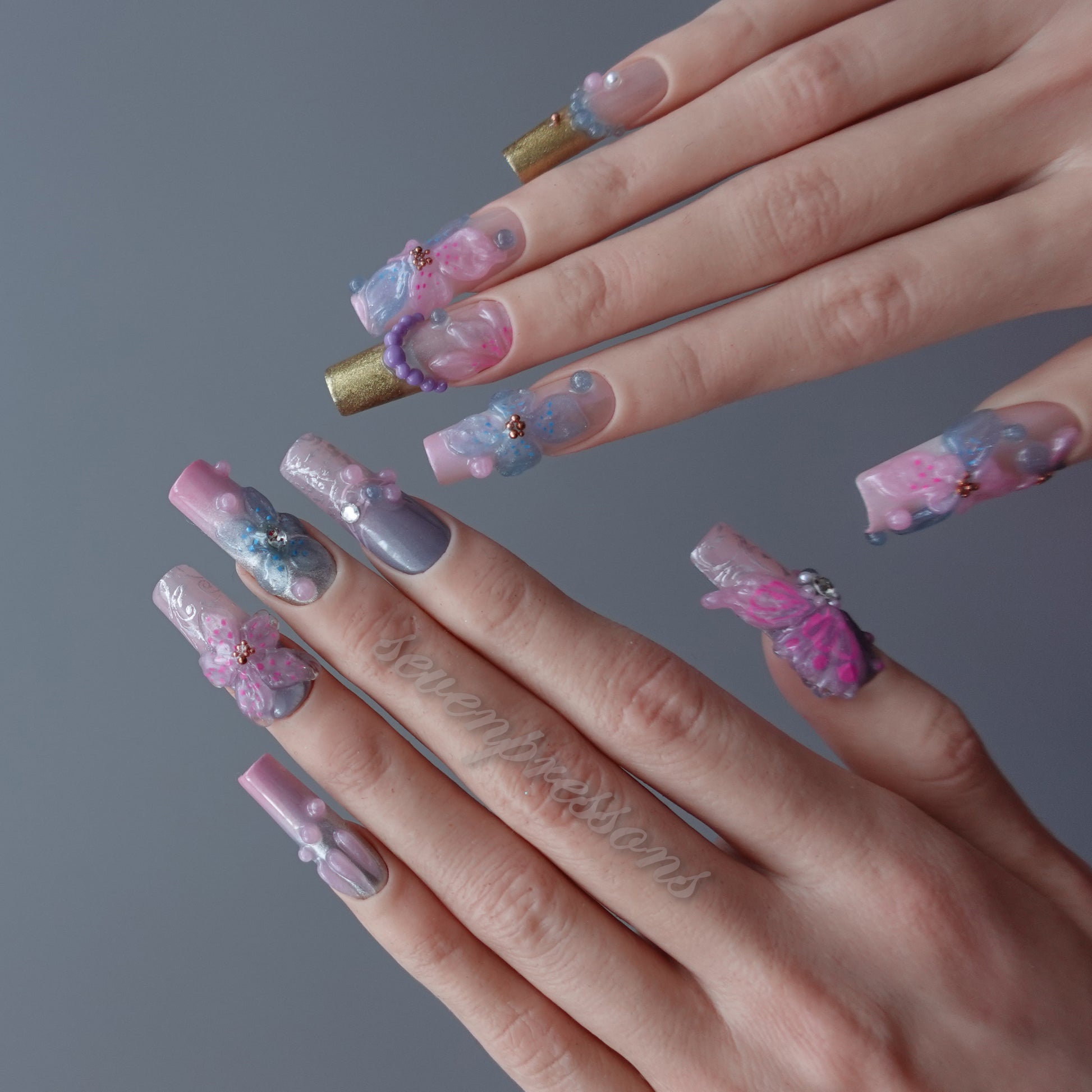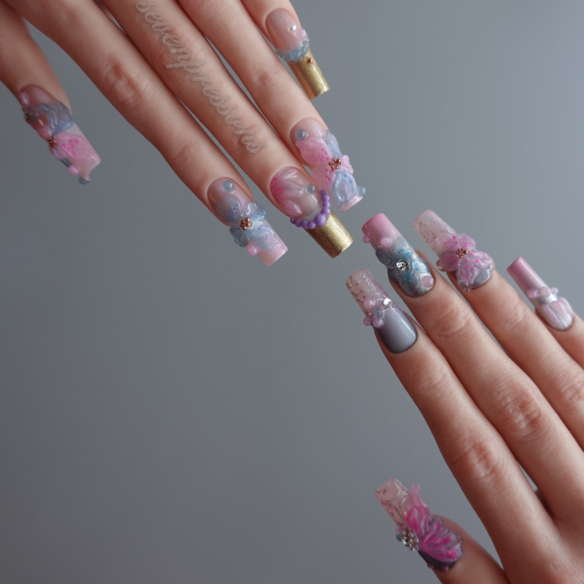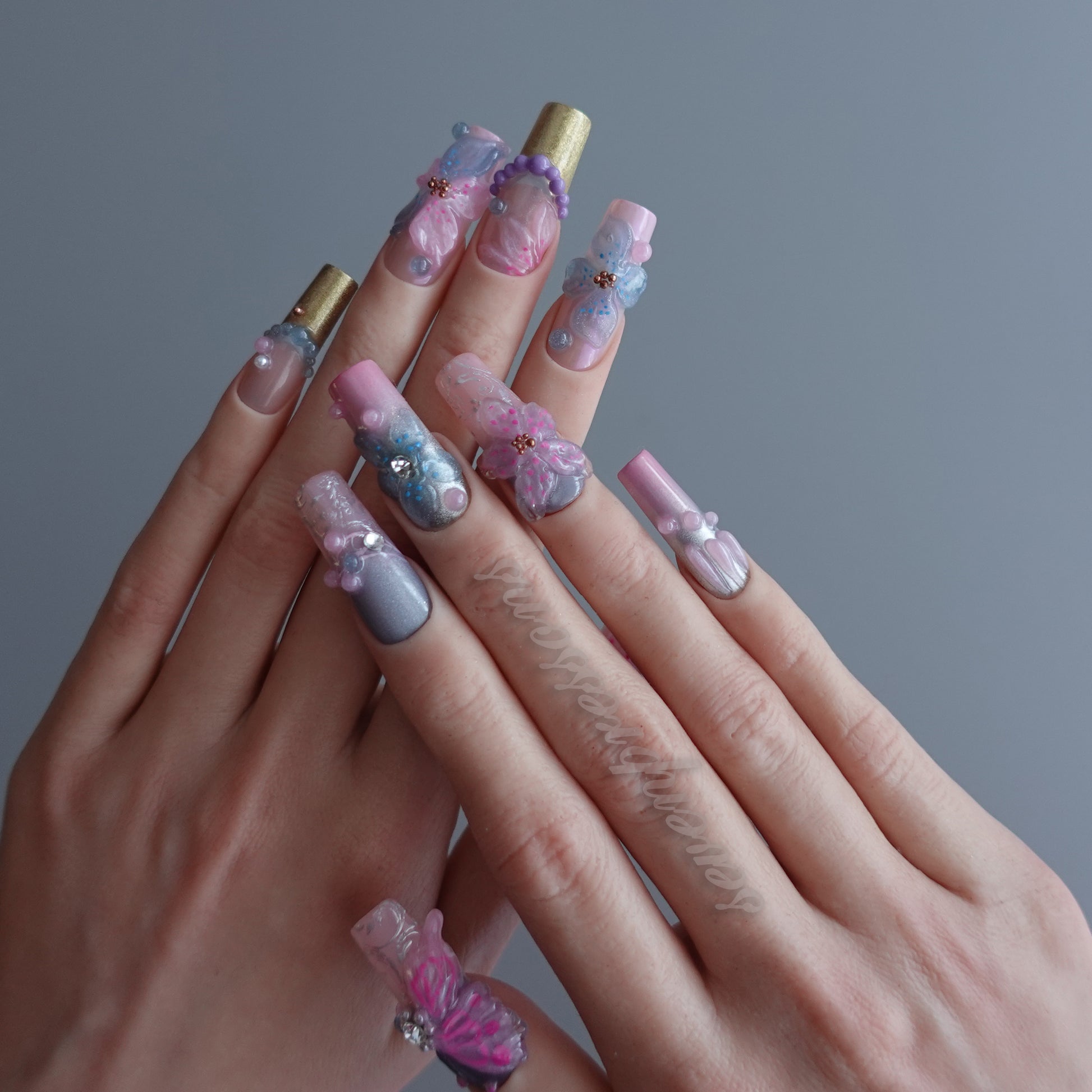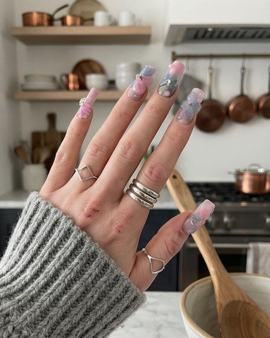 Pastel pink, lilac, cloud-blue, and misty silver flow together in a luminous, airy palette — anchored by hand-molded 3D petals, gemstone-style accents, and shimmering iridescent textures.
