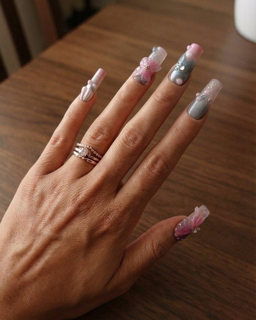 Each nail is arranged like a miniature fairytale tableau: floating wings, blooming florals, pearlescent beads, and light-catching crystals forming a look that feels gentle, magical, and unmistakably feminine.