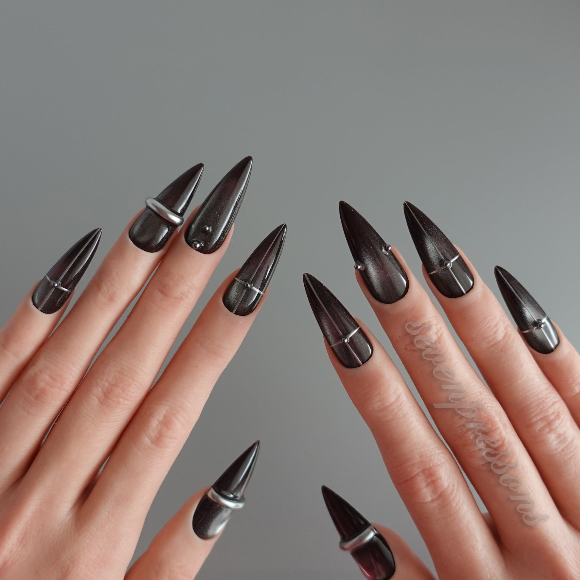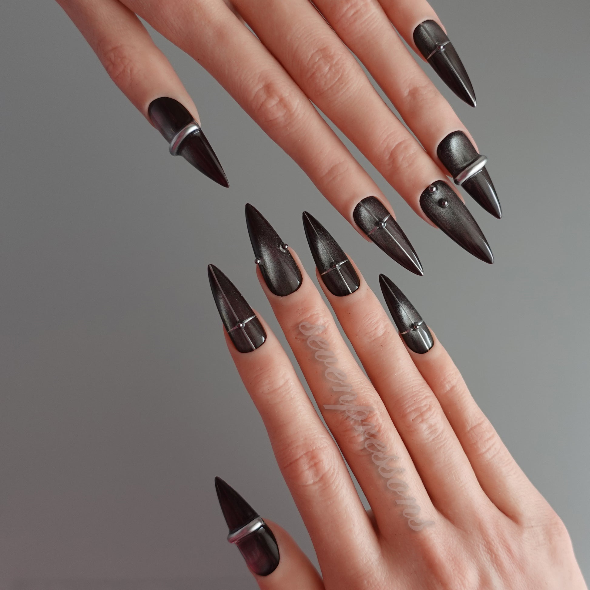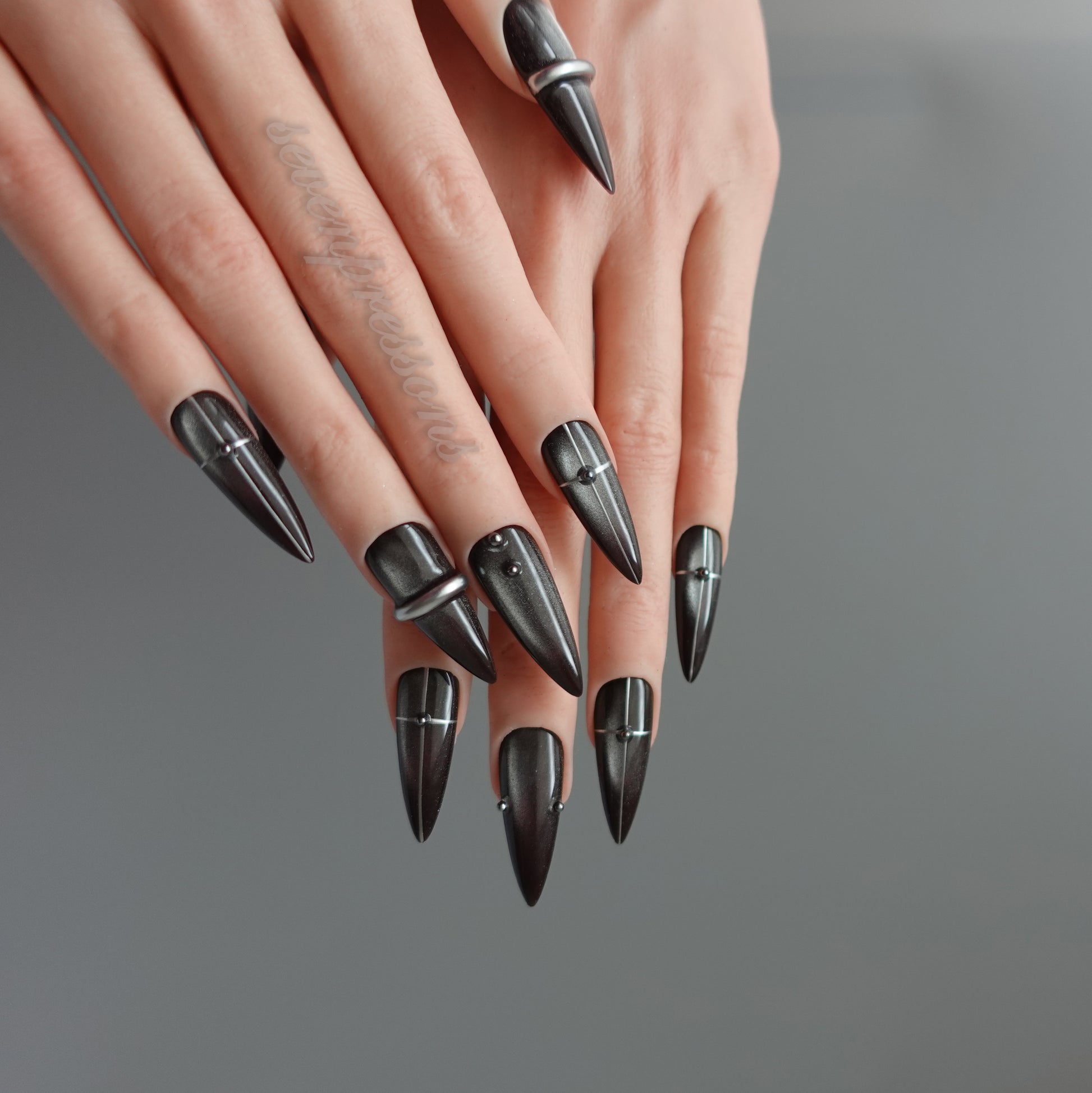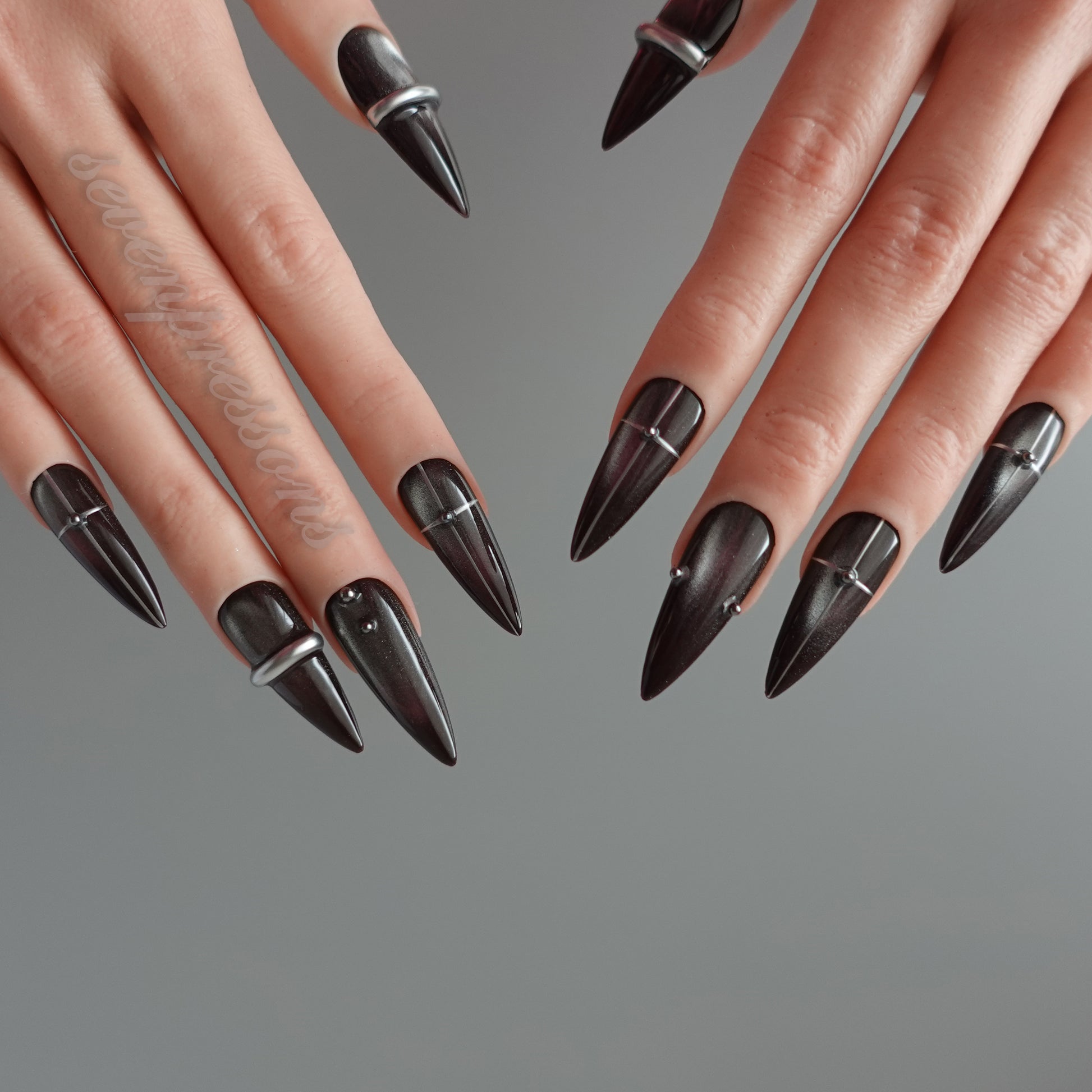 Each nail is structured with chrome-like alloy bands and micro-studs, reflecting a futuristic armor aesthetic.