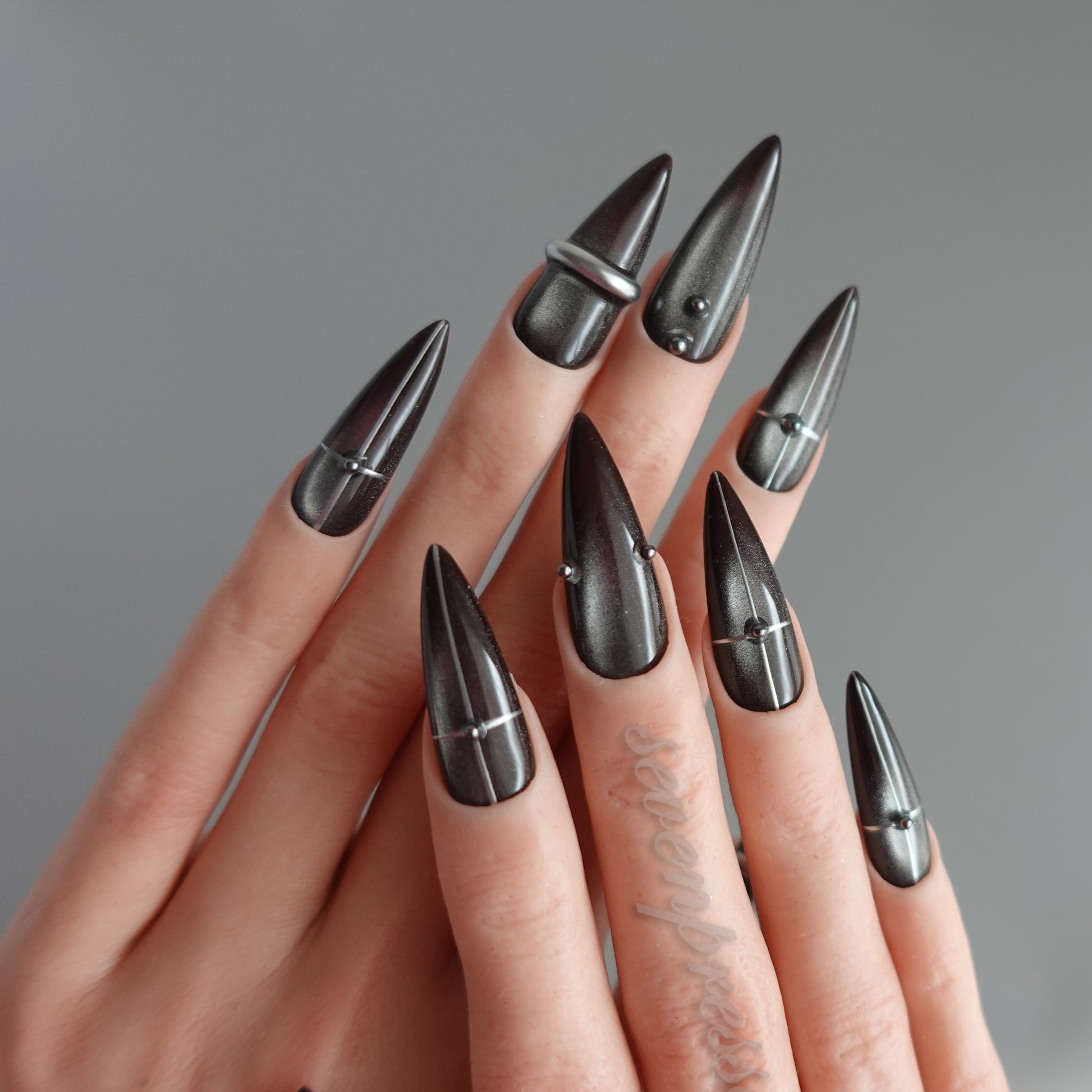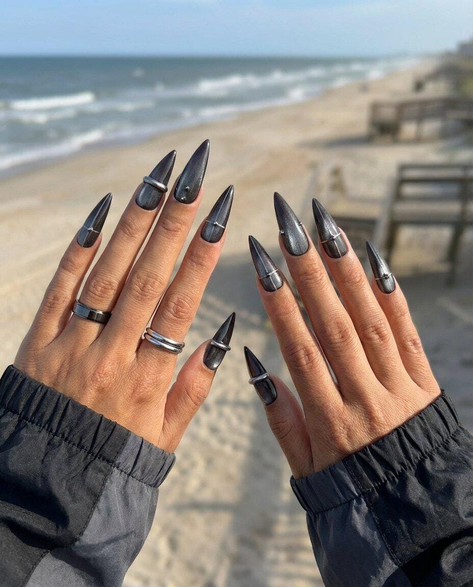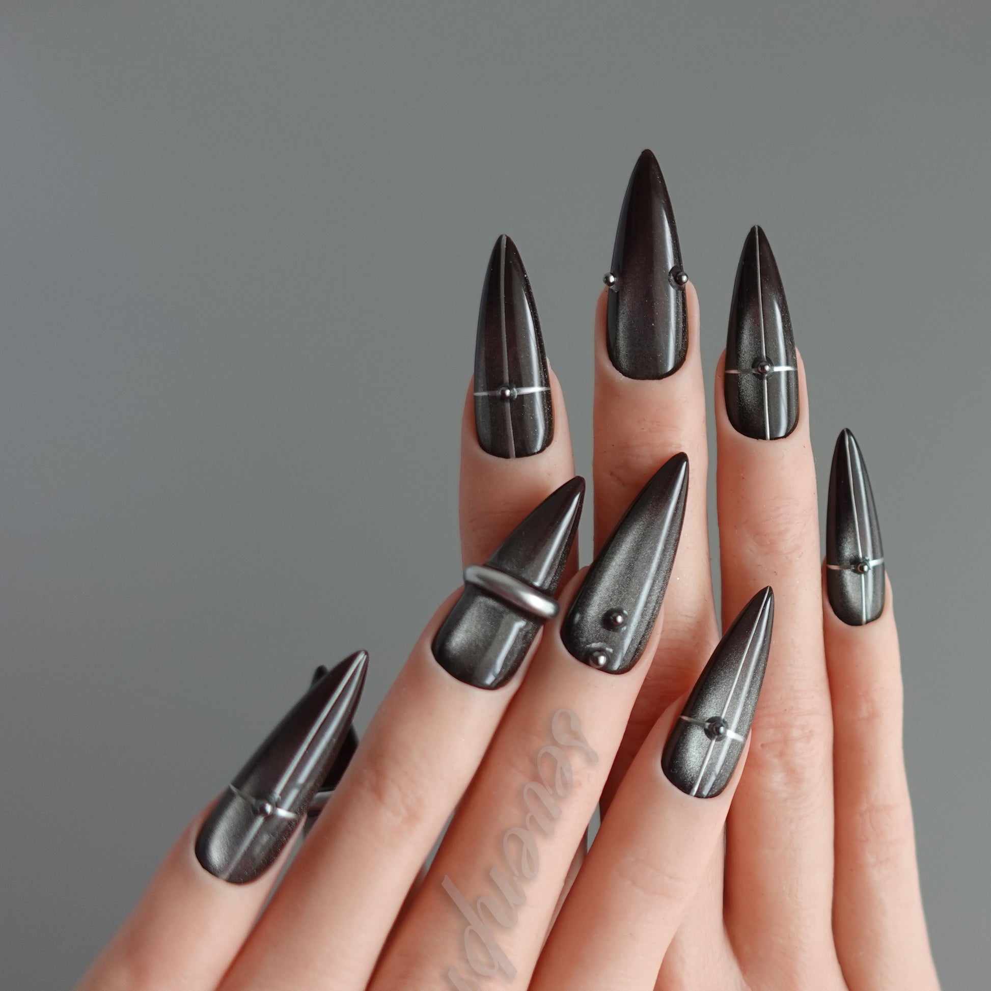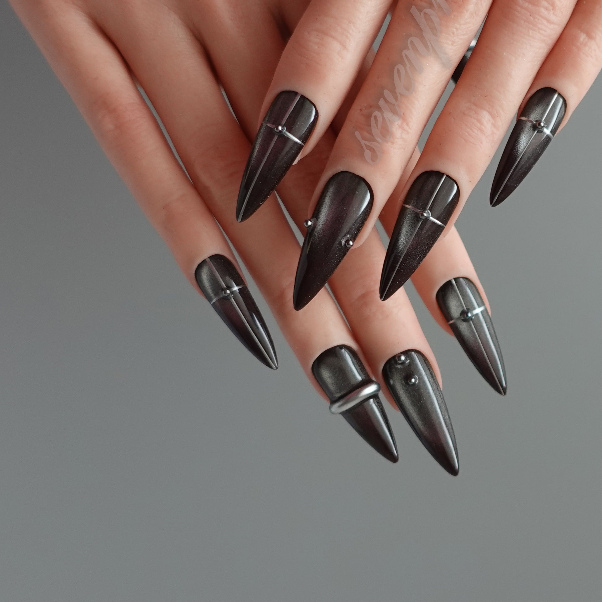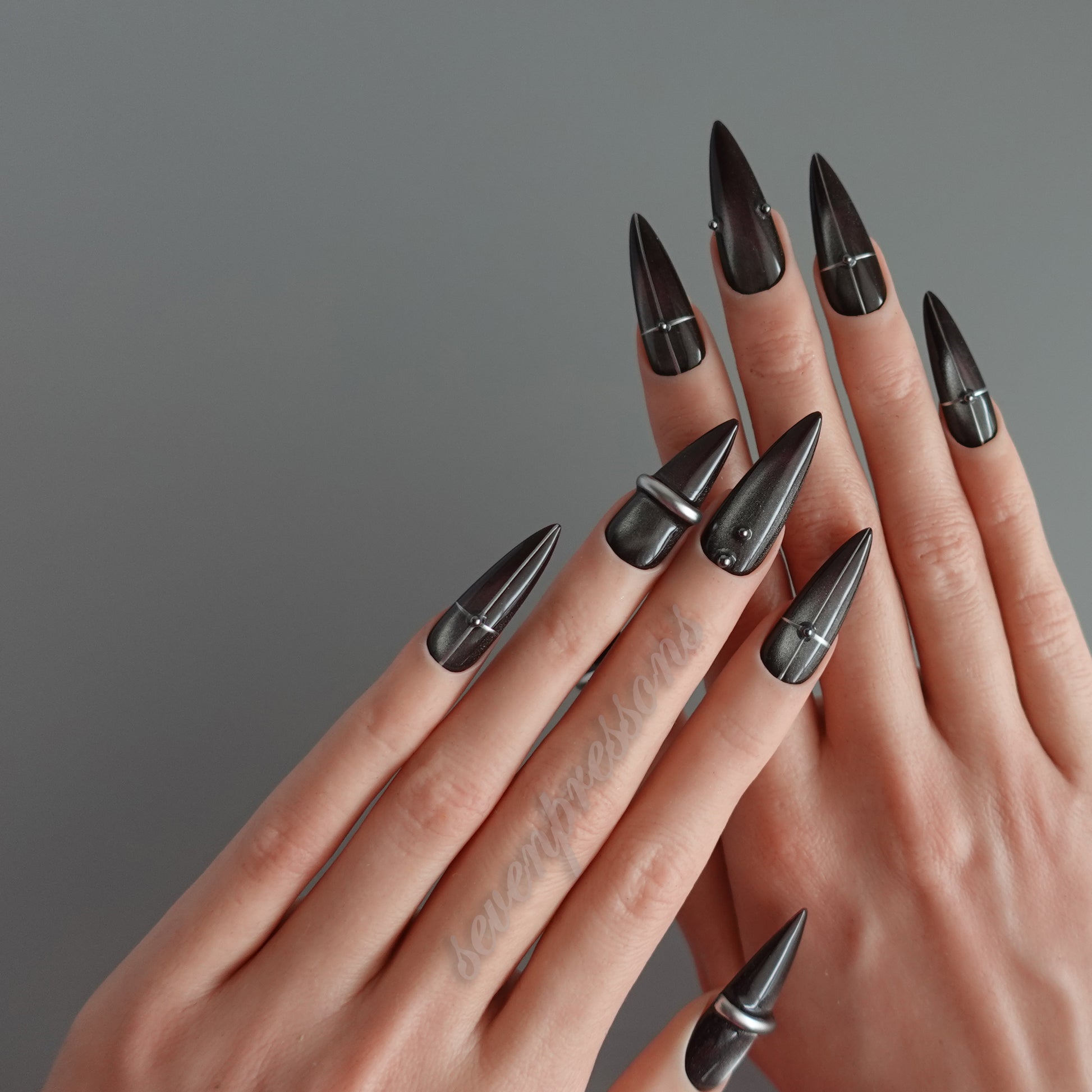 Each nail is structured with chrome-like alloy bands and micro-studs, reflecting a futuristic armor aesthetic.