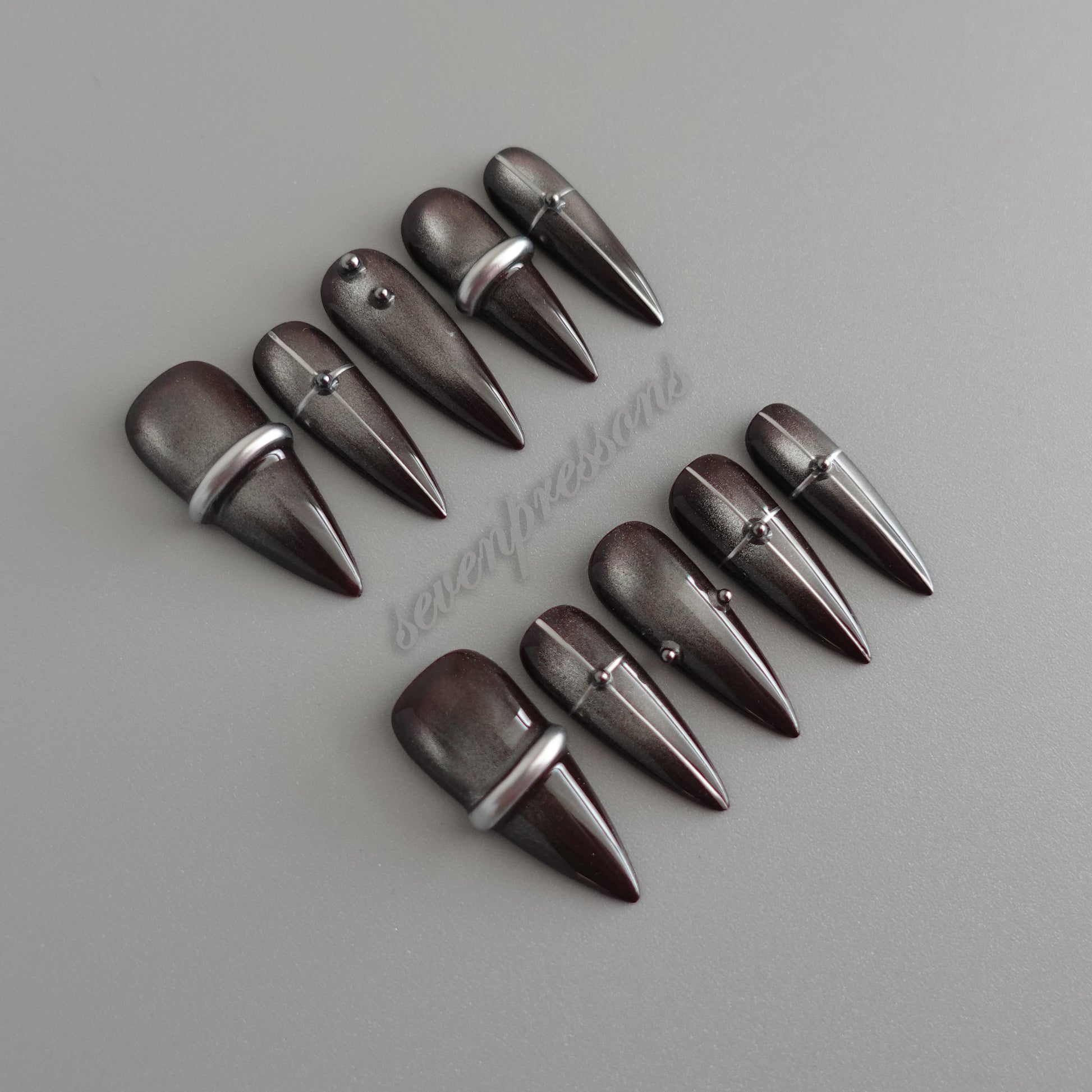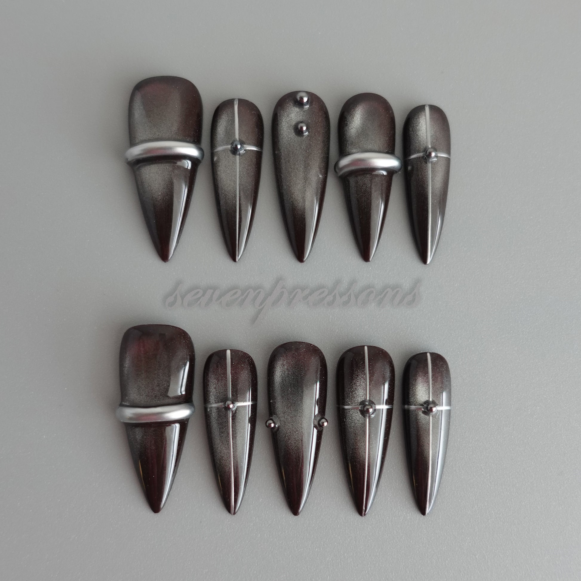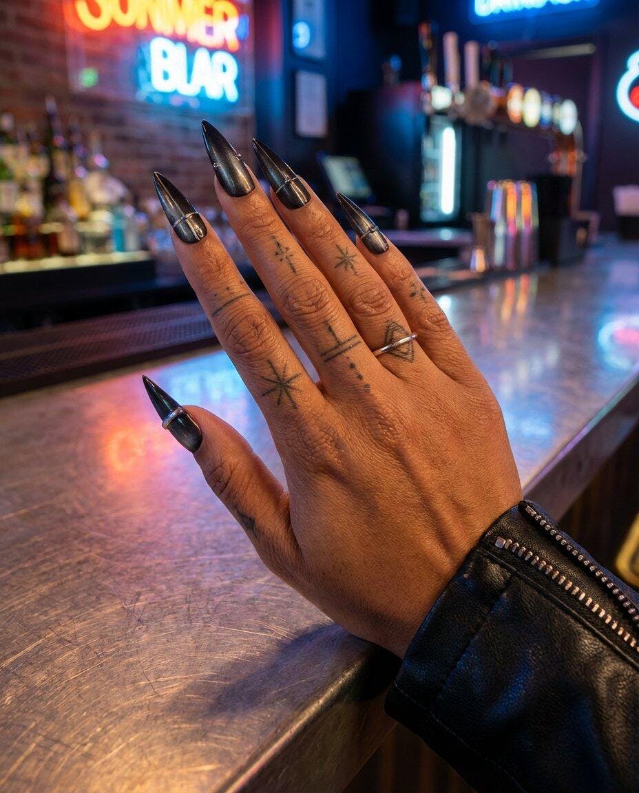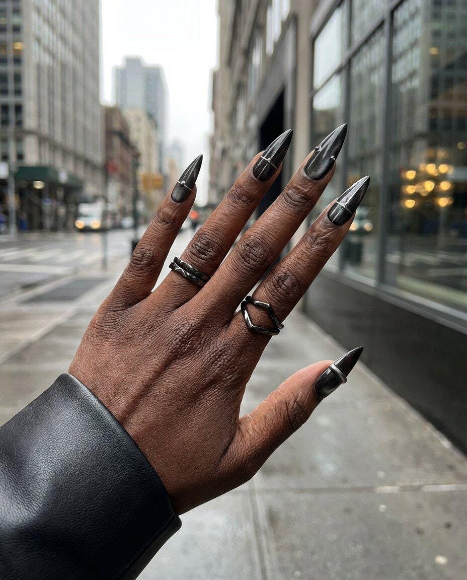 Each nail is structured with chrome-like alloy bands and micro-studs, reflecting a futuristic armor aesthetic.