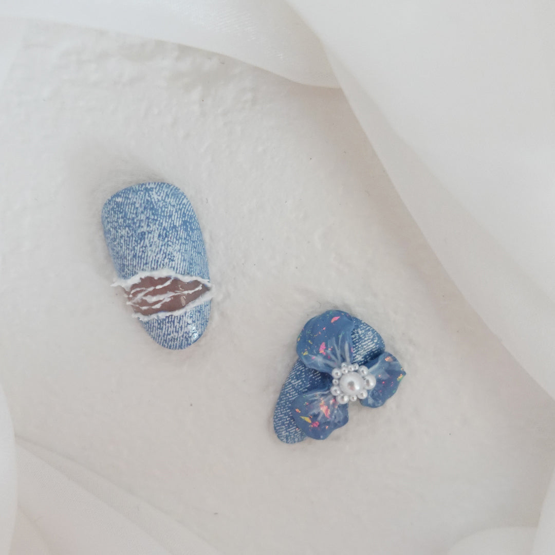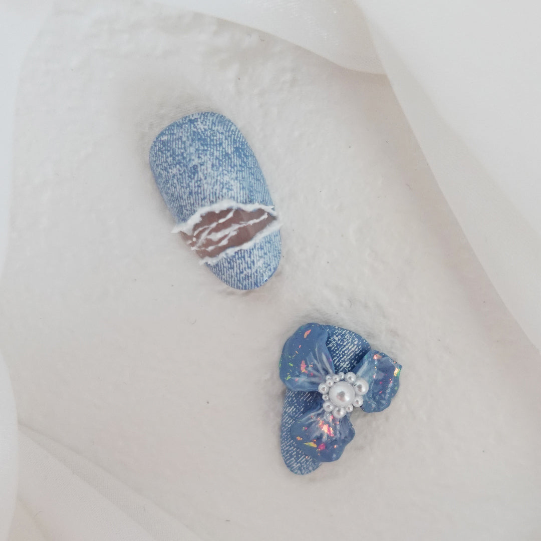 Introducing Denim Bloom, a whimsical blend of soft romance and urban edge — exclusively from Seven Treasures. This handcrafted press-on nail set features a denim-textured base with 3D floral accents, iridescent flakes, and pearl embellishments. The ripped-jean design is both playful and expressive, transforming each nail into a miniature fashion statement. With its intricate detailing and bold-yet-feminine vibe, Denim Bloom is perfect for those who love a mix of attitude and elegance.