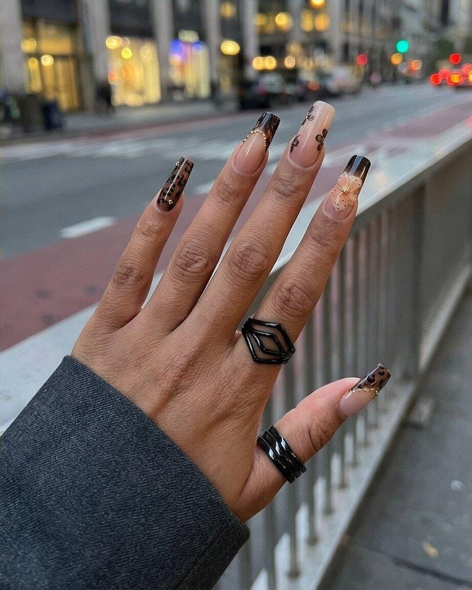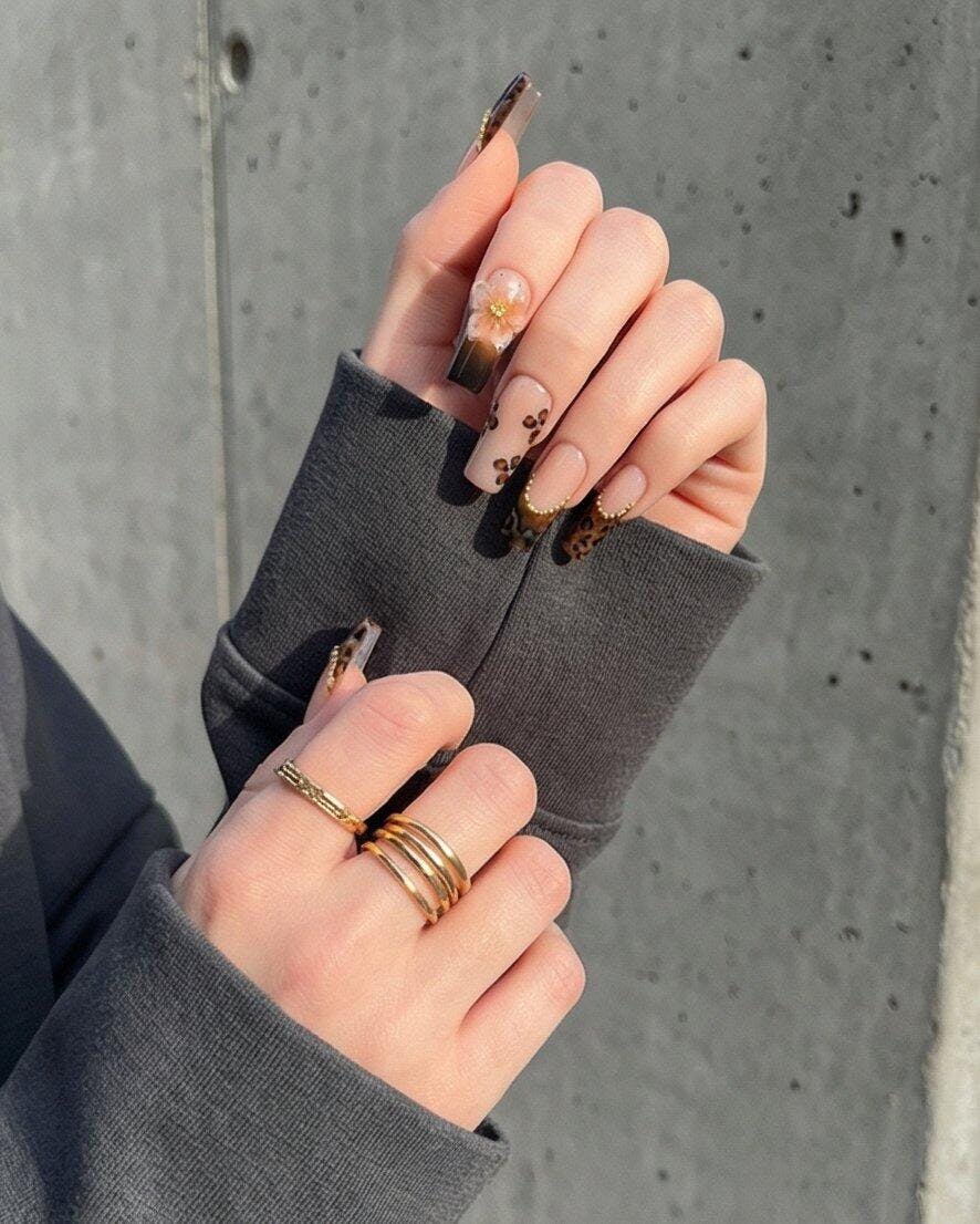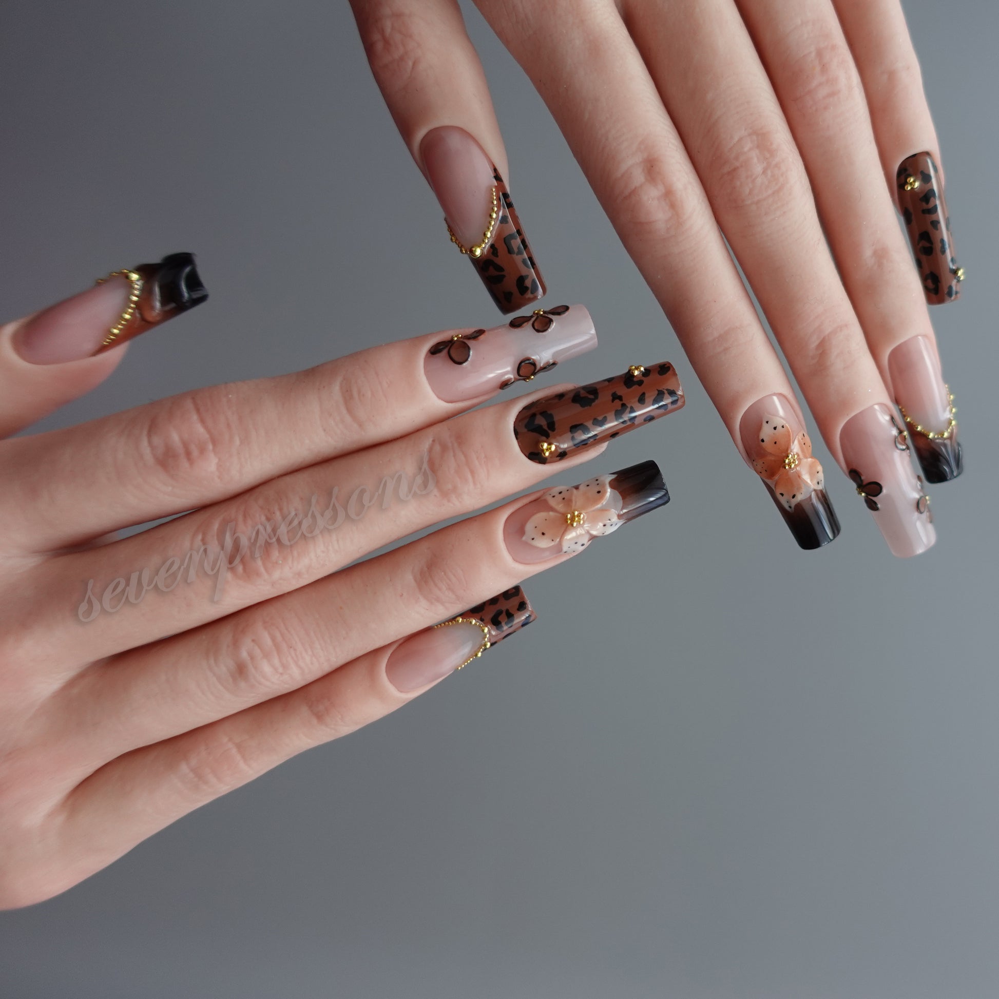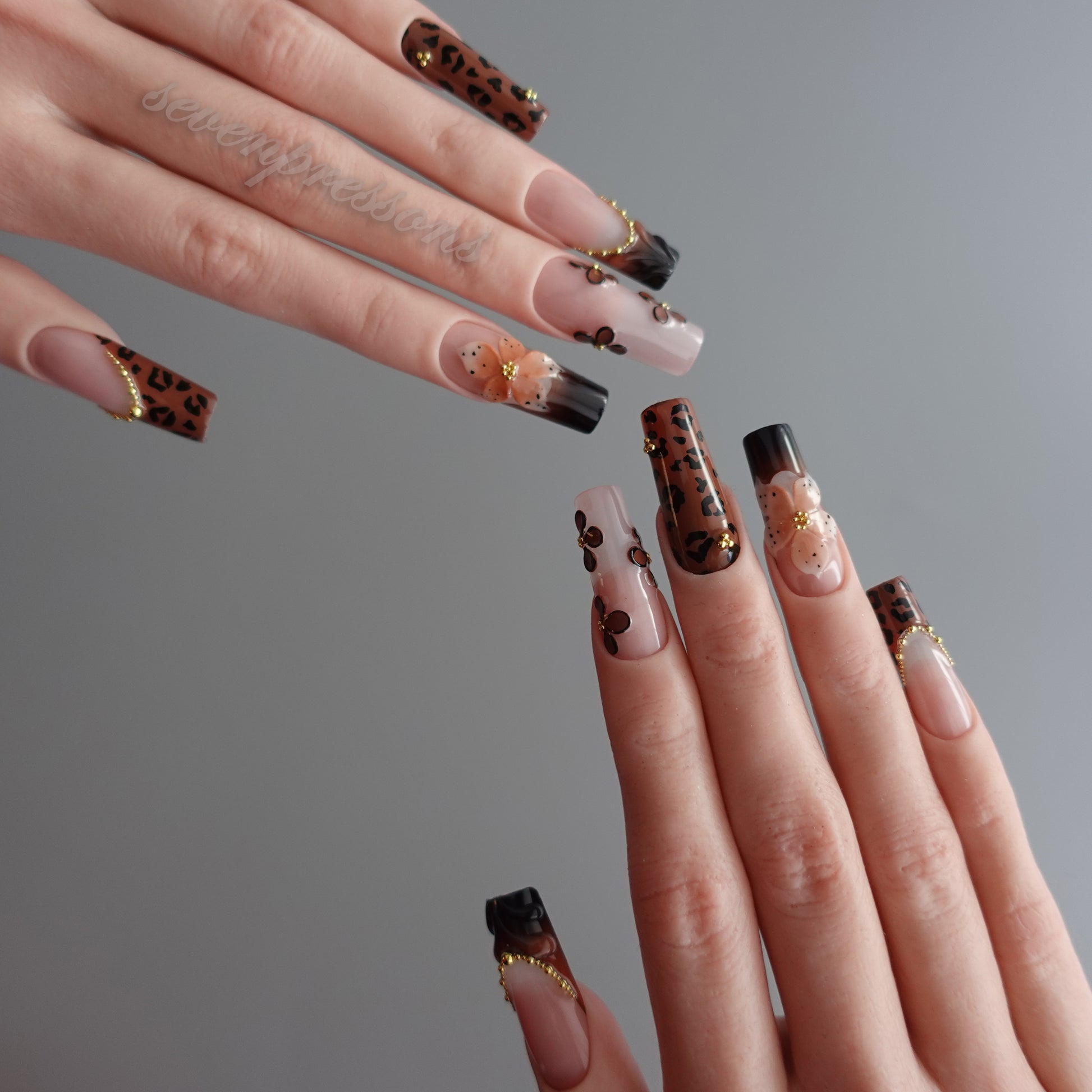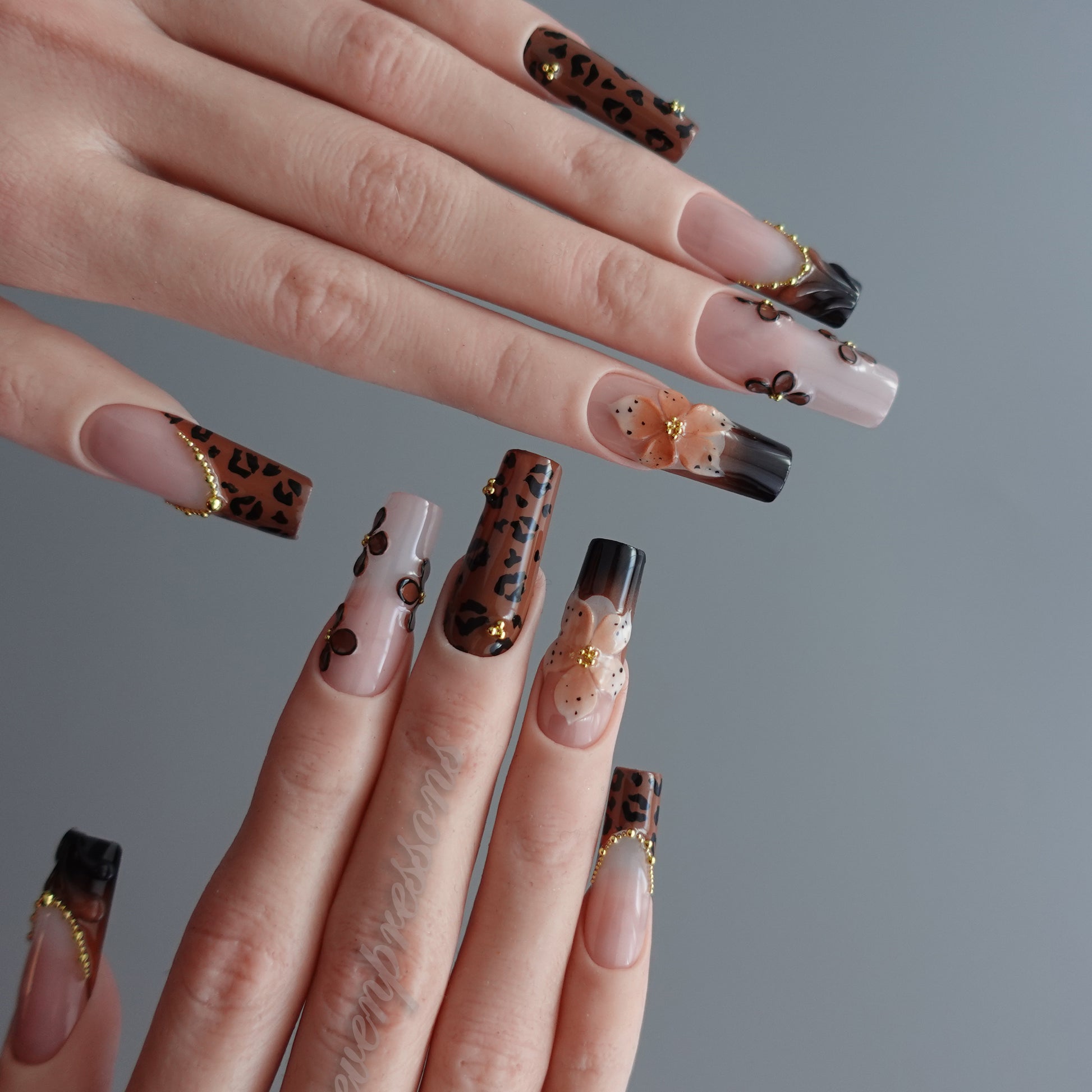 The design layers toasted beige, deep espresso gradients, and hand-painted spots with gold-bead detailing, creating a look that feels both untamed and refined. Each 3D flower is sculpted petal by petal, adding a soft contrast to the fierce animal-print edges.