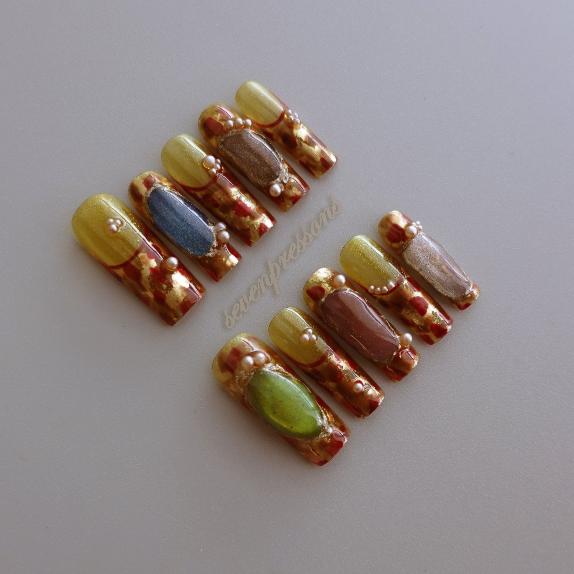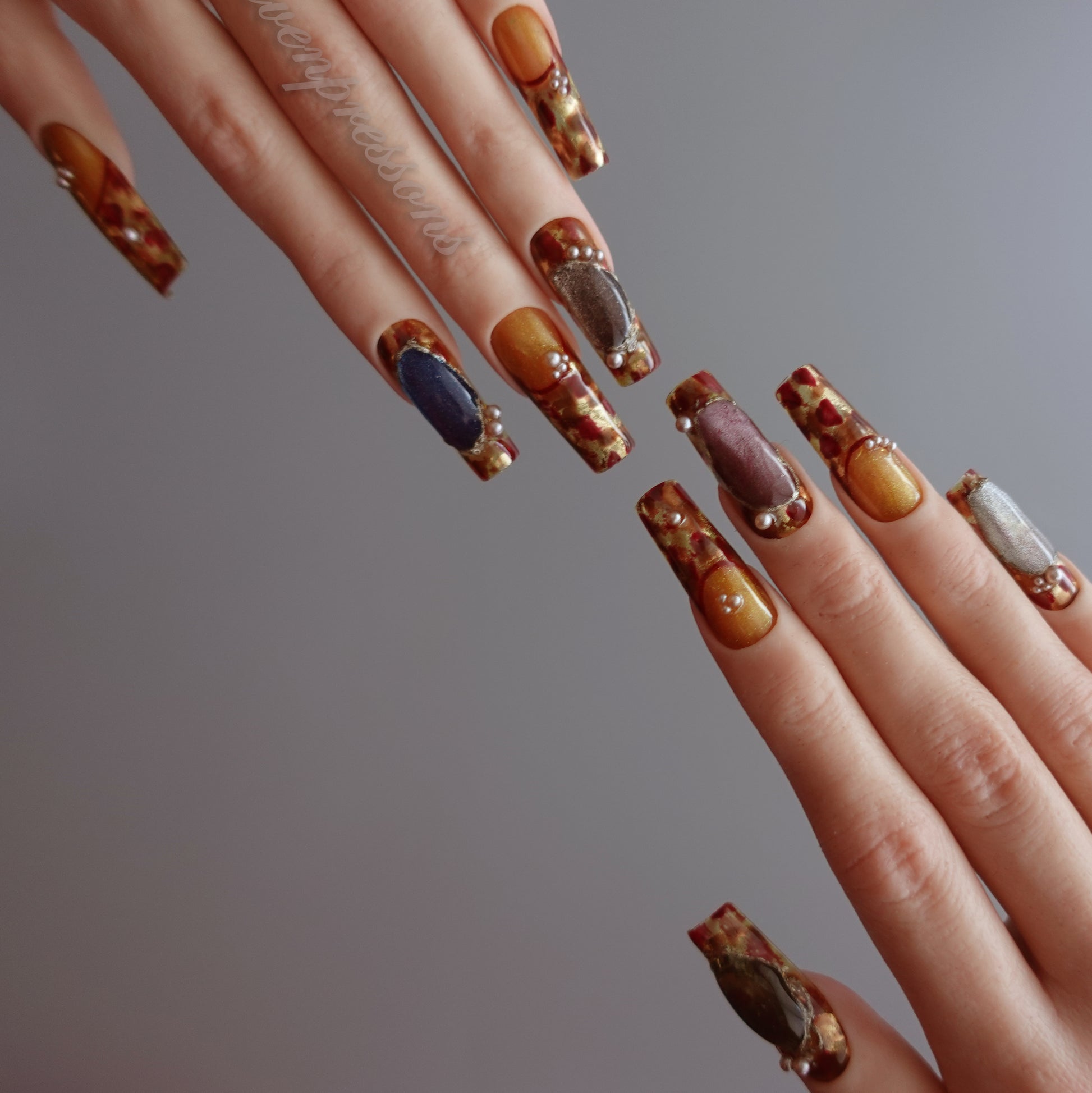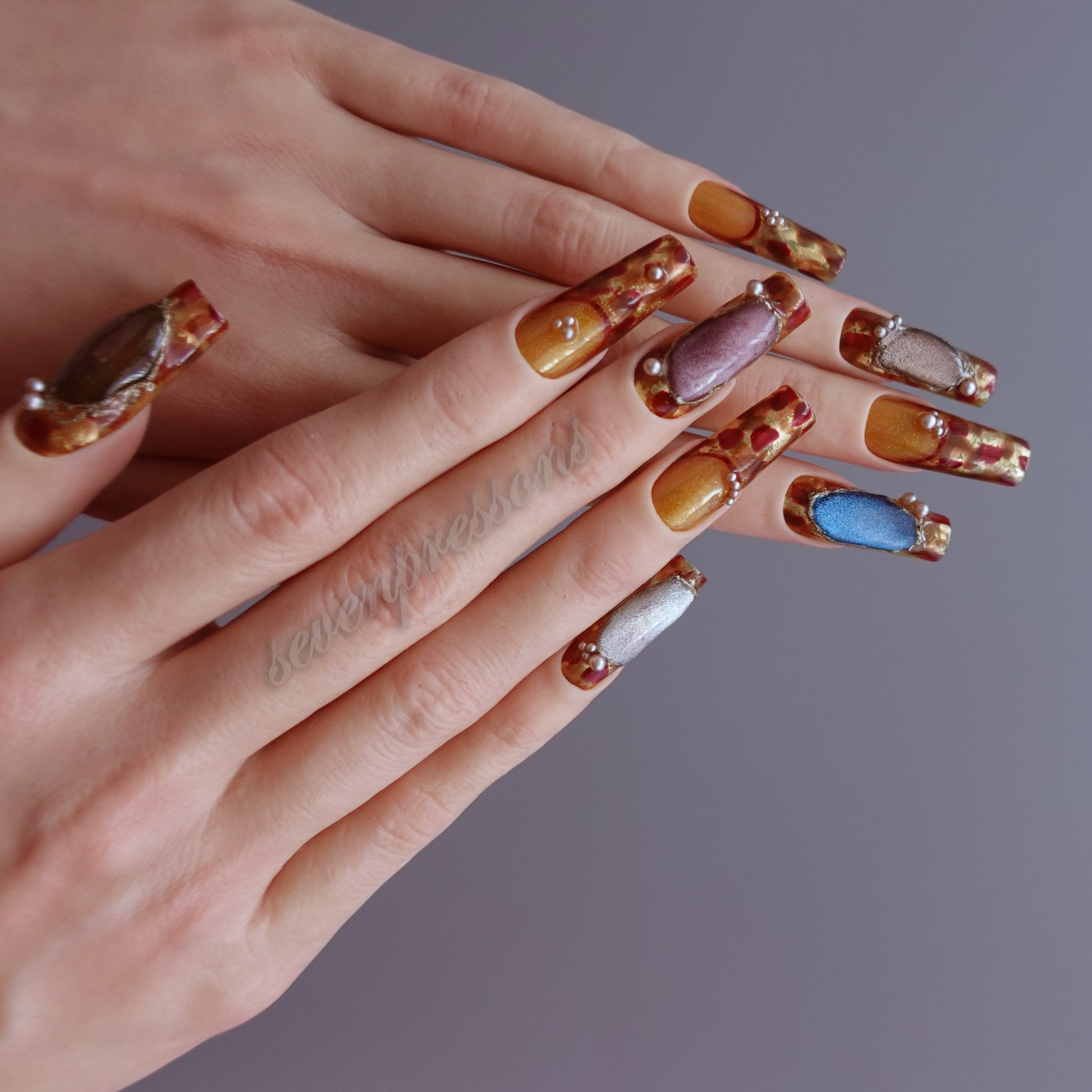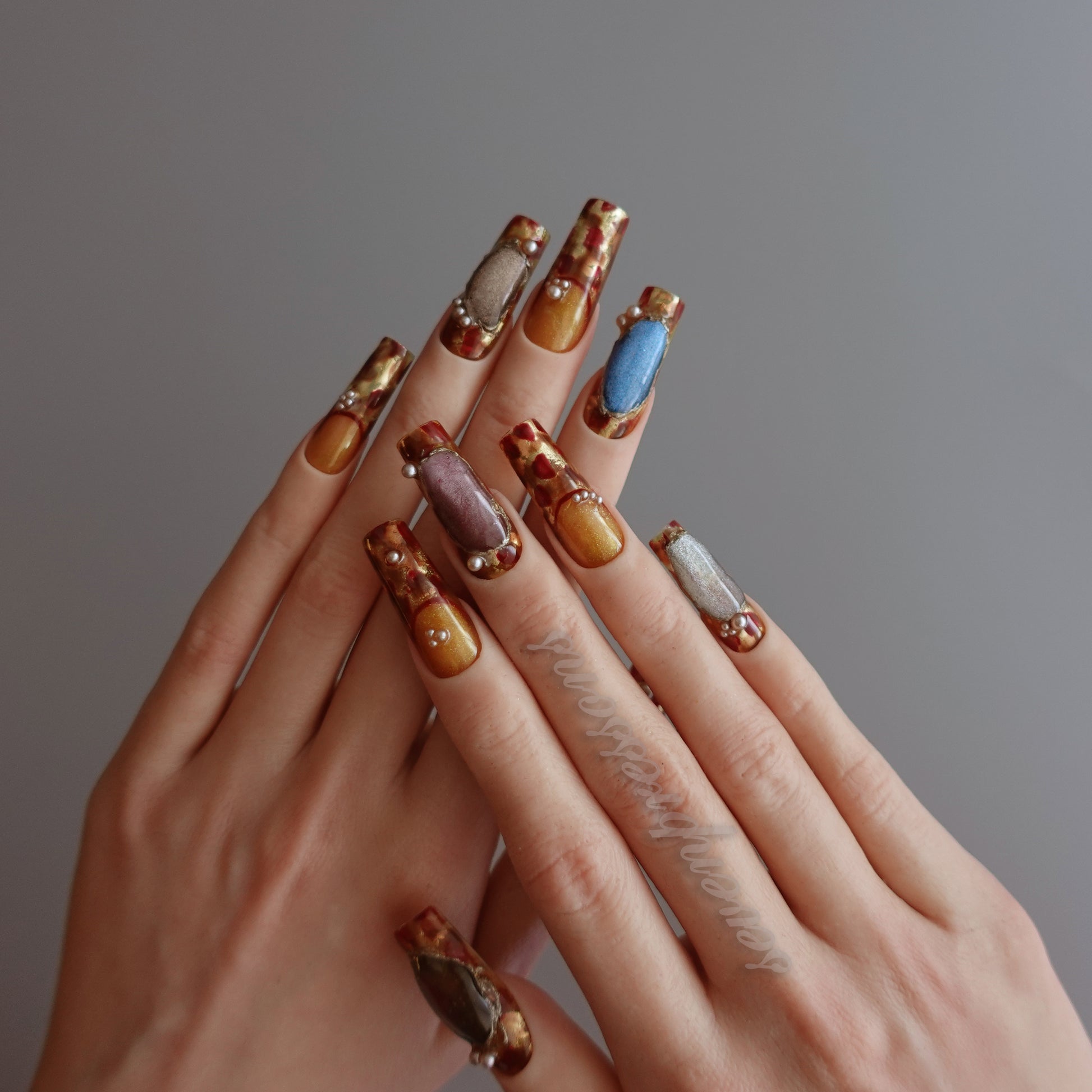 Each nail features a handcrafted “relic stone” centerpiece framed by warm amber tones, shimmering gold, and miniature pearl accents, creating a look that feels opulent, mysterious, and irresistibly curated.