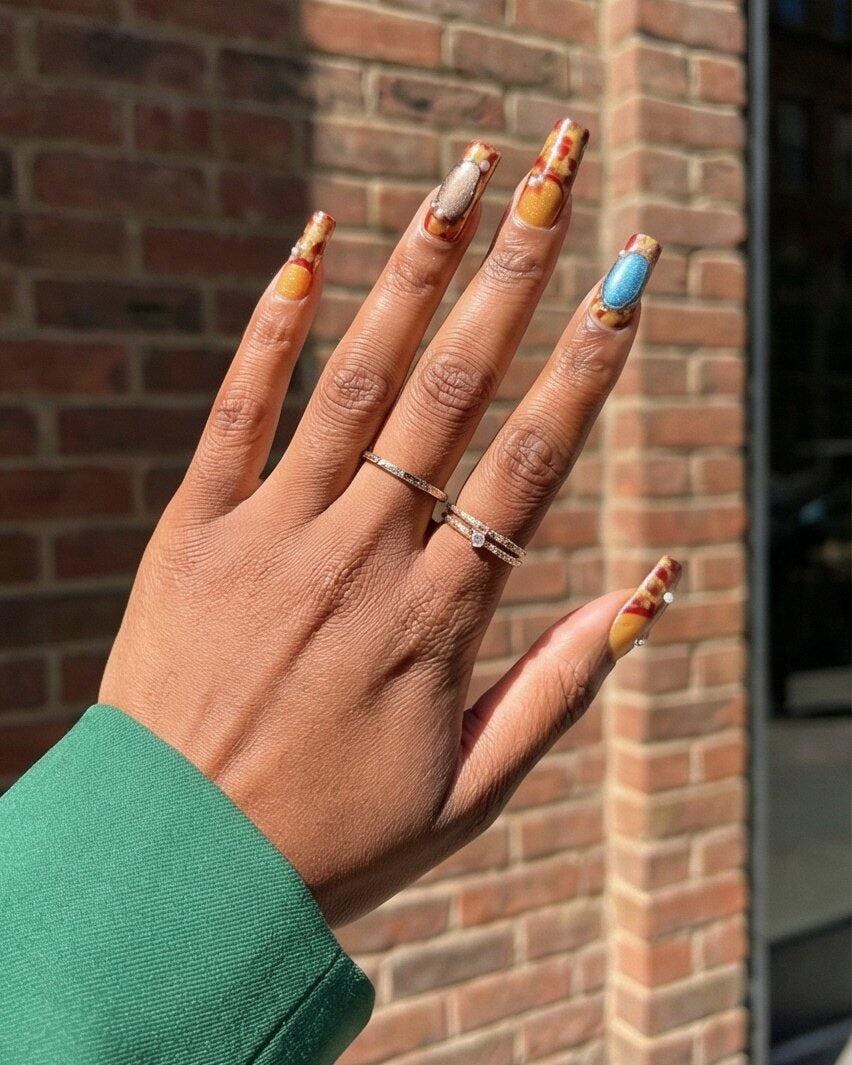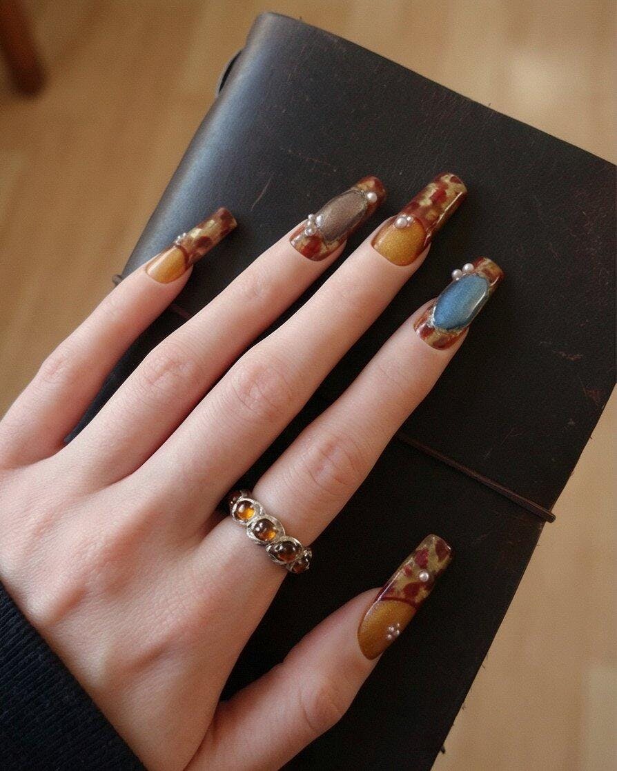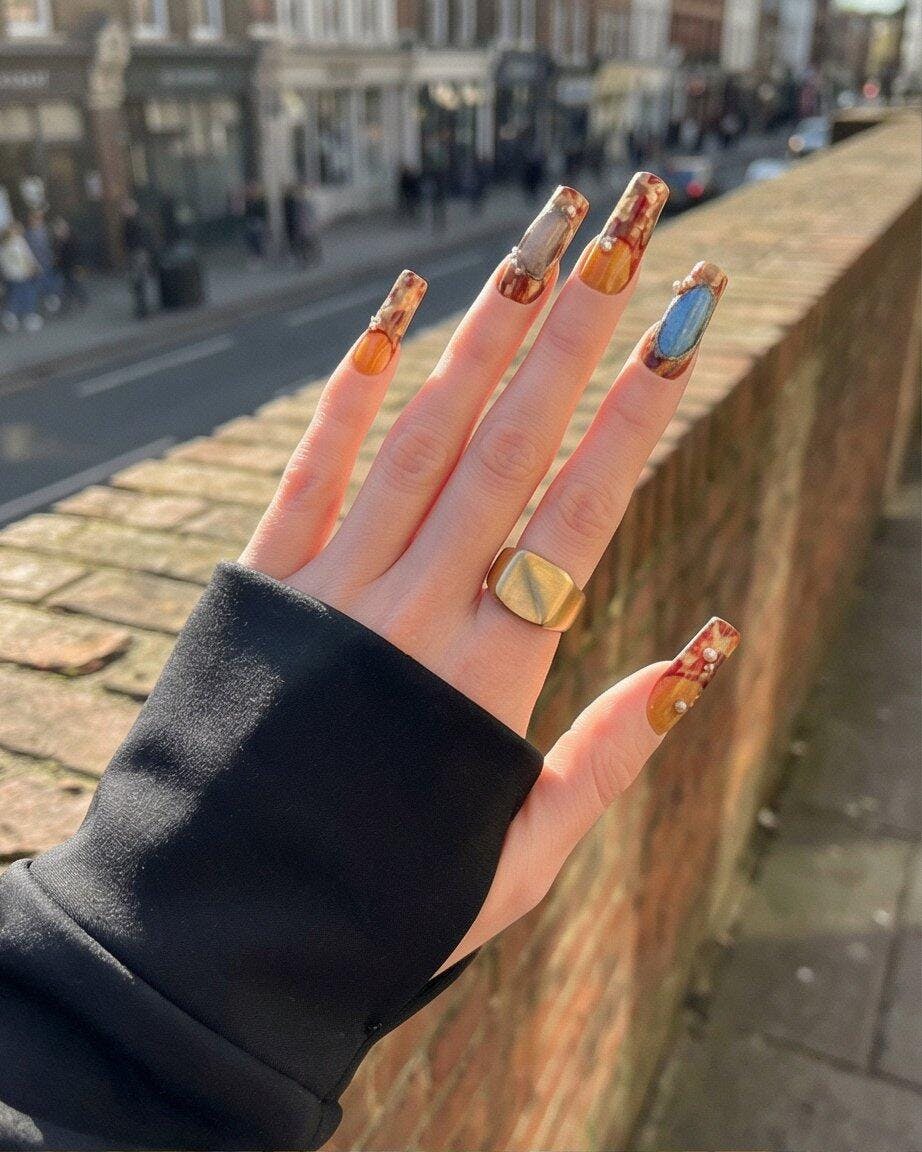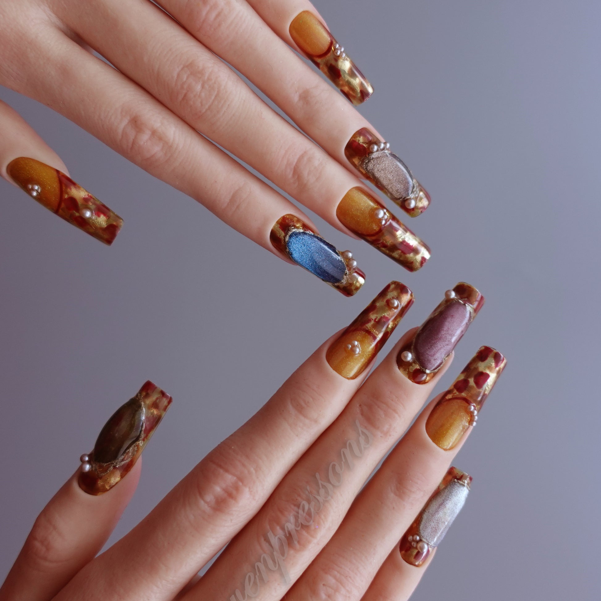Each nail features a handcrafted “relic stone” centerpiece framed by warm amber tones, shimmering gold, and miniature pearl accents, creating a look that feels opulent, mysterious, and irresistibly curated.