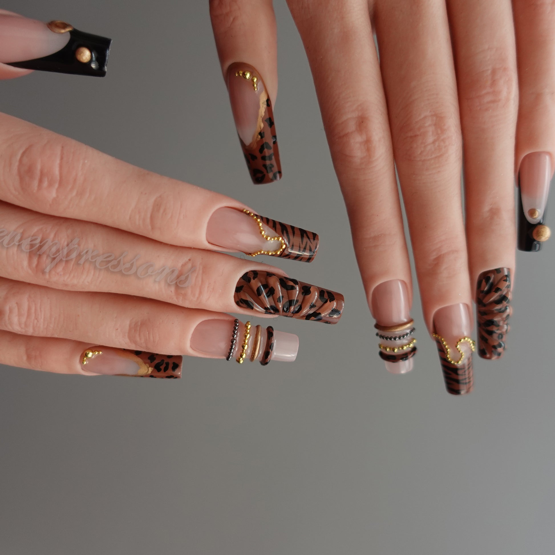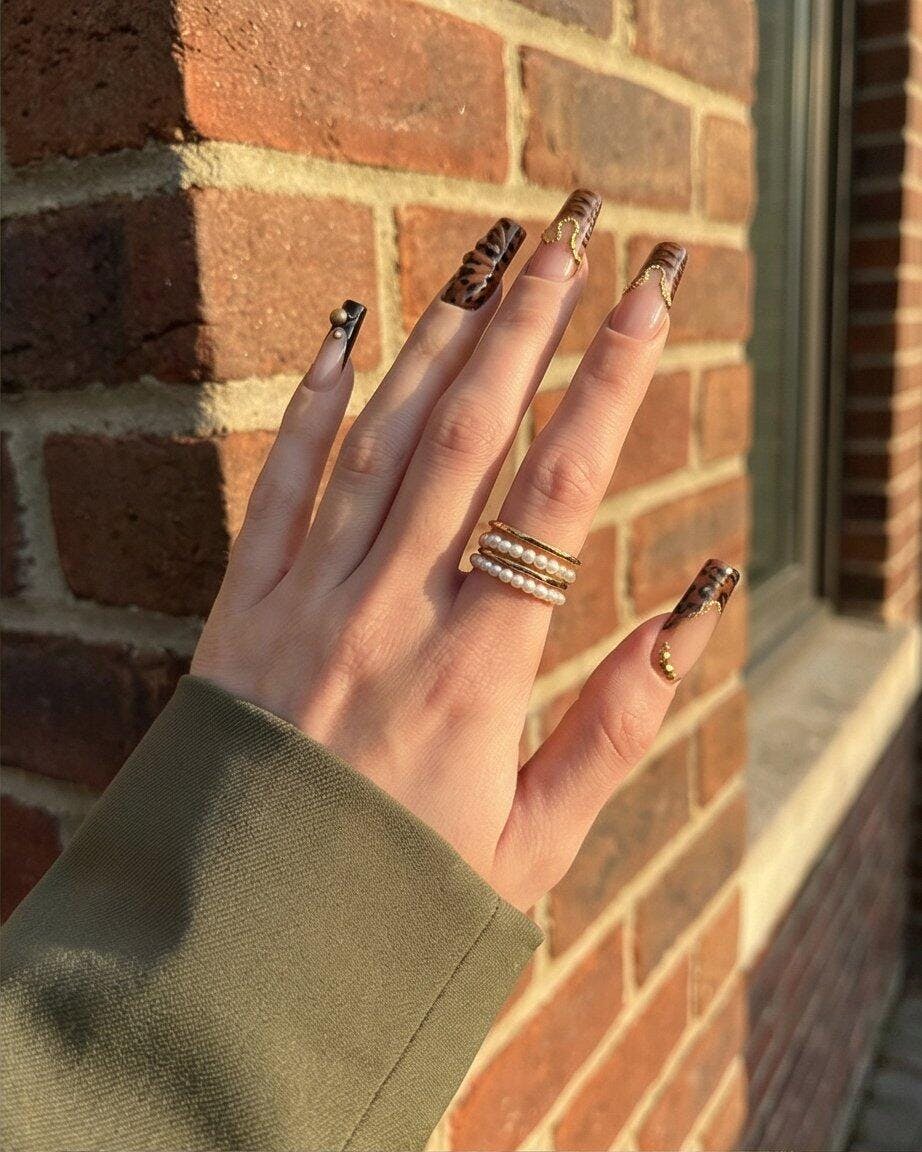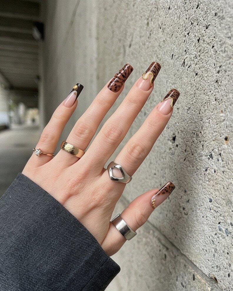 Each nail balances soft nude tones with rich espresso browns, shimmering gold metalwork, and sculpted embellishments that mimic the feel of luxury jewelry. From intricate feline patterns to stacked ring-inspired layers, this design transforms your hands into a statement of power, elegance, and irresistible edge.