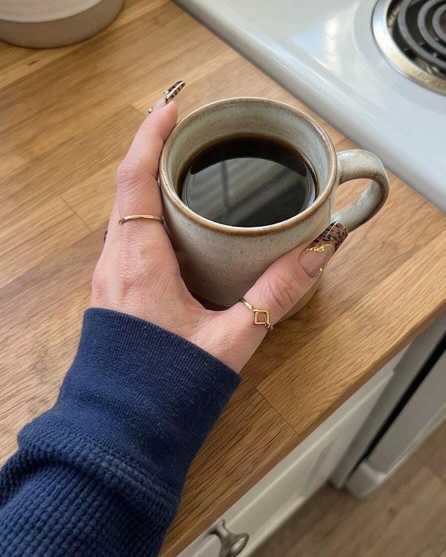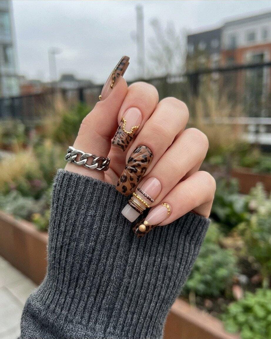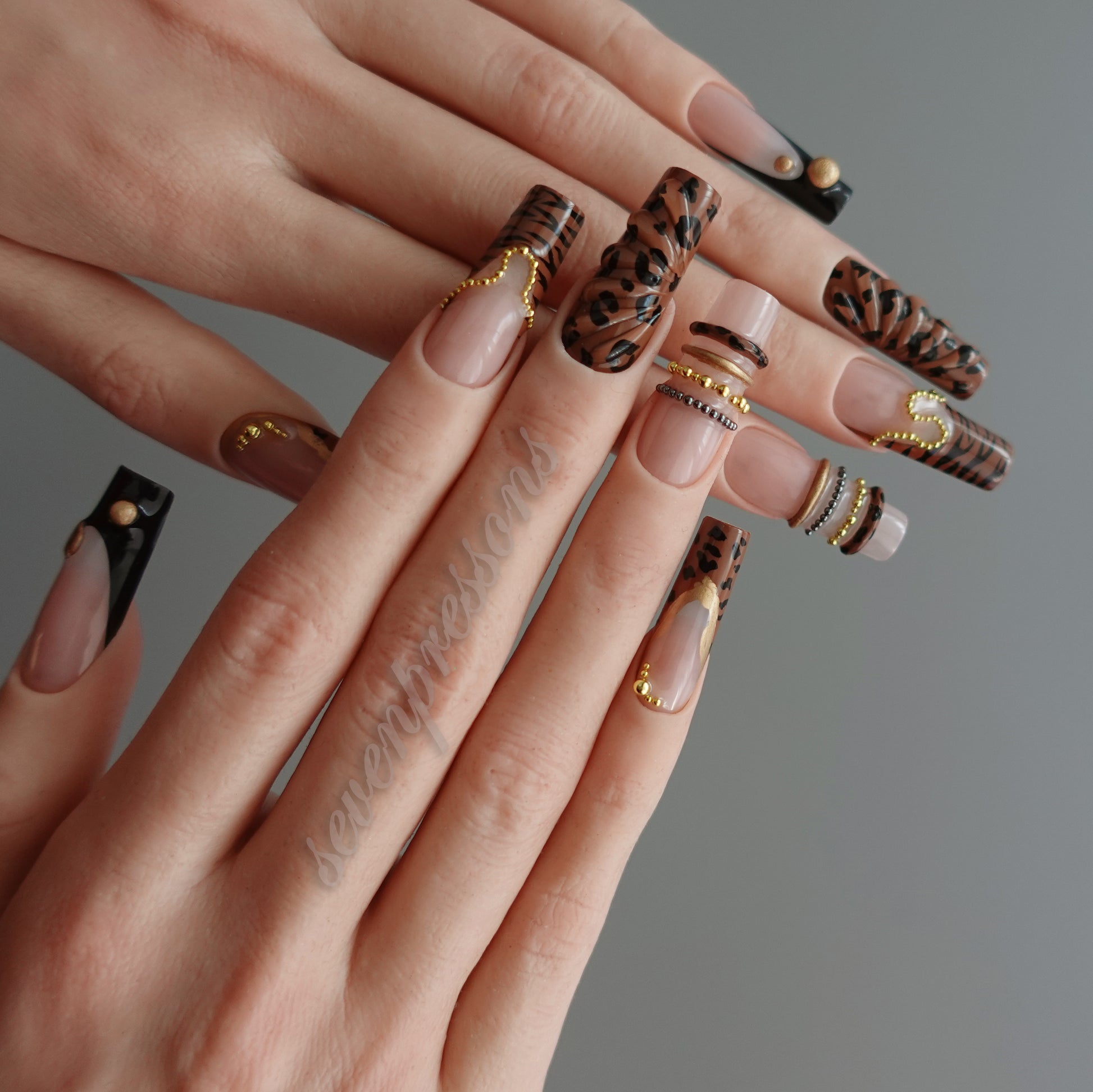 Each nail balances soft nude tones with rich espresso browns, shimmering gold metalwork, and sculpted embellishments that mimic the feel of luxury jewelry. From intricate feline patterns to stacked ring-inspired layers, this design transforms your hands into a statement of power, elegance, and irresistible edge.