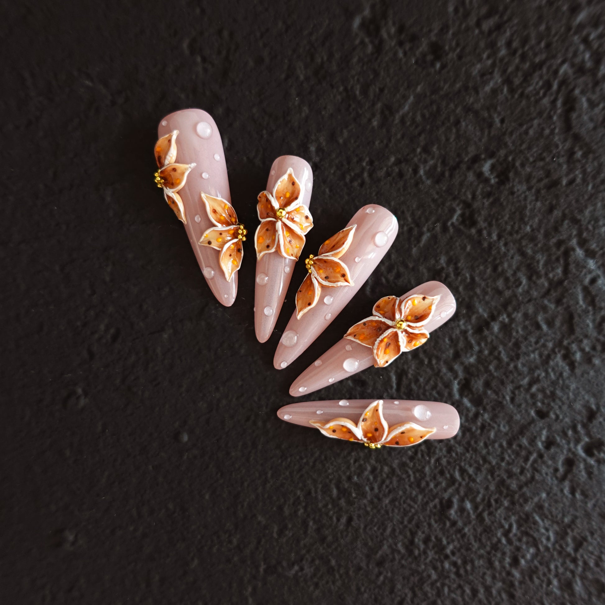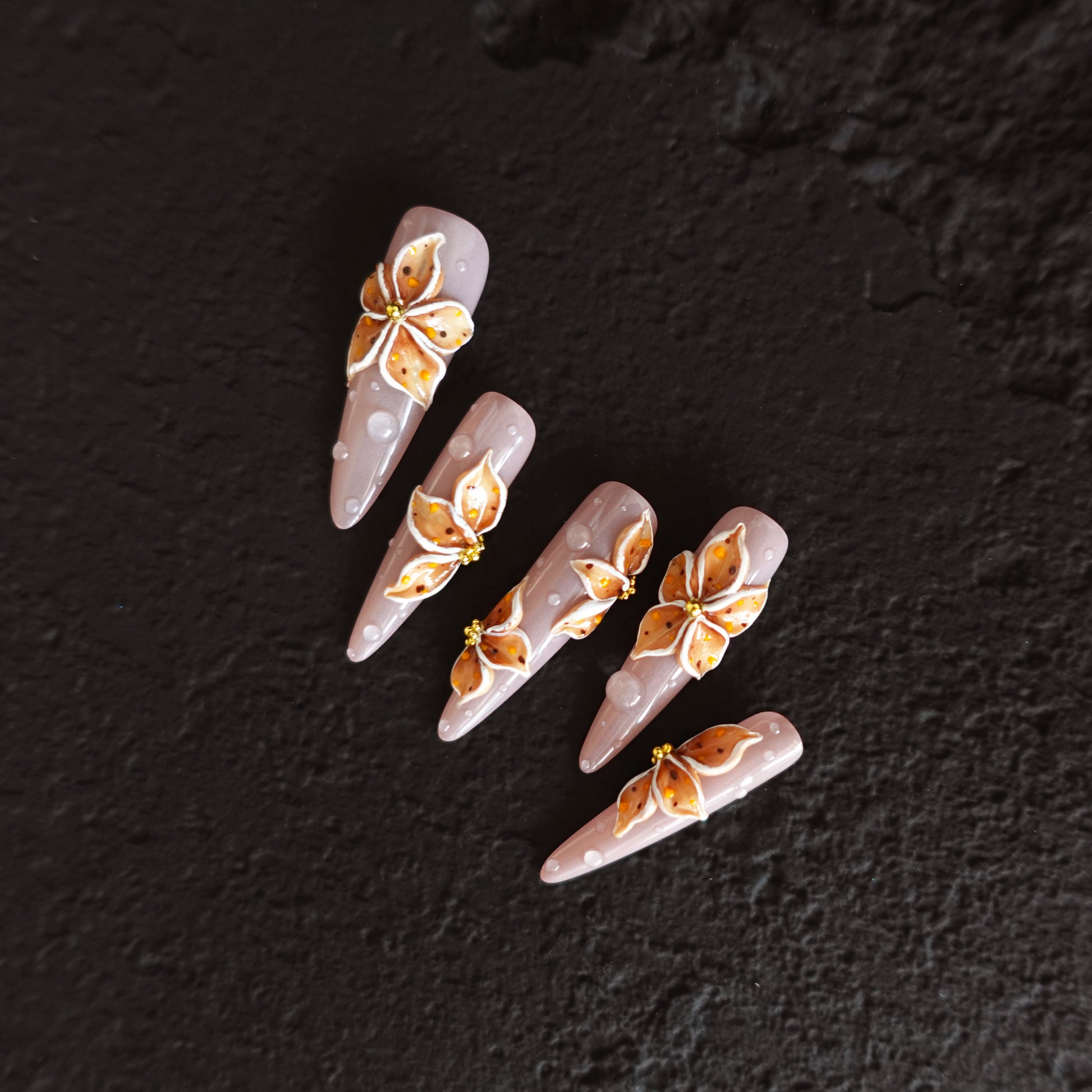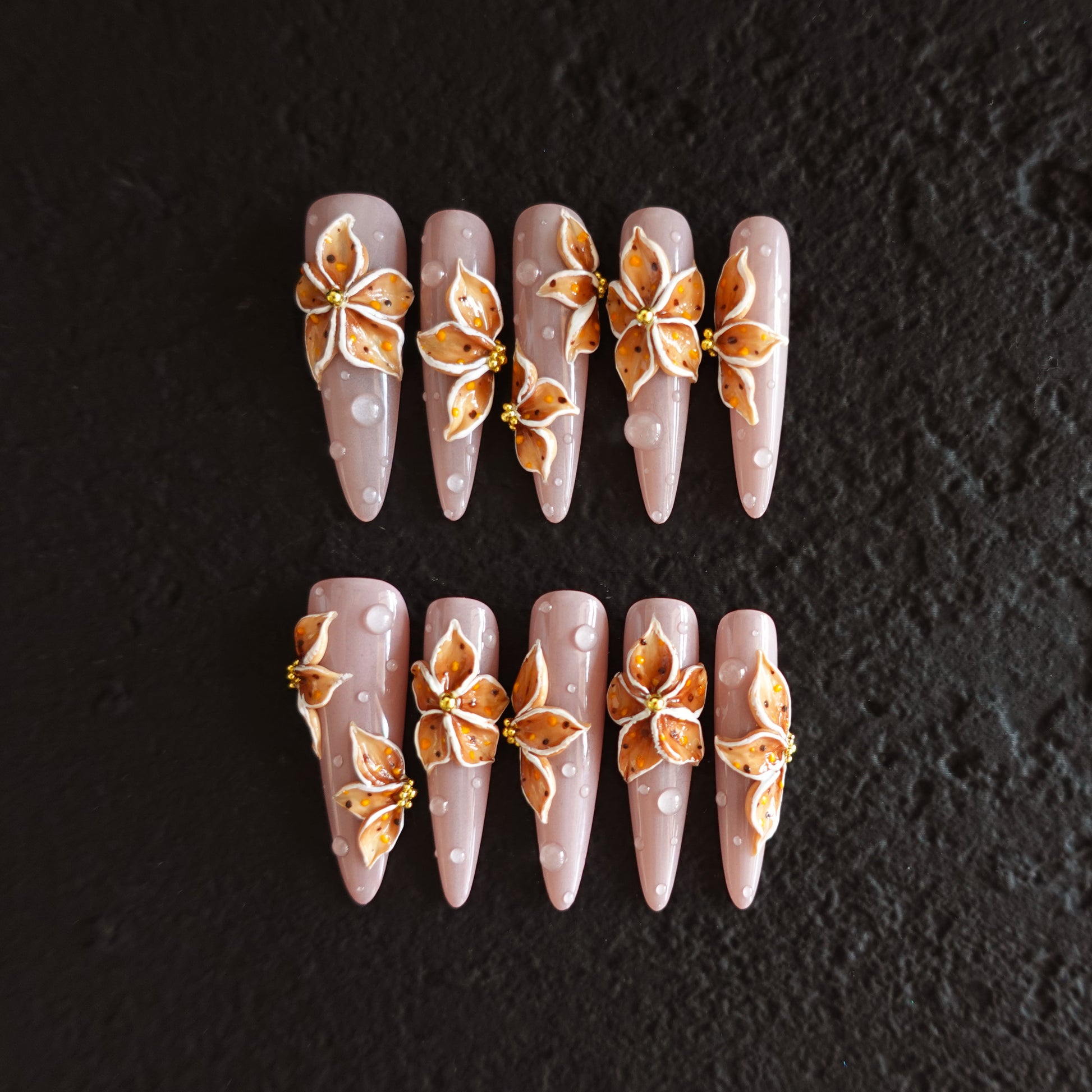 Golden Orchid blossoms with sculpted elegance, bringing the warmth of nature into a wearable masterpiece. Each nail is crowned with delicate 3D orchid petals, hand-painted in golden amber and outlined in ivory, kissed with crystal-like dew drops. This set evokes a garden at dawn, where light dances on flowers still touched by morning mist.