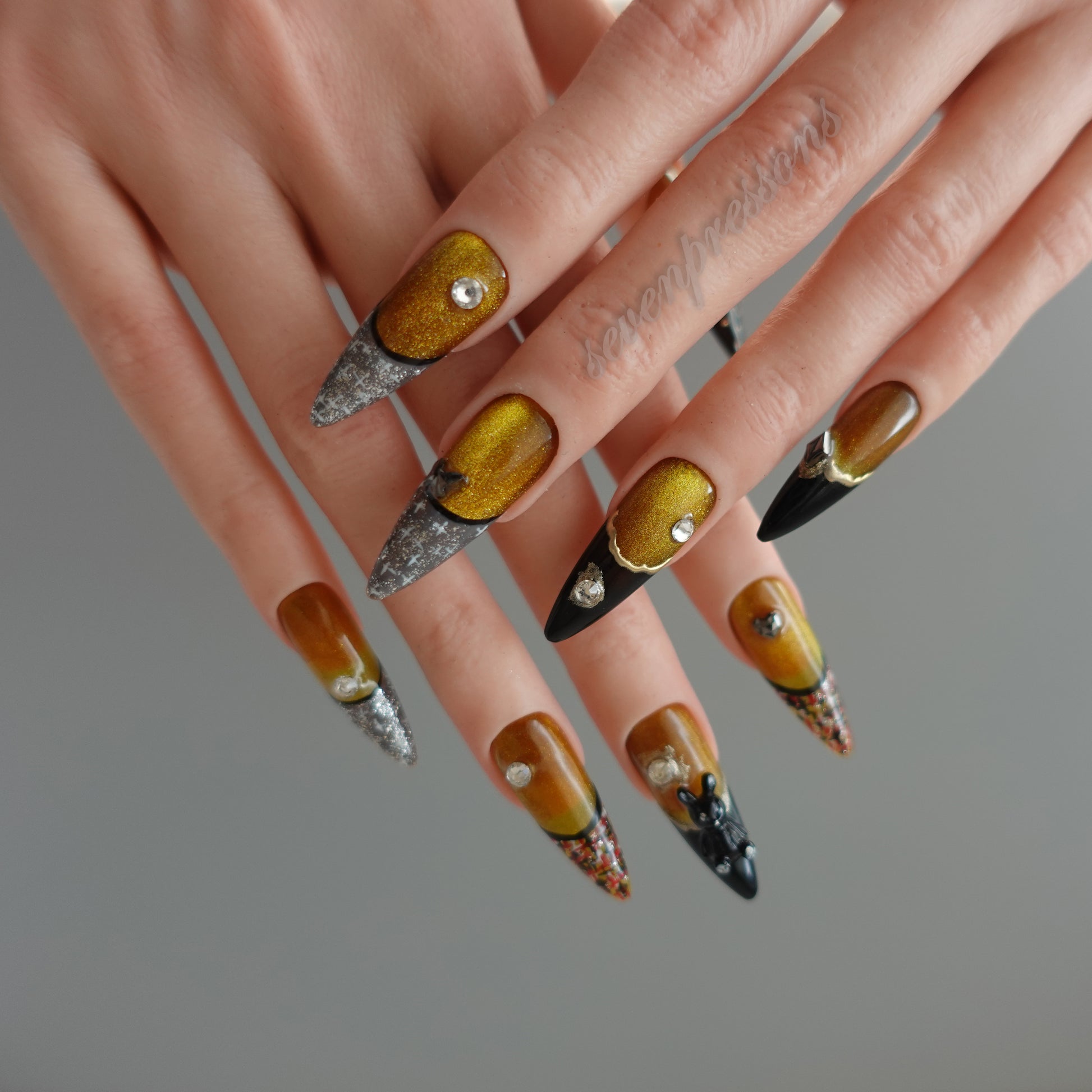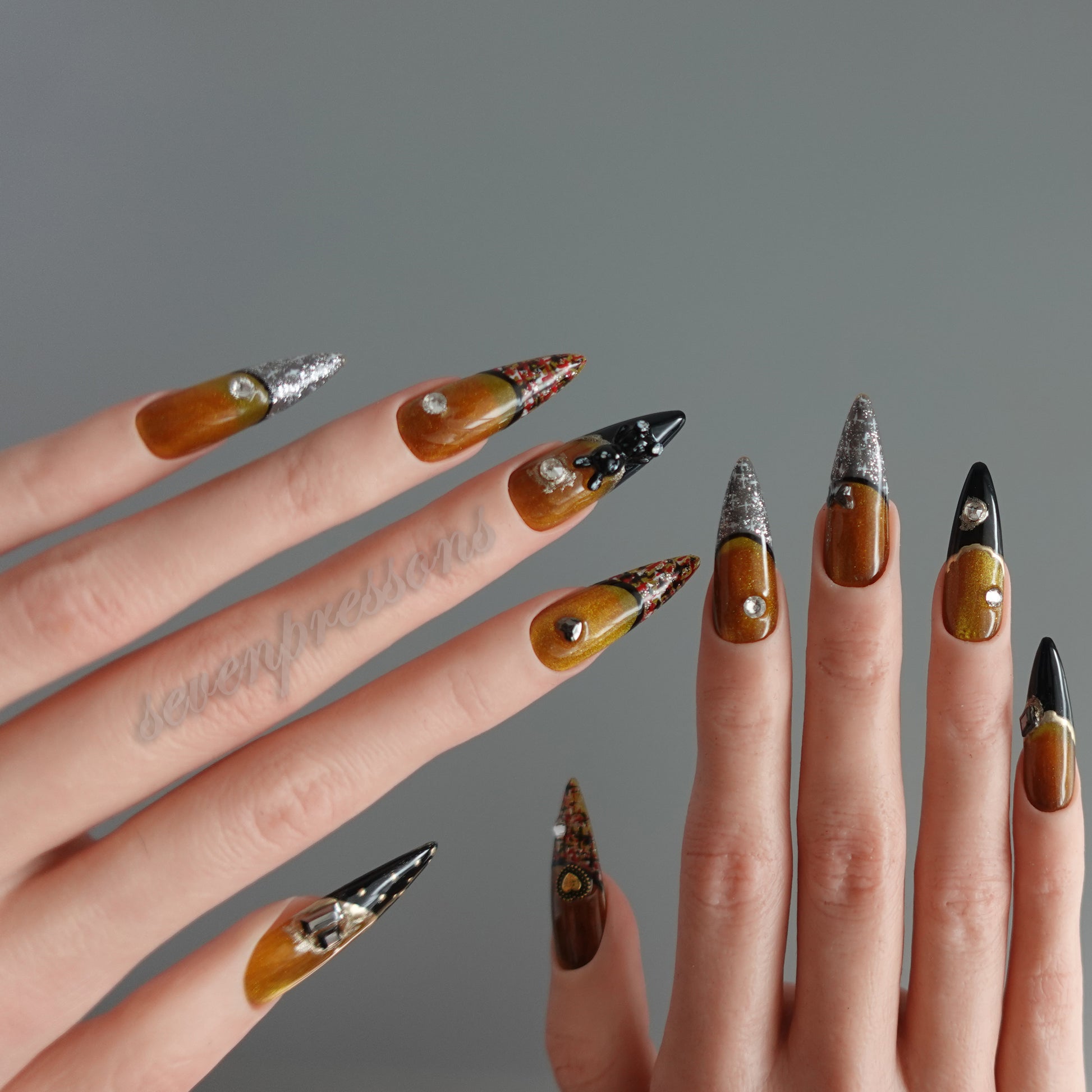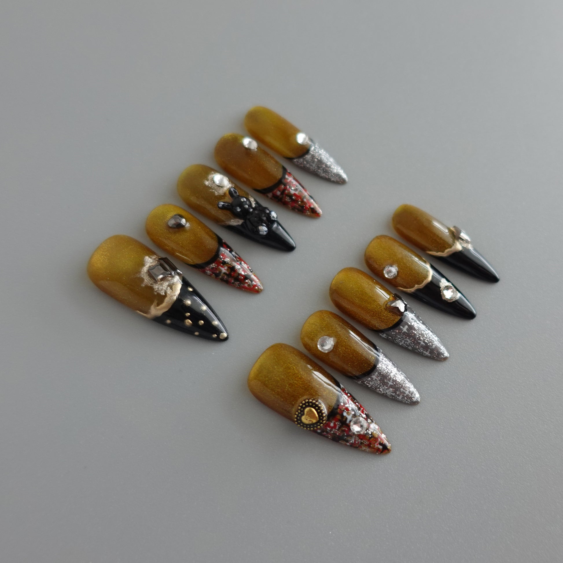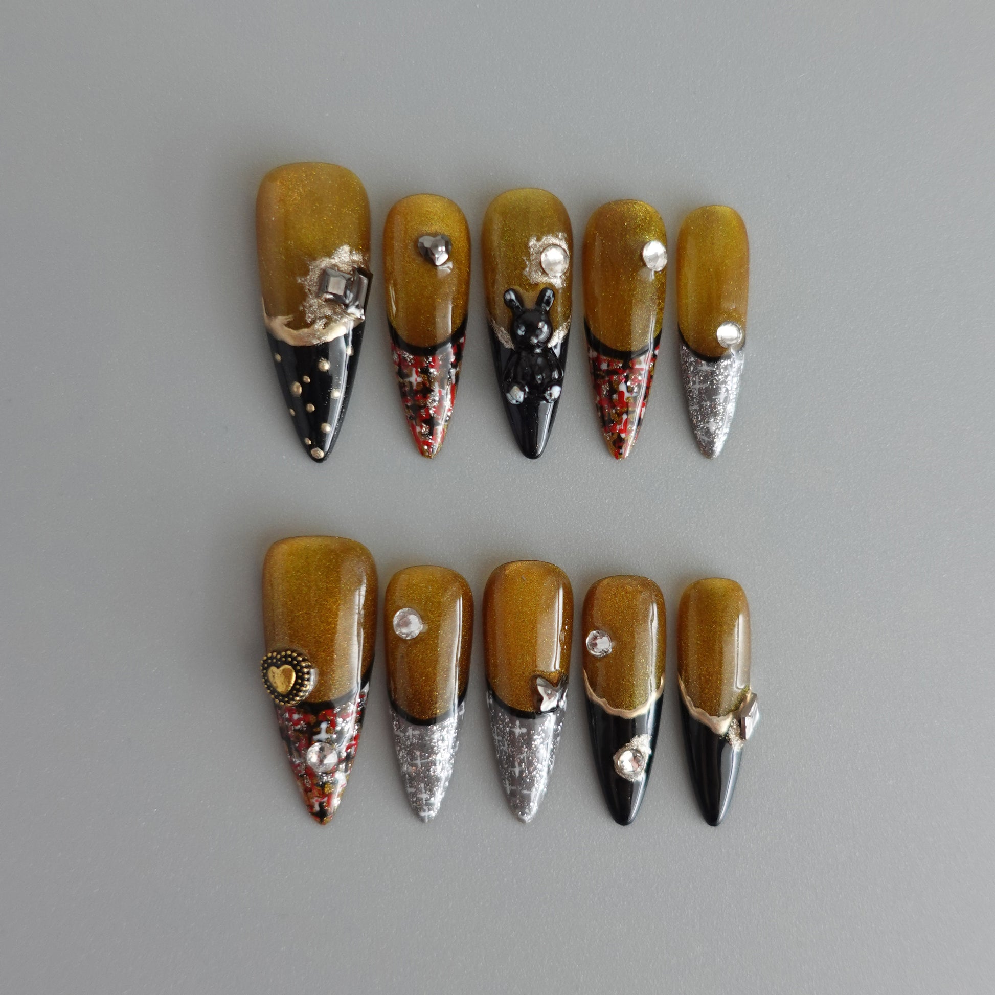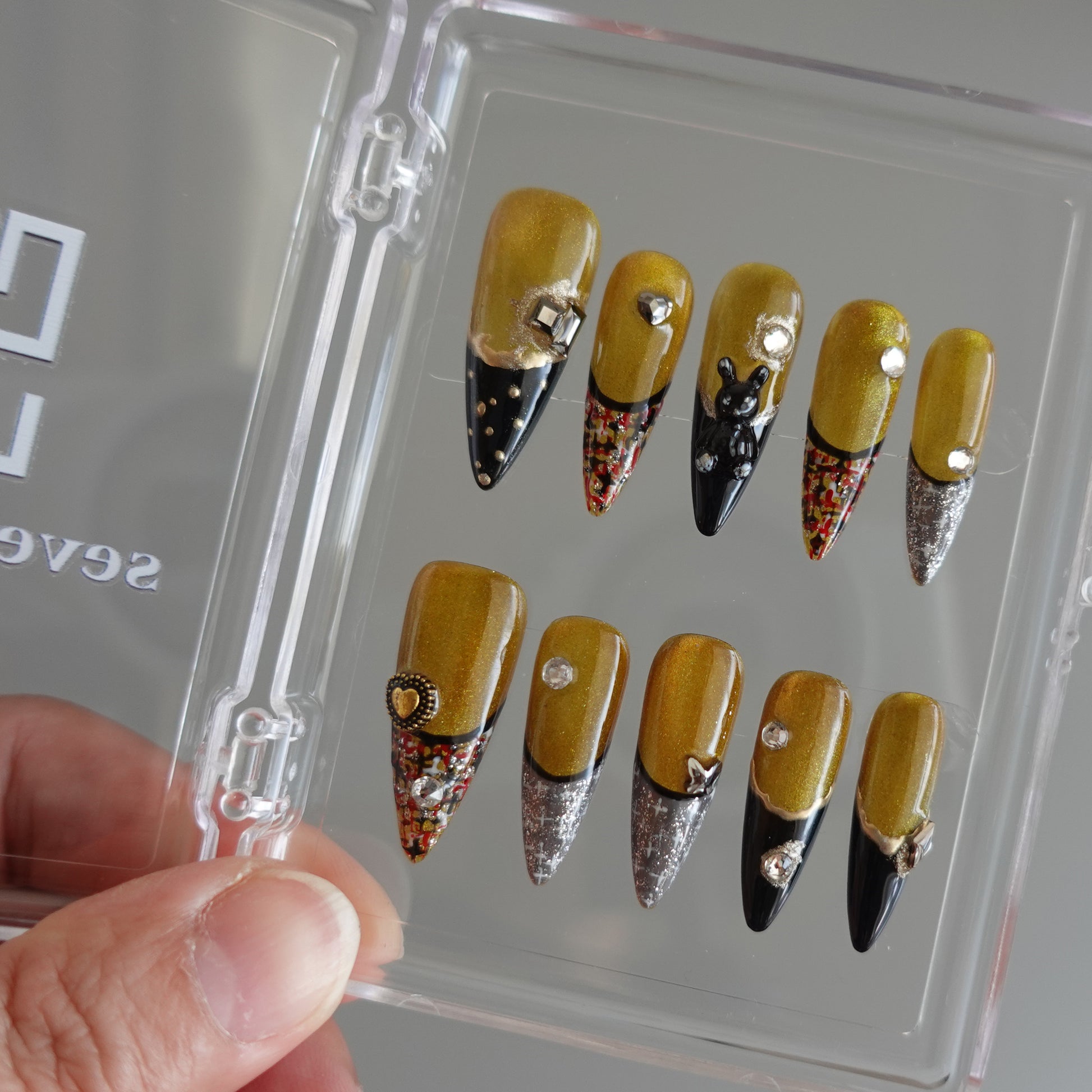 Gilded temptation meets gothic charm in Golden Vice. A molten fusion of gold shimmer, jet black, and silver dust โ adorned with crystal studs, metallic accents, and a mischievous black bunny centerpiece. Each fingertip balances luxury and rebellion, like a secret kept in velvet and steel. Designed for those who shine in the shadows, this set turns elegance into power.