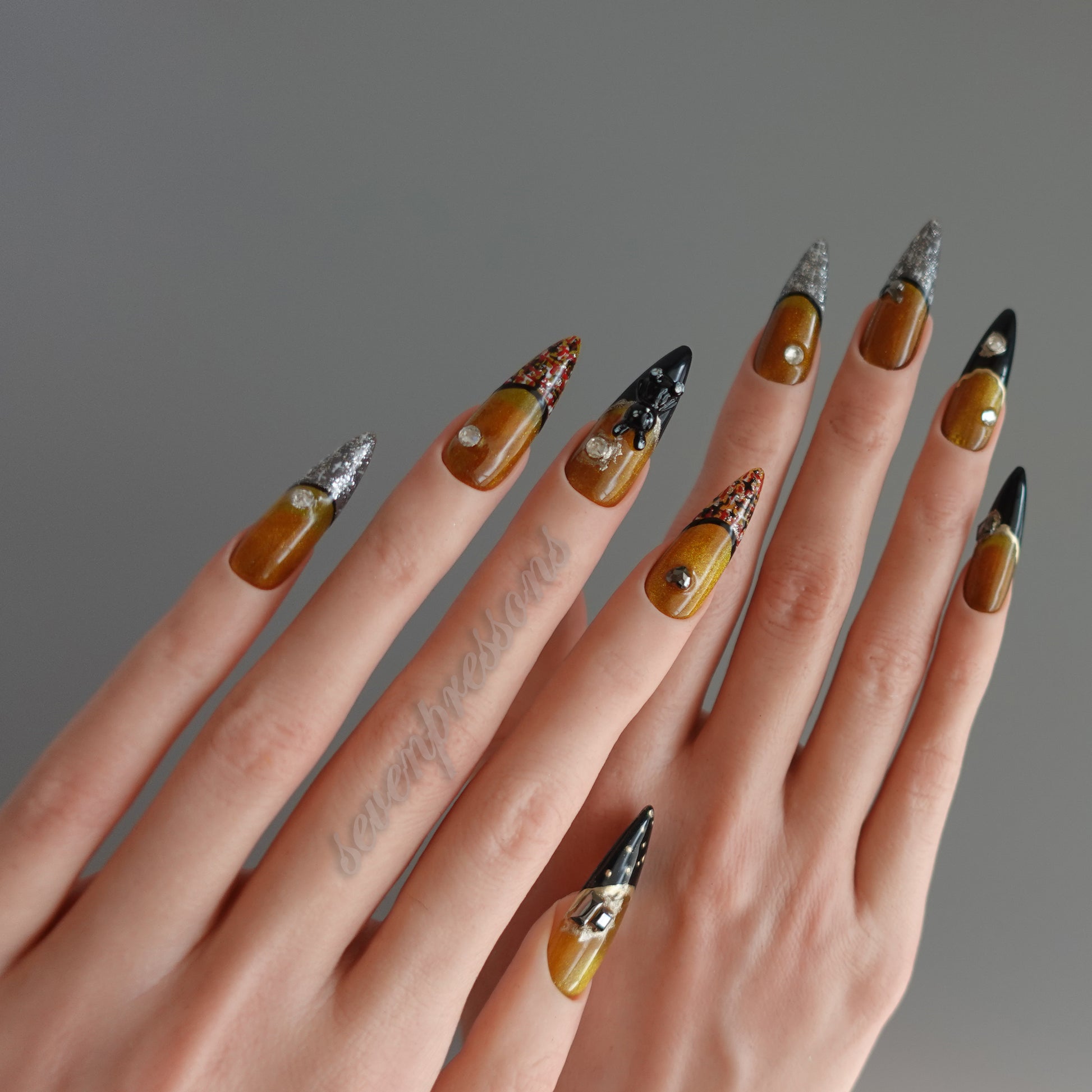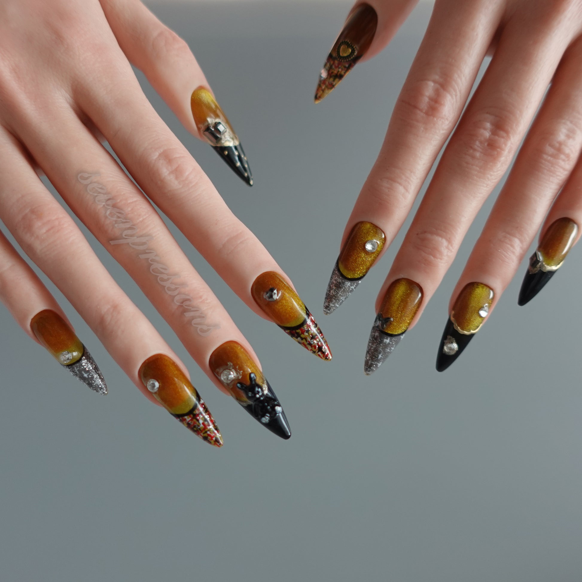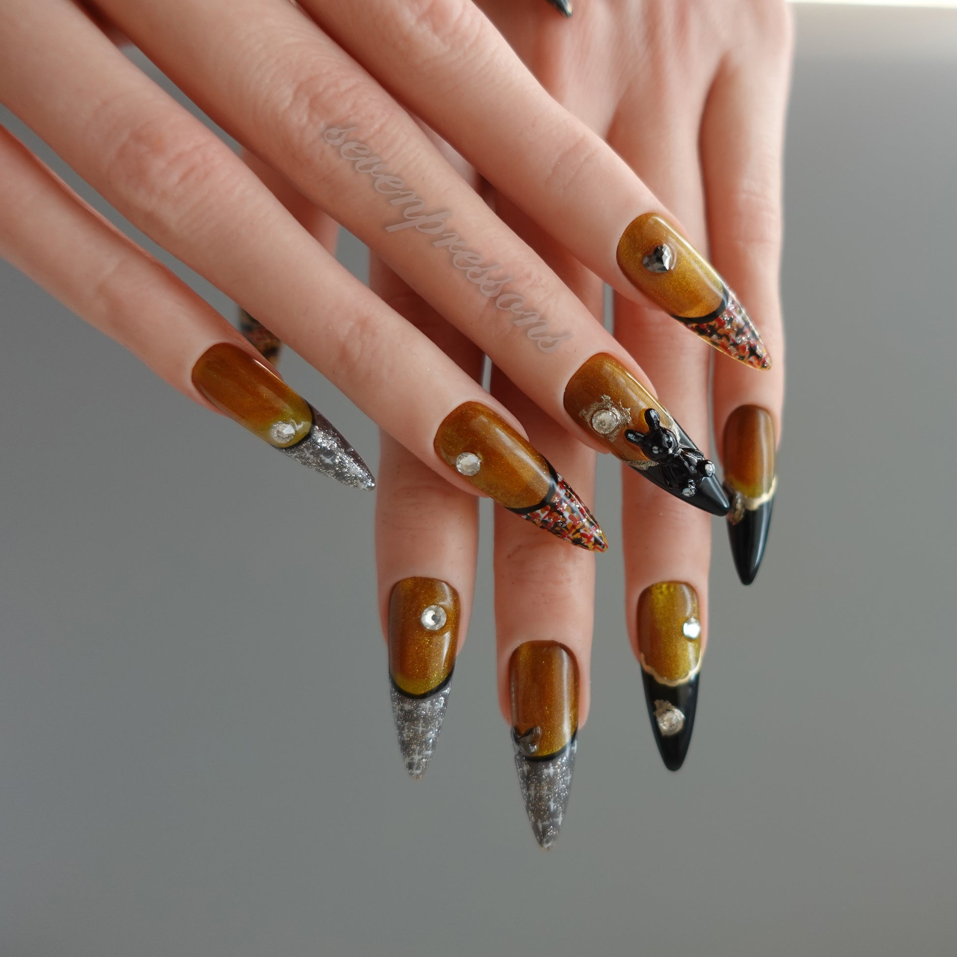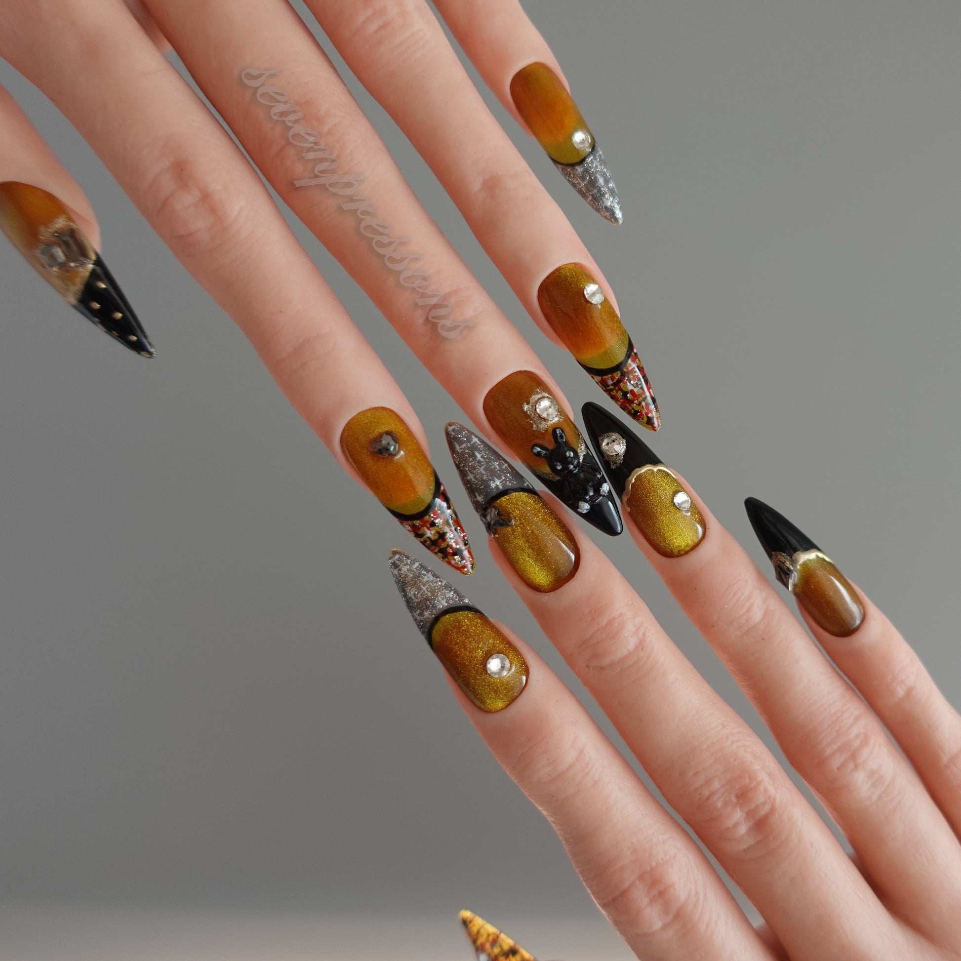 Gilded temptation meets gothic charm in Golden Vice. A molten fusion of gold shimmer, jet black, and silver dust โ adorned with crystal studs, metallic accents, and a mischievous black bunny centerpiece. Each fingertip balances luxury and rebellion, like a secret kept in velvet and steel. Designed for those who shine in the shadows, this set turns elegance into power.