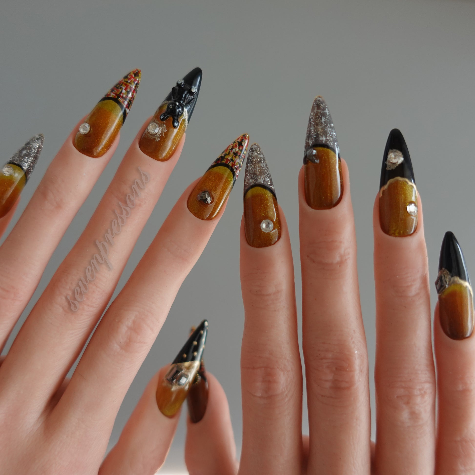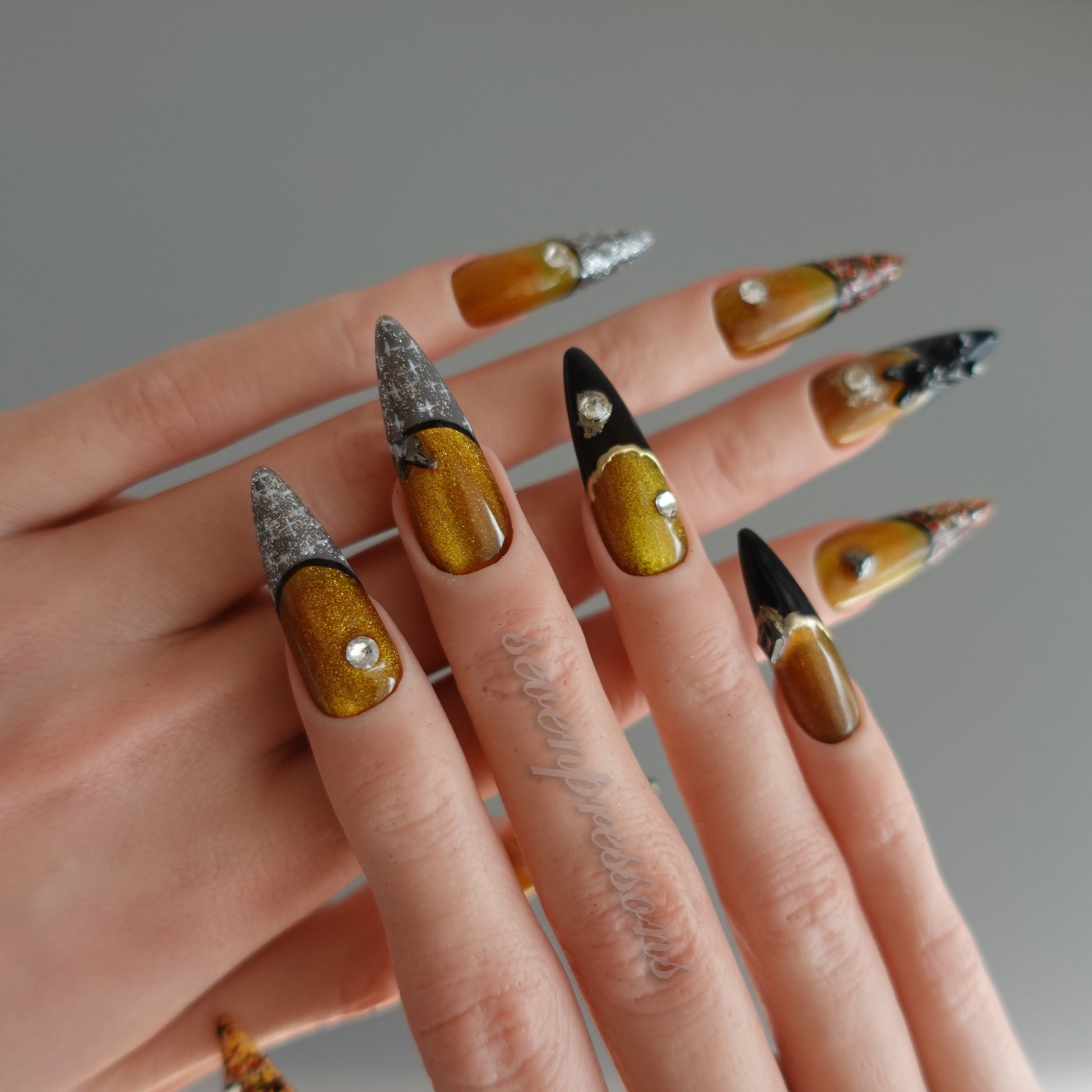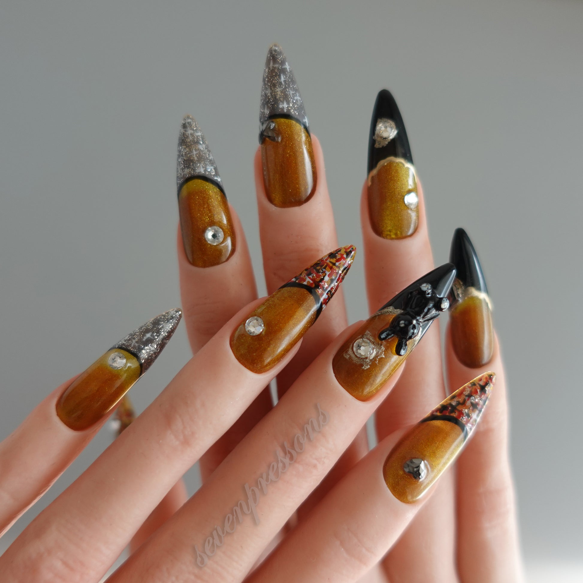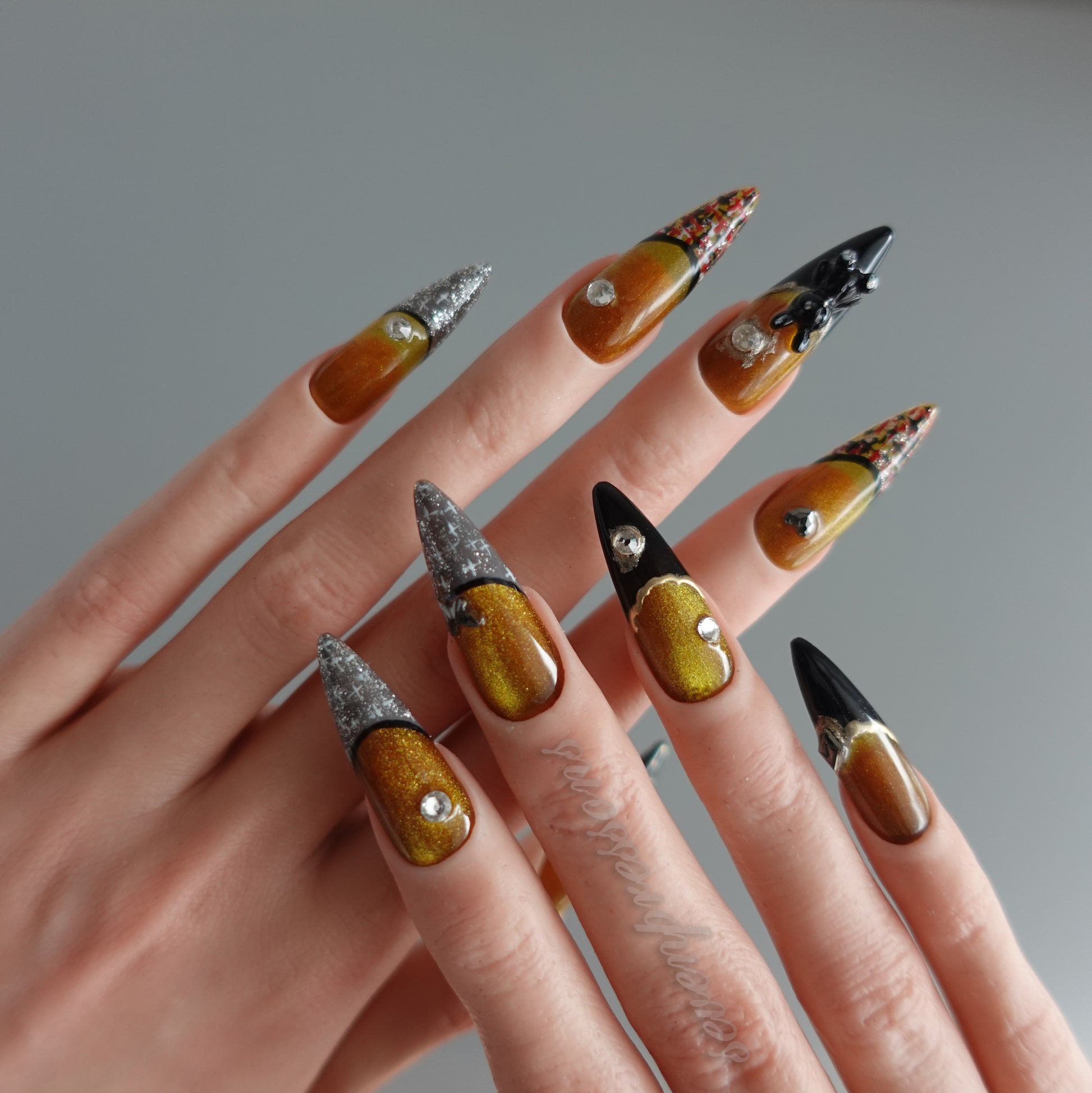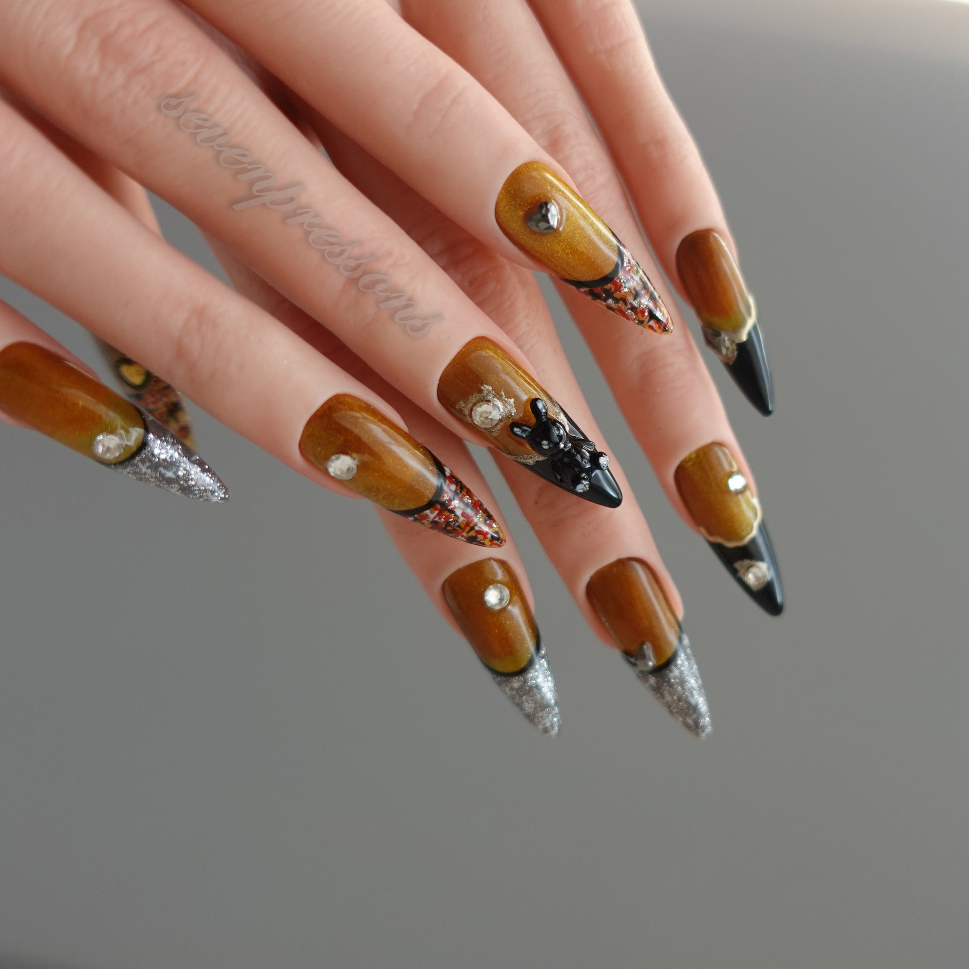 Gilded temptation meets gothic charm in Golden Vice. A molten fusion of gold shimmer, jet black, and silver dust โ adorned with crystal studs, metallic accents, and a mischievous black bunny centerpiece. Each fingertip balances luxury and rebellion, like a secret kept in velvet and steel. Designed for those who shine in the shadows, this set turns elegance into power.