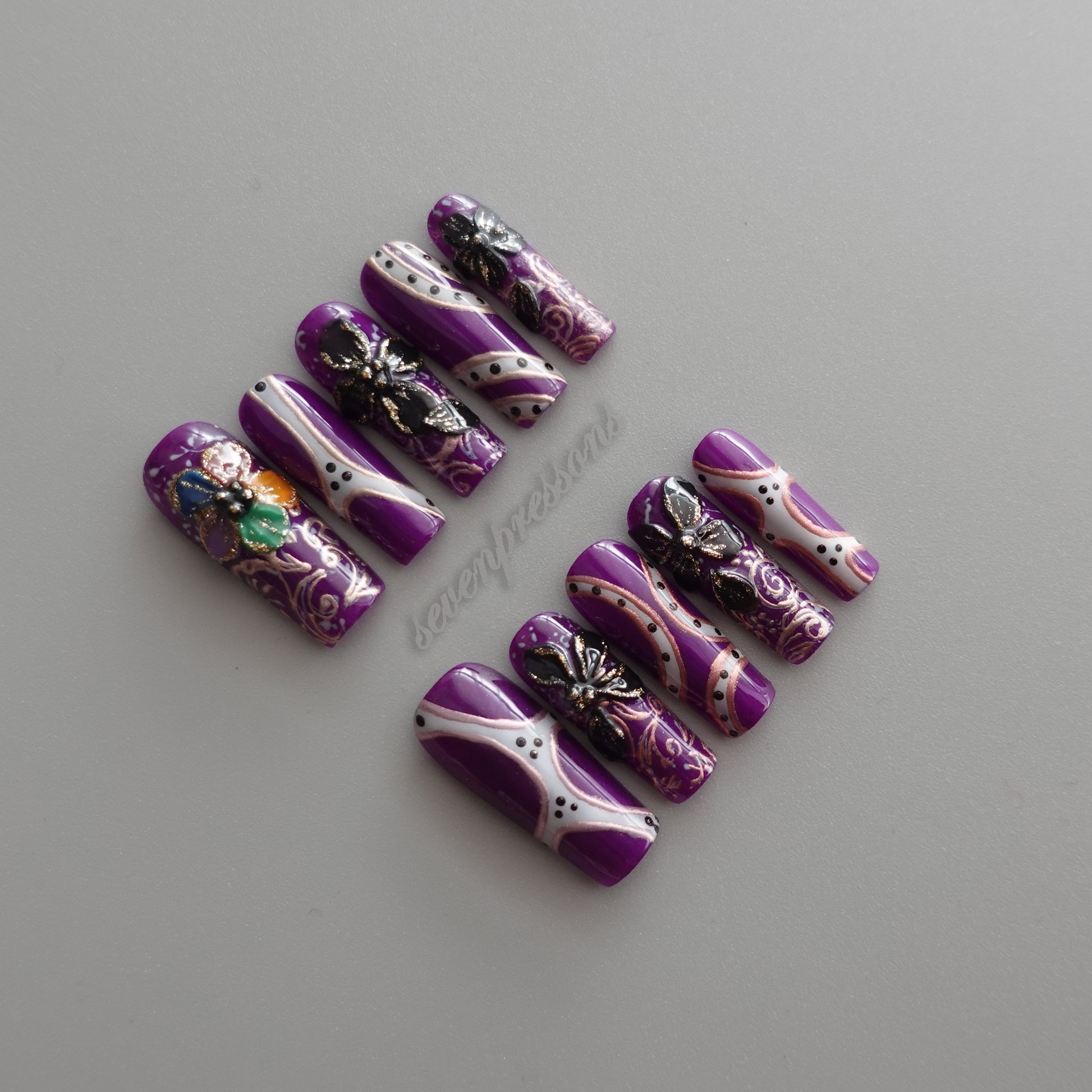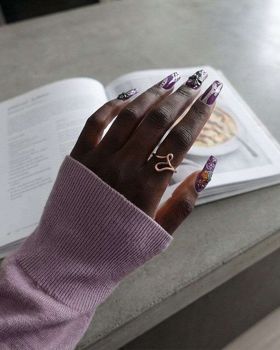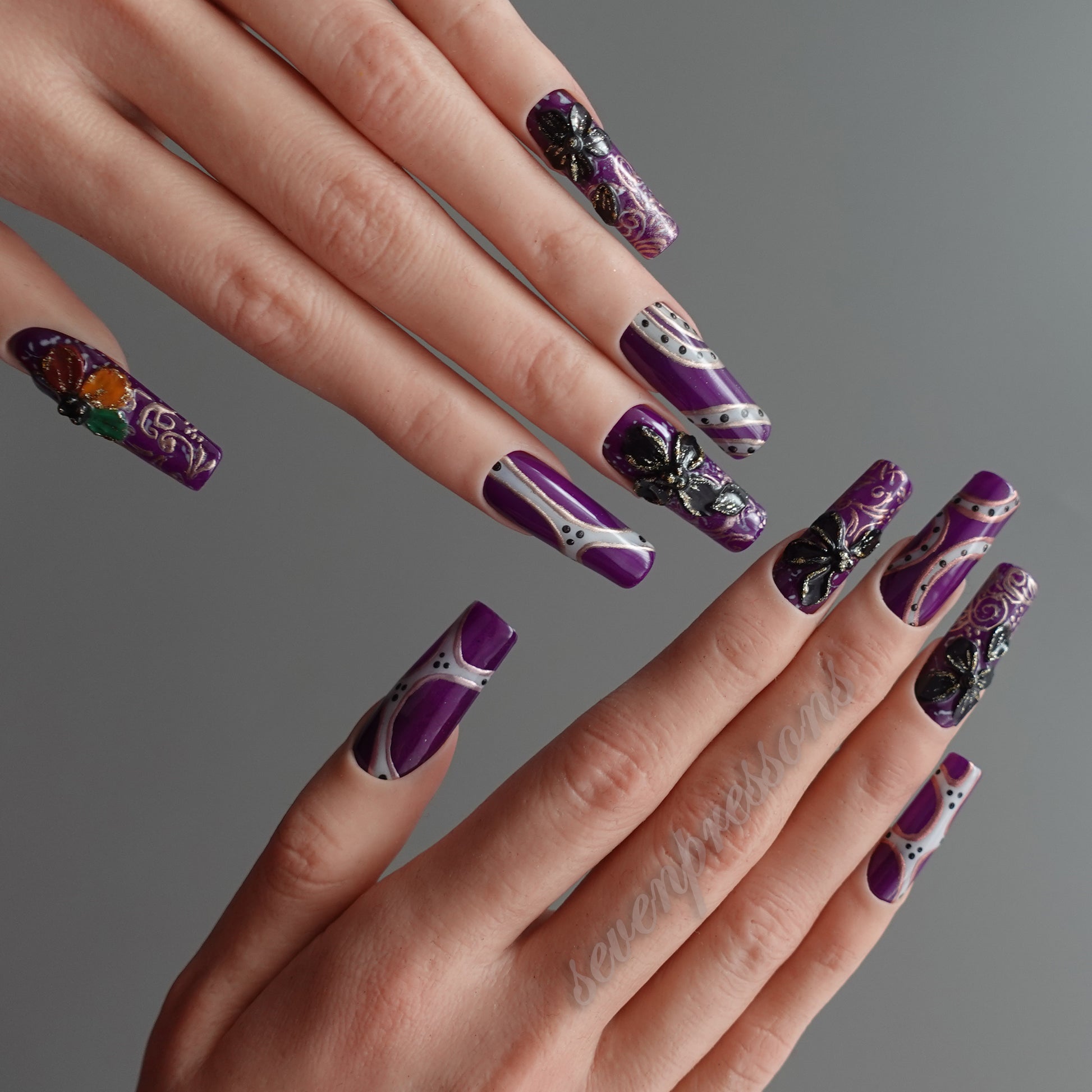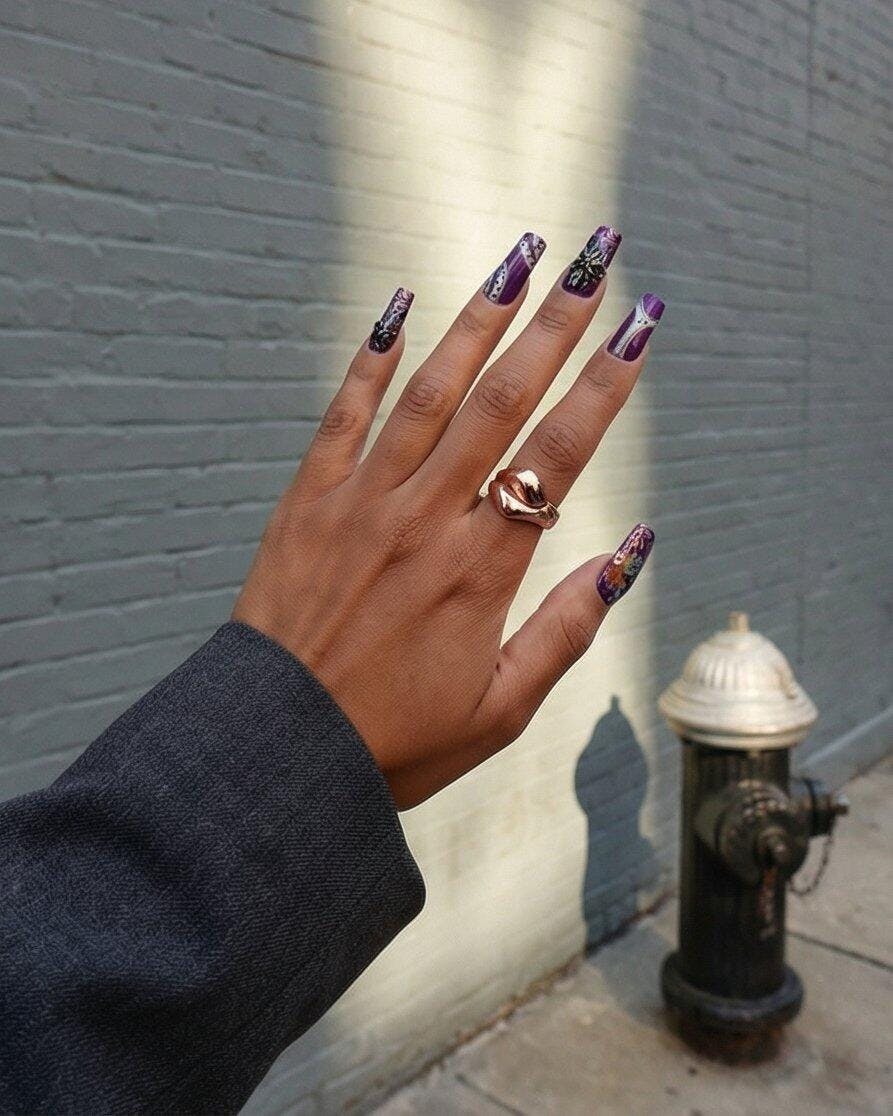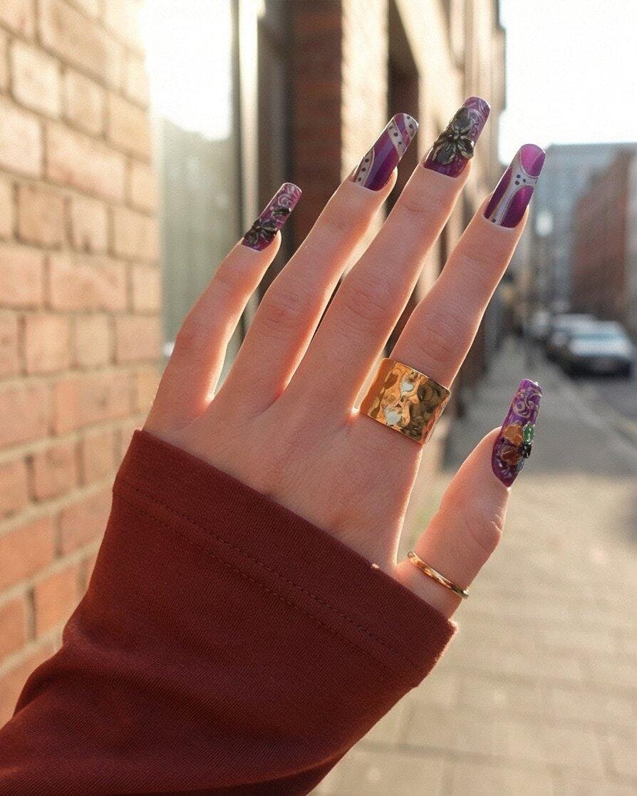 Rich purple bases meet sculpted black butterflies, iridescent accents, and baroque-style linework, forming a design that feels dramatic yet delicately romantic.