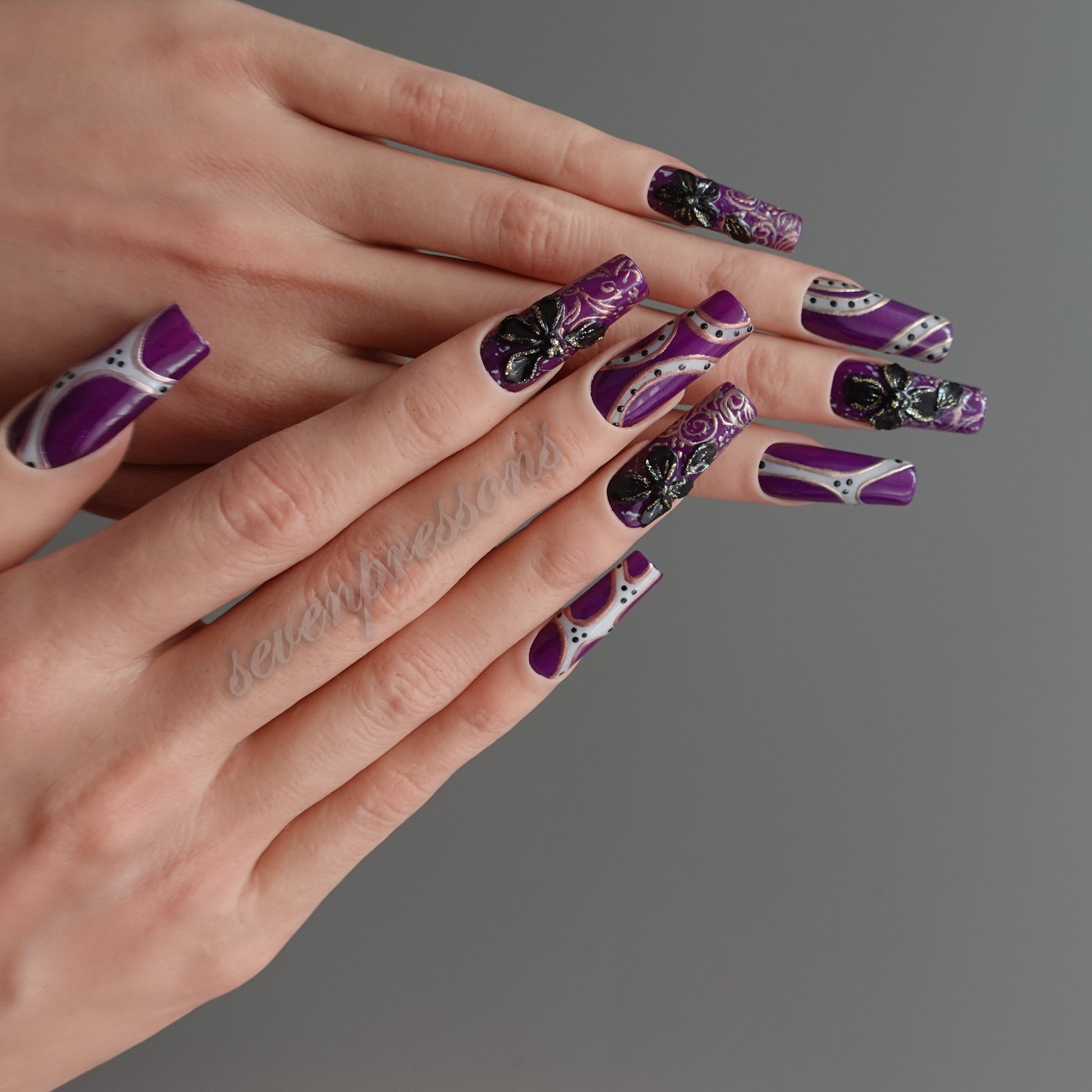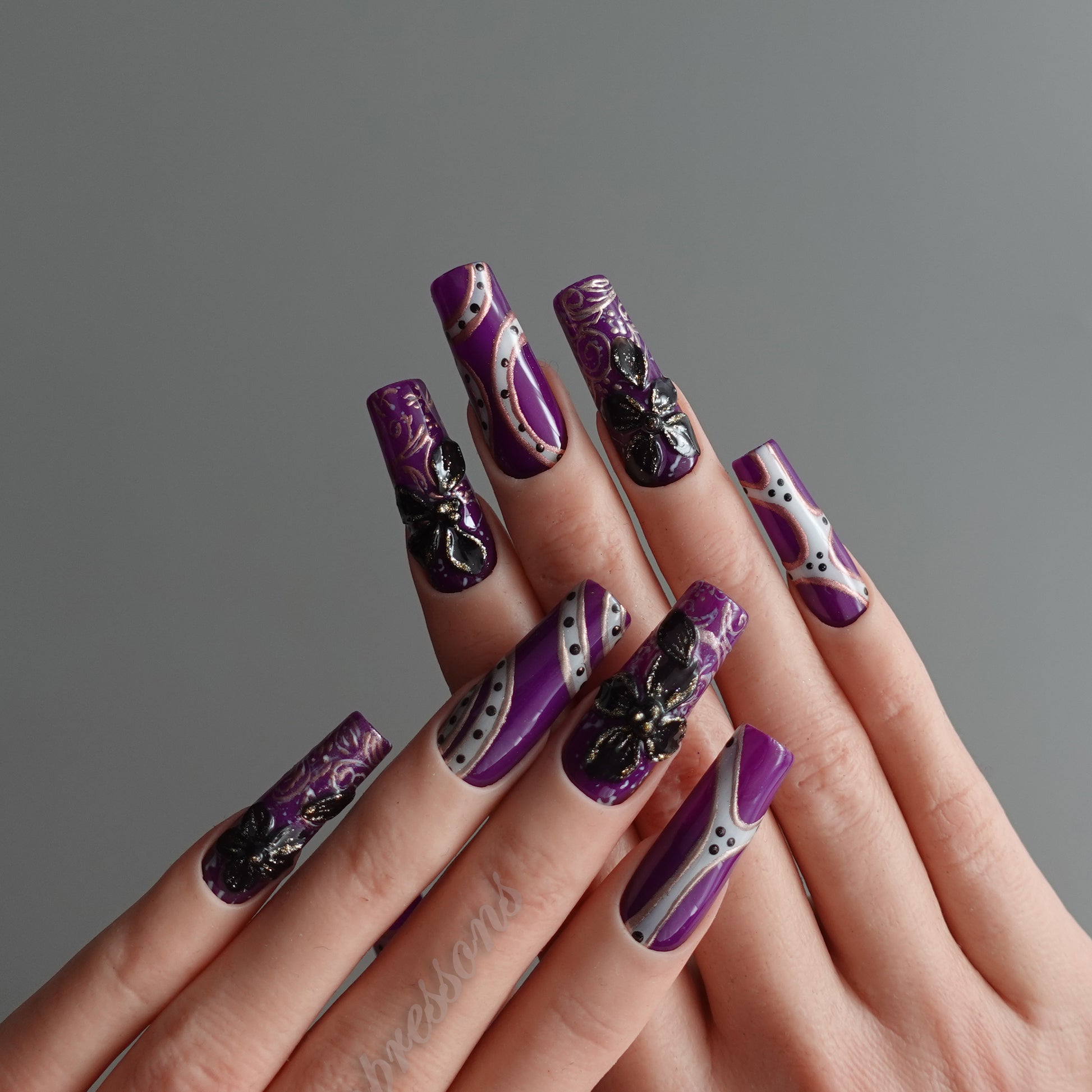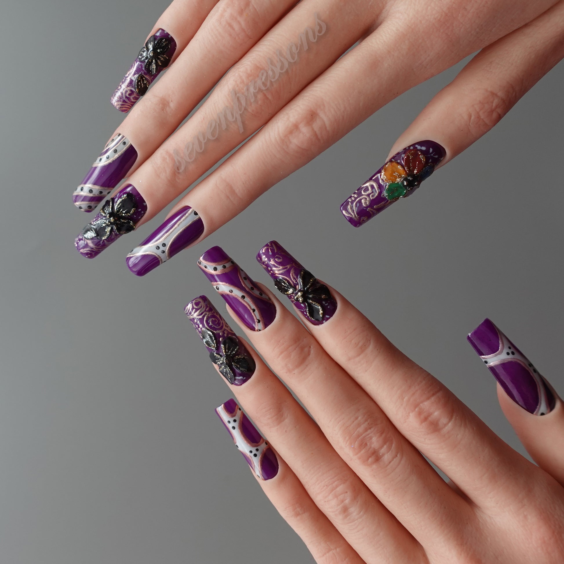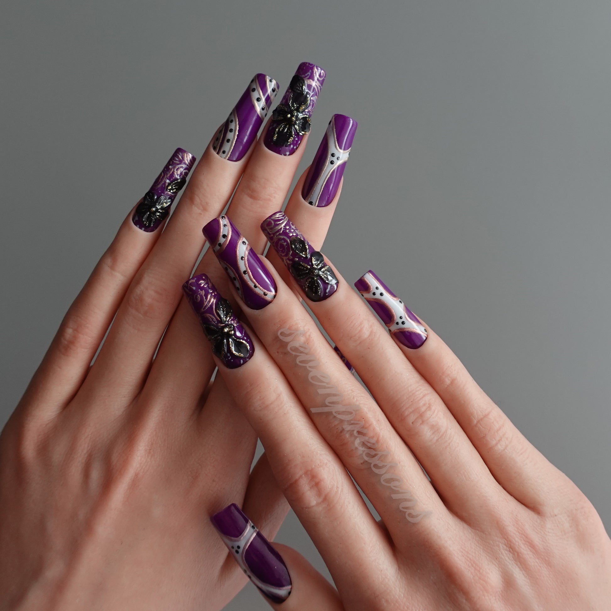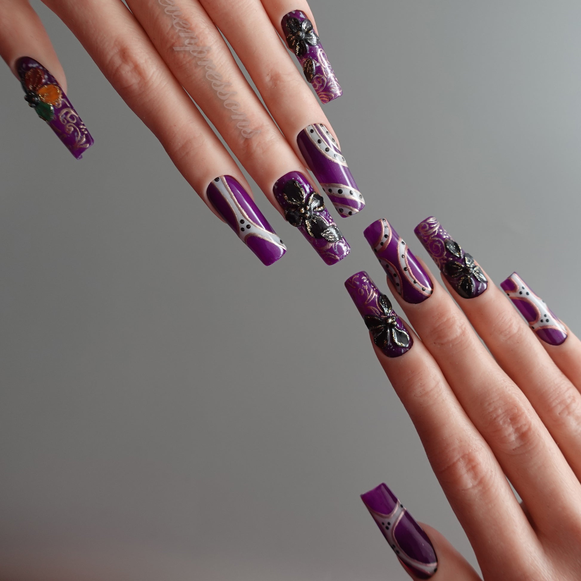 Rich purple bases meet sculpted black butterflies, iridescent accents, and baroque-style linework, forming a design that feels dramatic yet delicately romantic.