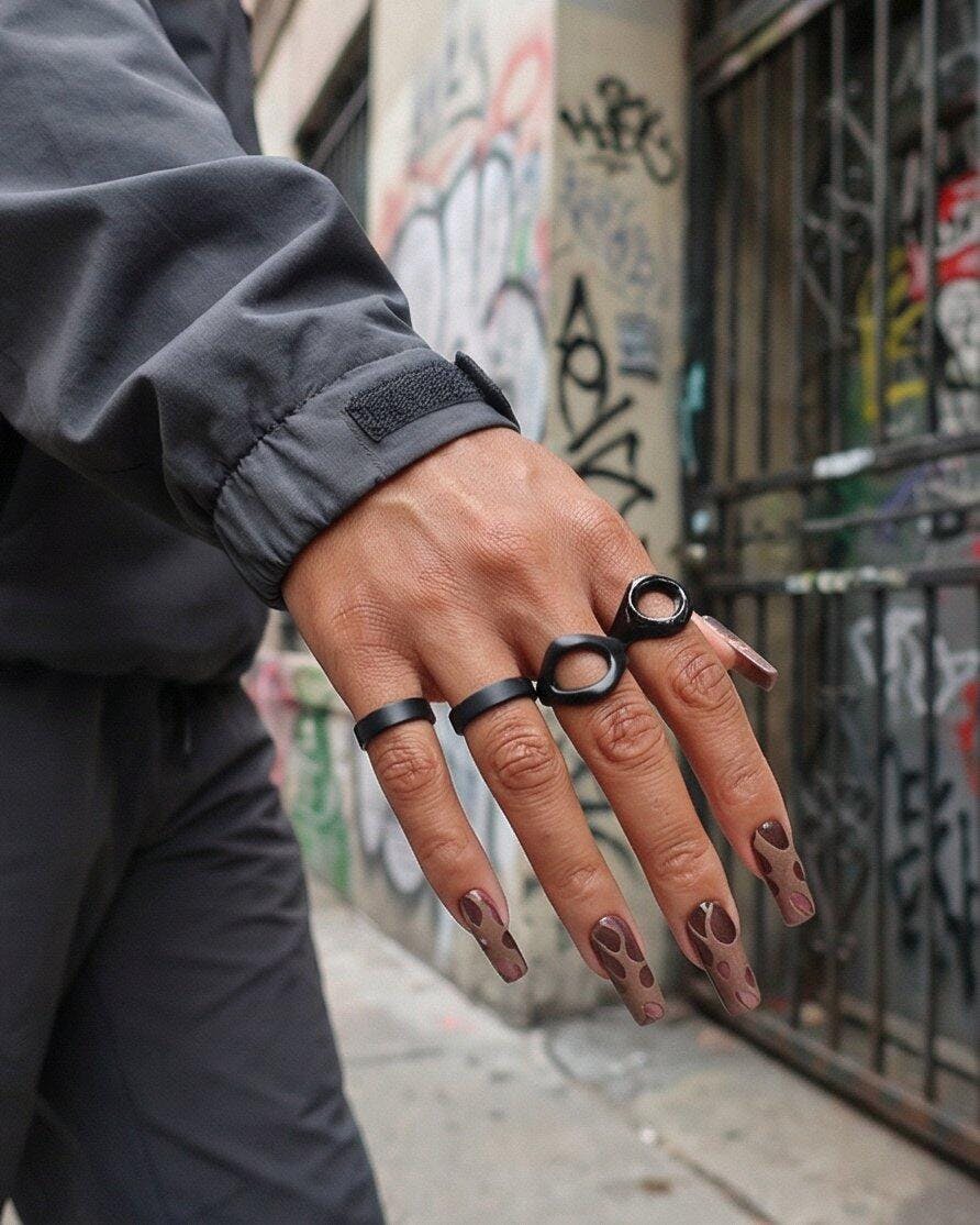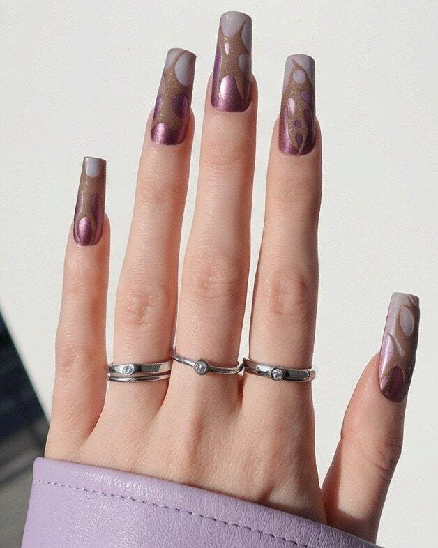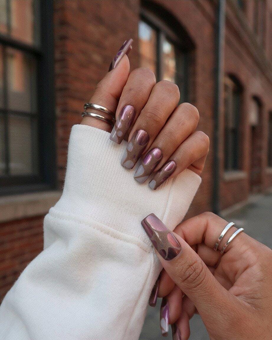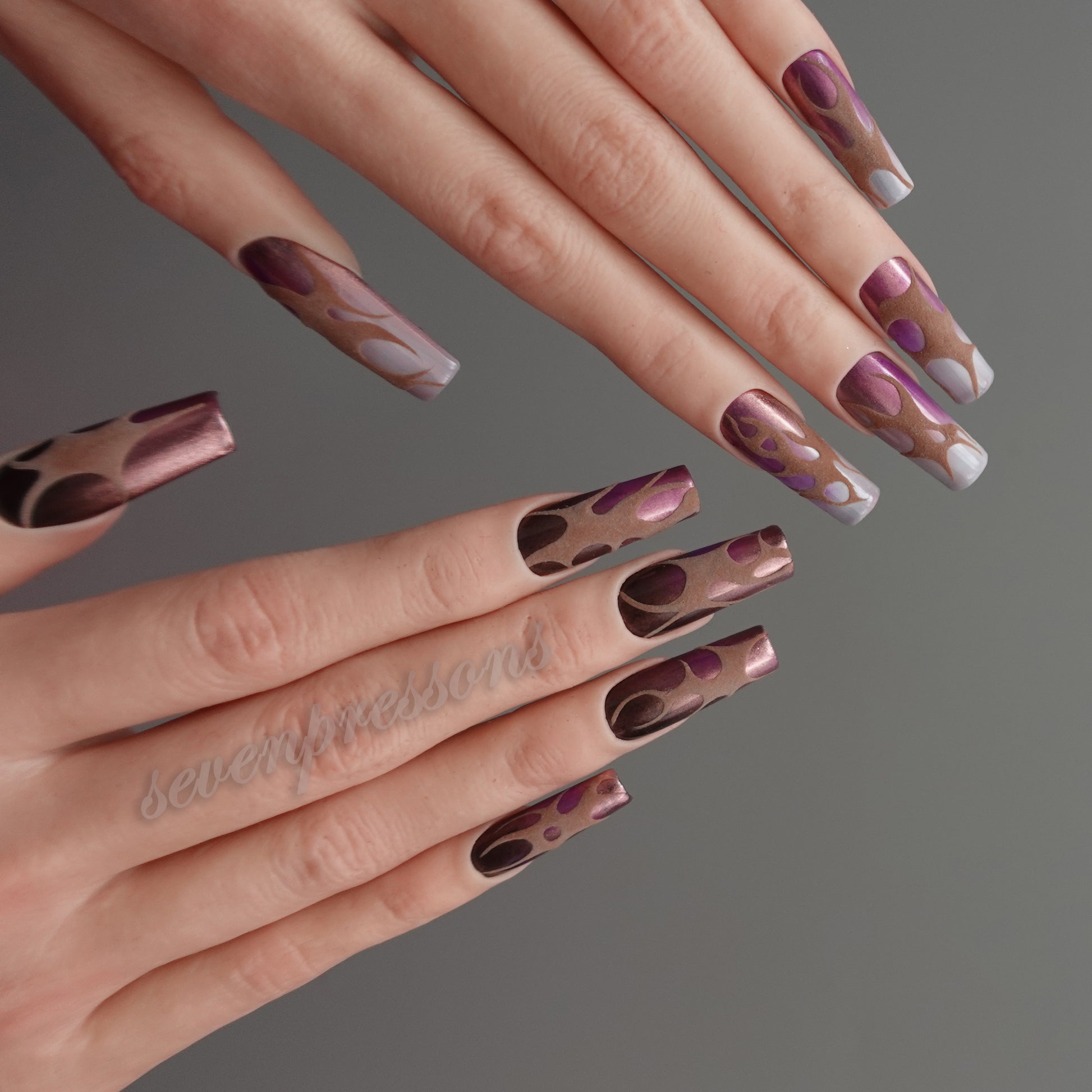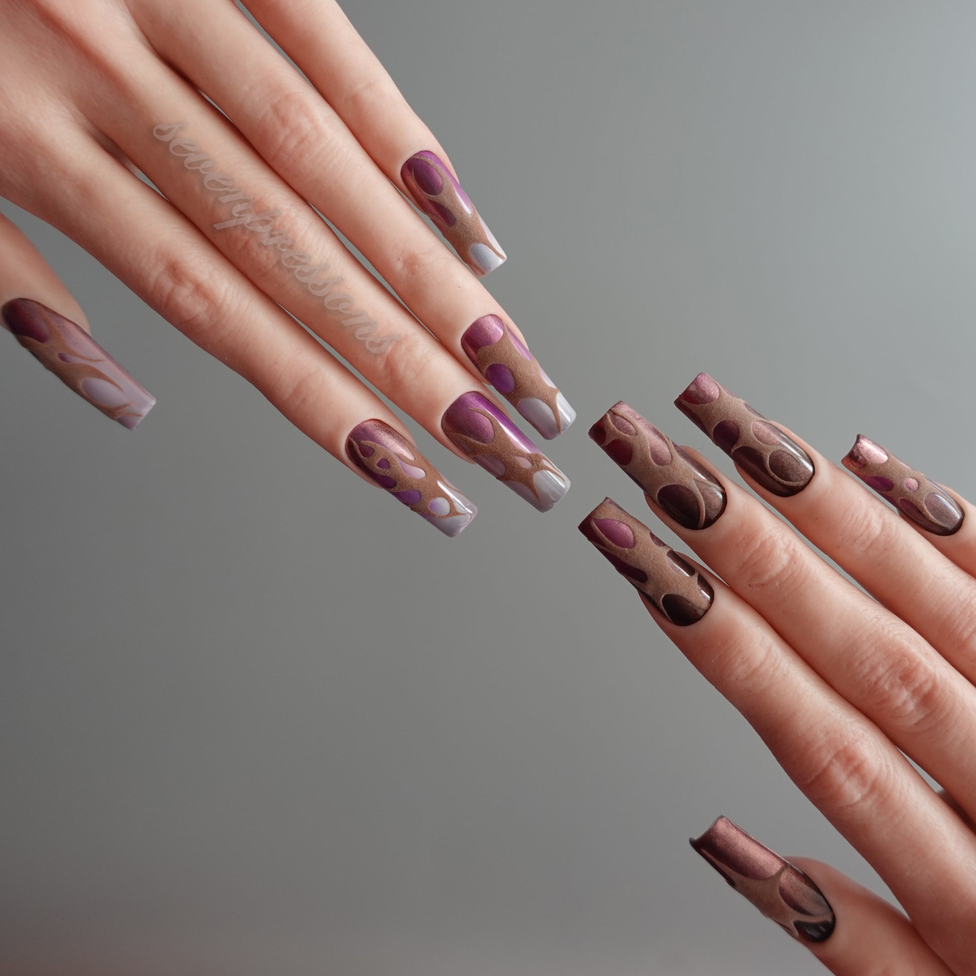 Each nail features hand-painted liquid-metal contours, soft gradient transitions, and multidimensional metallic finishes that shift with every movement. The result is a hypnotic, ultra-modern aesthetic that feels equal parts cosmic and couture — perfect for anyone who loves statement art with a luxurious edge.