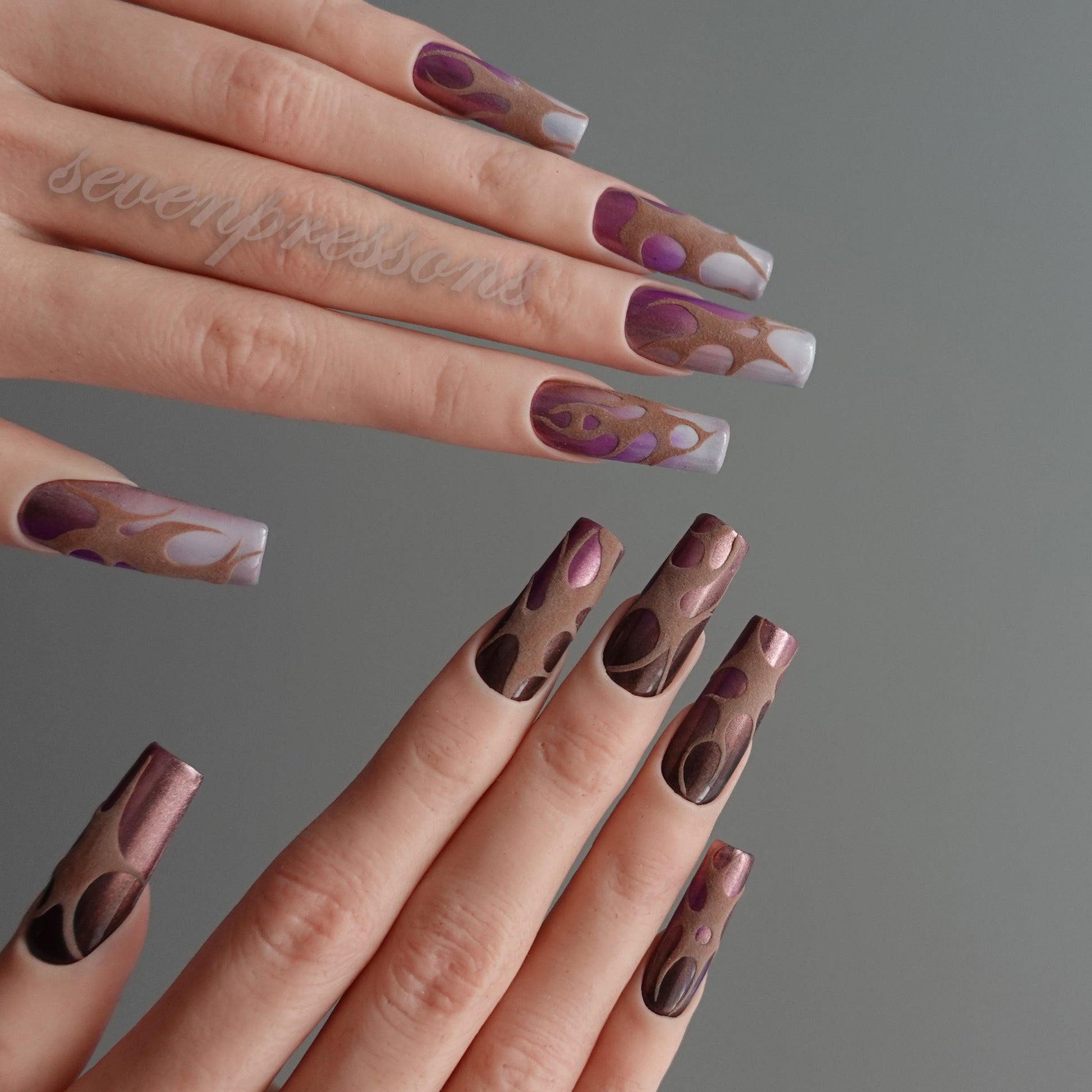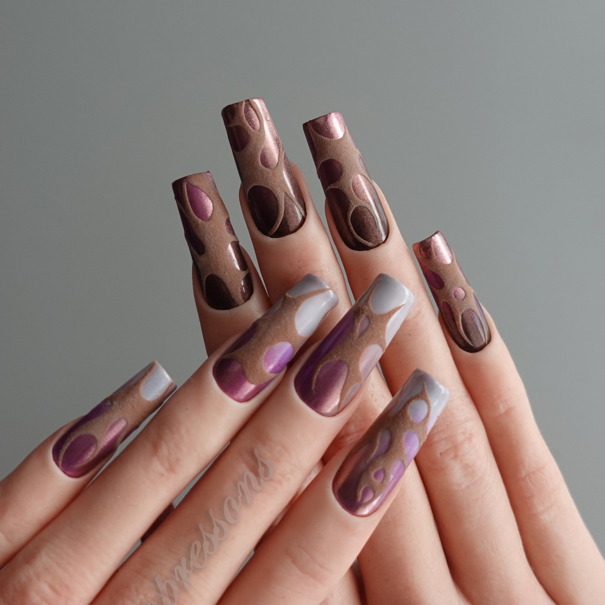 Molten Mirage is a shimmering fusion of molten metal, desert heat, and futuristic fantasy — a design that melts bronze, plum, and rose-gold tones into flowing abstract shapes that feel alive under the light.