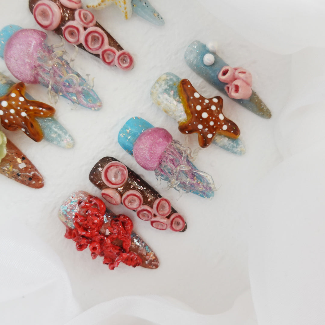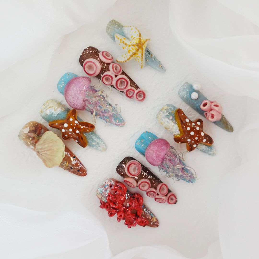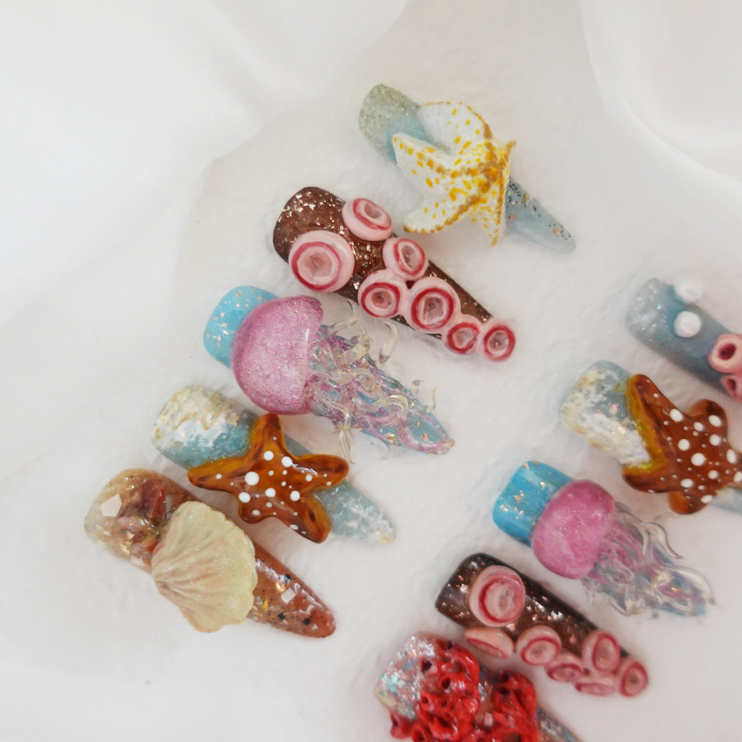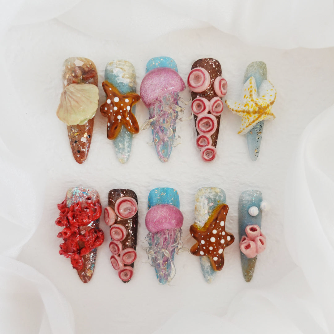 Channel the magic of the ocean with Ocean Oddity, a surreal and sculptural press-on nail set that captures the wild, weird beauty of deep-sea life. Each handmade nail is a miniature undersea world — from lifelike starfish and jellyfish to curled tentacles, coral blooms, and shimmering seafoam textures. This one-of-a-kind wearable art piece is not just a nail set — it’s an adventure beneath the waves. Perfect for marine lovers, fantasy dreamers, or anyone who dares to be bold.