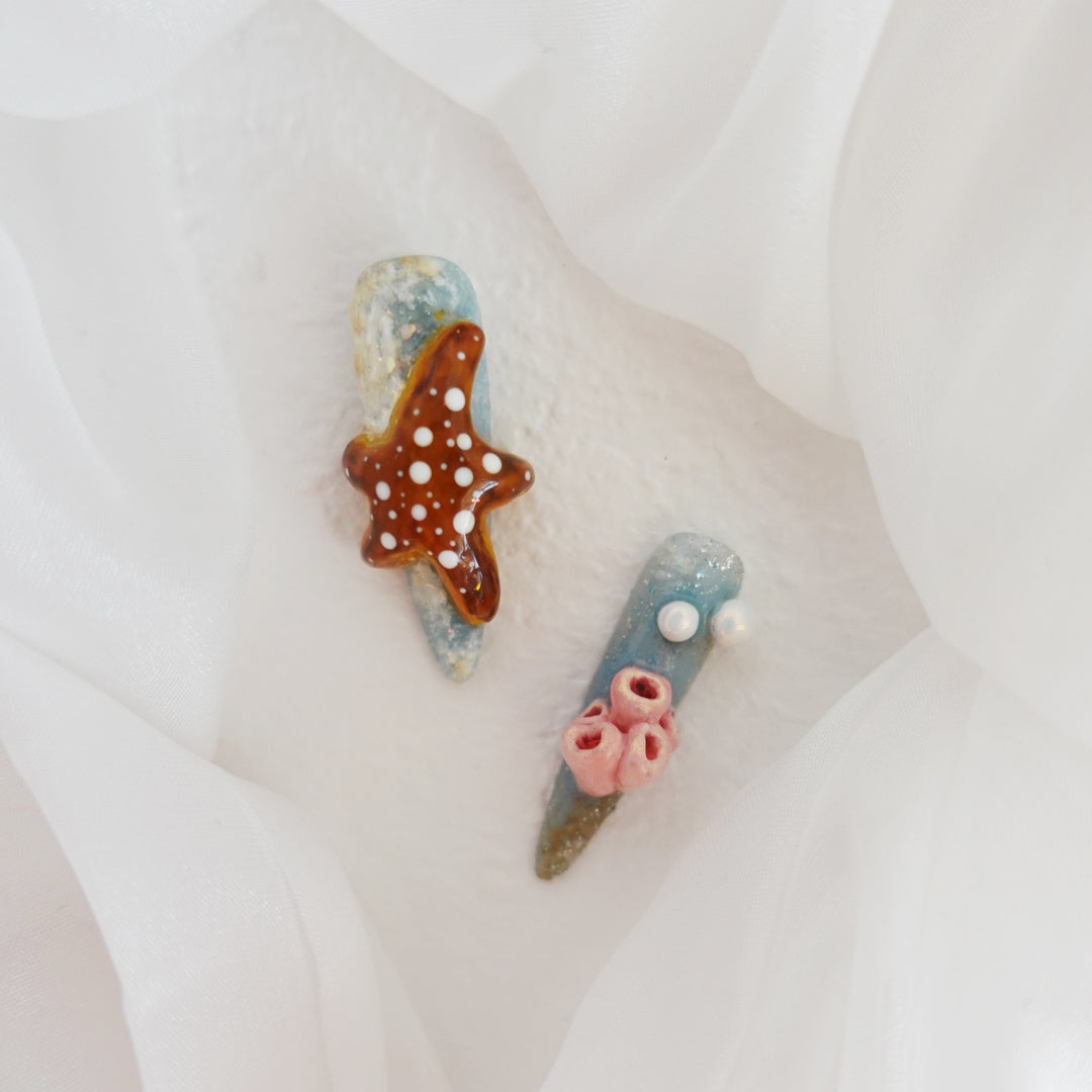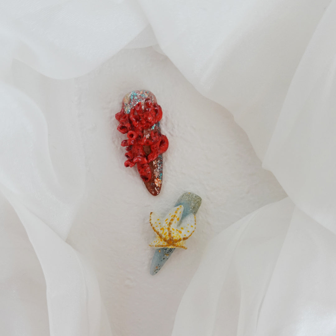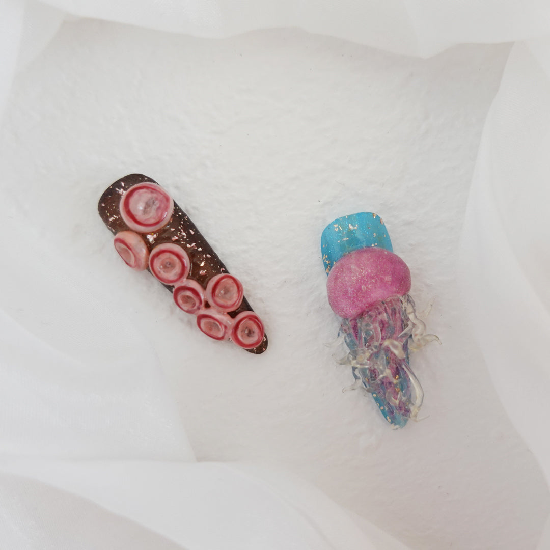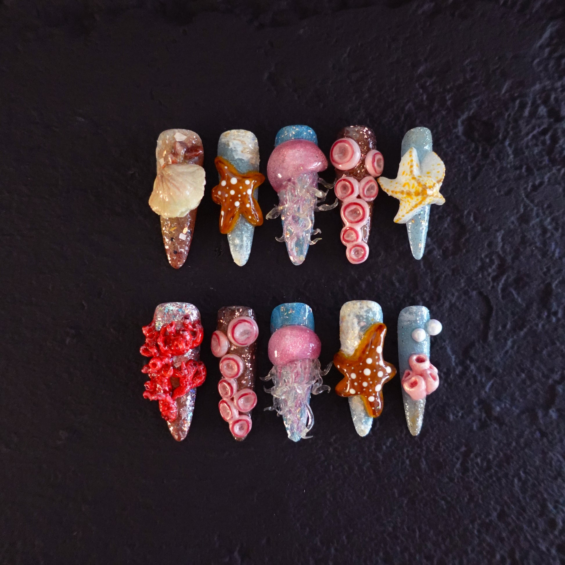 Channel the magic of the ocean with Ocean Oddity, a surreal and sculptural press-on nail set that captures the wild, weird beauty of deep-sea life. Each handmade nail is a miniature undersea world — from lifelike starfish and jellyfish to curled tentacles, coral blooms, and shimmering seafoam textures. This one-of-a-kind wearable art piece is not just a nail set — it’s an adventure beneath the waves. Perfect for marine lovers, fantasy dreamers, or anyone who dares to be bold.