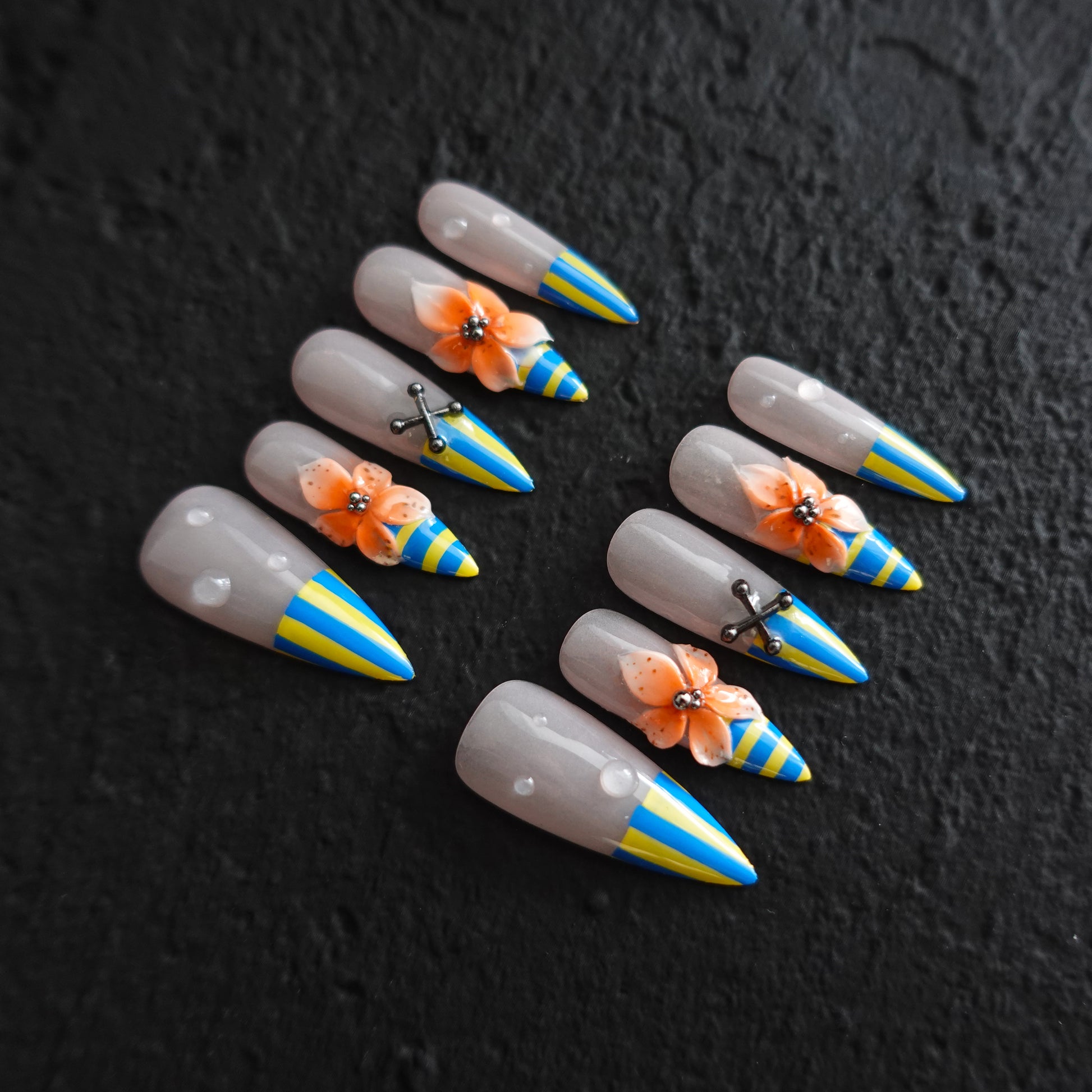 Seven Treasures — Where Every Nail Tells a Story. Sunlit stripes meet blooming petals in a fresh, nautical twist. Regatta Blossom pairs cobalt-and-lemon striped tips with hand-sculpted peach flowers, dewy water-drop accents, and gunmetal bar studs on a sheer dove-grey base—playful, polished, and summer-ready.