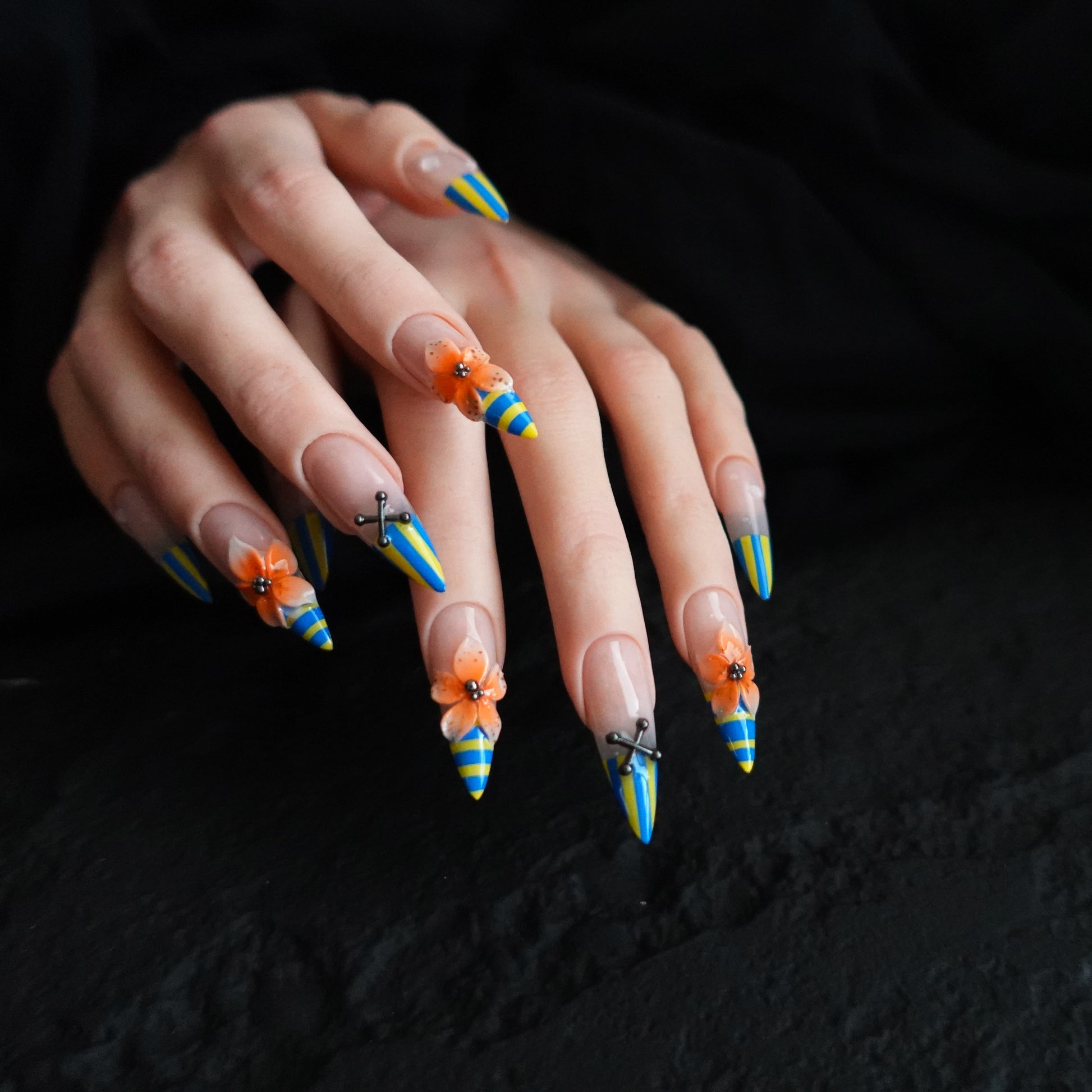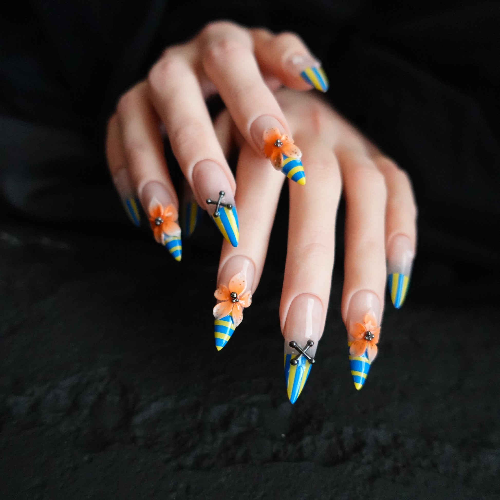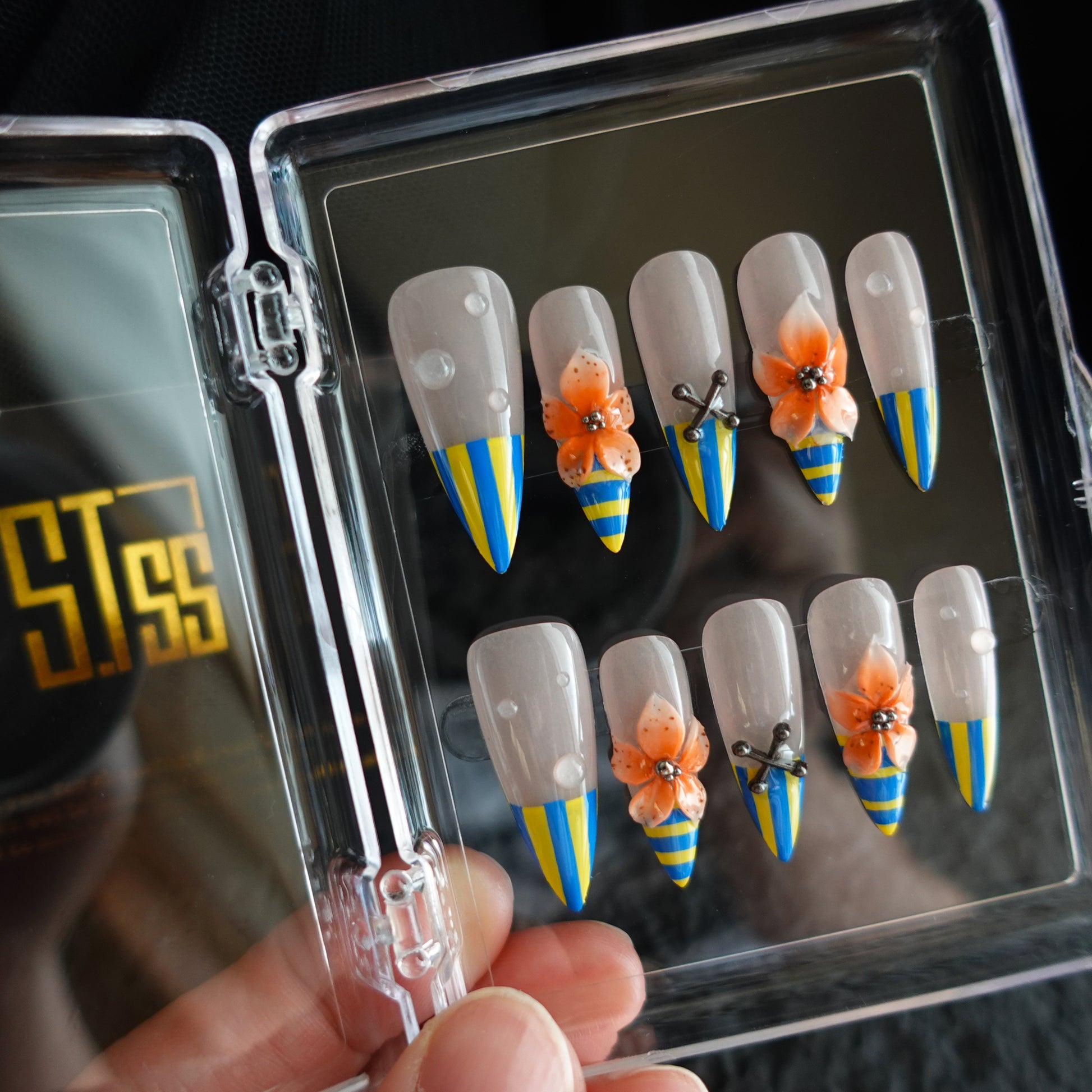 ✨ Features: • 100% Handcrafted & Made-to-Order • Cobalt & lemon striped French tips with crisp lines • Hand-sculpted 3D peach blossoms with crystal centers • Dew-drop gel accents and gunmetal bar hardware • Smooth high-gloss finish • Color Palette: Cobalt Blue, Lemon Yellow, Peach, Dove Grey, Gunmetal • Shape: Long Stiletto (customizable) • Lightweight, durable, and reusable with proper care • Sealed with a glossy protective gel topcoat